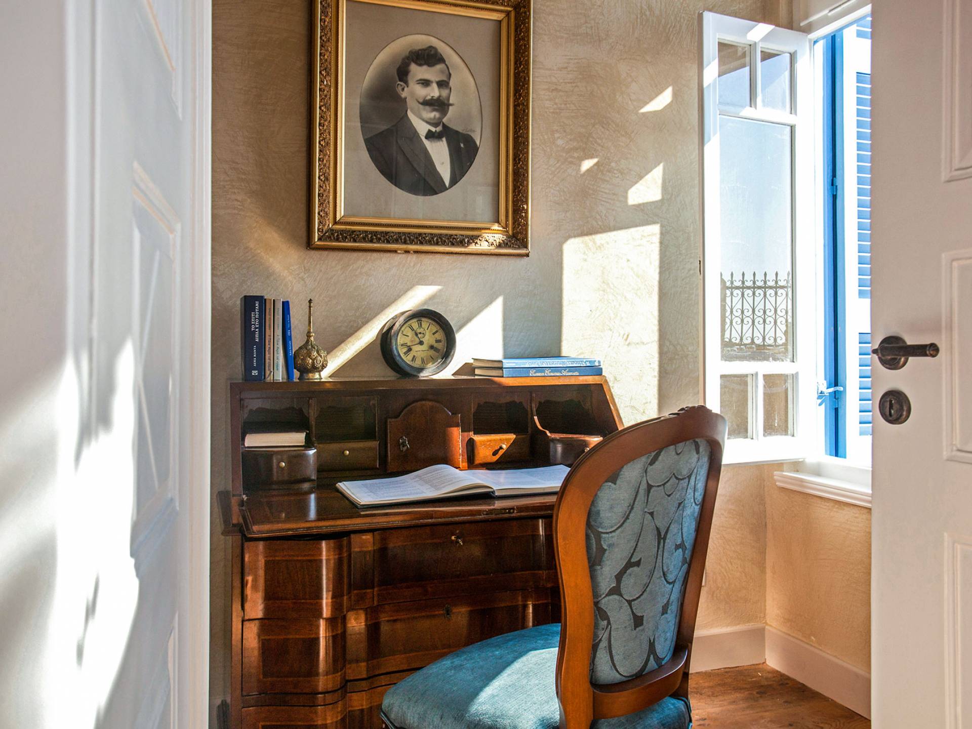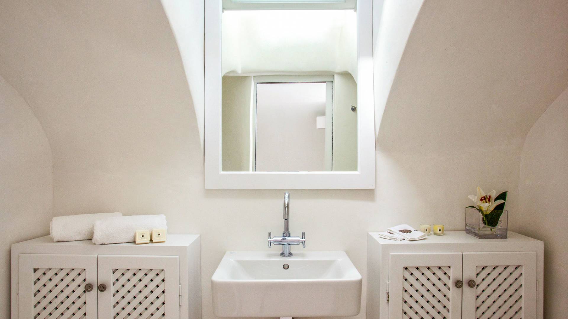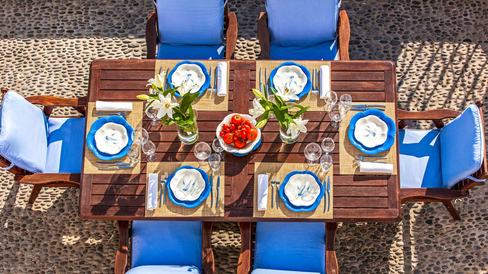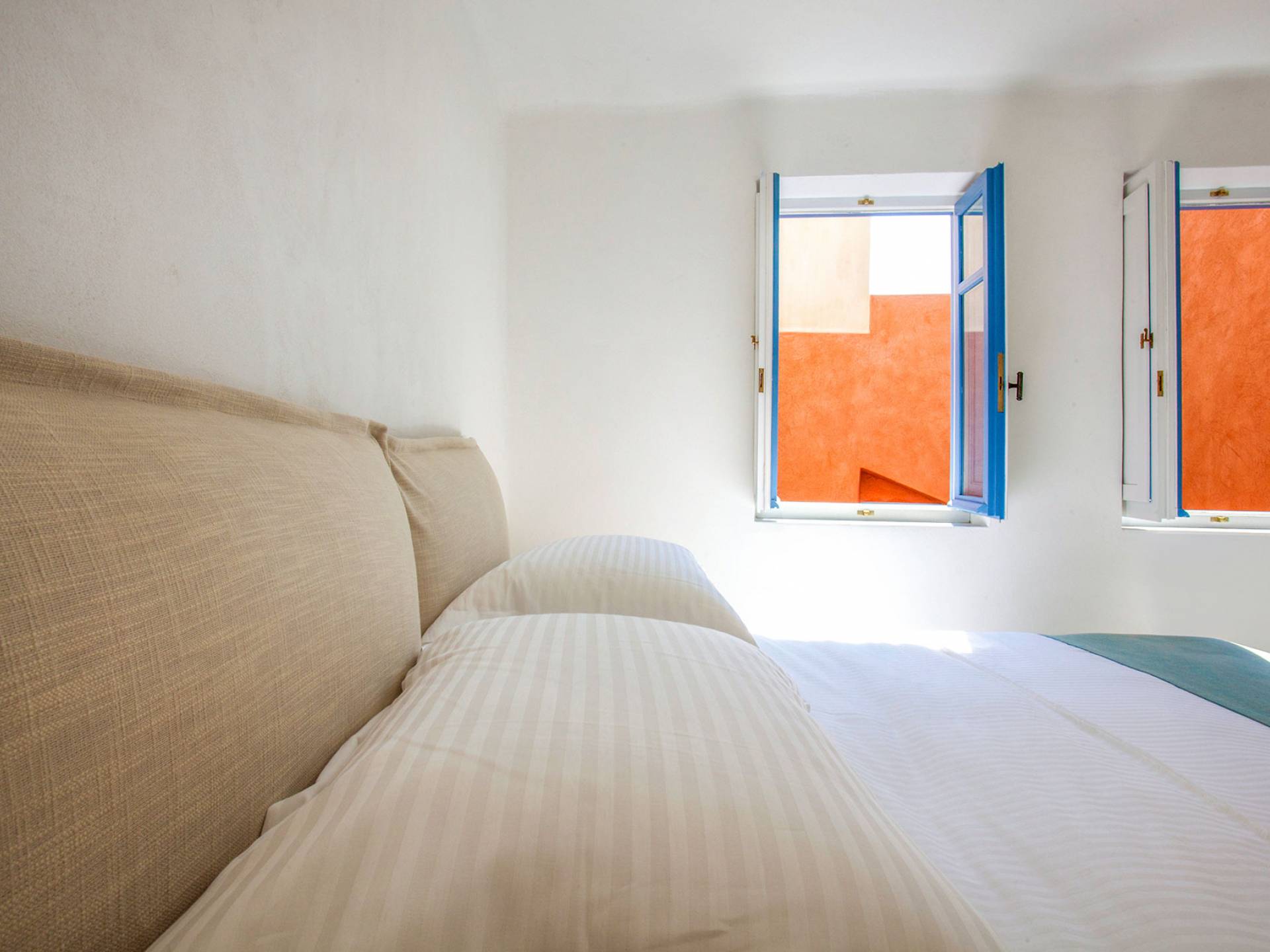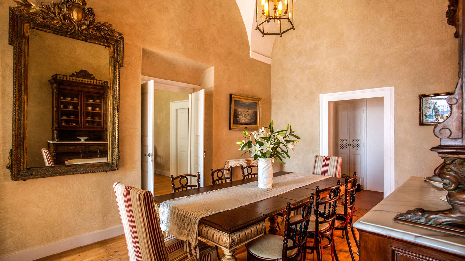Frente a la mansión, el "patio" es realmente la terraza de los tiempos tradicionales de la isla. Tiene vistas igualmente panorámicas, que se complementa con la fachada neoclásica. Decorado en el modo tradicional de la isla, el patio interior, es el elemento sorpresa arquitectónico de buen gusto de Oia Mansion. Balcón privado con espectacular vista al idílico atardecer. Su reflejo en el agua crea un conducto dorado hacia el sol.