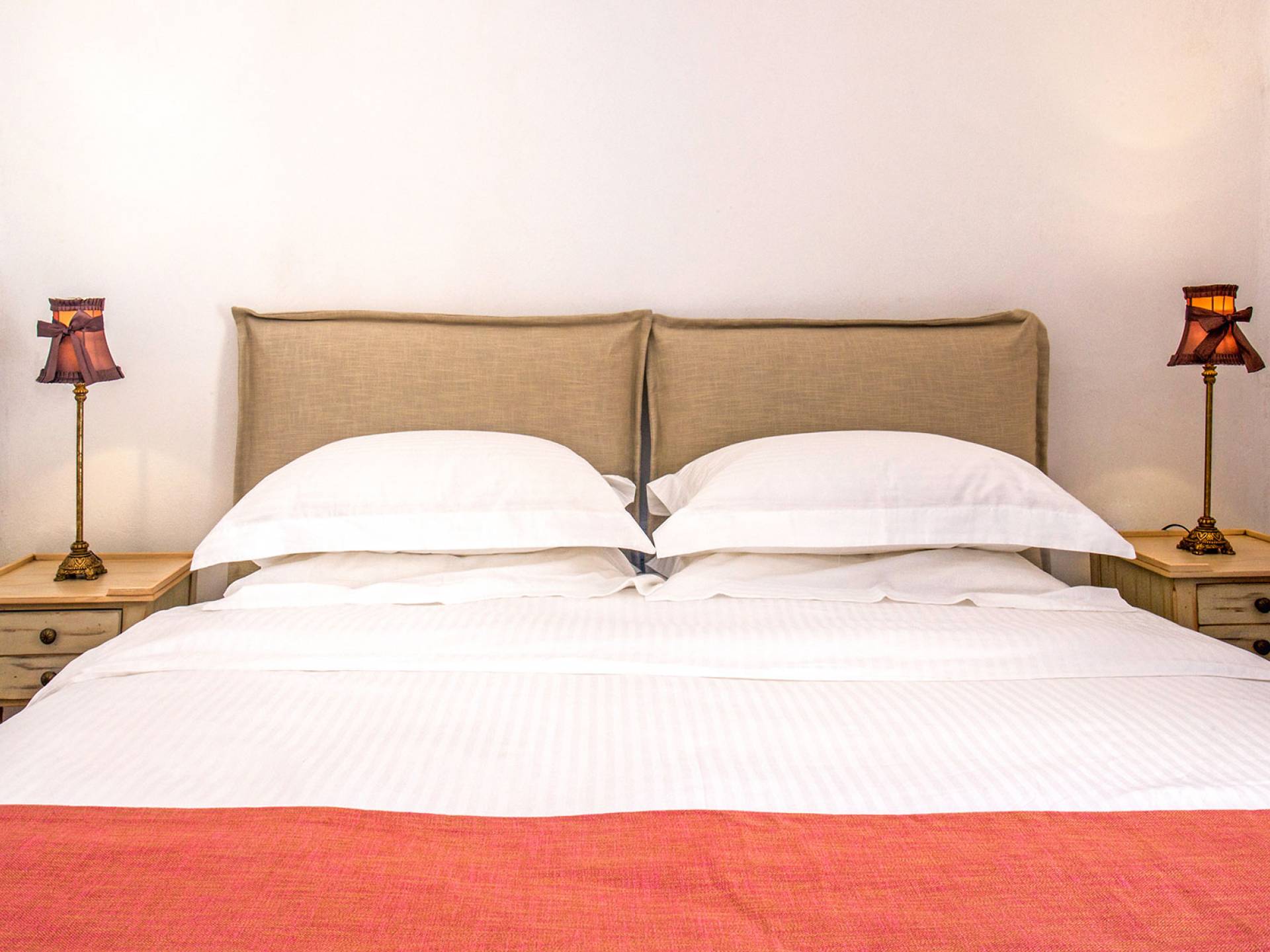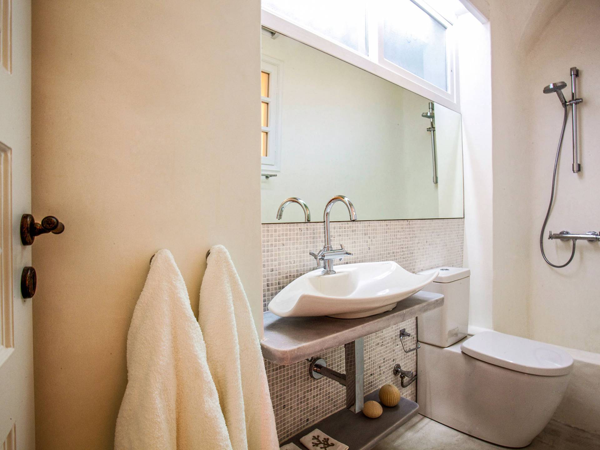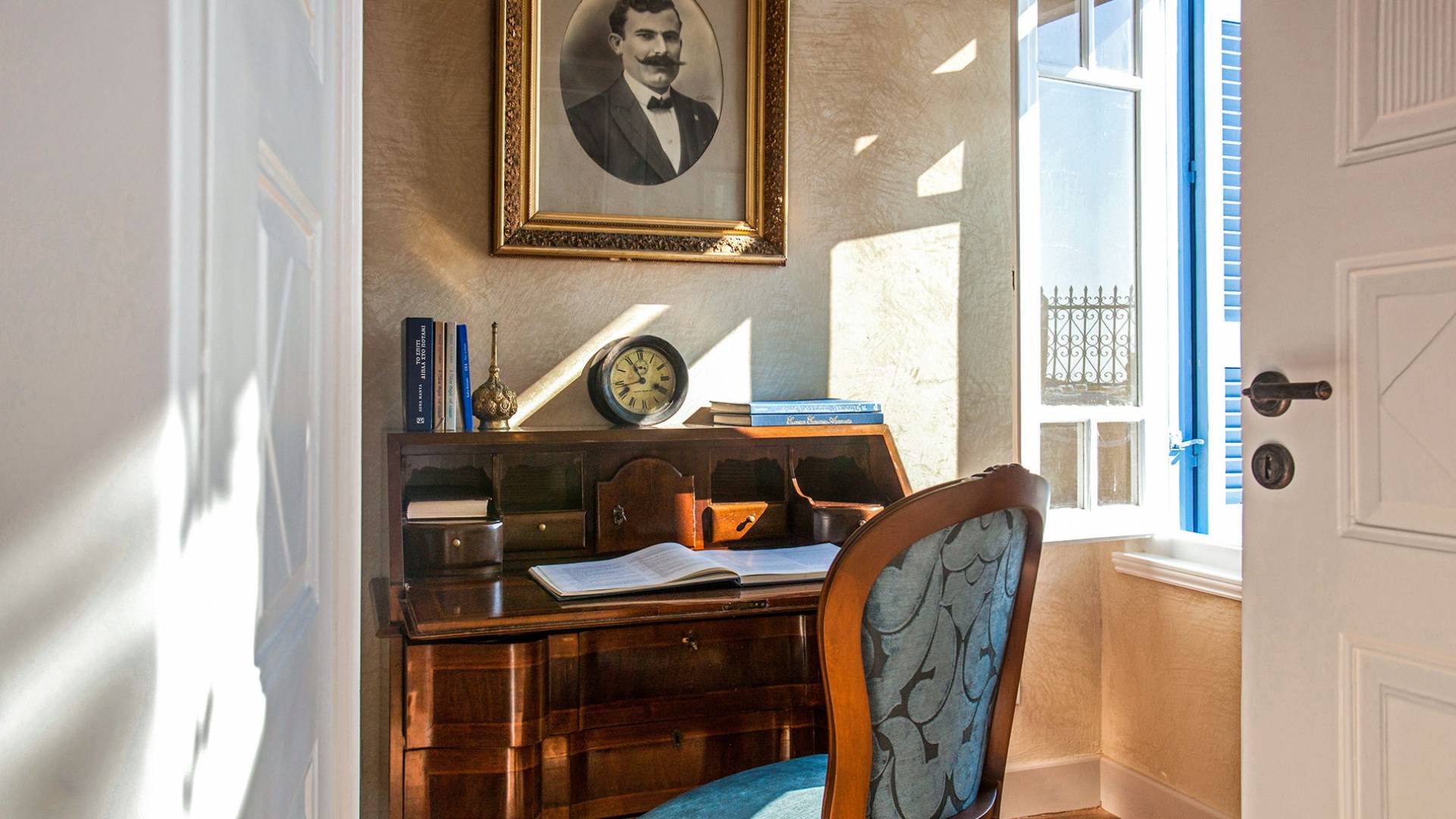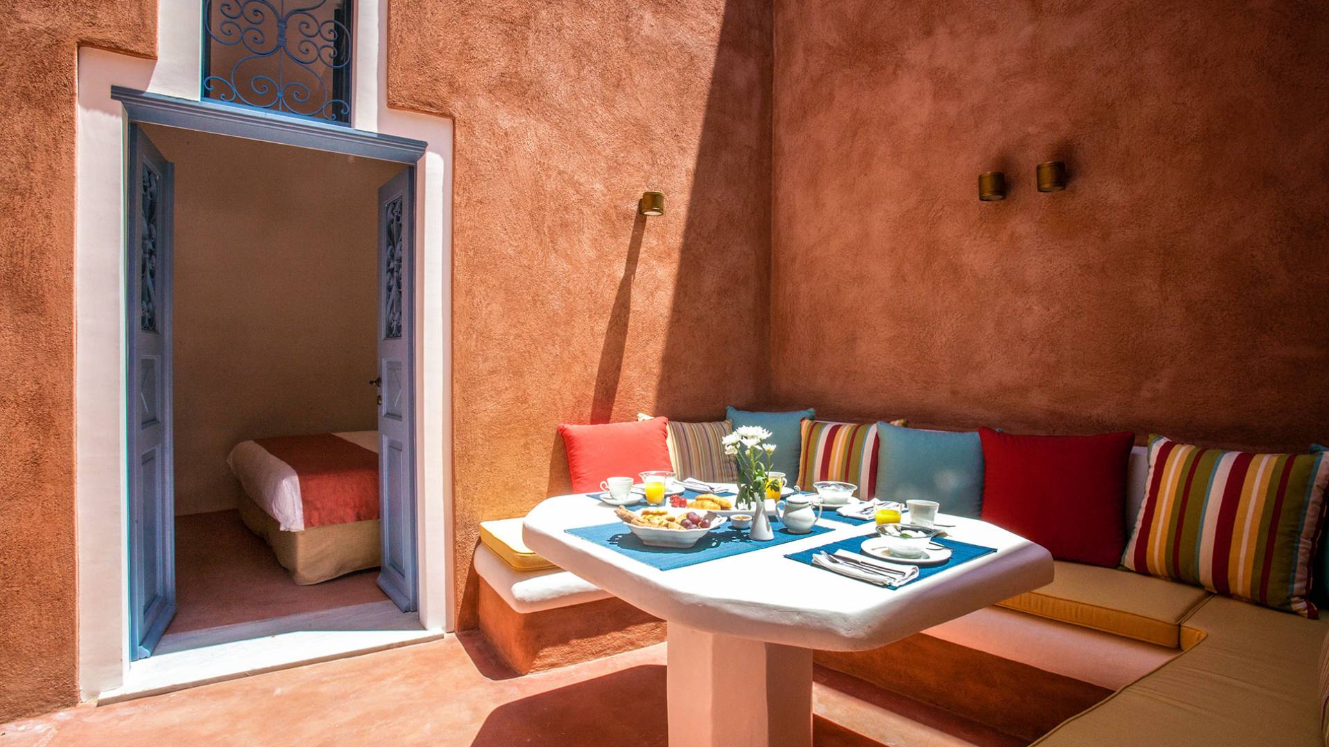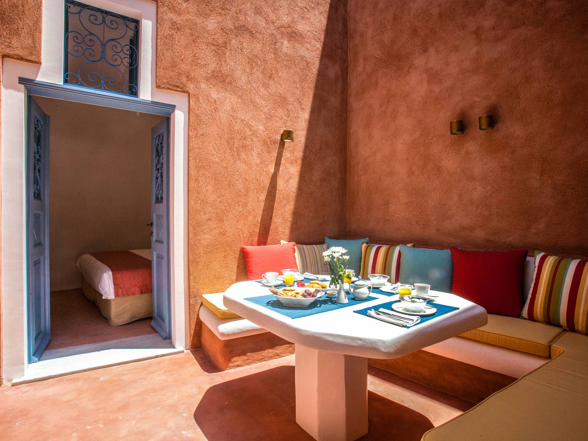 Frente a la mansión, el "patio" es realmente la terraza de los tiempos tradicionales de la isla. Tiene vistas igualmente panorámicas, que se complementa con la fachada neoclásica. Decorado en el modo tradicional de la isla, el patio interior, es el elemento sorpresa arquitectónico de buen gusto de Oia Mansion. Balcón privado con espectacular vista al idílico atardecer. Su reflejo en el agua crea un conducto dorado hacia el sol.