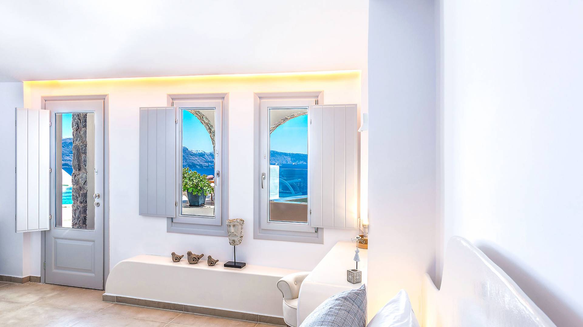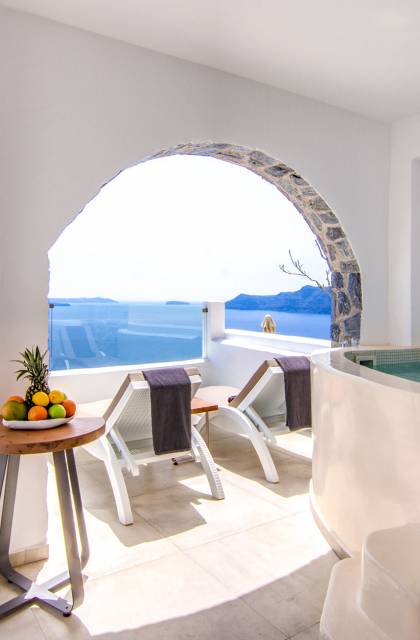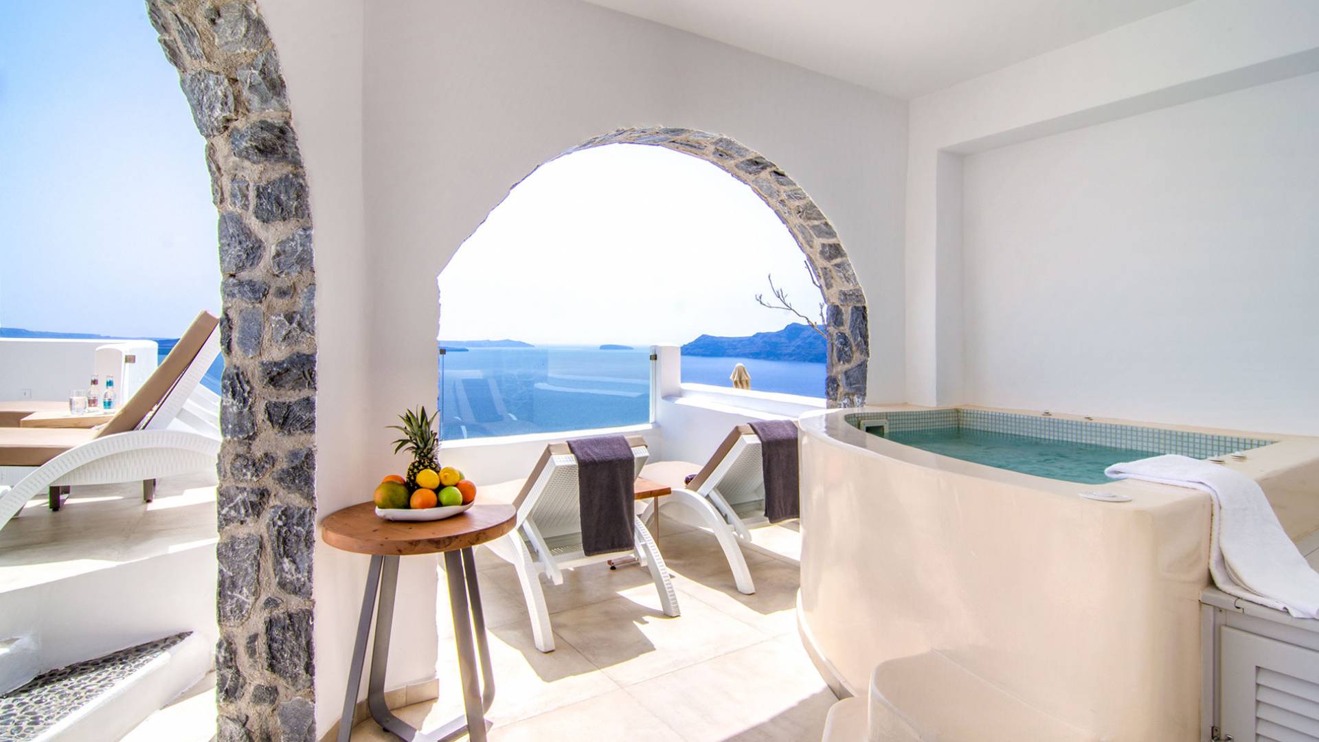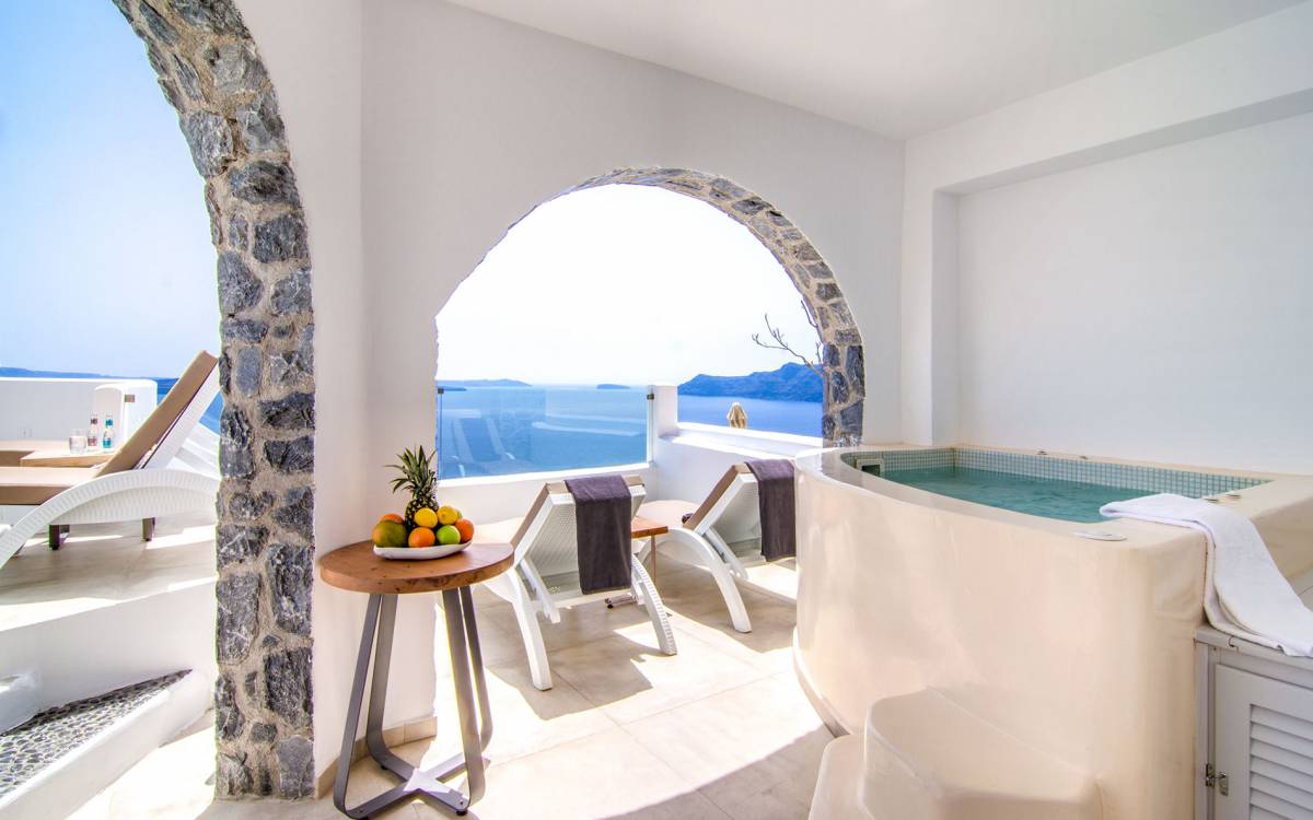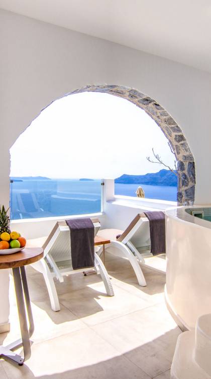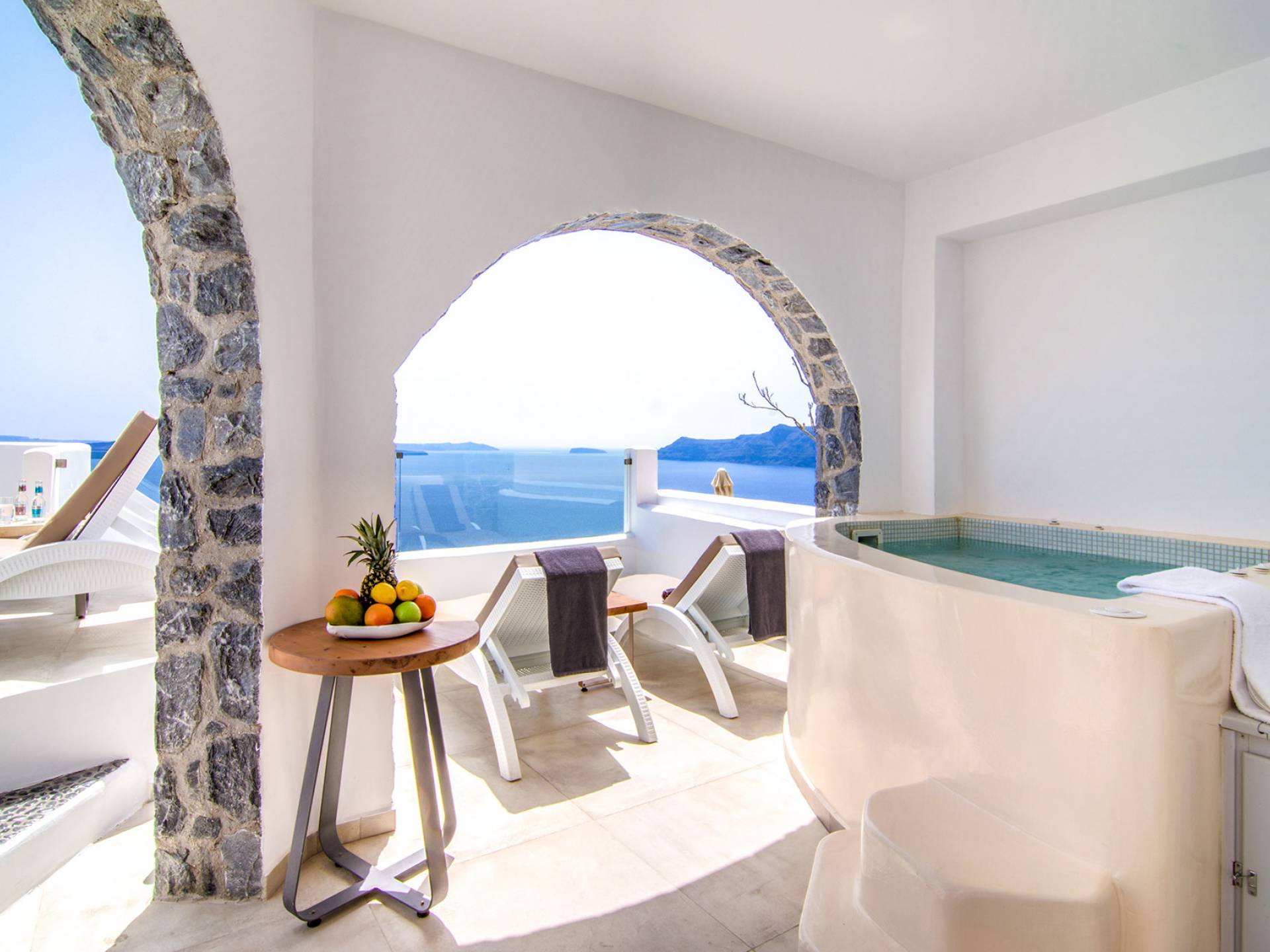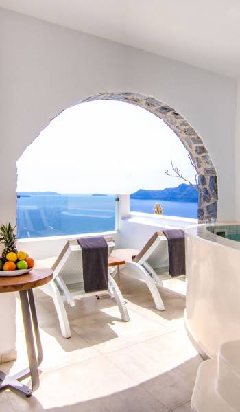 Presentamos la suite Secret Prestige que ofrece vistas despejadas a la Caldera y cuenta con una terraza privada con jacuzzi donde los huéspedes pueden relajarse por completo, disfrutando de preciosos momentos de pura relajación. Ubicada en el primer nivel y con una decoración fresca y contemporánea con sutiles toques de las Cícladas que emanan ese ambiente isleño tradicional, la suite Secret Prestige es una suite relajante que definitivamente te encantará.