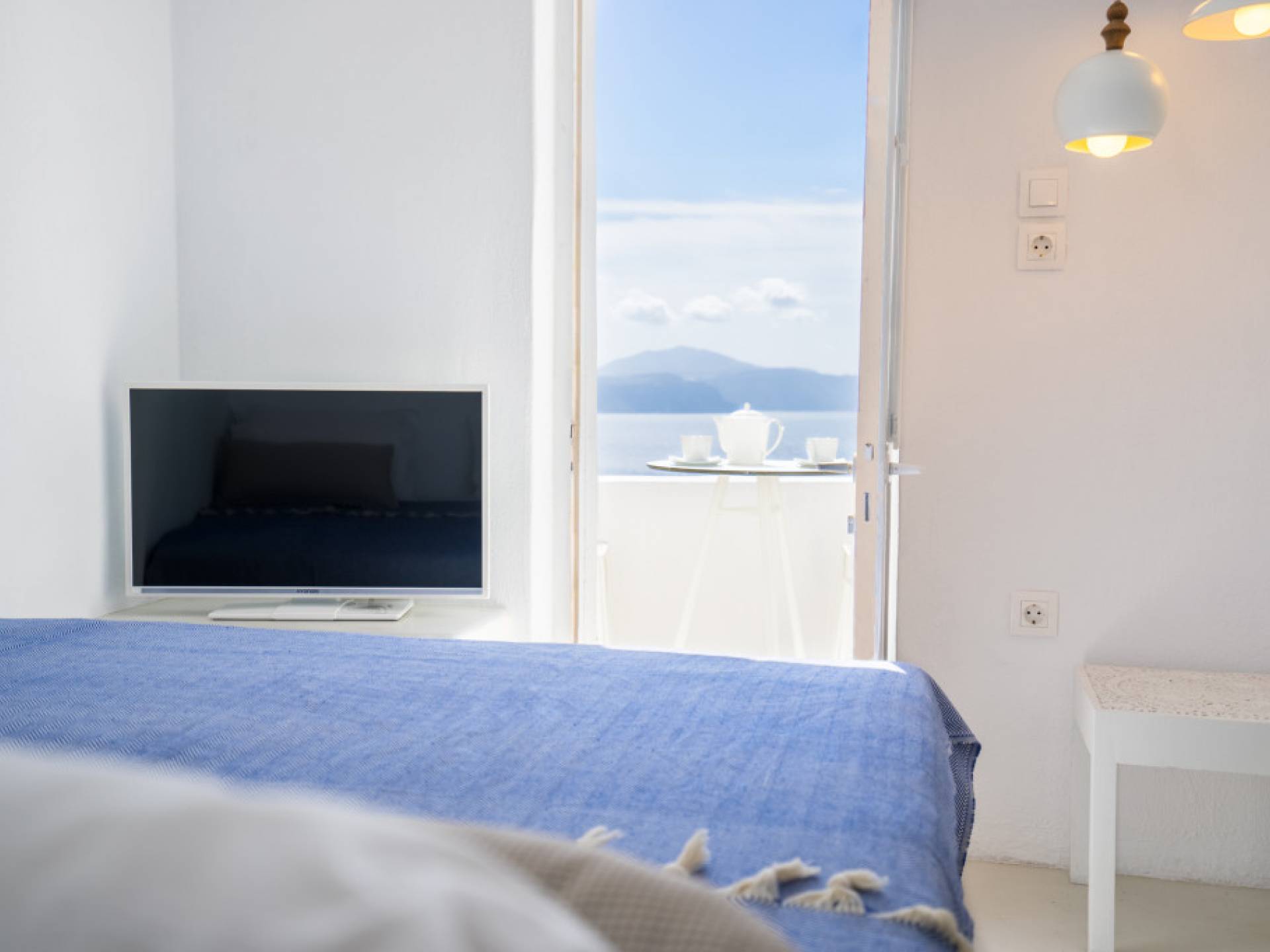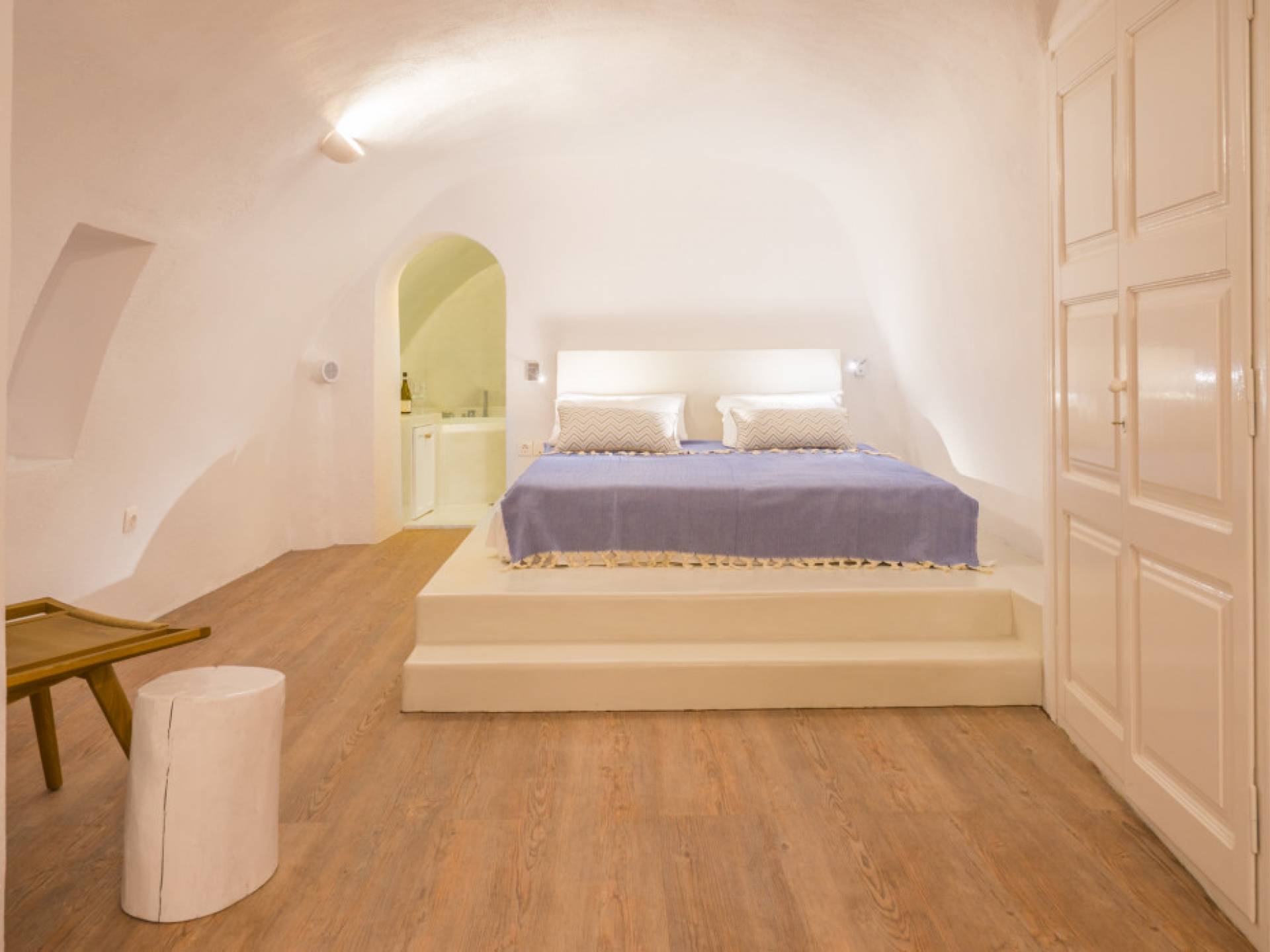 Sapphire Canvas Suite consta de 1 dormitorio con cama king de 1,7 mx 2,00 m con baño en suite, 1 dormitorio con cama king de 1,6 mx 2,00 m con baño en suite, salón con sofá cama de 0,8 mx 2,0 m, Kitchenette con utensilios esenciales, balcón privado con vista al volcán y a la caldera.
