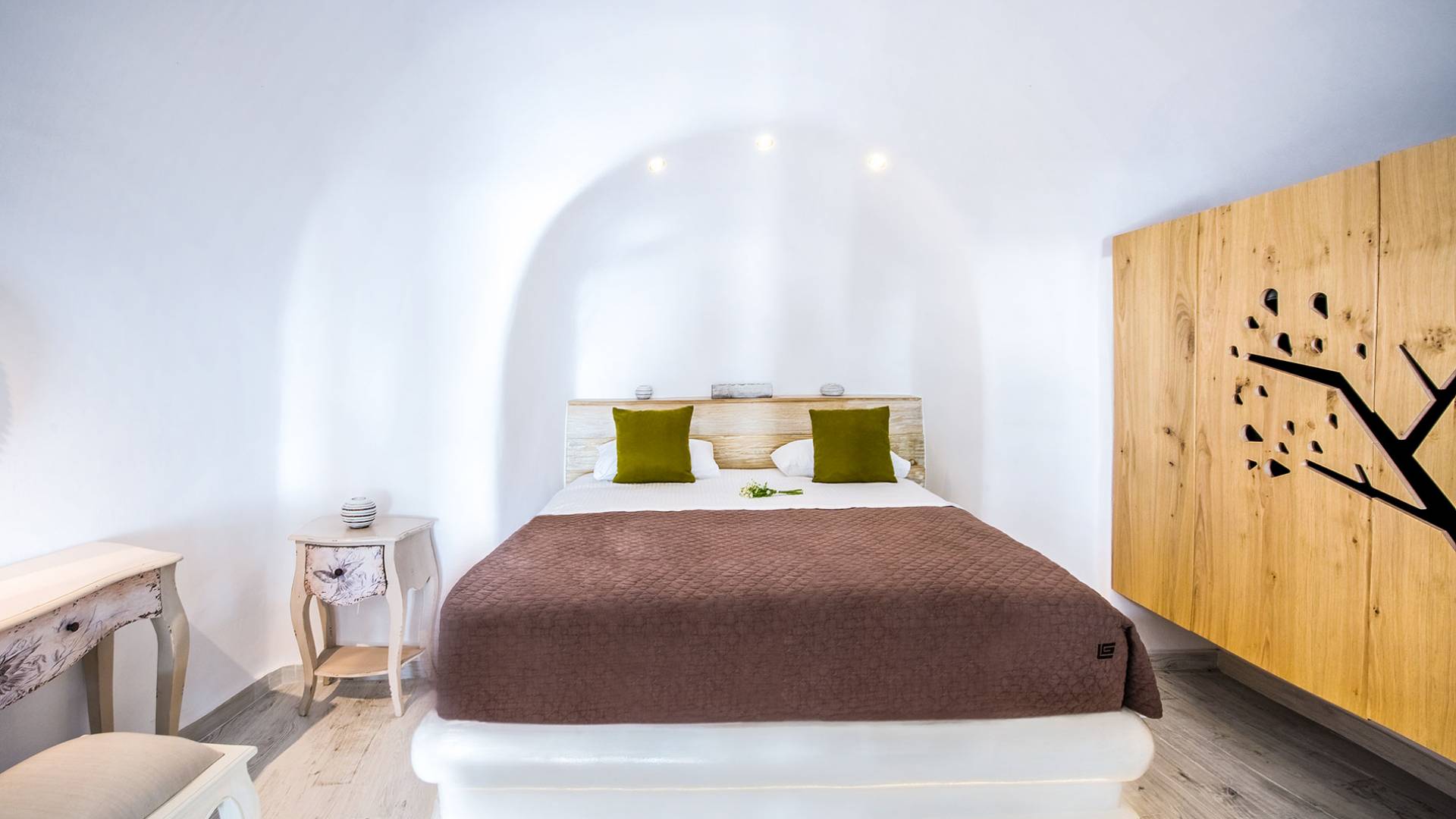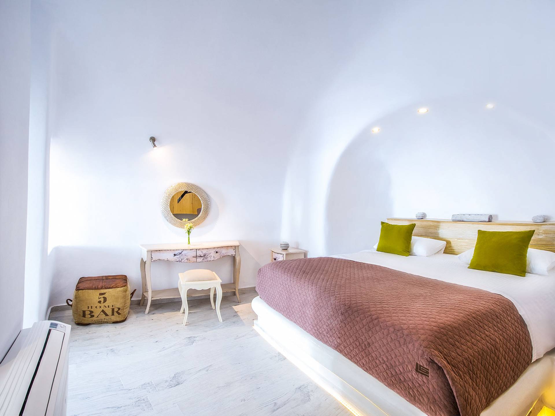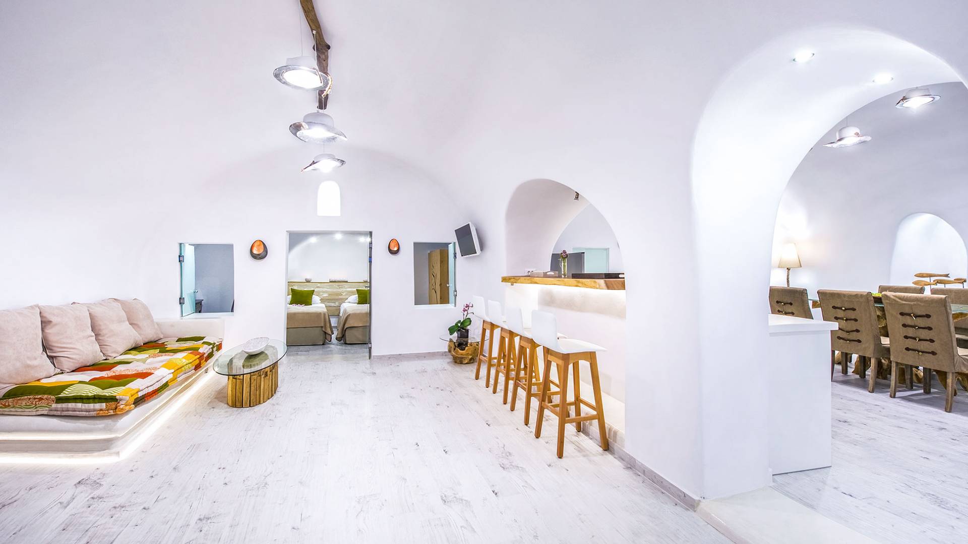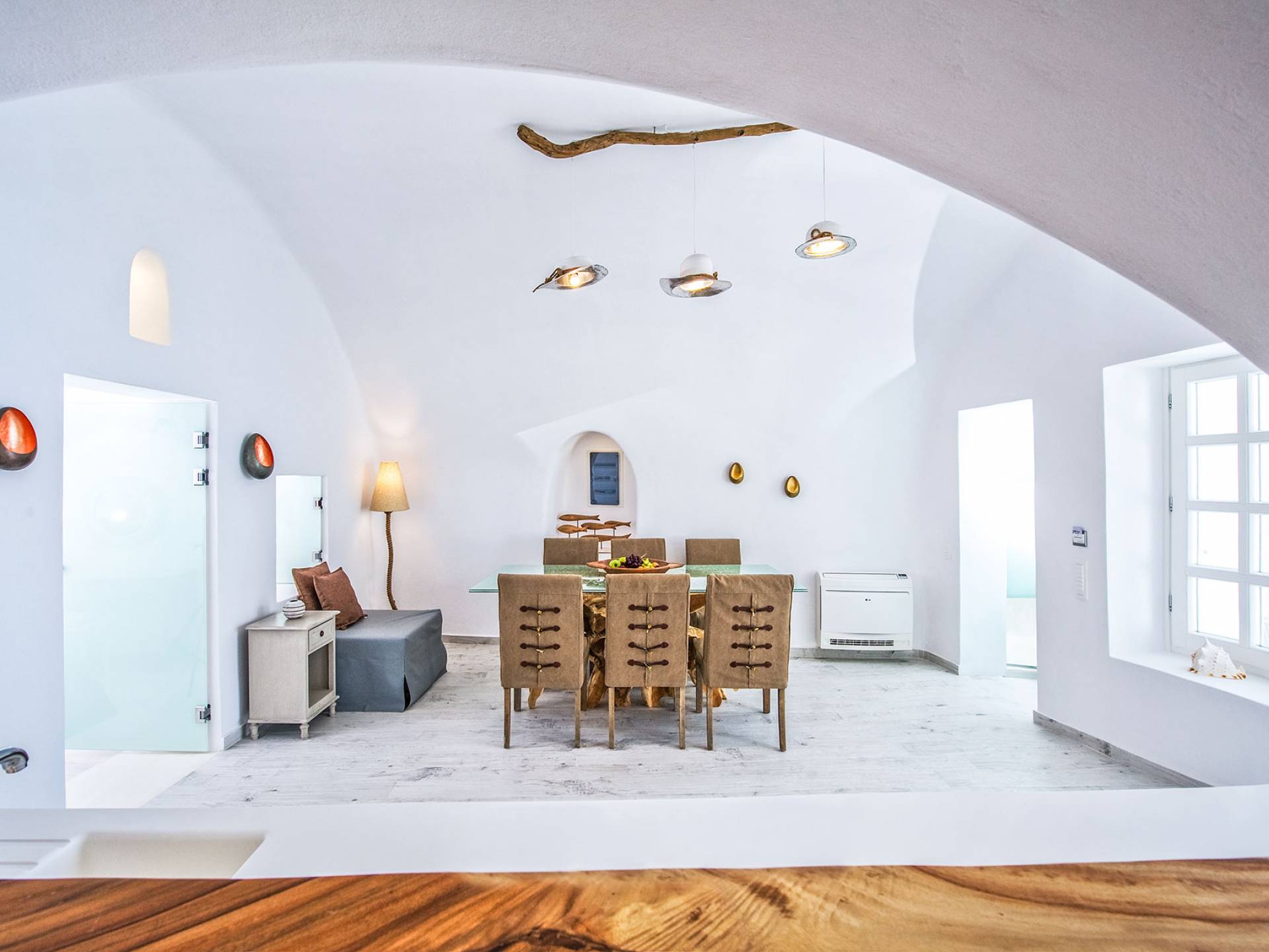 El diseño de bellas artes interiores de esta magnífica villa con piscina de dos dormitorios en una cueva incluye el valor máximo del espacio, coqueteando con las luces y sombras de la antigua Grecia. Las formas casi espirituales de las paredes, los mármoles blancos y los detalles dorados le ofrecen un ambiente lujoso con una simplicidad antigua con todas las comodidades modernas. Sumérjase en su propia gran piscina climatizada al aire libre en una cueva con hidromasaje y excite sus sentidos. Camine hacia su balcón para disfrutar de las impresionantes vistas de Caldera, el mar Egeo y las incomparables vistas directas del atardecer de Santorini.