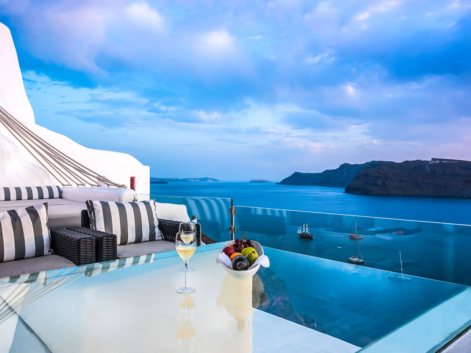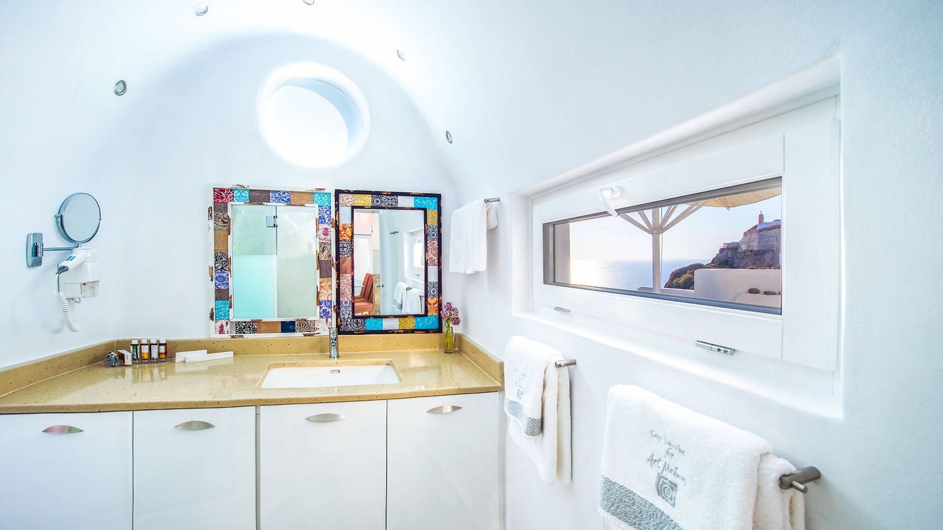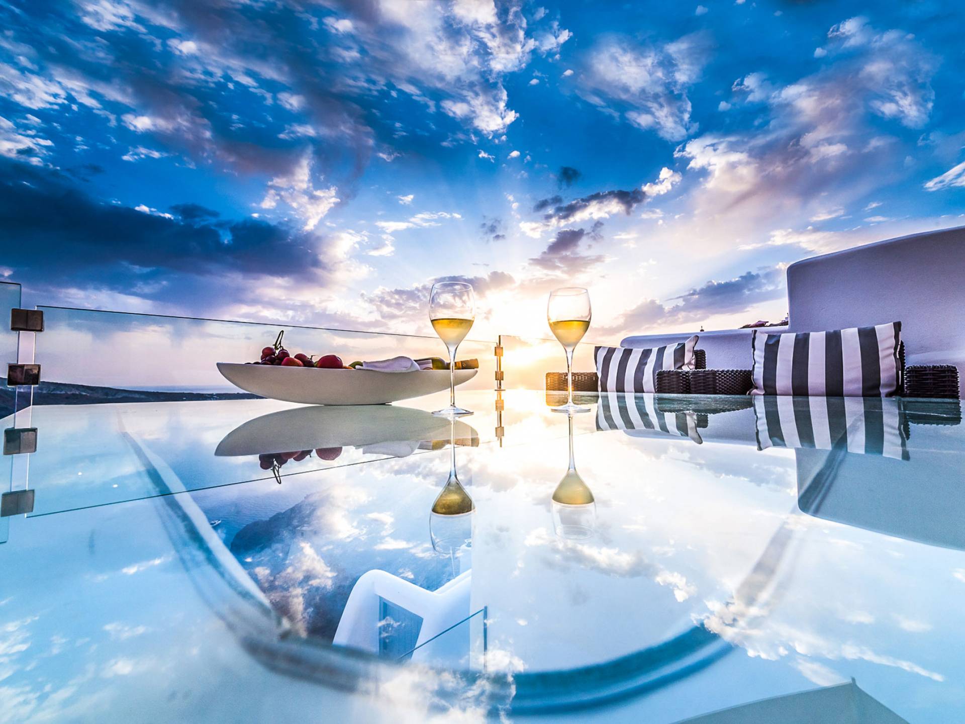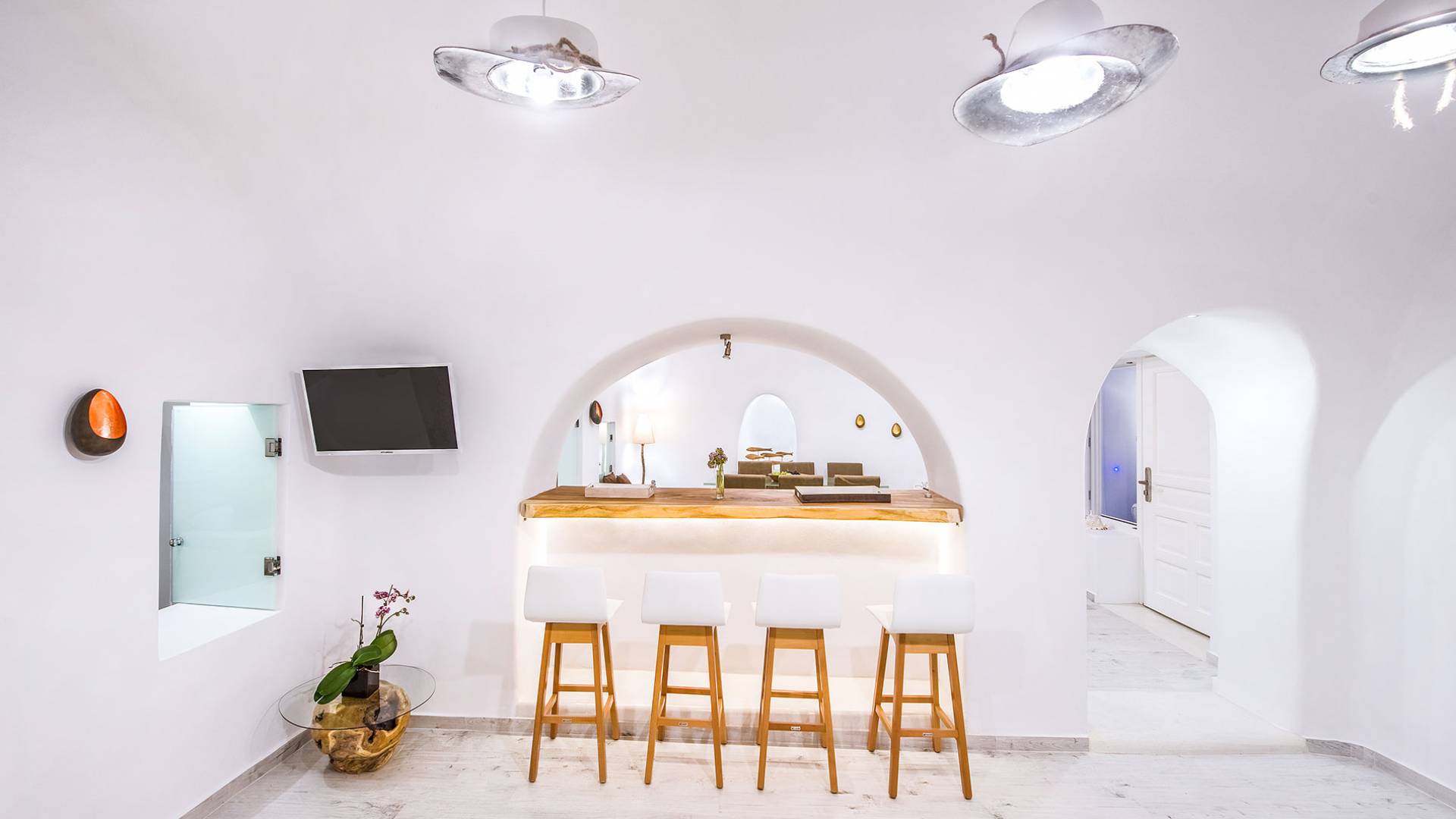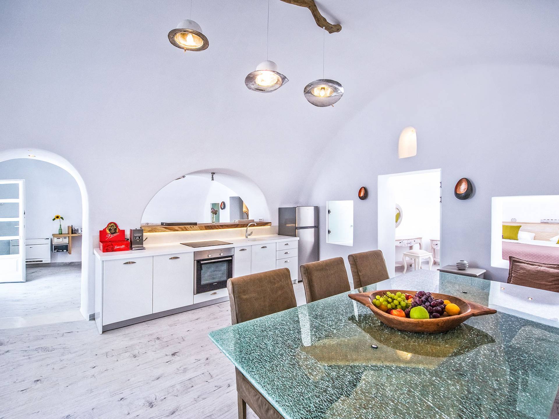 El diseño de bellas artes interiores de esta magnífica villa con piscina de dos dormitorios en una cueva incluye el valor máximo del espacio, coqueteando con las luces y sombras de la antigua Grecia. Las formas casi espirituales de las paredes, los mármoles blancos y los detalles dorados le ofrecen un ambiente lujoso con una simplicidad antigua con todas las comodidades modernas. Sumérjase en su propia gran piscina climatizada al aire libre en una cueva con hidromasaje y excite sus sentidos. Camine hacia su balcón para disfrutar de las impresionantes vistas de Caldera, el mar Egeo y las incomparables vistas directas del atardecer de Santorini.