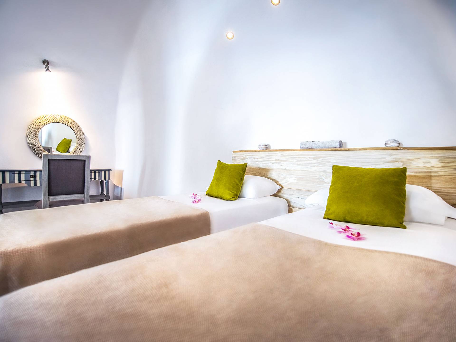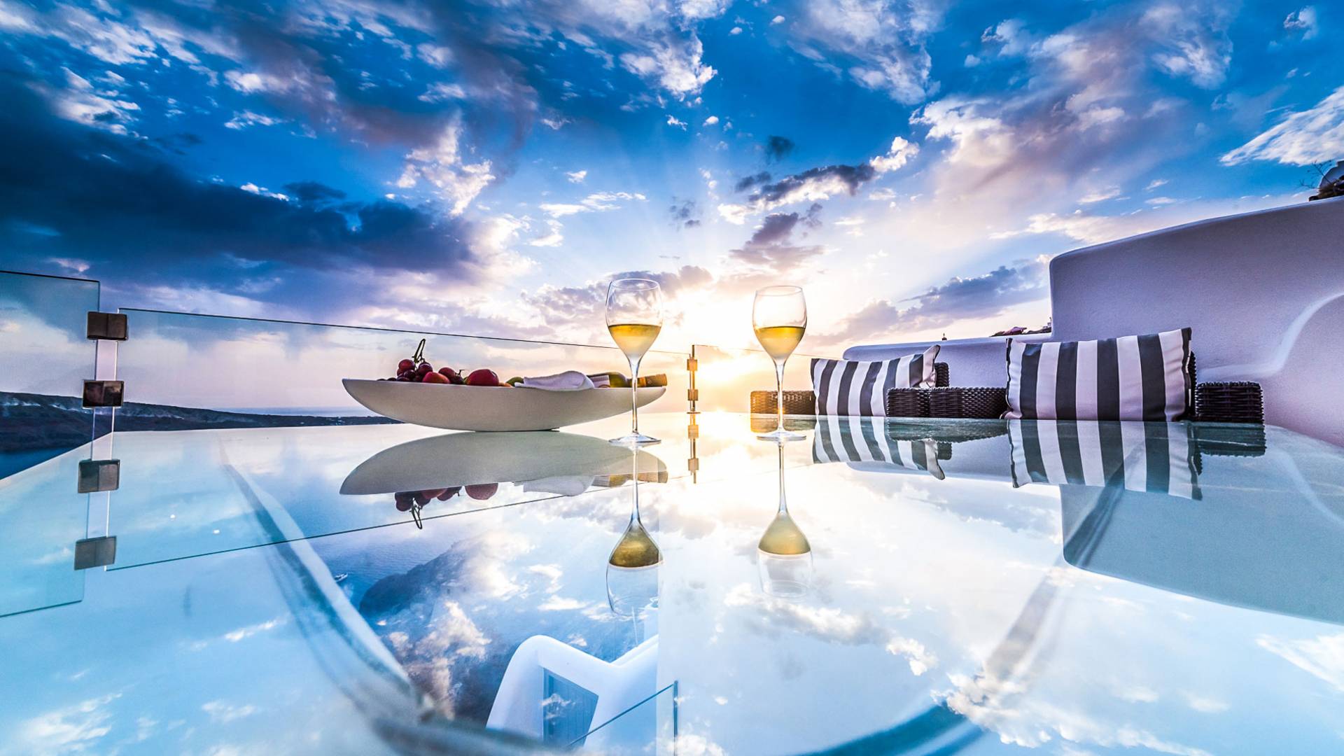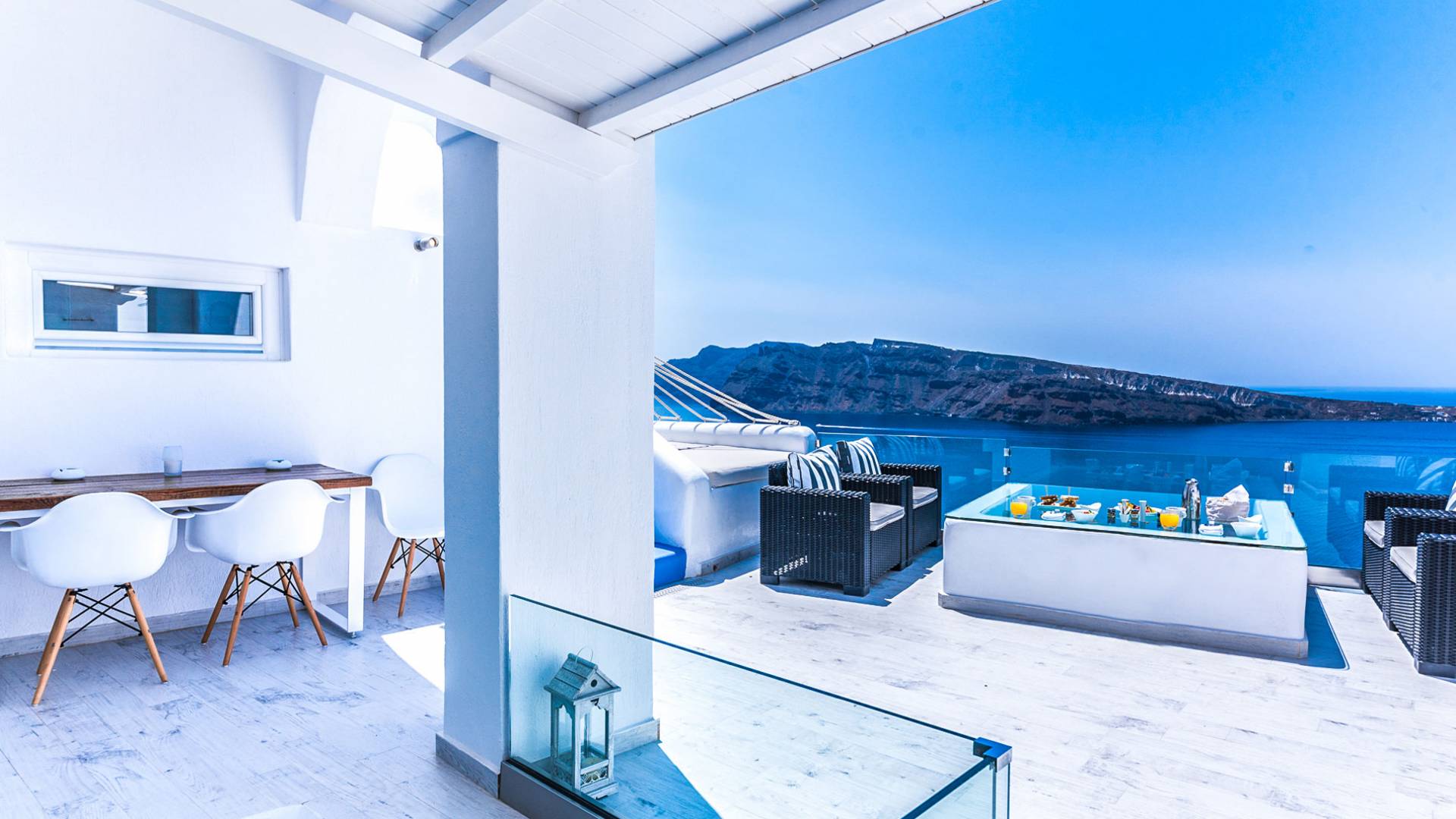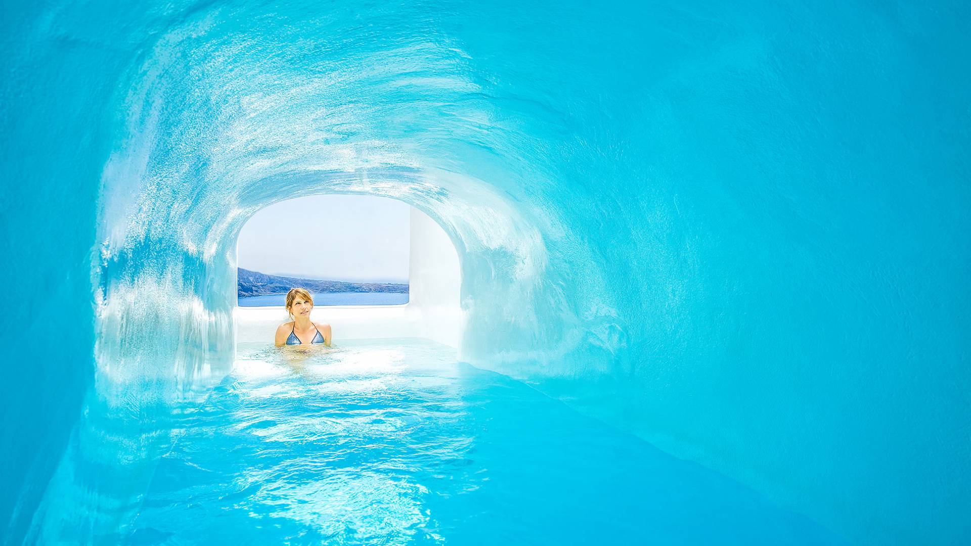 El diseño de bellas artes interiores de esta magnífica villa con piscina de dos dormitorios en una cueva incluye el valor máximo del espacio, coqueteando con las luces y sombras de la antigua Grecia. Las formas casi espirituales de las paredes, los mármoles blancos y los detalles dorados le ofrecen un ambiente lujoso con una simplicidad antigua con todas las comodidades modernas. Sumérjase en su propia gran piscina climatizada al aire libre en una cueva con hidromasaje y excite sus sentidos. Camine hacia su balcón para disfrutar de las impresionantes vistas de Caldera, el mar Egeo y las incomparables vistas directas del atardecer de Santorini.