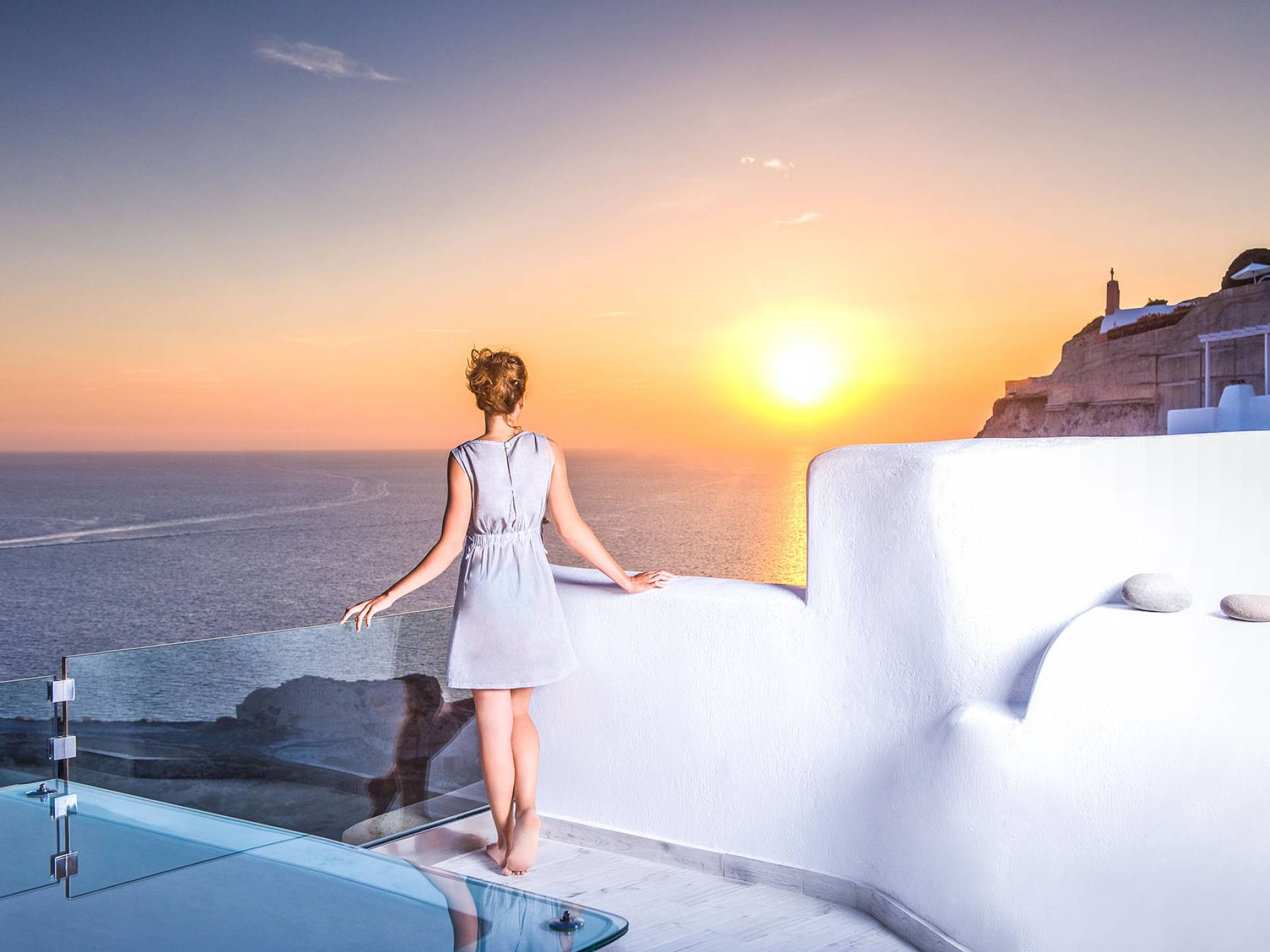 Villa Helios en Hyperion Oia Suites Santorini es una villa cueva privada de 100 metros cuadrados en Oia con dos dormitorios y una piscina privada climatizada estilo cueva en el gran balcón con vista al mar, el puerto de Ammoudi y vista directa al atardecer en la intimidad. Decorado con detalles modernos y minimalistas en blanco, el juego interminable de sombras y luces crea una combinación artística de lujo moderno.
