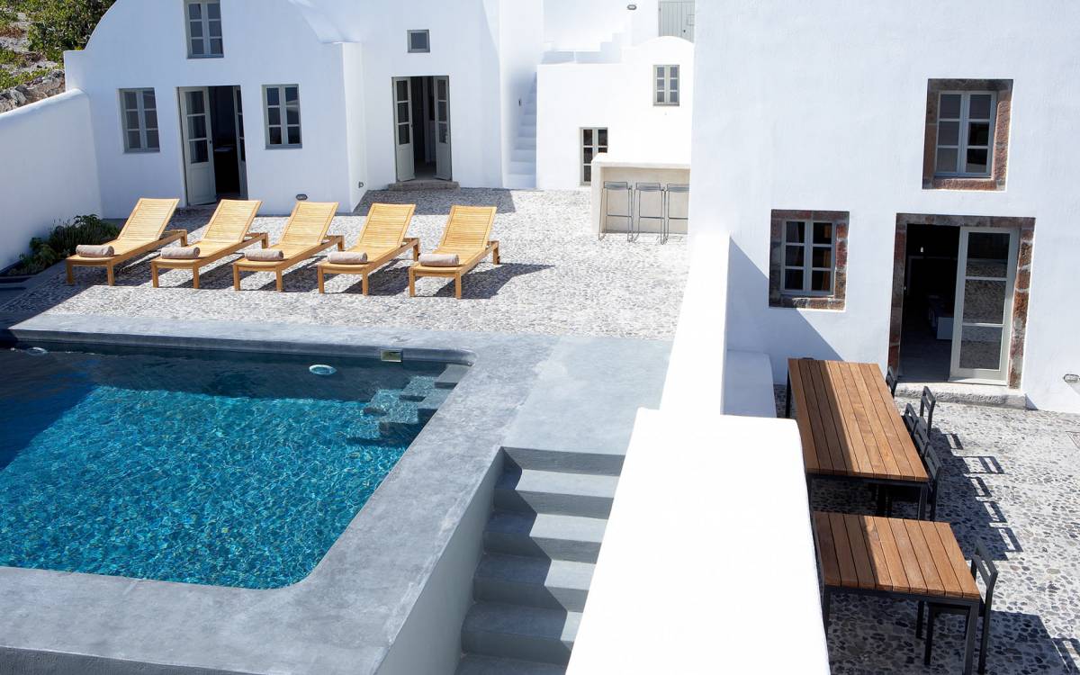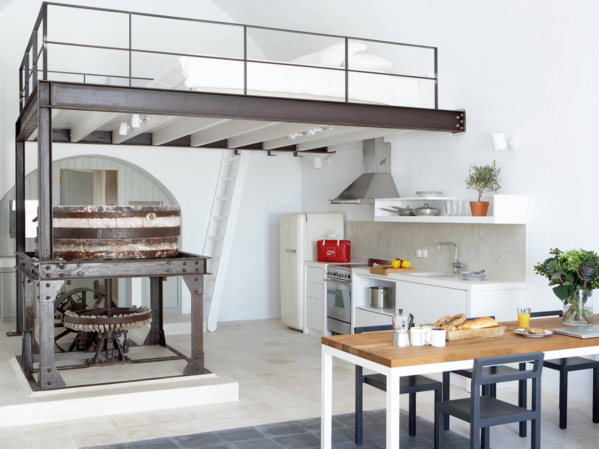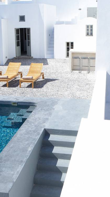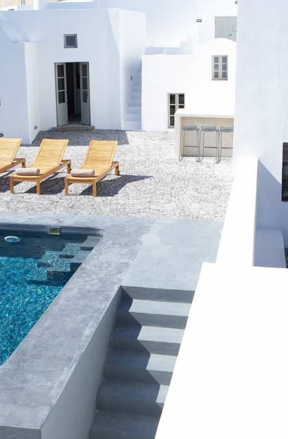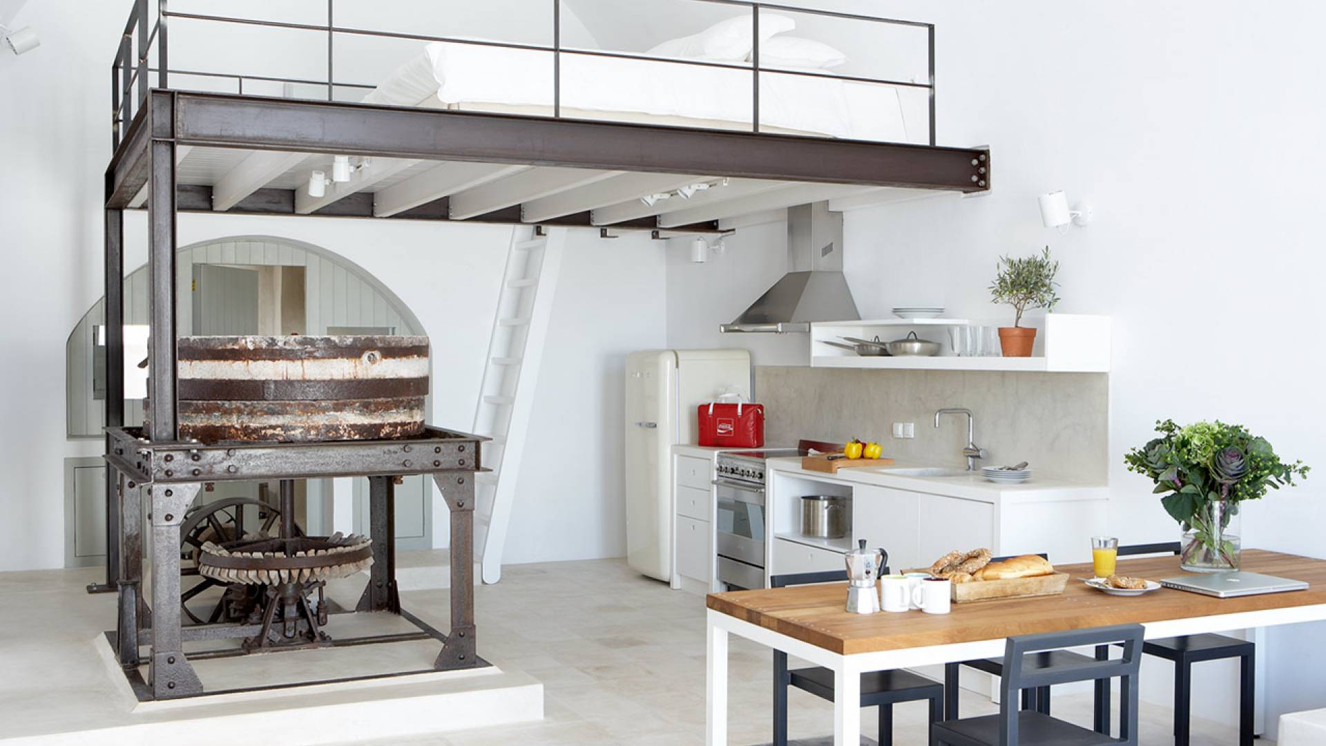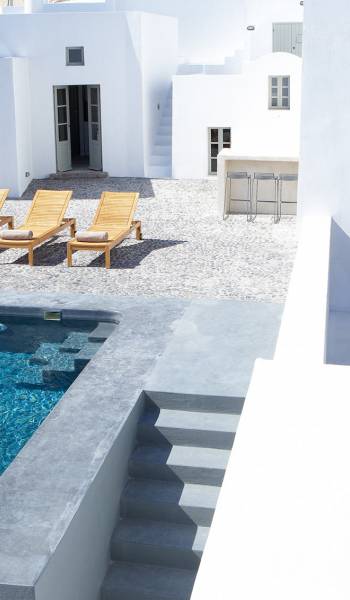 La propiedad tiene un diseño de estilo loft muy elegante y minimalista y ha sido restaurada con un profundo conocimiento de su arquitectura tradicional de Santorini utilizando el estilo antiguo de cemento pulido y materiales ecológicos. Se han incorporado elementos de la fábrica al diseño, y una enorme pieza de maquinaria se erige como una magnífica escultura como pieza central de uno de los numerosos espacios habitables. El proyecto de restauración tomó años de meticulosa investigación, ya que Fabrica se encuentra justo debajo del históricamente importante Castillo de Pyrgos. Los pisos fueron creados minuciosamente por un artesano local, que mezcló colores y cemento para crear el hermoso acabado mate en todas partes. Santorini es famosa por su arquitectura orgánica de las Cícladas, pero no todos los días puedes experimentar una como esta.