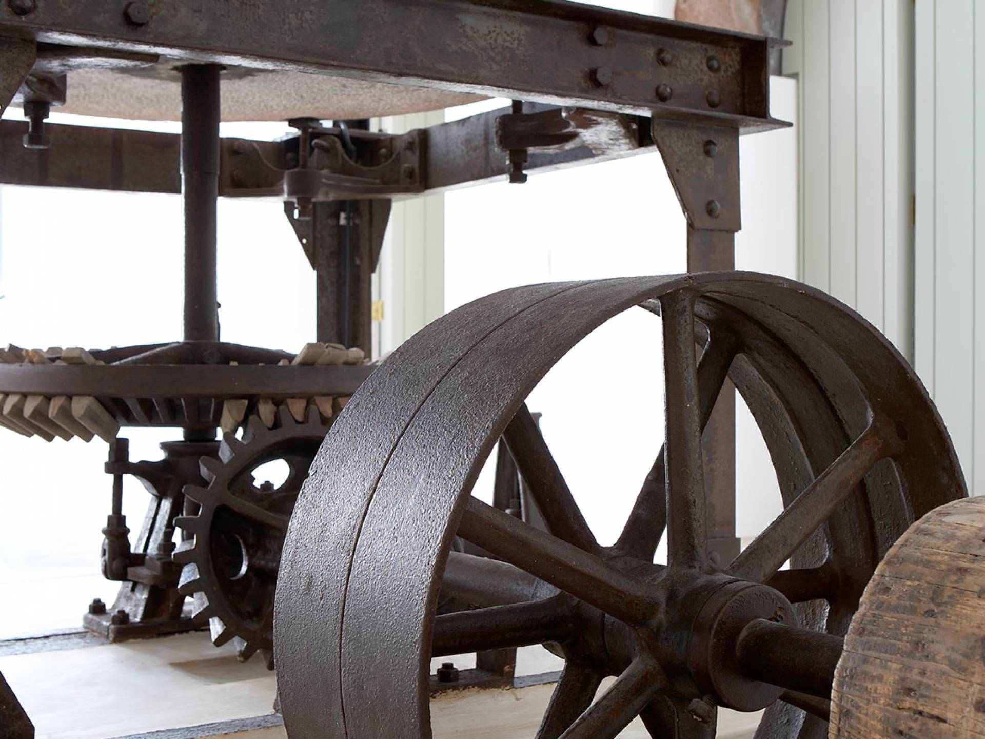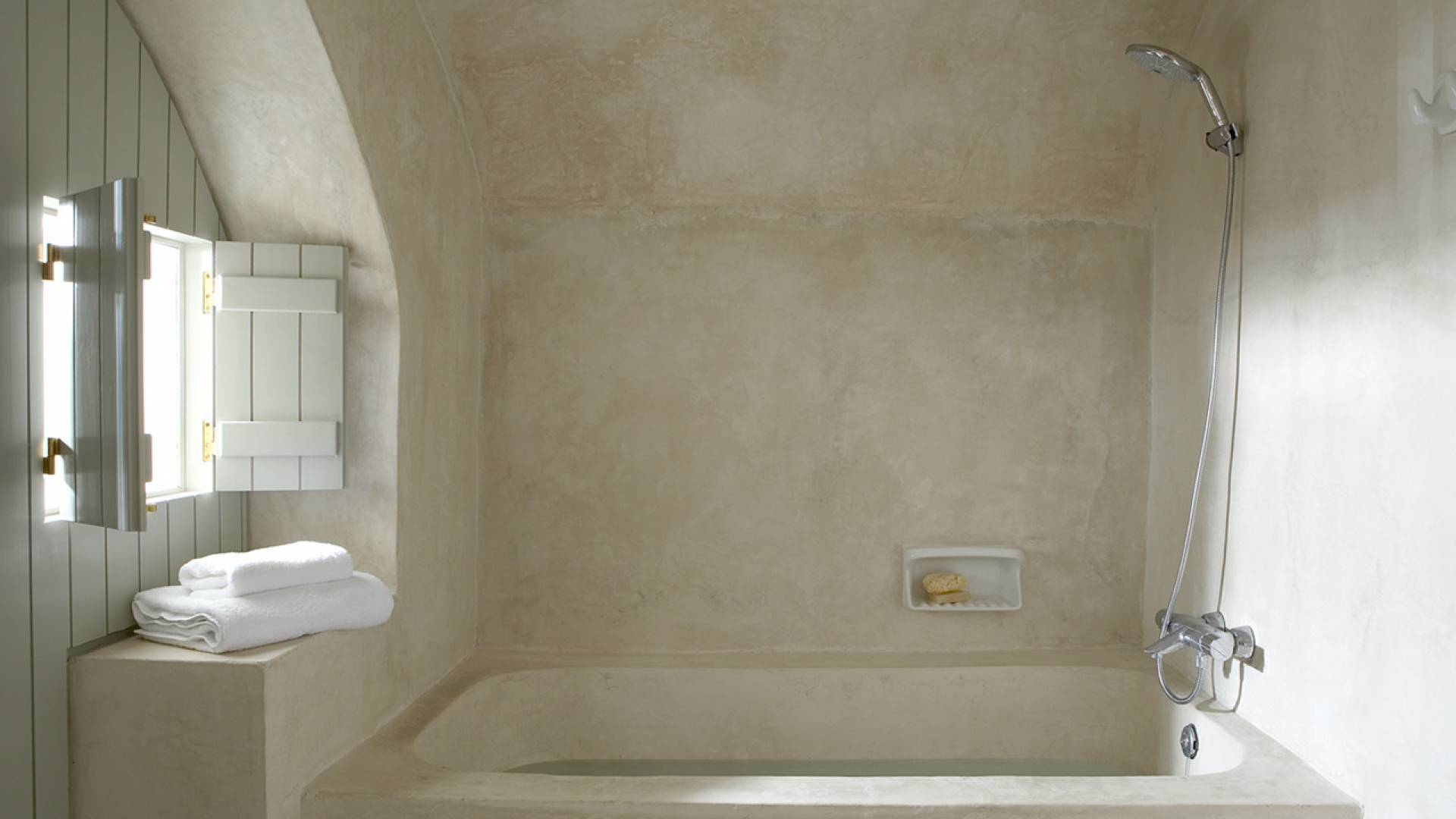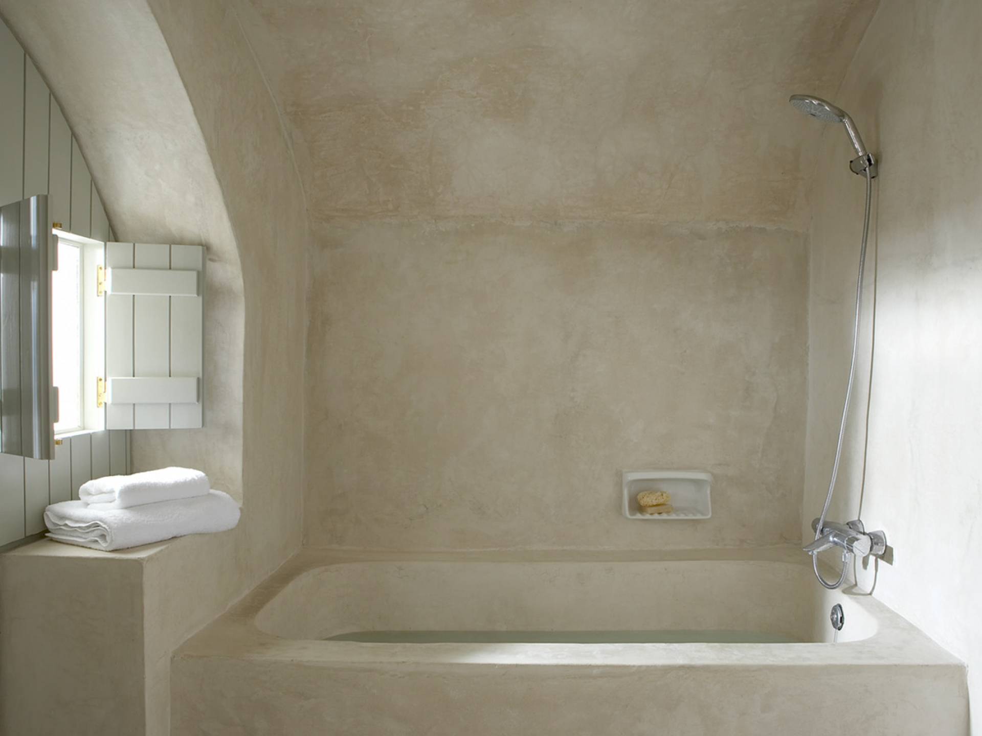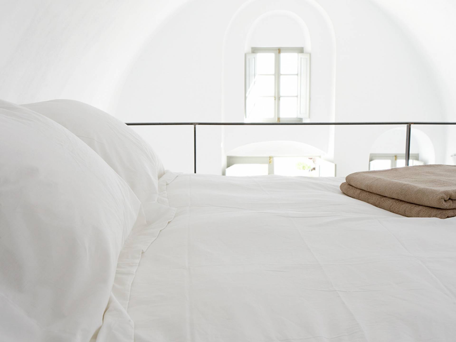 La propiedad tiene un diseño de estilo loft muy elegante y minimalista y ha sido restaurada con un profundo conocimiento de su arquitectura tradicional de Santorini utilizando el estilo antiguo de cemento pulido y materiales ecológicos. Se han incorporado elementos de la fábrica al diseño, y una enorme pieza de maquinaria se erige como una magnífica escultura como pieza central de uno de los numerosos espacios habitables. El proyecto de restauración tomó años de meticulosa investigación, ya que Fabrica se encuentra justo debajo del históricamente importante Castillo de Pyrgos. Los pisos fueron creados minuciosamente por un artesano local, que mezcló colores y cemento para crear el hermoso acabado mate en todas partes. Santorini es famosa por su arquitectura orgánica de las Cícladas, pero no todos los días puedes experimentar una como esta.