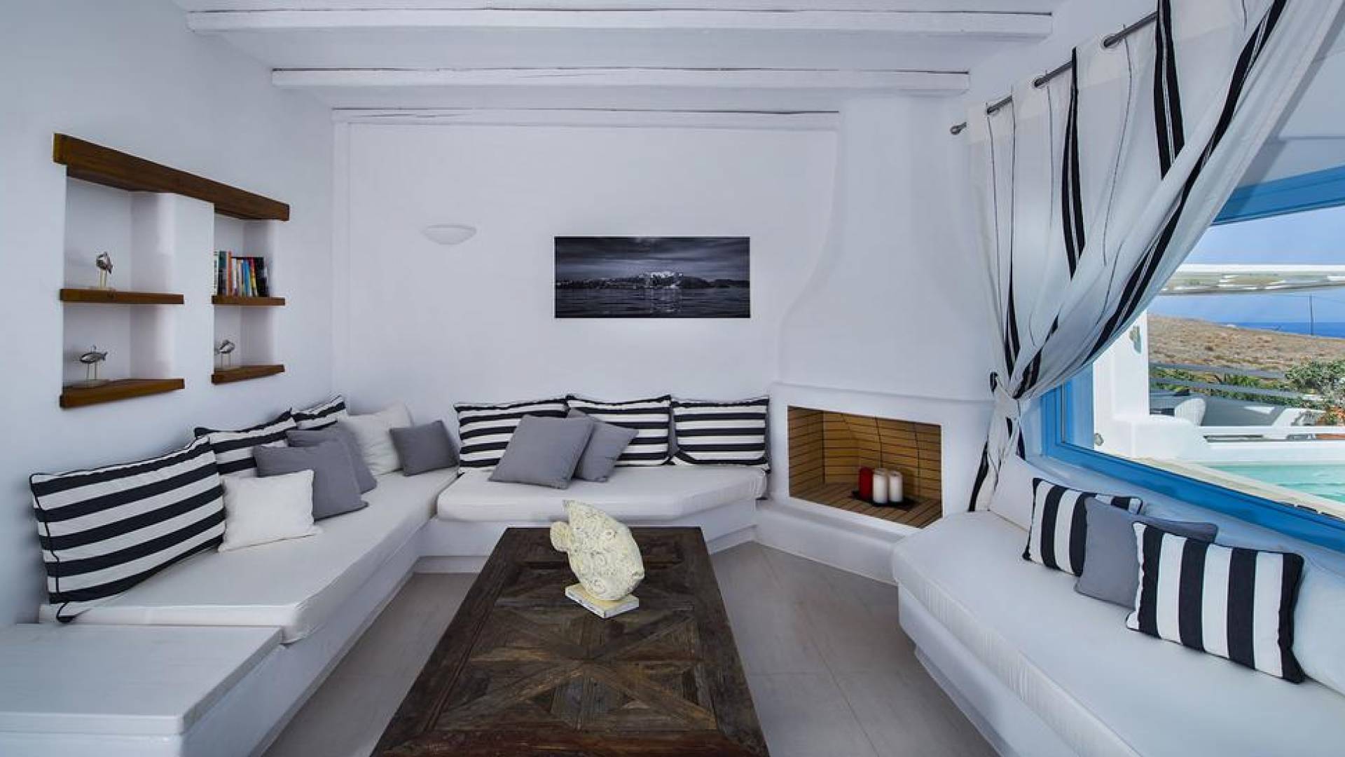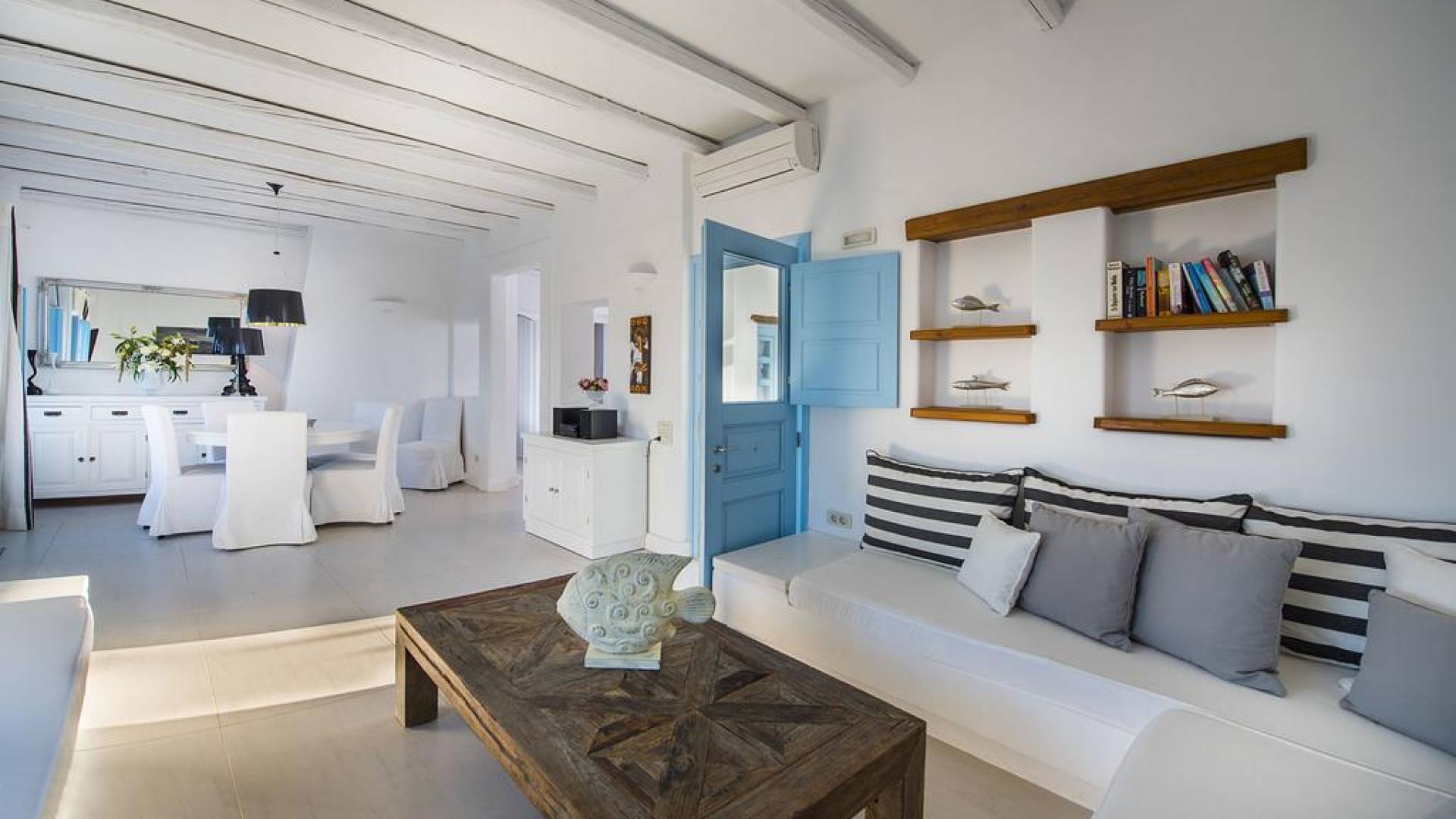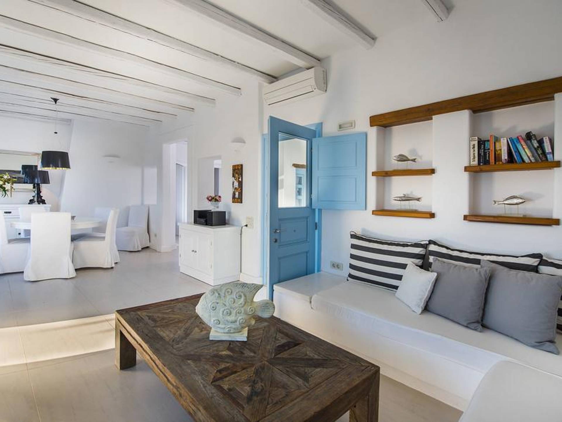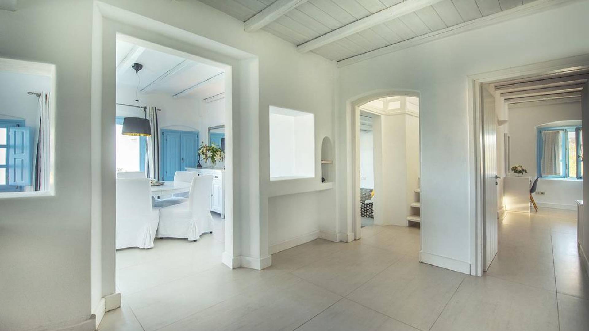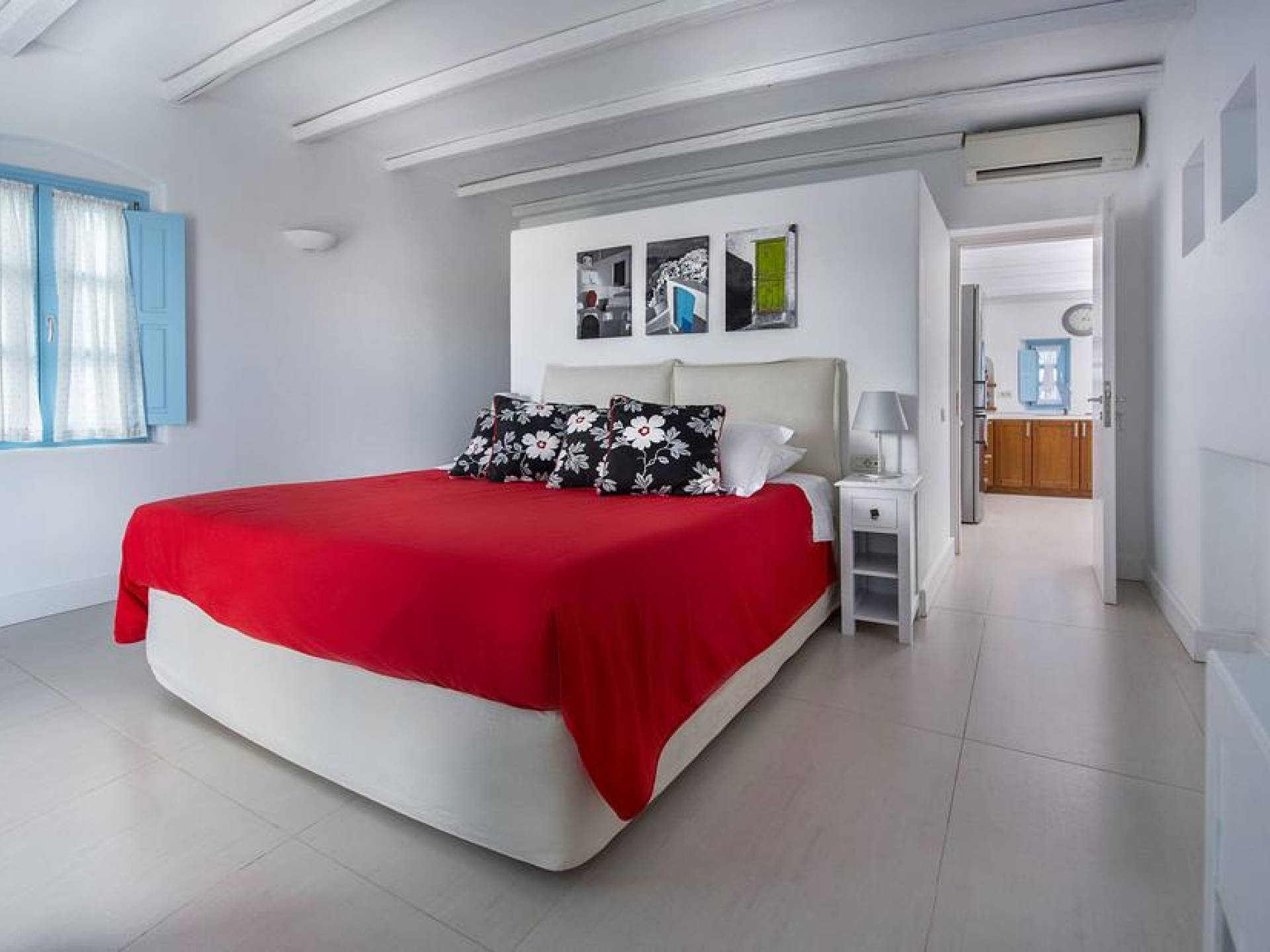 El interior de Tramountana Villa Santorini está decorado con buen gusto y amueblado con piezas de diseño moderno combinadas con piezas antiguas. La entrada principal lo lleva a una sala de estar y comedor de planta abierta, luminosa y espaciosa, con cómodos sofás construidos al estilo de la isla y equipada con TV de pantalla plana y sistema de sonido de última generación, con una selección de CD y DVD. Tiene una ventana panorámica que da al mar para que pueda ser hechizado por el mar en constante cambio sin importar el clima. Si lo necesita, también hay una chimenea. La gran cocina totalmente equipada tiene todo el equipamiento necesario para cocinar sus comidas. Si no le gusta cocinar, pídale a nuestro chef que le prepare una comida. Los dormitorios: