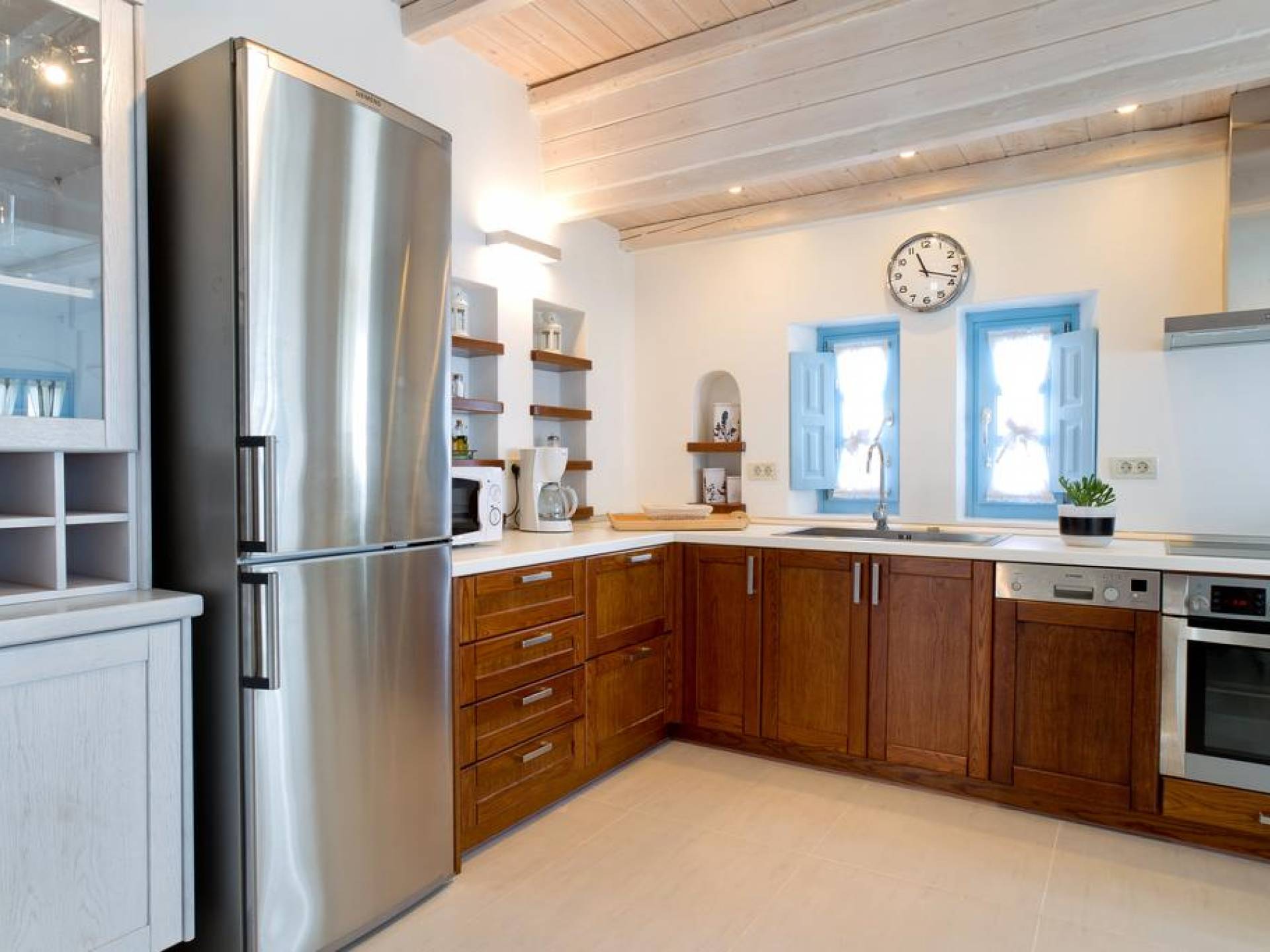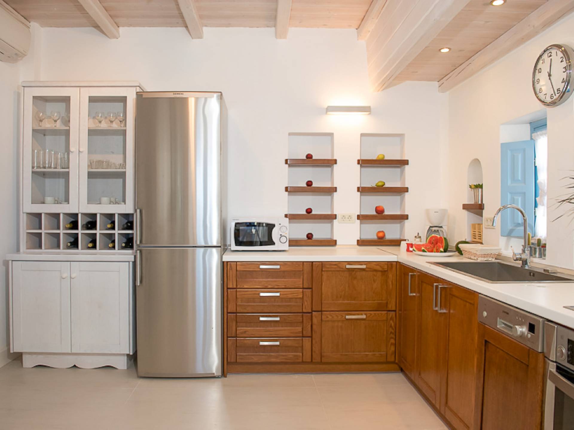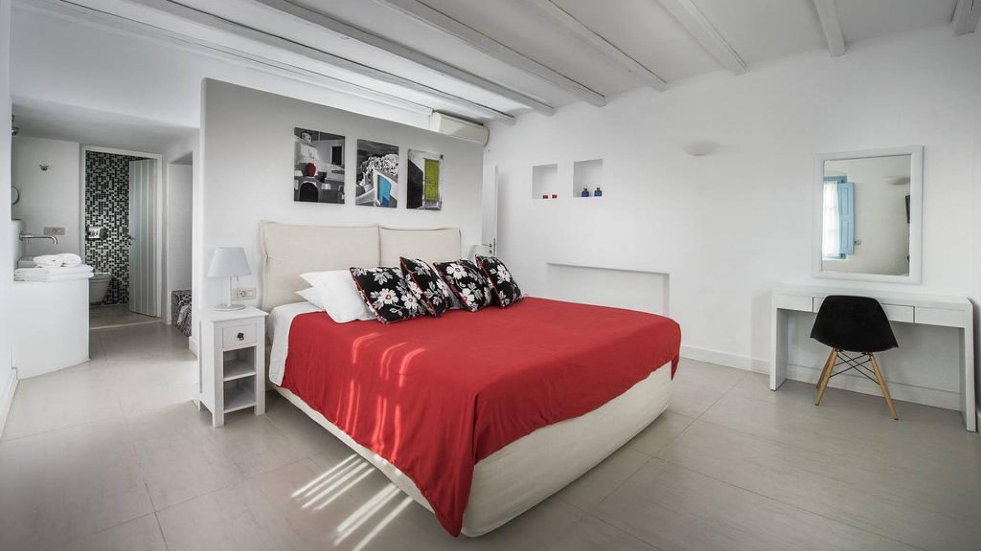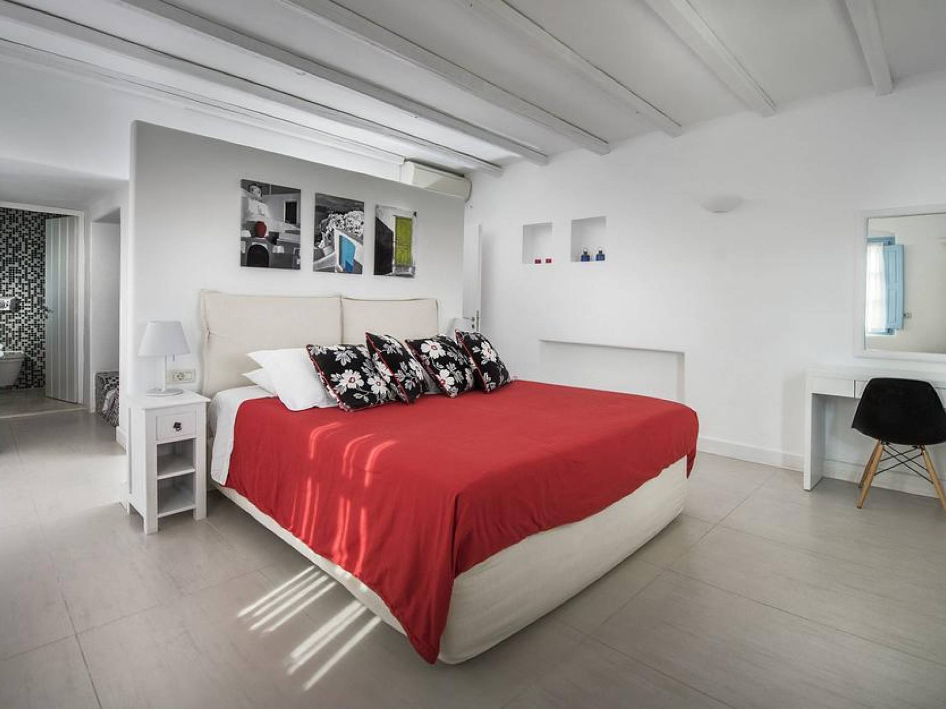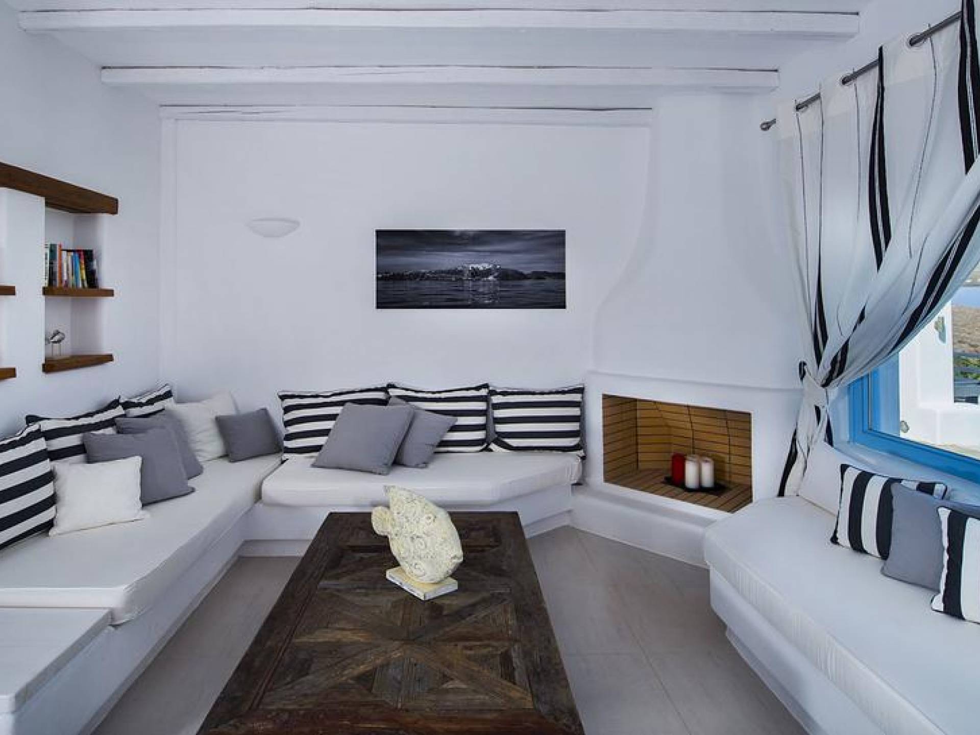 El interior de Tramountana Villa Santorini está decorado con buen gusto y amueblado con piezas de diseño moderno combinadas con piezas antiguas. La entrada principal lo lleva a una sala de estar y comedor de planta abierta, luminosa y espaciosa, con cómodos sofás construidos al estilo de la isla y equipada con TV de pantalla plana y sistema de sonido de última generación, con una selección de CD y DVD. Tiene una ventana panorámica que da al mar para que pueda ser hechizado por el mar en constante cambio sin importar el clima. Si lo necesita, también hay una chimenea. La gran cocina totalmente equipada tiene todo el equipamiento necesario para cocinar sus comidas. Si no le gusta cocinar, pídale a nuestro chef que le prepare una comida. Los dormitorios: