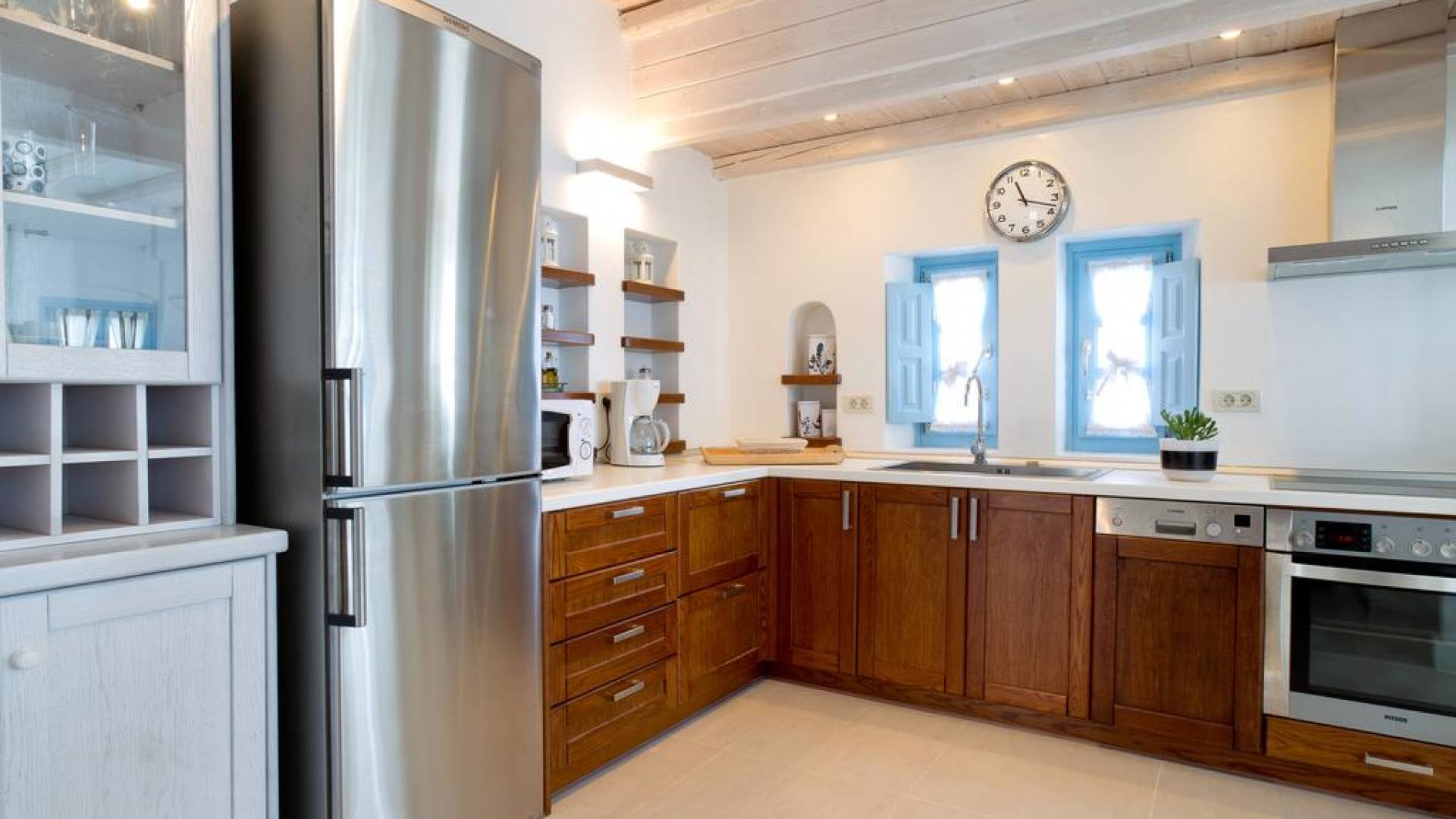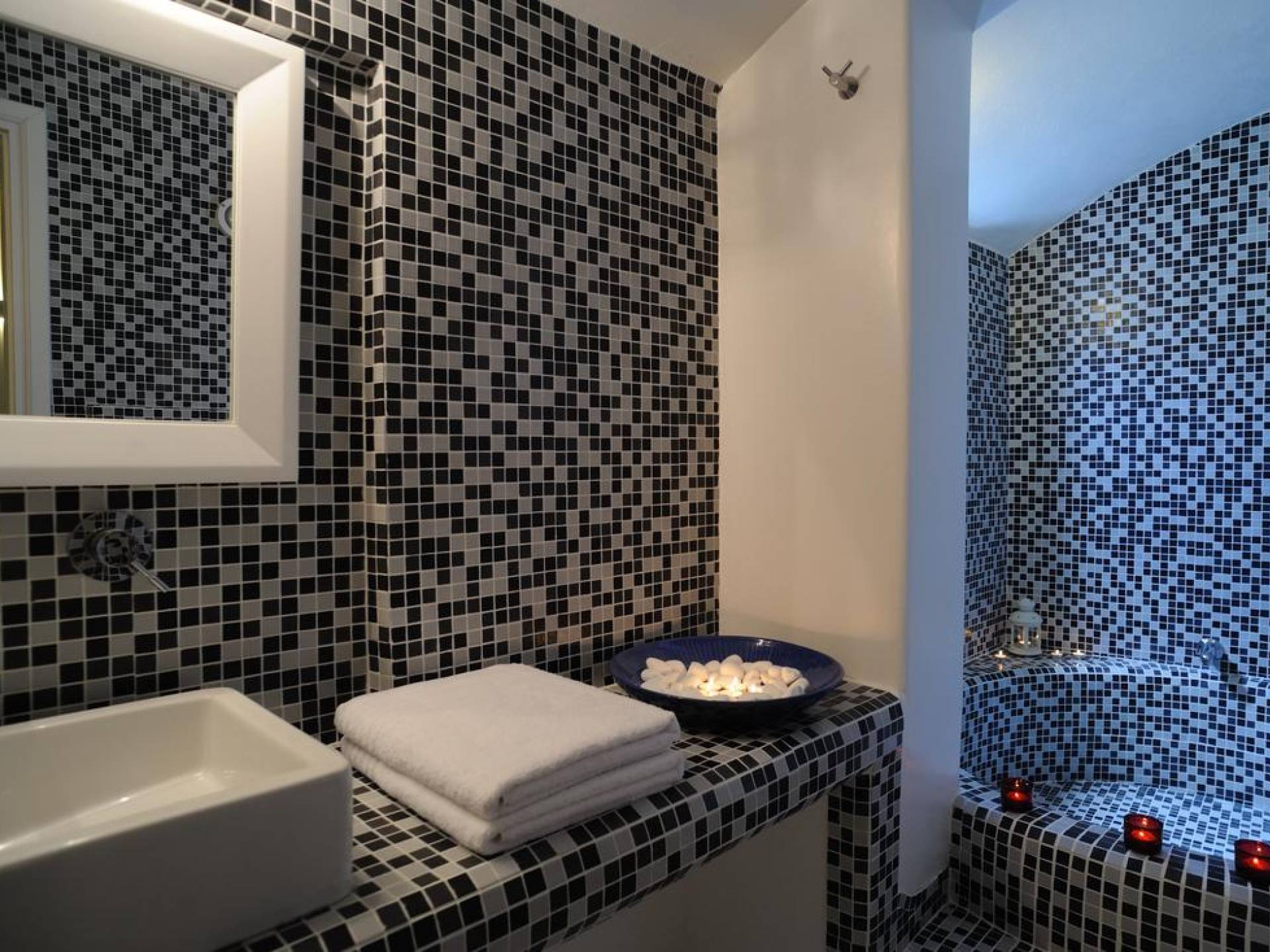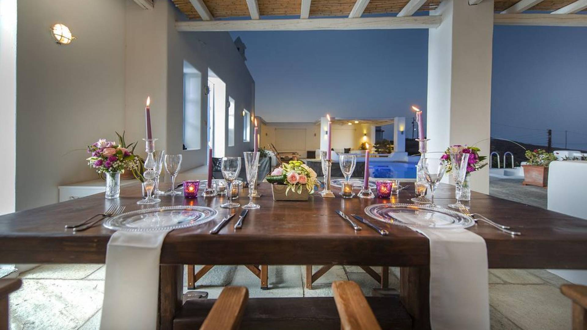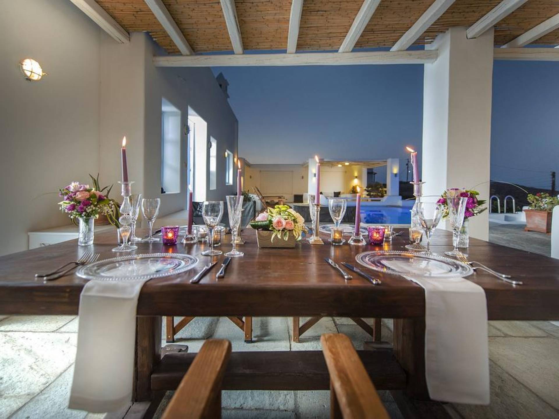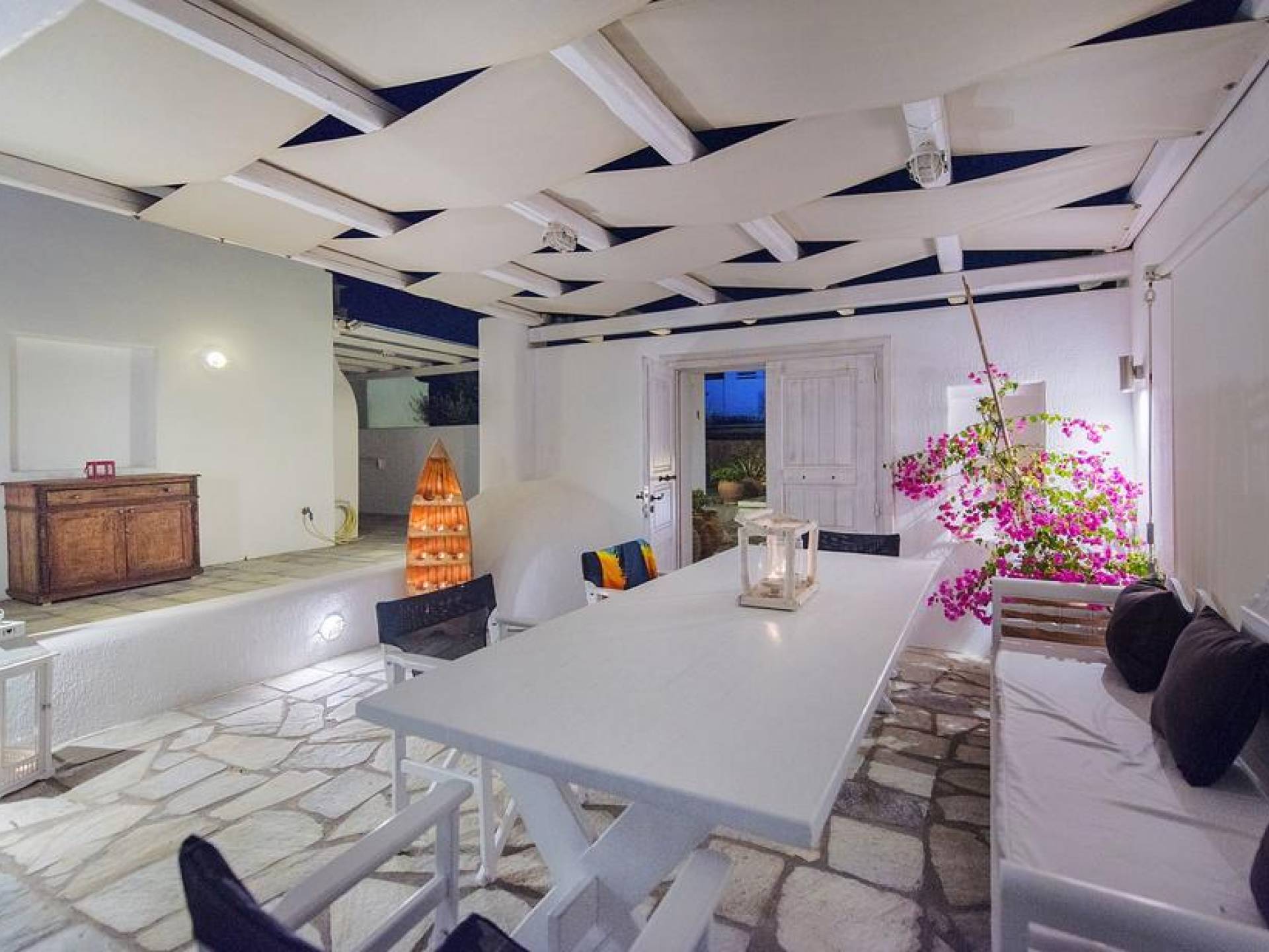 El interior de Tramountana Villa Santorini está decorado con buen gusto y amueblado con piezas de diseño moderno combinadas con piezas antiguas. La entrada principal lo lleva a una sala de estar y comedor de planta abierta, luminosa y espaciosa, con cómodos sofás construidos al estilo de la isla y equipada con TV de pantalla plana y sistema de sonido de última generación, con una selección de CD y DVD. Tiene una ventana panorámica que da al mar para que pueda ser hechizado por el mar en constante cambio sin importar el clima. Si lo necesita, también hay una chimenea. La gran cocina totalmente equipada tiene todo el equipamiento necesario para cocinar sus comidas. Si no le gusta cocinar, pídale a nuestro chef que le prepare una comida. Los dormitorios: