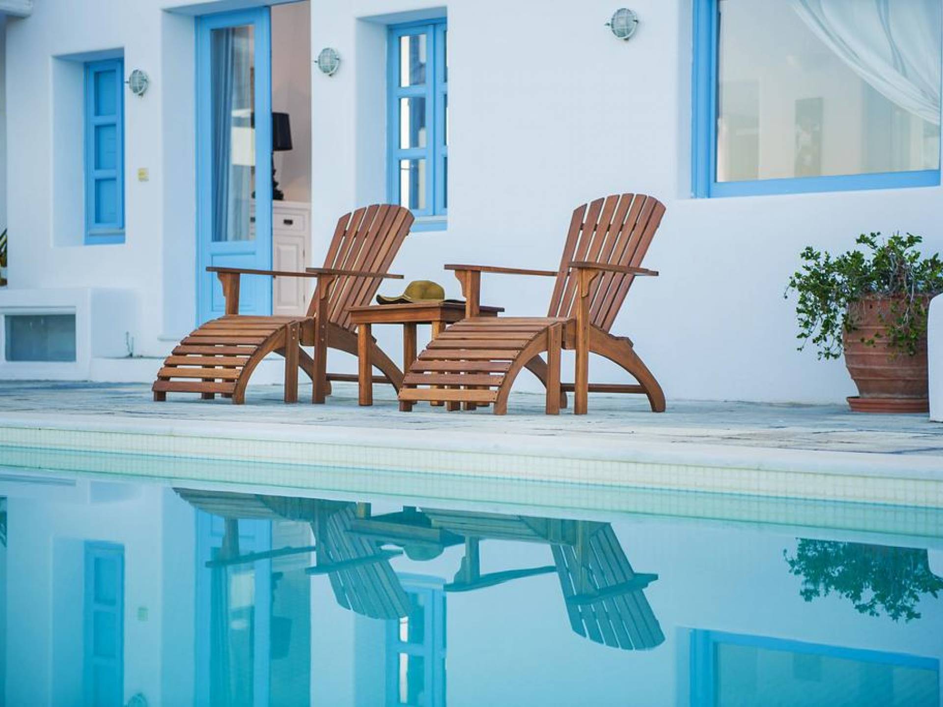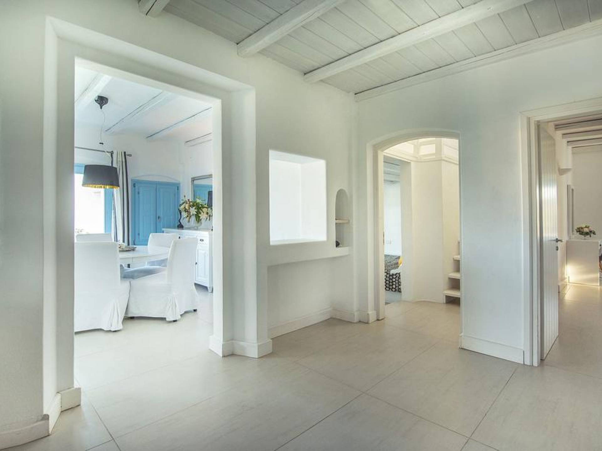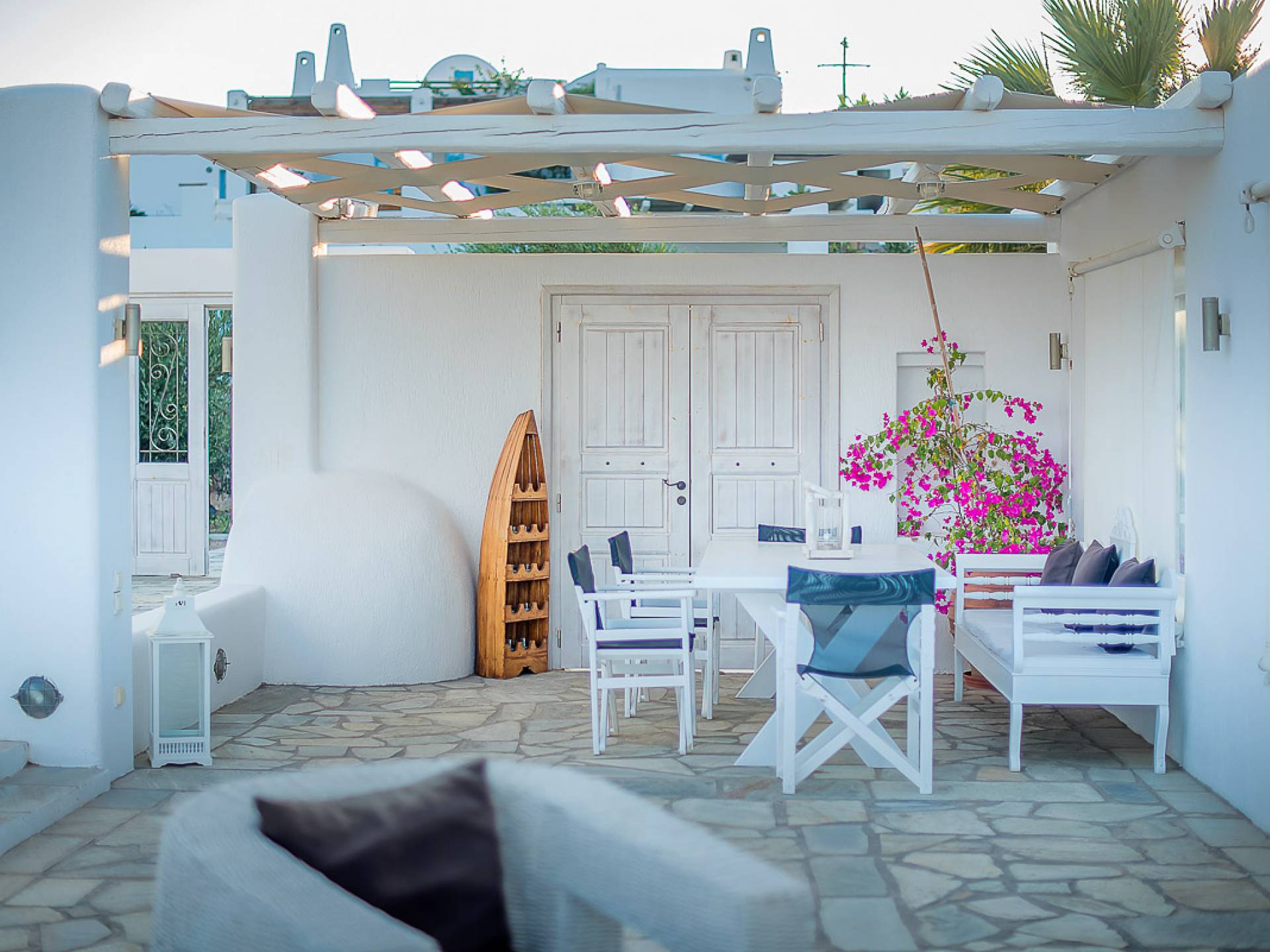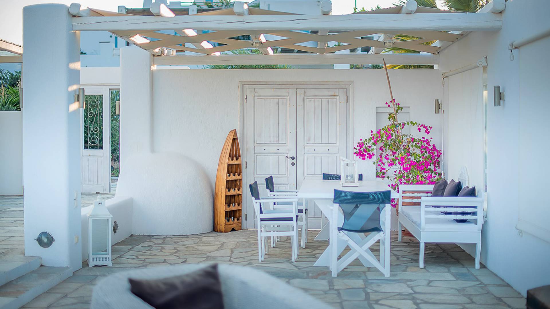 El interior de Tramountana Villa Santorini está decorado con buen gusto y amueblado con piezas de diseño moderno combinadas con piezas antiguas. La entrada principal lo lleva a una sala de estar y comedor de planta abierta, luminosa y espaciosa, con cómodos sofás construidos al estilo de la isla y equipada con TV de pantalla plana y sistema de sonido de última generación, con una selección de CD y DVD. Tiene una ventana panorámica que da al mar para que pueda ser hechizado por el mar en constante cambio sin importar el clima. Si lo necesita, también hay una chimenea. La gran cocina totalmente equipada tiene todo el equipamiento necesario para cocinar sus comidas. Si no le gusta cocinar, pídale a nuestro chef que le prepare una comida. Los dormitorios:
