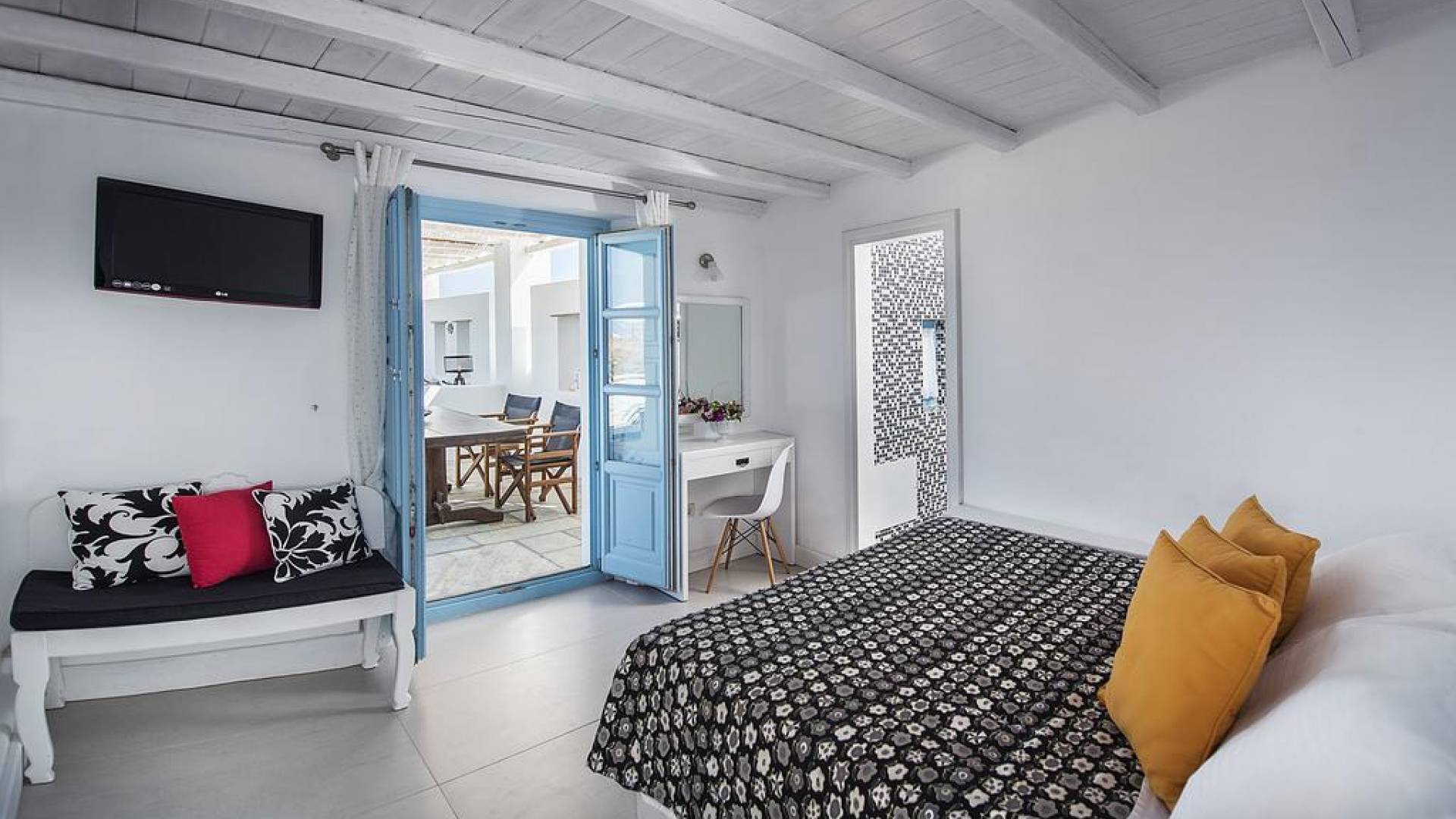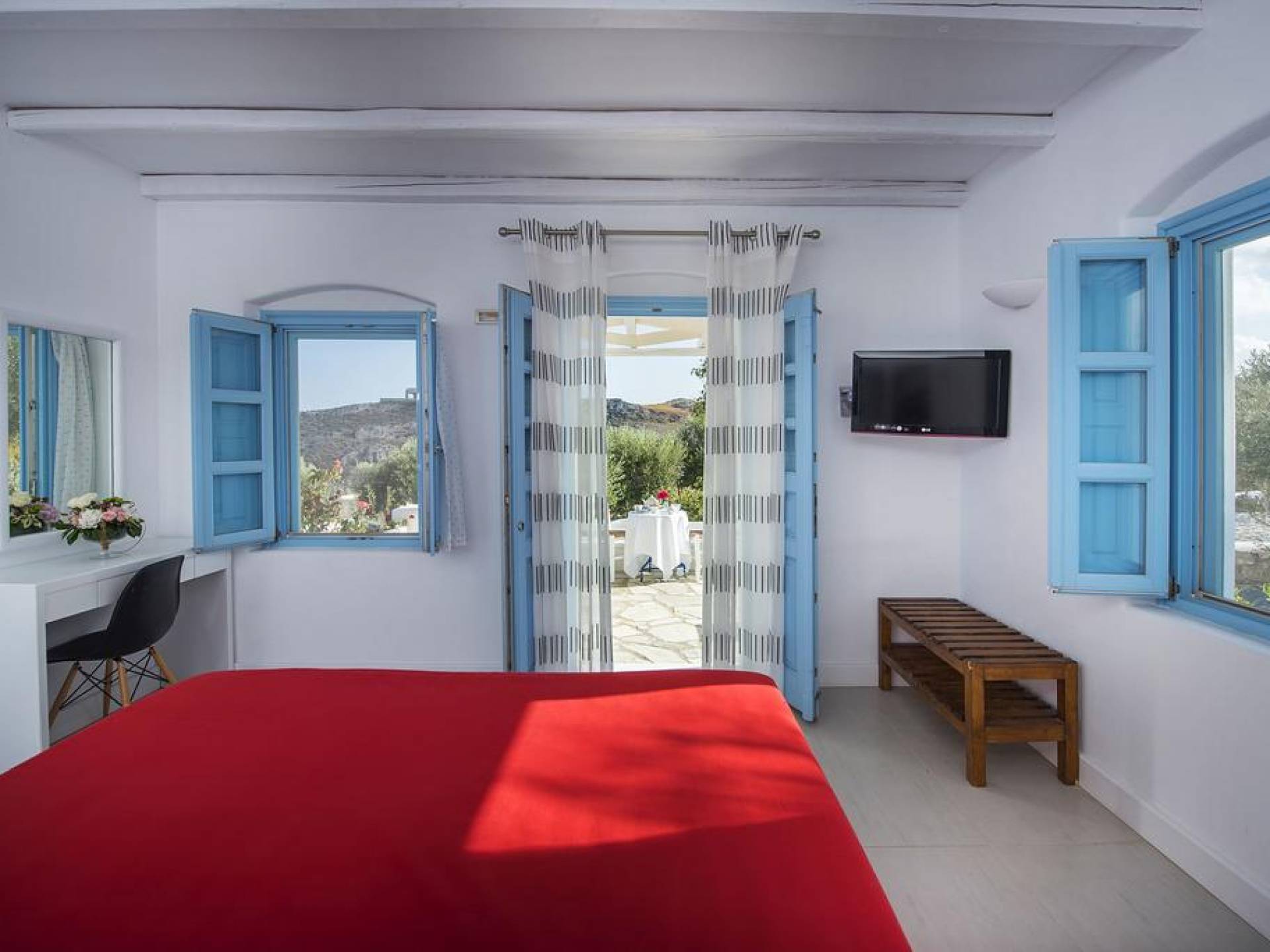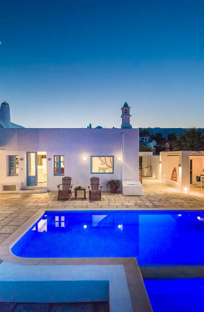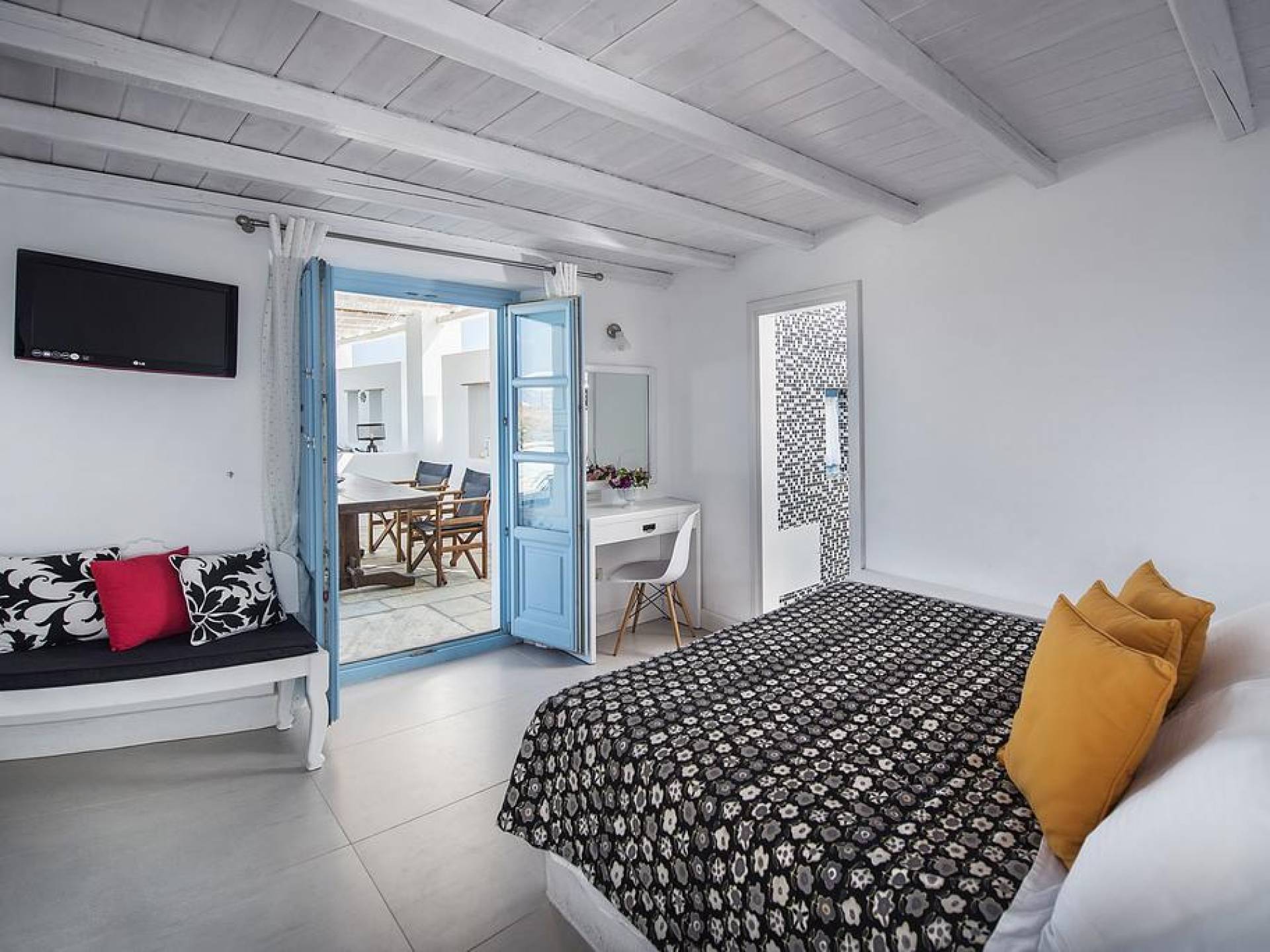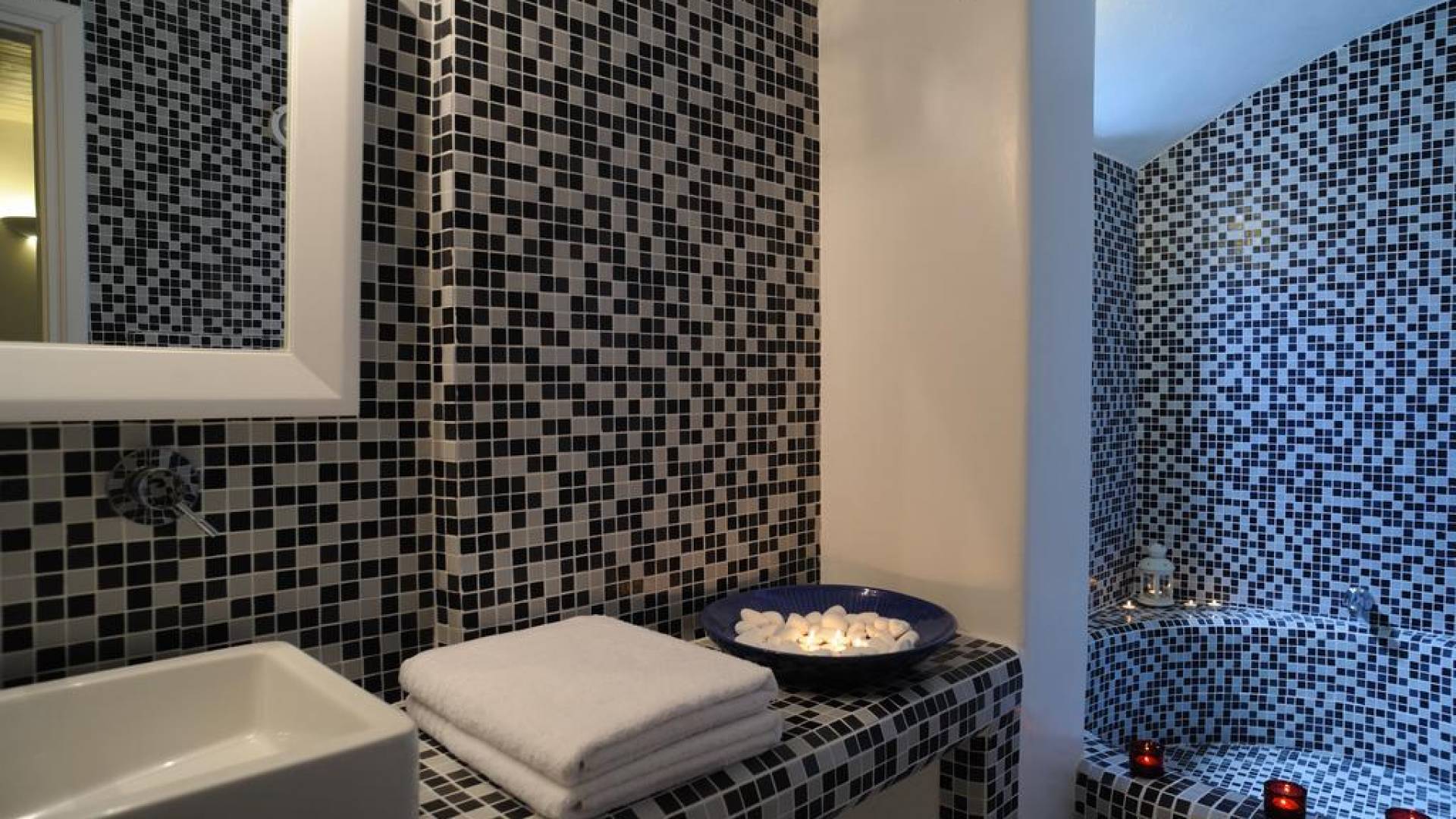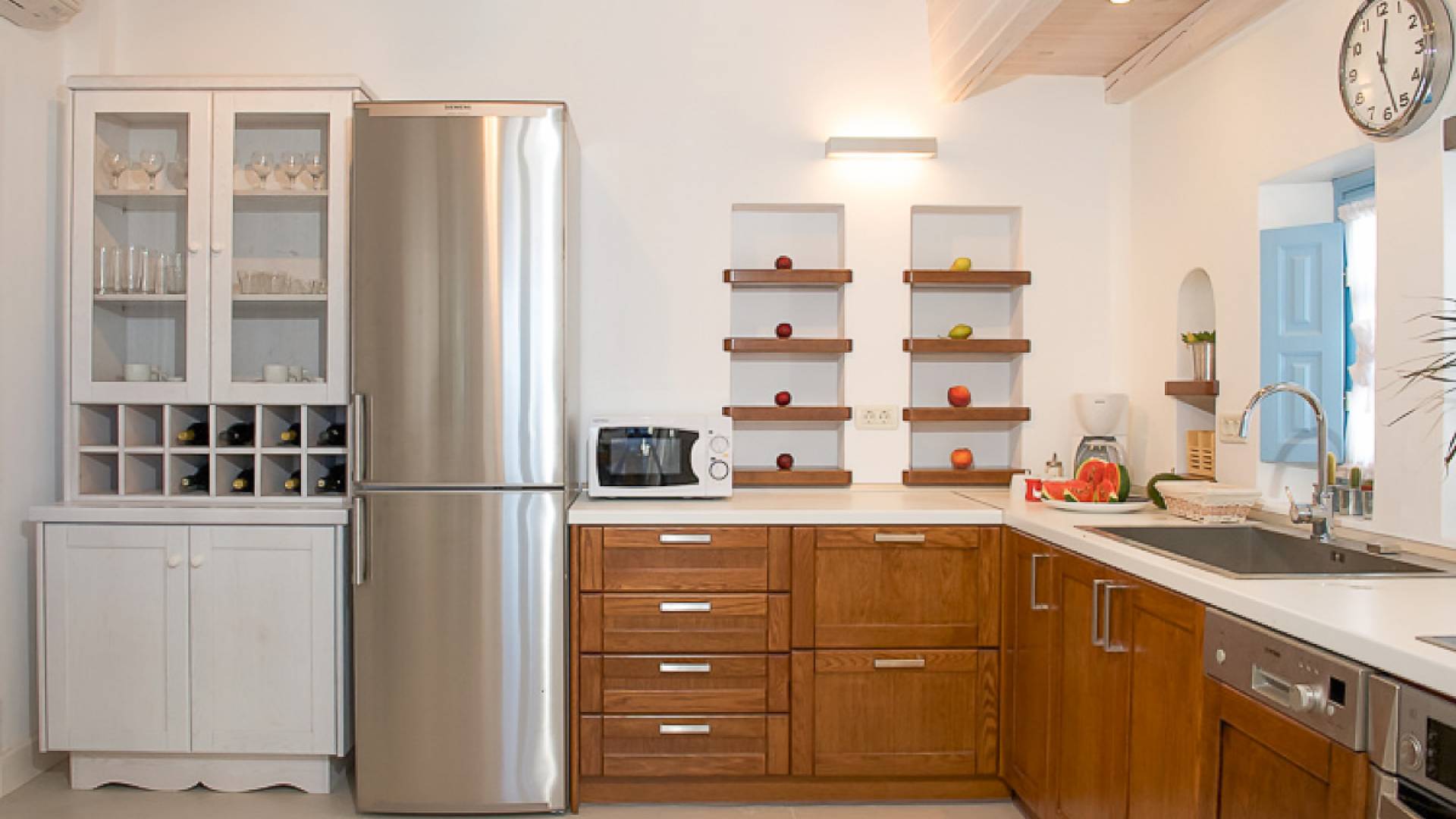 El interior de Tramountana Villa Santorini está decorado con buen gusto y amueblado con piezas de diseño moderno combinadas con piezas antiguas. La entrada principal lo lleva a una sala de estar y comedor de planta abierta, luminosa y espaciosa, con cómodos sofás construidos al estilo de la isla y equipada con TV de pantalla plana y sistema de sonido de última generación, con una selección de CD y DVD. Tiene una ventana panorámica que da al mar para que pueda ser hechizado por el mar en constante cambio sin importar el clima. Si lo necesita, también hay una chimenea. La gran cocina totalmente equipada tiene todo el equipamiento necesario para cocinar sus comidas. Si no le gusta cocinar, pídale a nuestro chef que le prepare una comida. Los dormitorios: