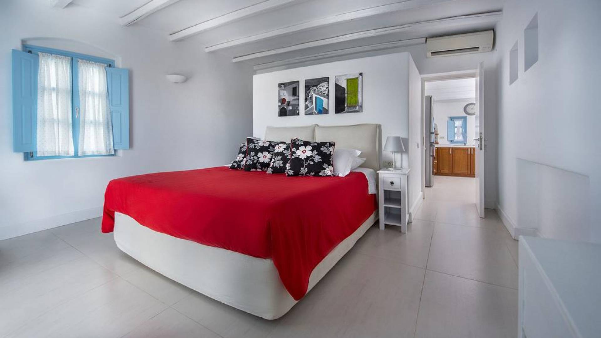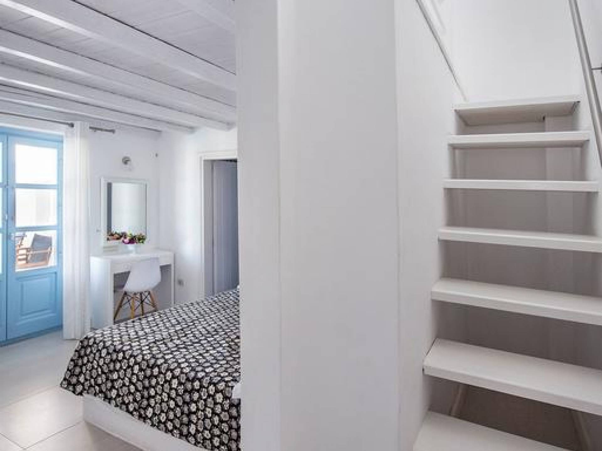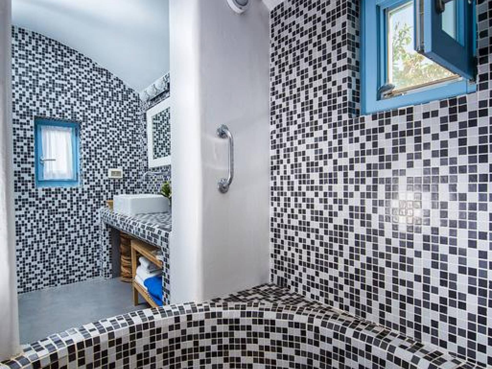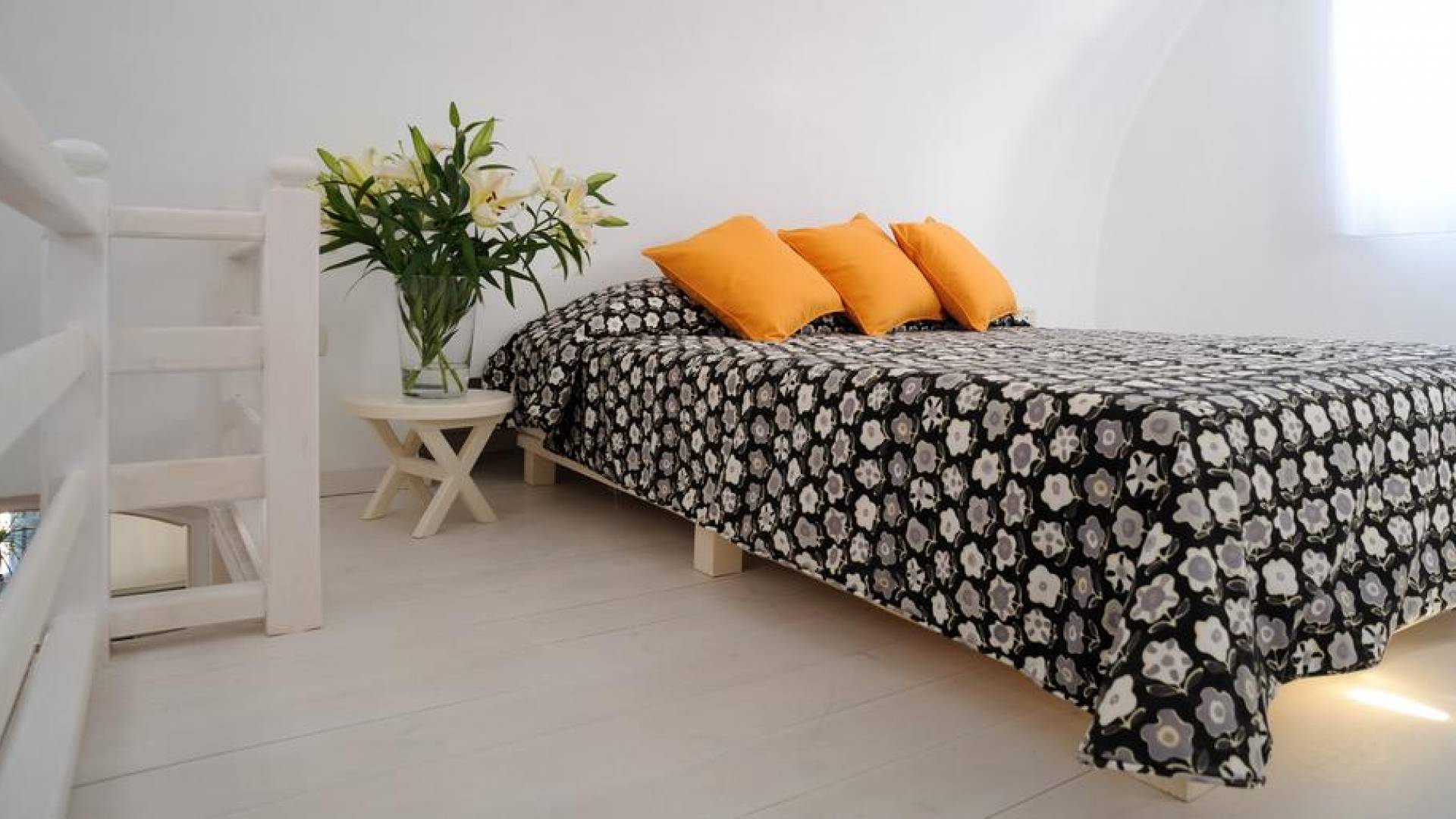 El dormitorio "A" cuenta con una cama tamaño queen y tiene acceso a una terraza privada con hermosas vistas al campo y al pueblo de Firostefani. No solo se beneficia de un vestidor, sino que el baño en suite también tiene una ducha y una bañera rectangular. El dormitorio "B" cuenta con una cama queen size y tiene hermosas vistas al mar. Incluye un armario y un baño en suite con ducha y bañera redonda, perfecto para crear un ambiente romántico, ¡completo con velas e iluminación tenue! Dormitorio tipo loft "C", ubicado encima del dormitorio "B", con una cama doble baja.