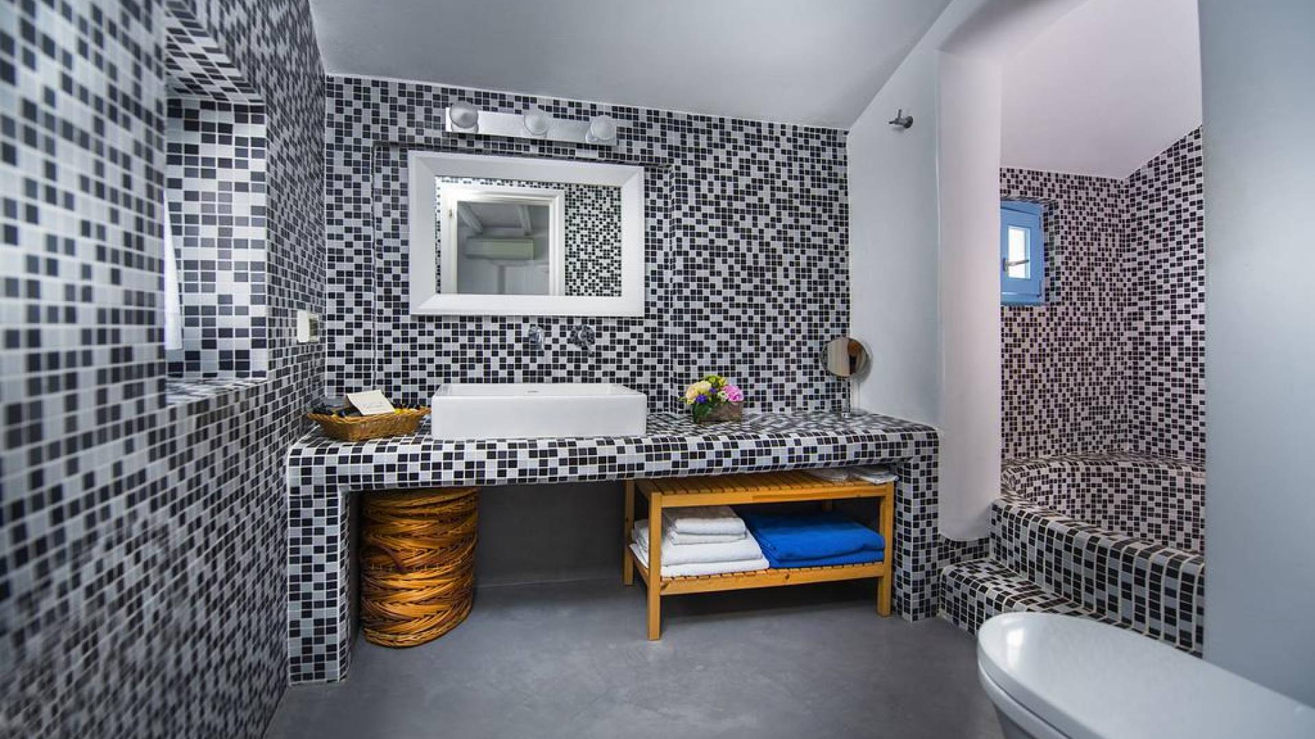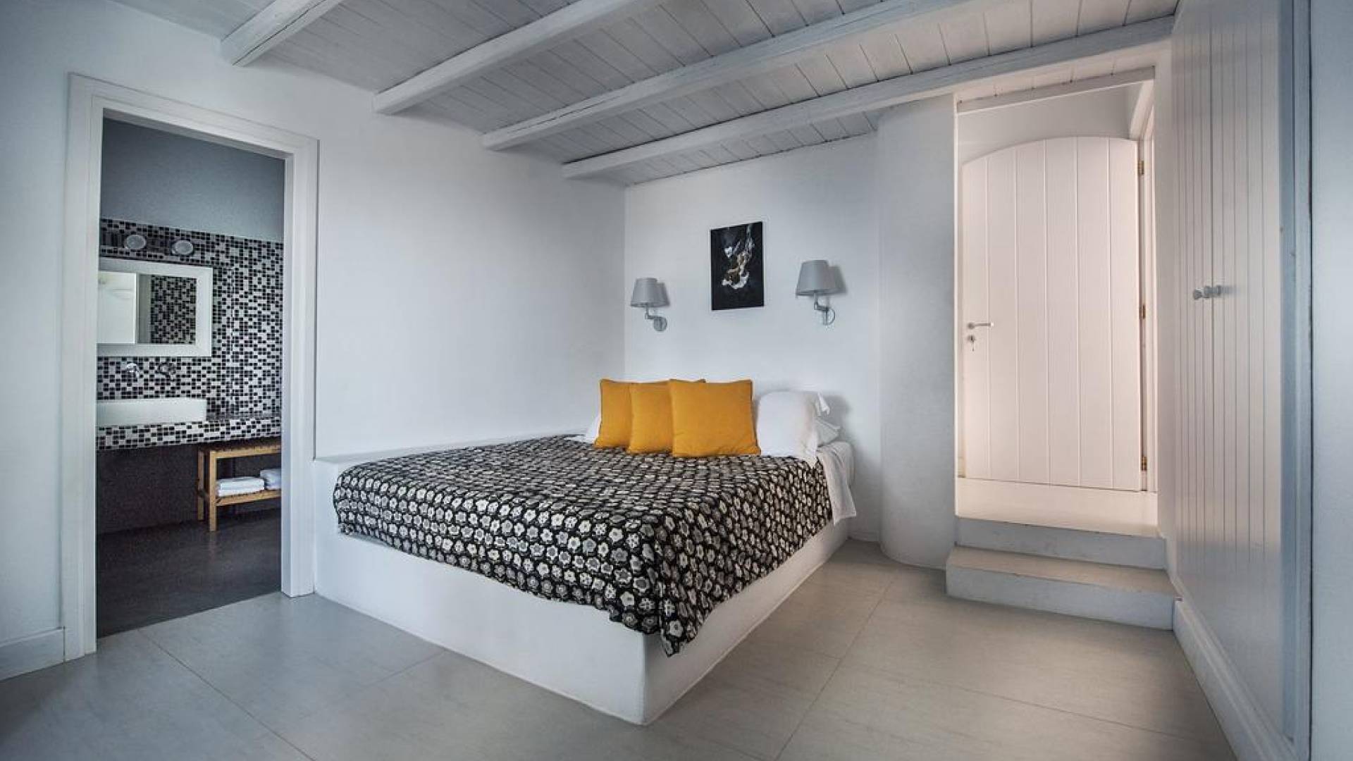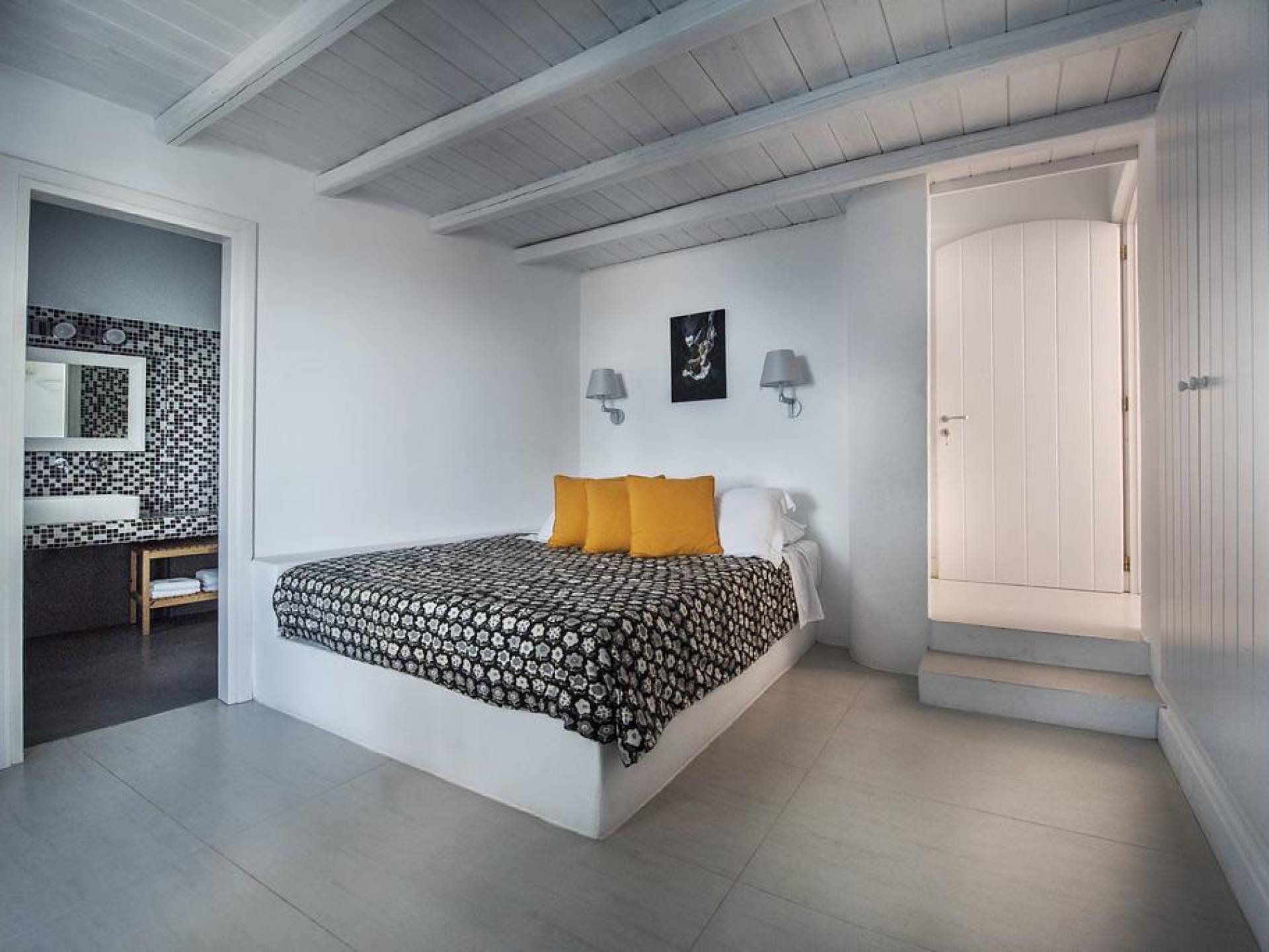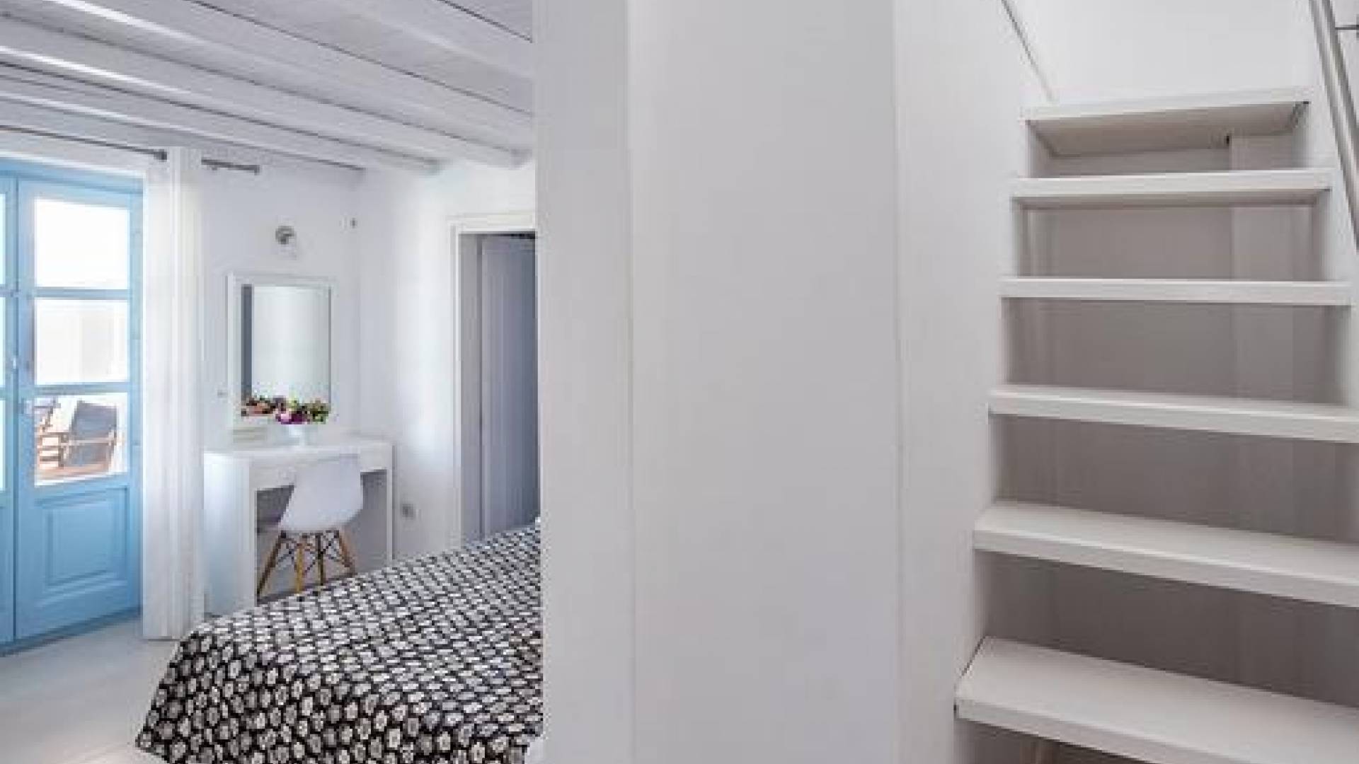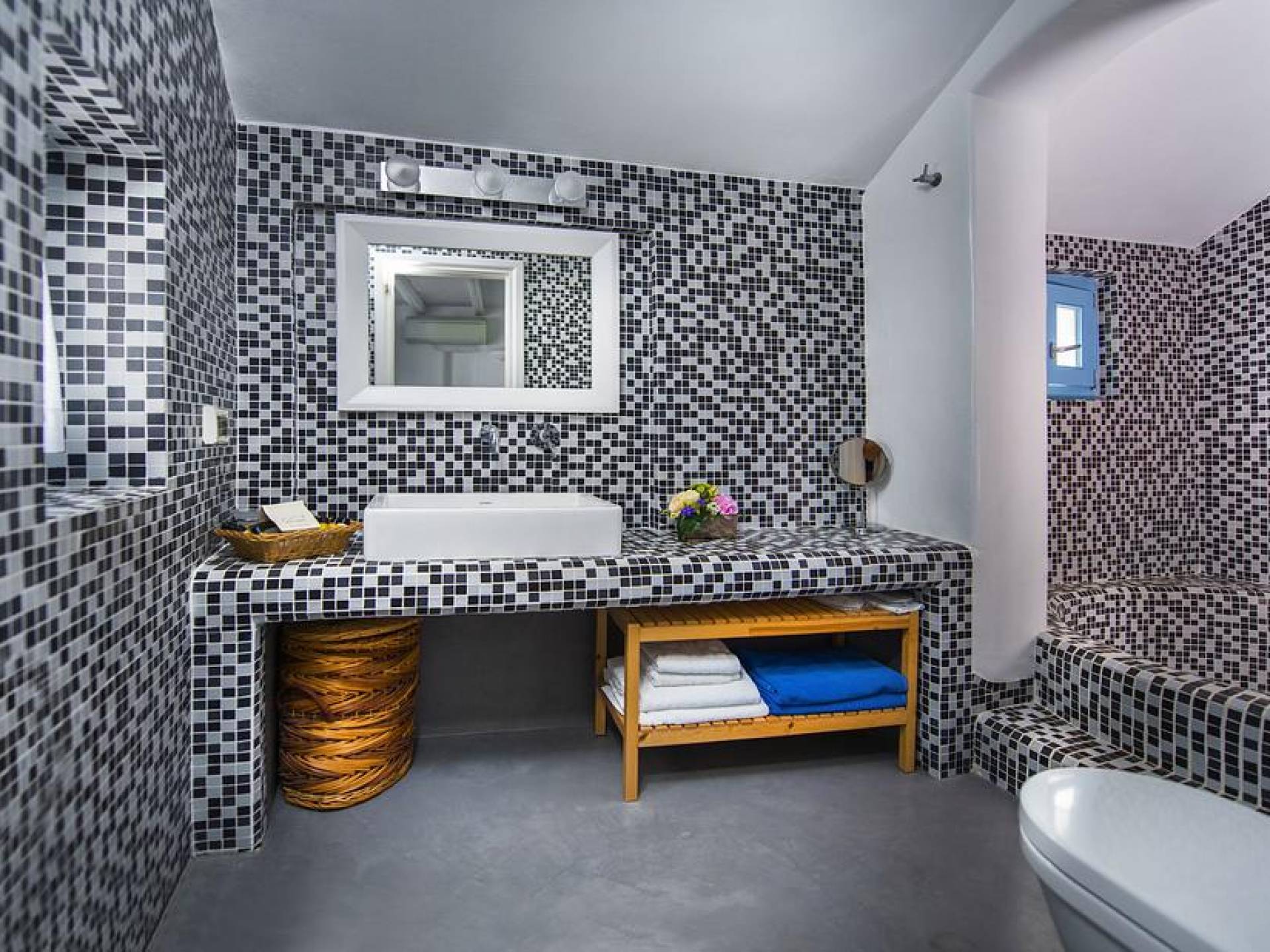 El dormitorio "A" cuenta con una cama tamaño queen y tiene acceso a una terraza privada con hermosas vistas al campo y al pueblo de Firostefani. No solo se beneficia de un vestidor, sino que el baño en suite también tiene una ducha y una bañera rectangular. El dormitorio "B" cuenta con una cama queen size y tiene hermosas vistas al mar. Incluye un armario y un baño en suite con ducha y bañera redonda, perfecto para crear un ambiente romántico, ¡completo con velas e iluminación tenue! Dormitorio tipo loft "C", ubicado encima del dormitorio "B", con una cama doble baja.