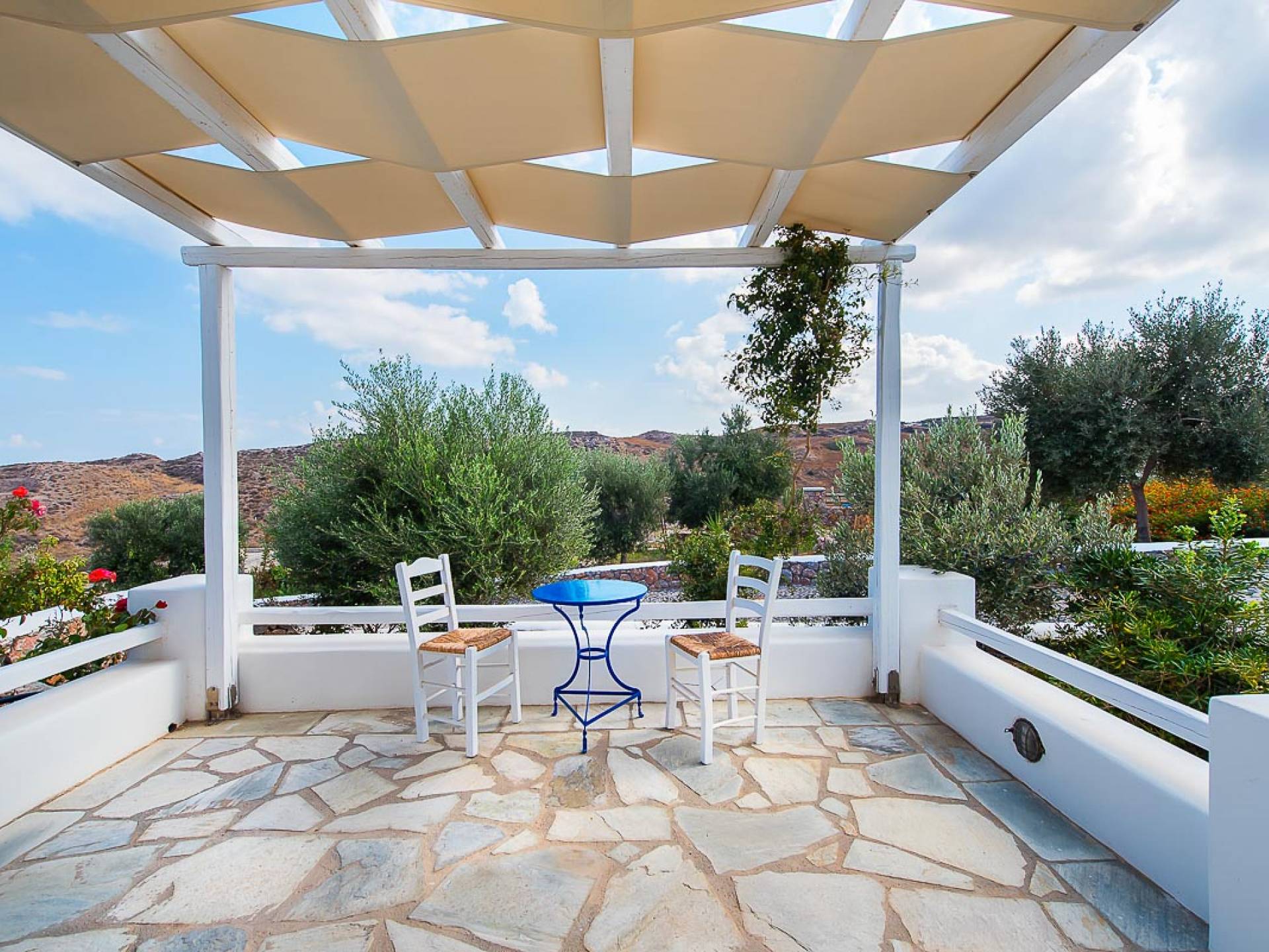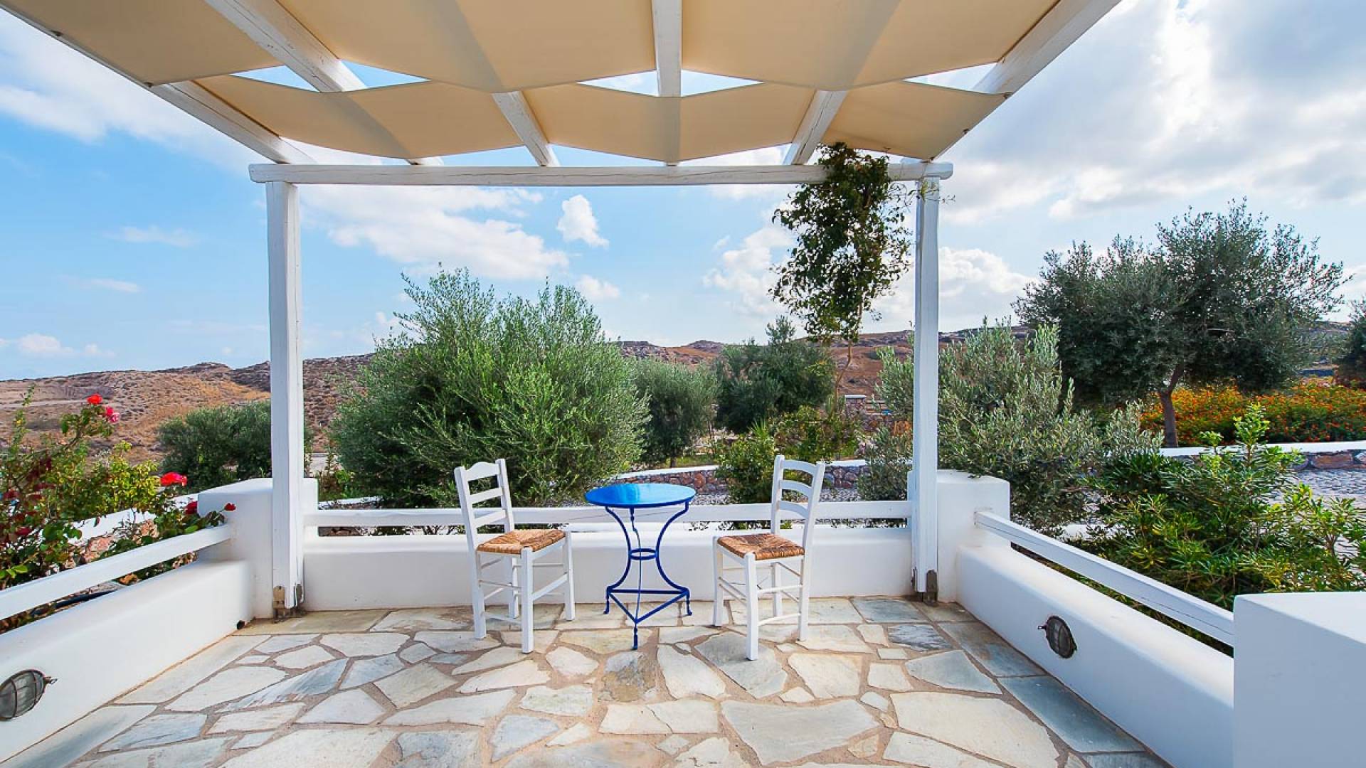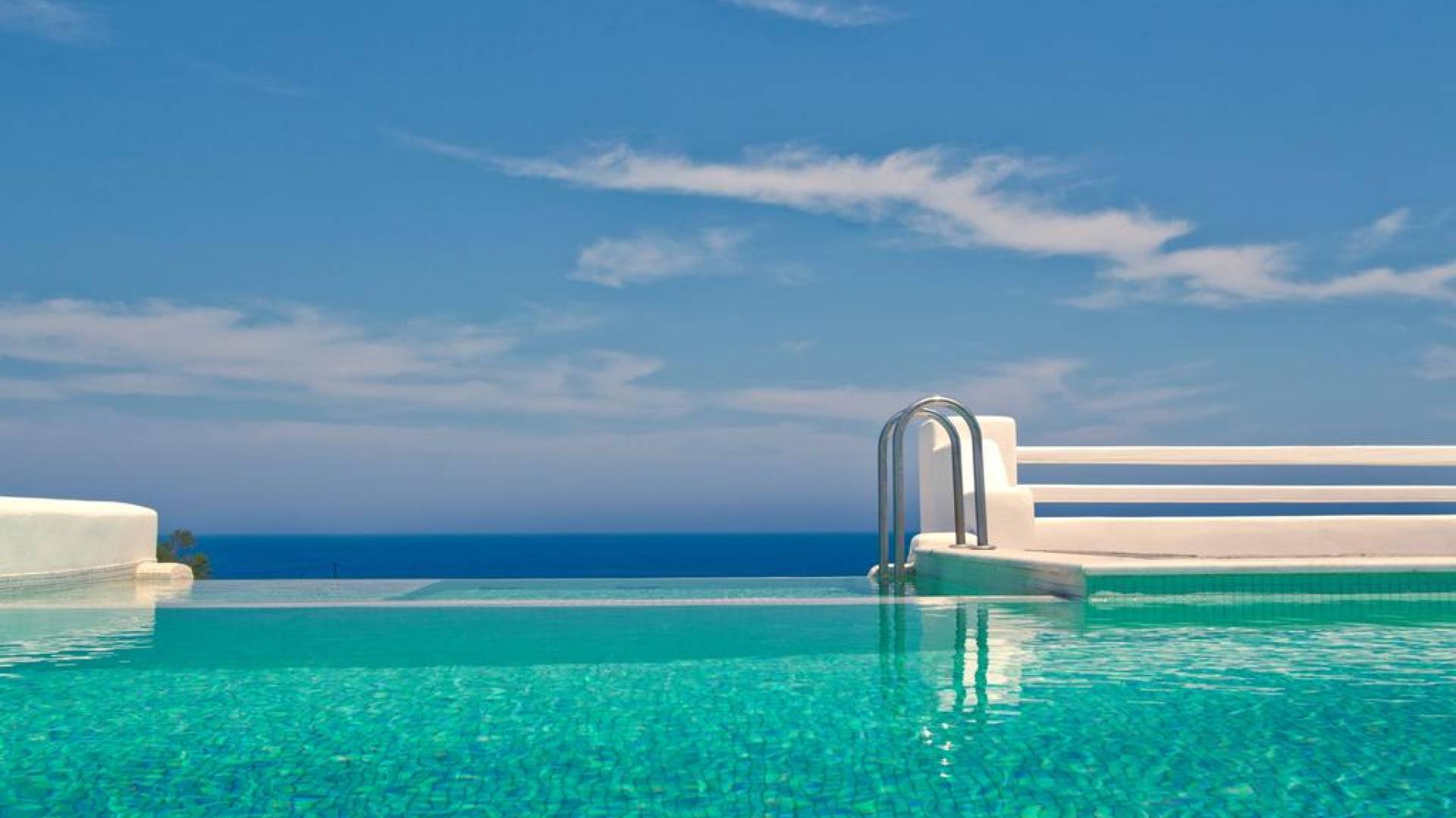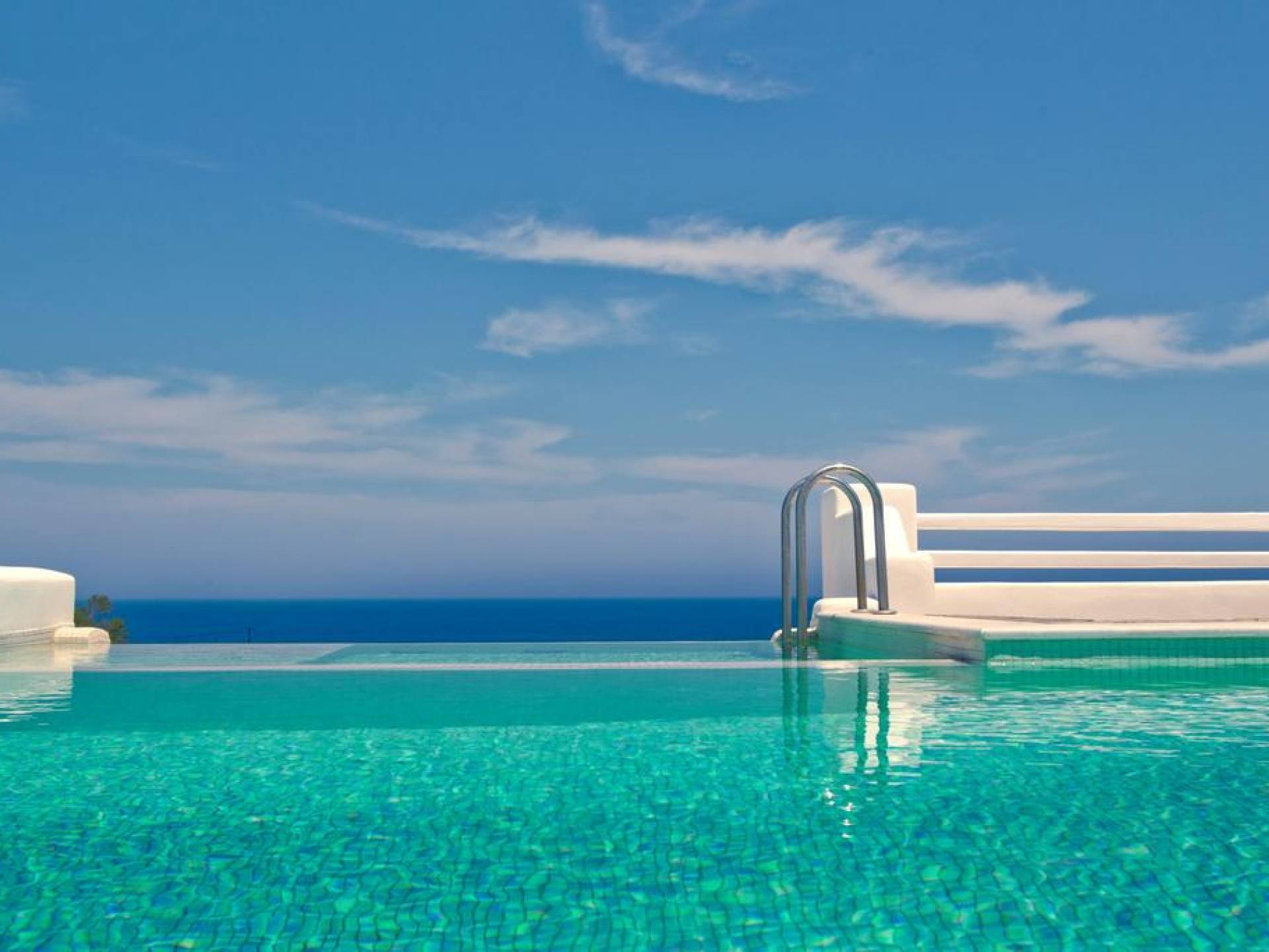 El área al aire libre de Tramountana Villa Santorini ofrece vistas despejadas al mar, piscina privada y jacuzzi, amplias terrazas, cómodas tumbonas y sombrillas, 2 comedores, 2 cómodos salones, barbacoa totalmente equipada, pérgolas sombreadas.
