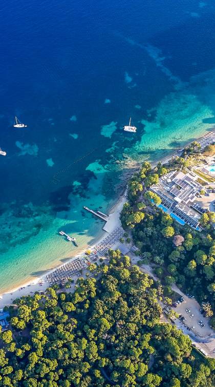 En la parte suroeste de Skiathos, el hotel ELIVI Skiathos se alza sobre una colina cubierta de pinos y un frondoso olivar. situado en la península de Pounta con vistas a las cuatro playas más hermosas de Skiathos, Koukounaries, Ambelakia, Banana y Little Banana Beach, cubre un espacio continuo de 213 acres.