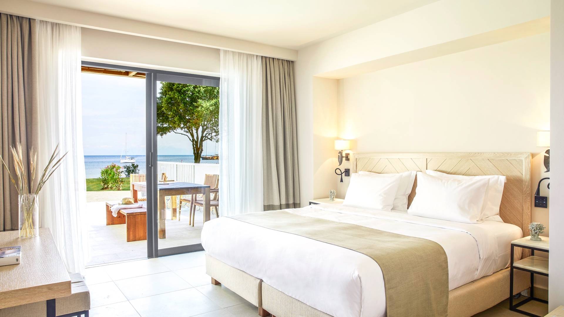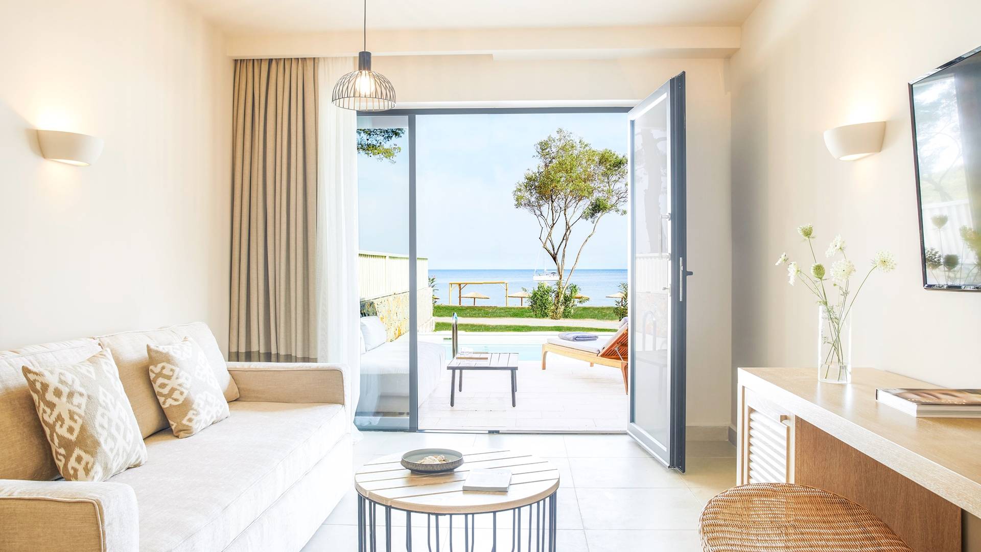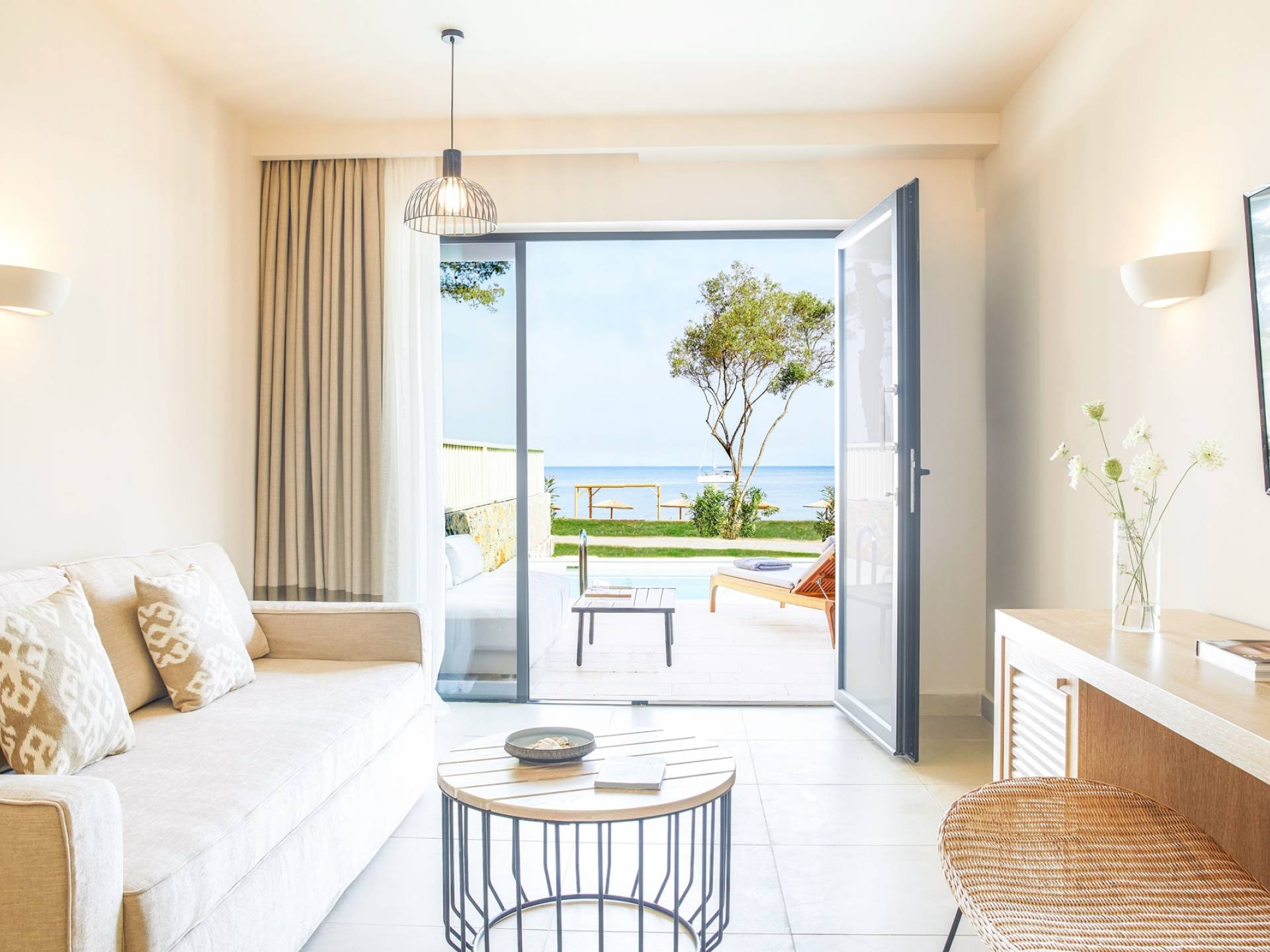 Contemplando el tranquilo mar azul de las Espóradas, esta suite de 43 m2 con un dormitorio, sala de estar interior y exterior, comedor al aire libre frente a la piscina y el jardín, se transforma en un refugio de verano absoluto donde puedes pasar todo el día. junto al agua, en un entorno organizado de servicios y comodidades.