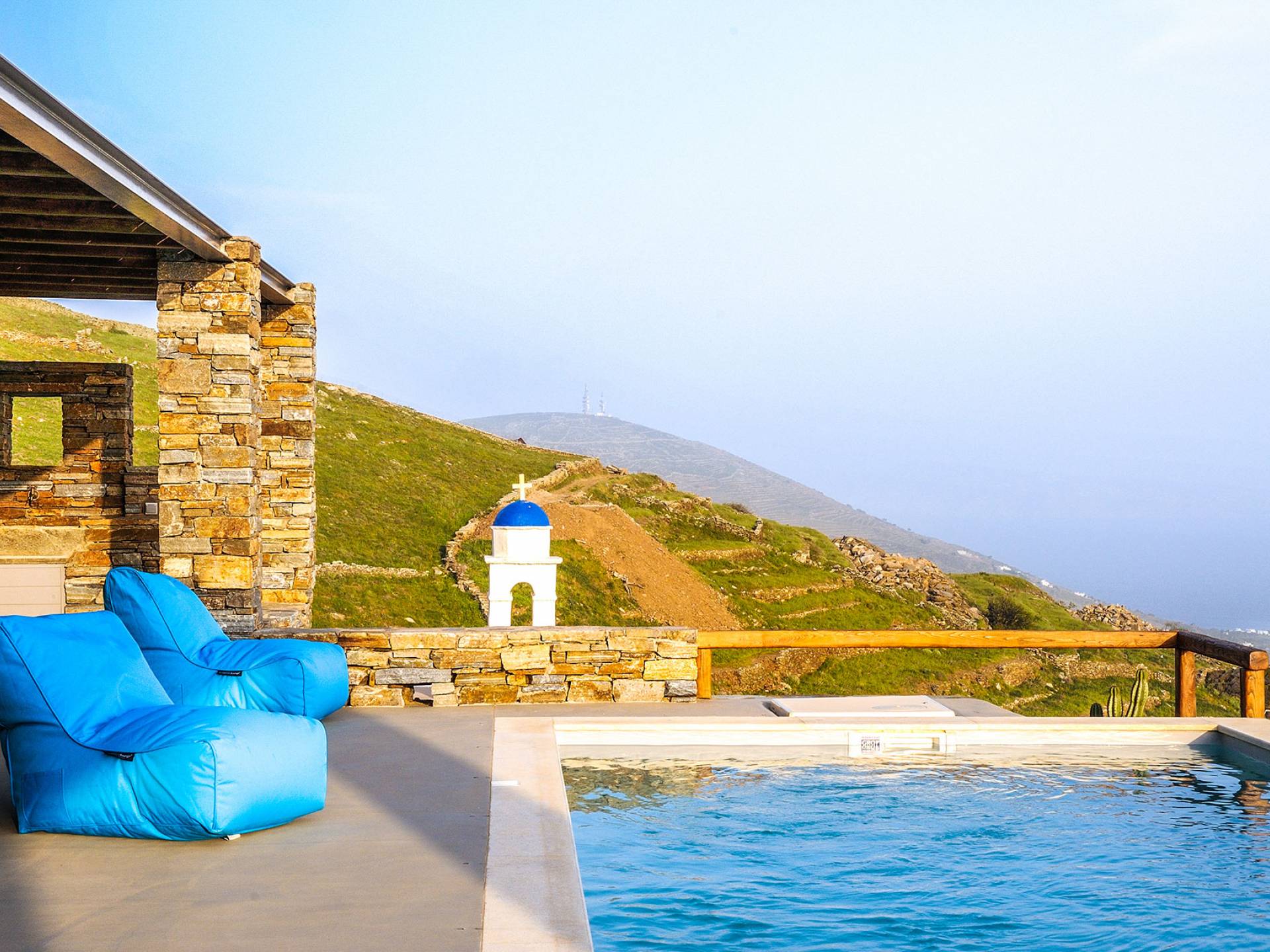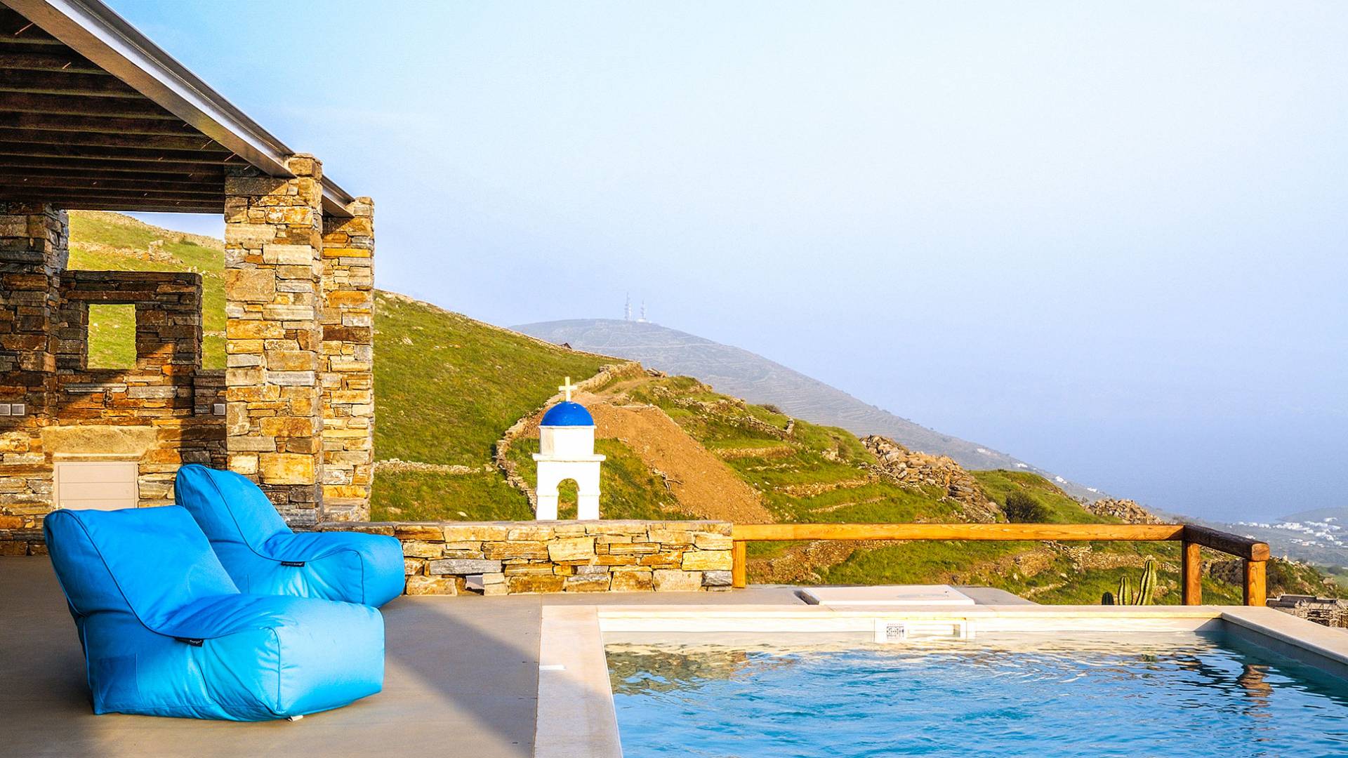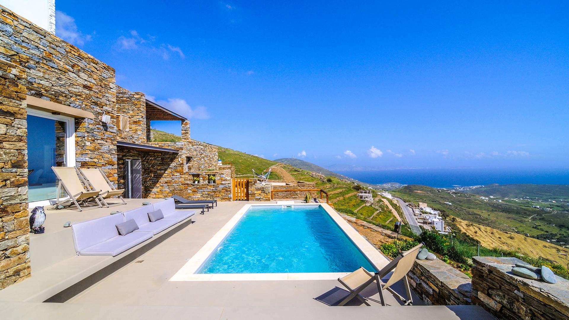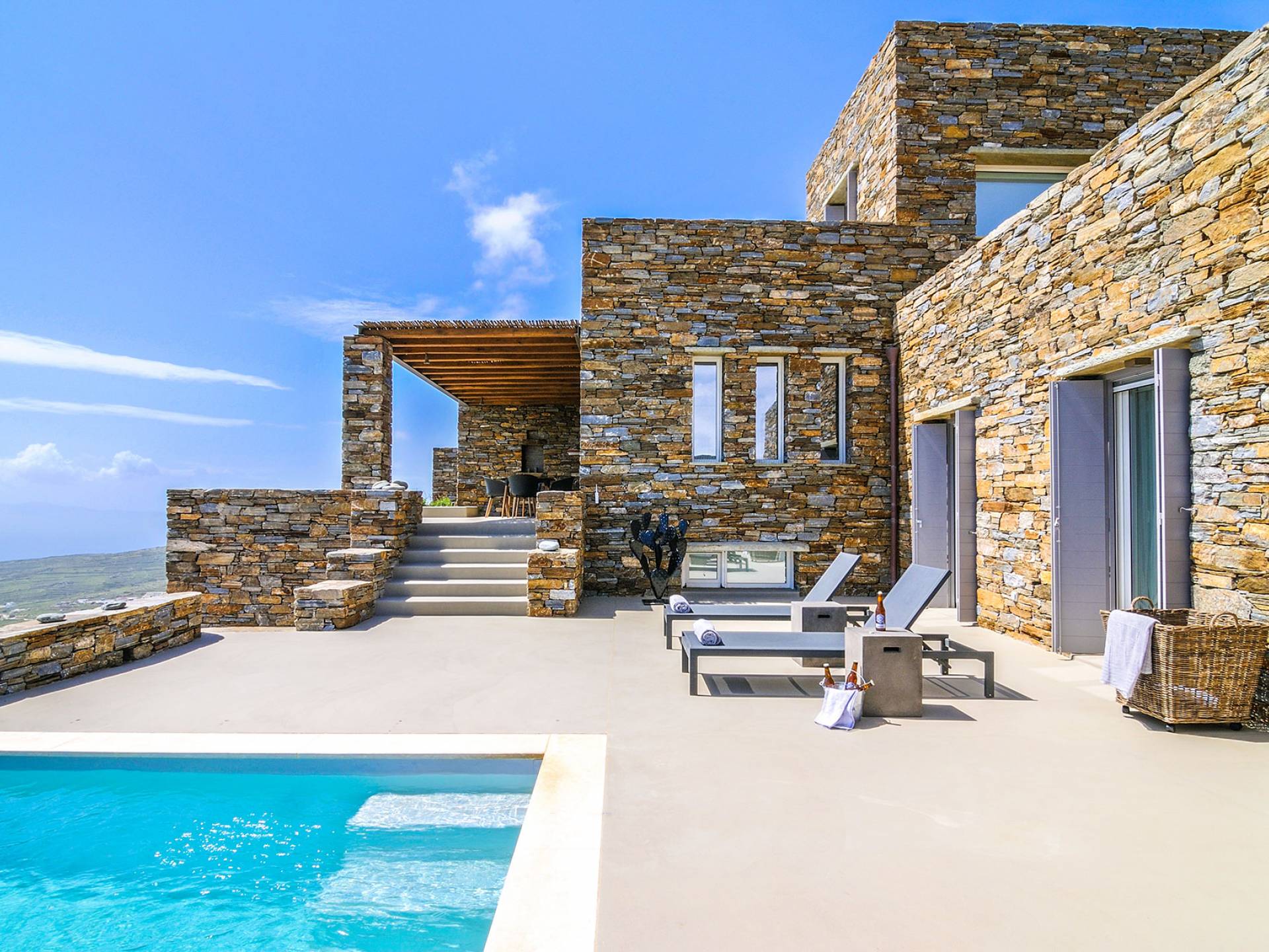 Amolia Luxury Houses Tinos son 2 alquileres de villas de lujo con 8 dormitorios y 2 piscinas privadas. Los edificios están en total armonía con el carácter único de Tinos, una isla amada por los artistas gracias a su belleza virgen, salvaje y rica tradición. Completamente construida en piedra (con piedra local por artesanos tradicionales) en un estilo minimalista contemporáneo, cada villa está diseñada con respeto al entorno natural arquetípico de las Cícladas, con colinas desnudas y vistas ilimitadas a la grandeza del Mar Egeo y 11 islas.