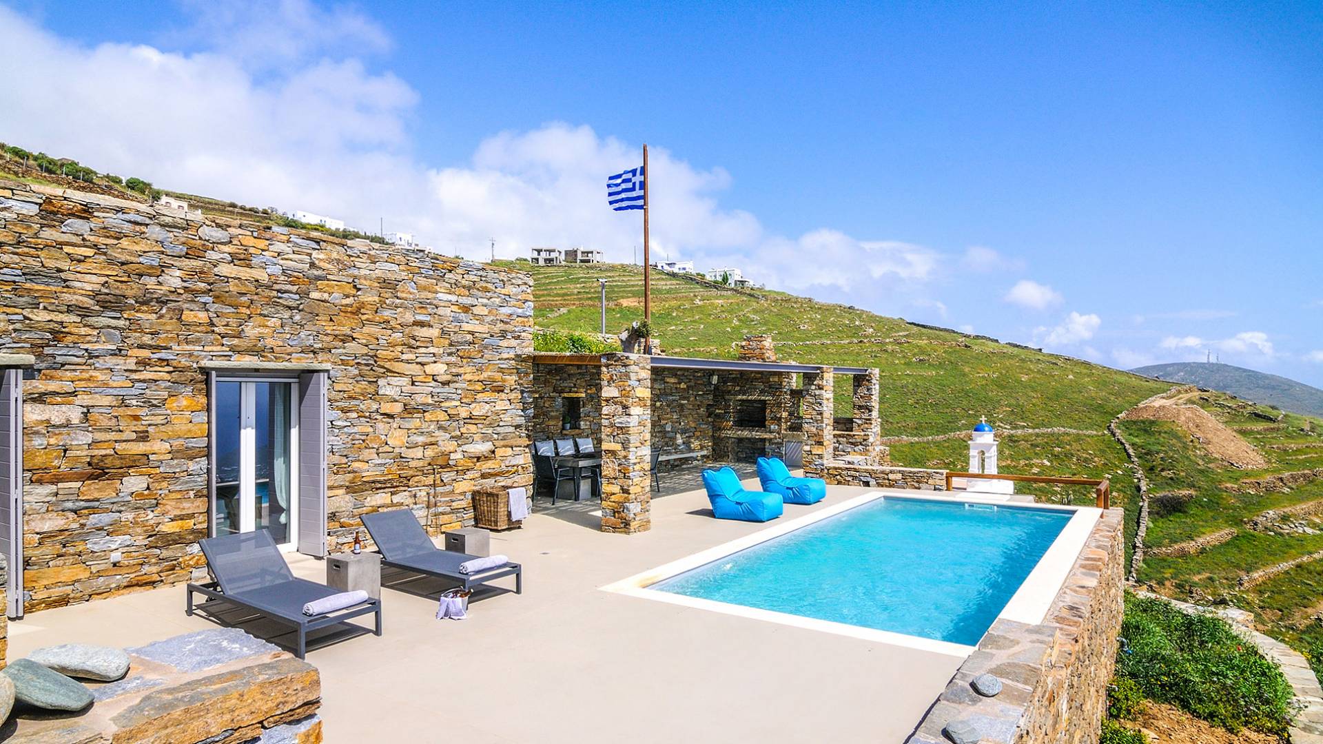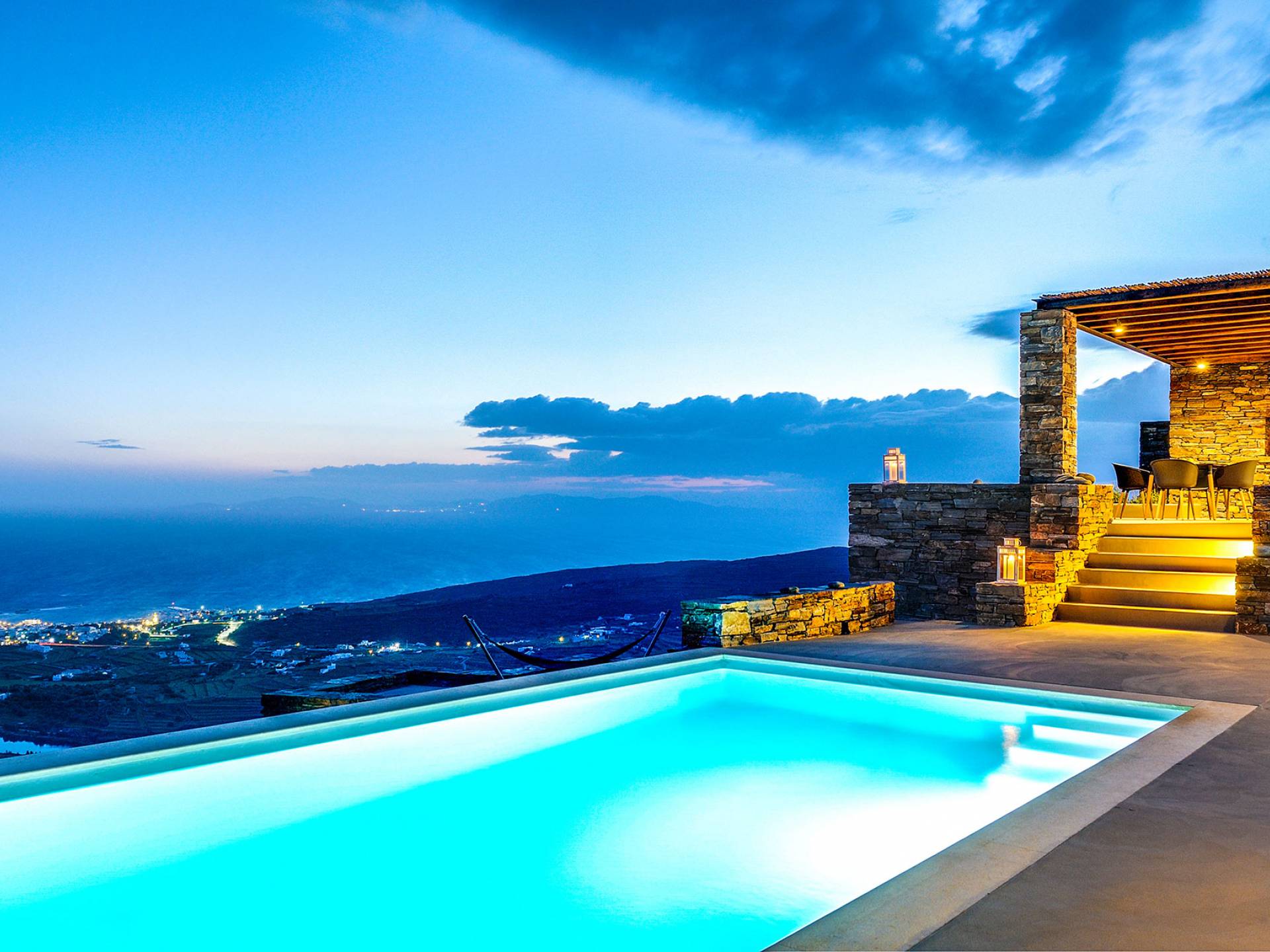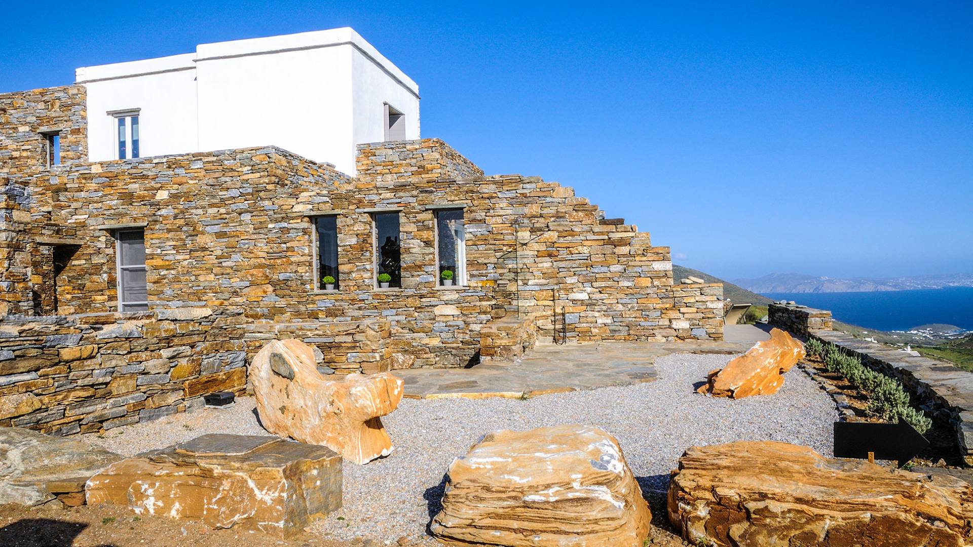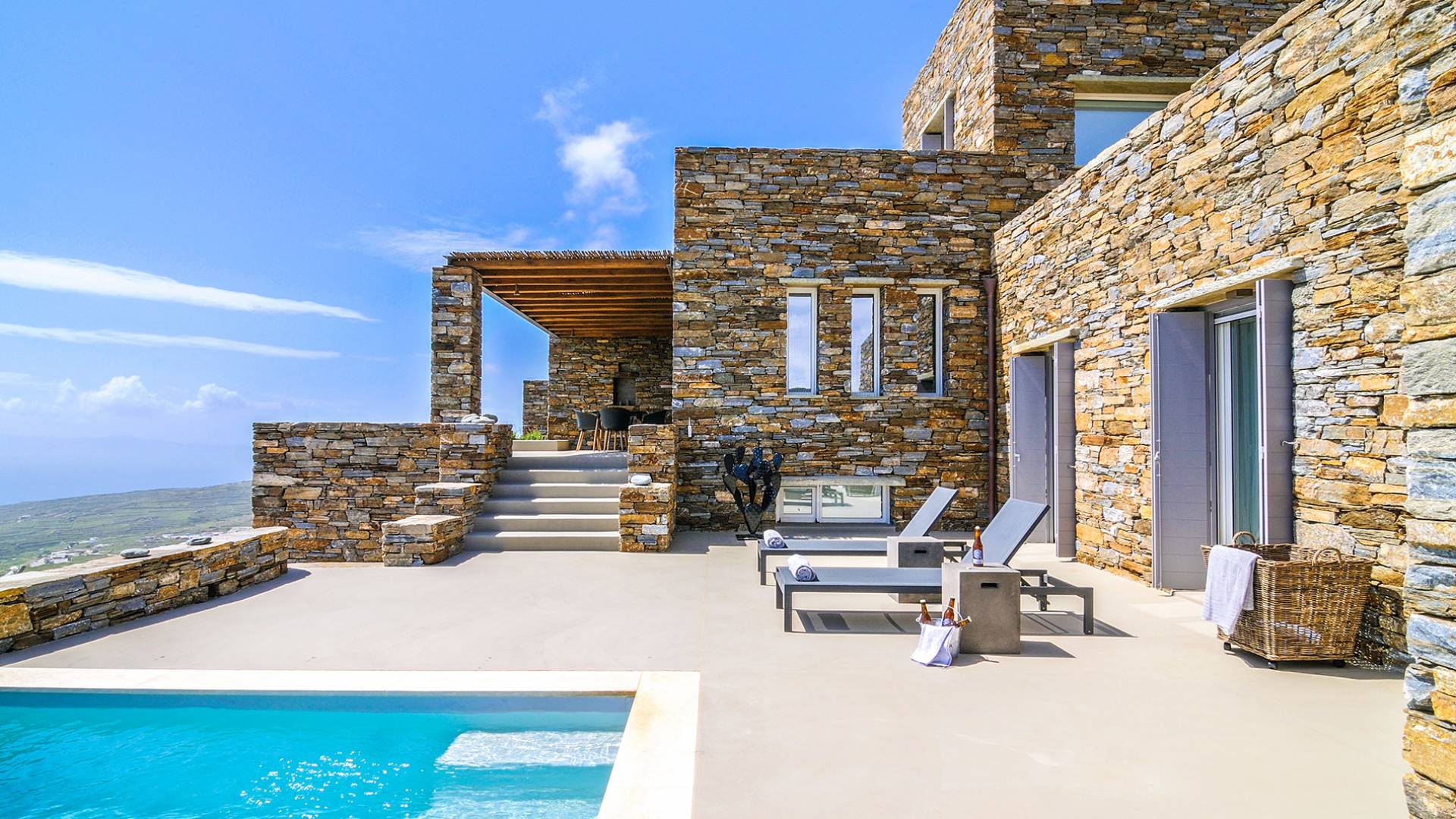 Amolia Luxury Houses Tinos son 2 alquileres de villas de lujo con 8 dormitorios y 2 piscinas privadas. Los edificios están en total armonía con el carácter único de Tinos, una isla amada por los artistas gracias a su belleza virgen, salvaje y rica tradición. Completamente construida en piedra (con piedra local por artesanos tradicionales) en un estilo minimalista contemporáneo, cada villa está diseñada con respeto al entorno natural arquetípico de las Cícladas, con colinas desnudas y vistas ilimitadas a la grandeza del Mar Egeo y 11 islas.