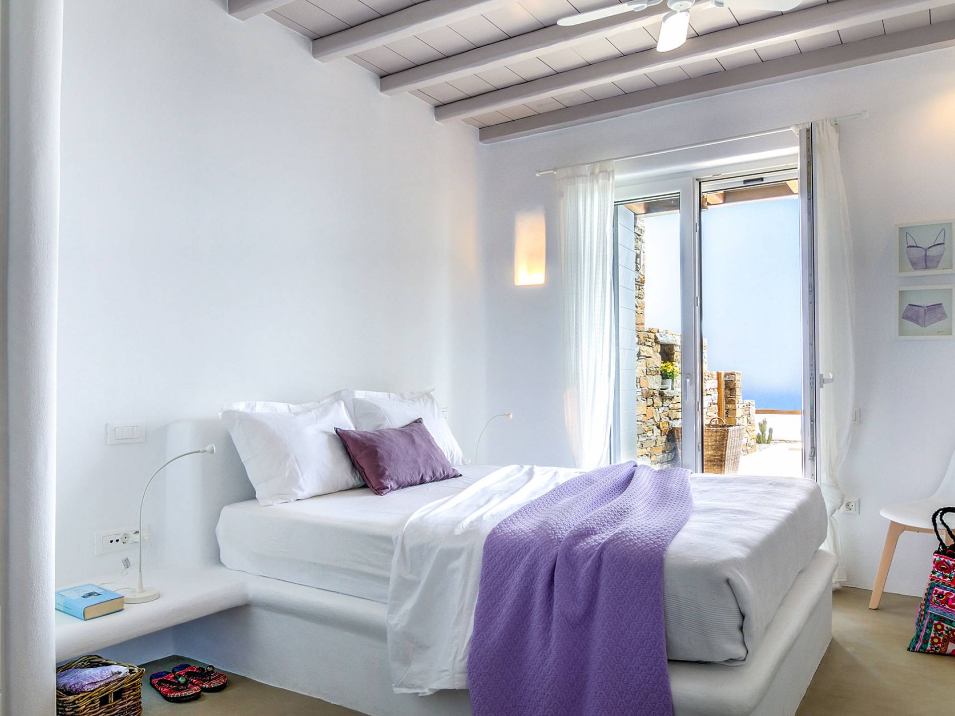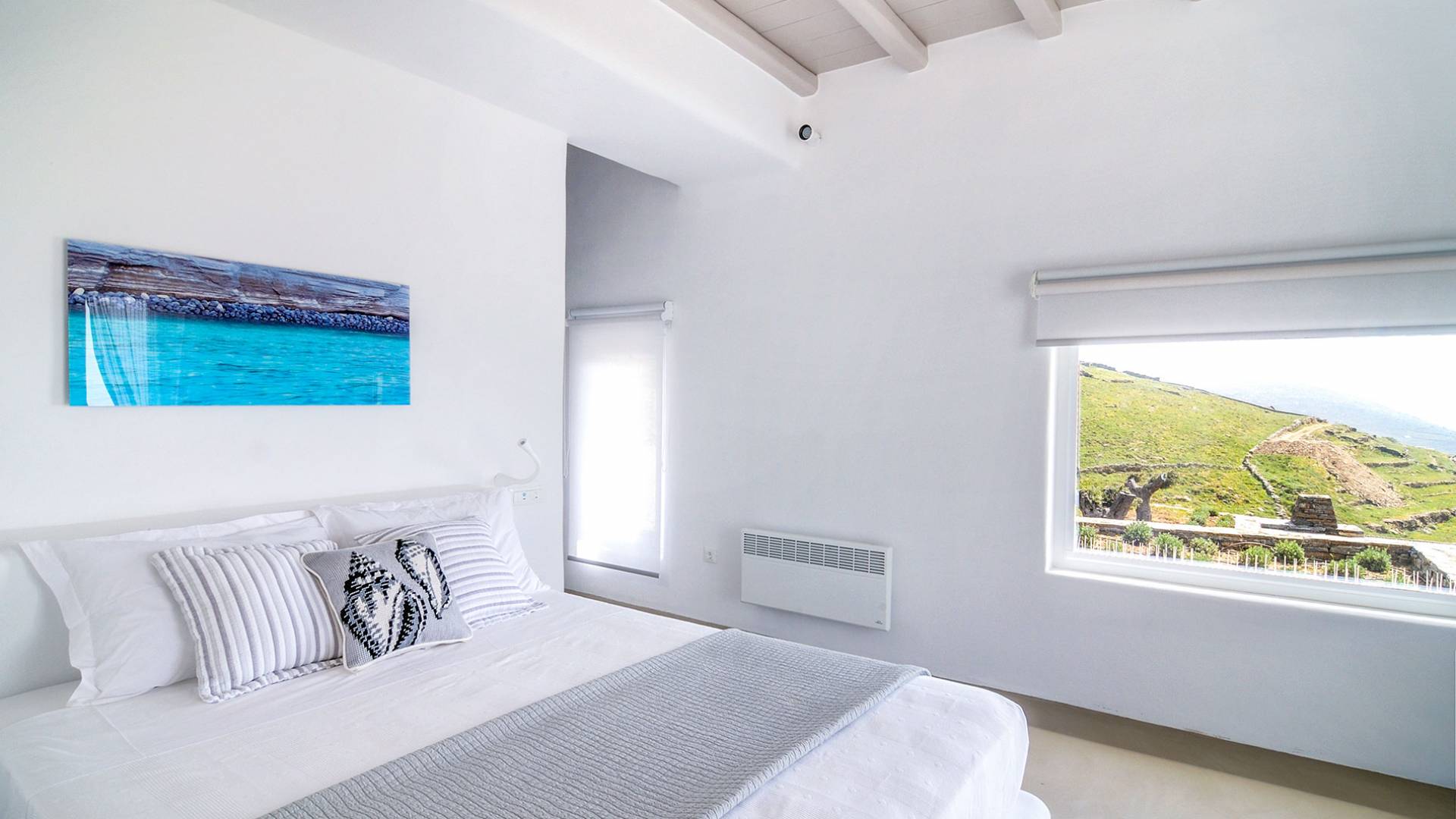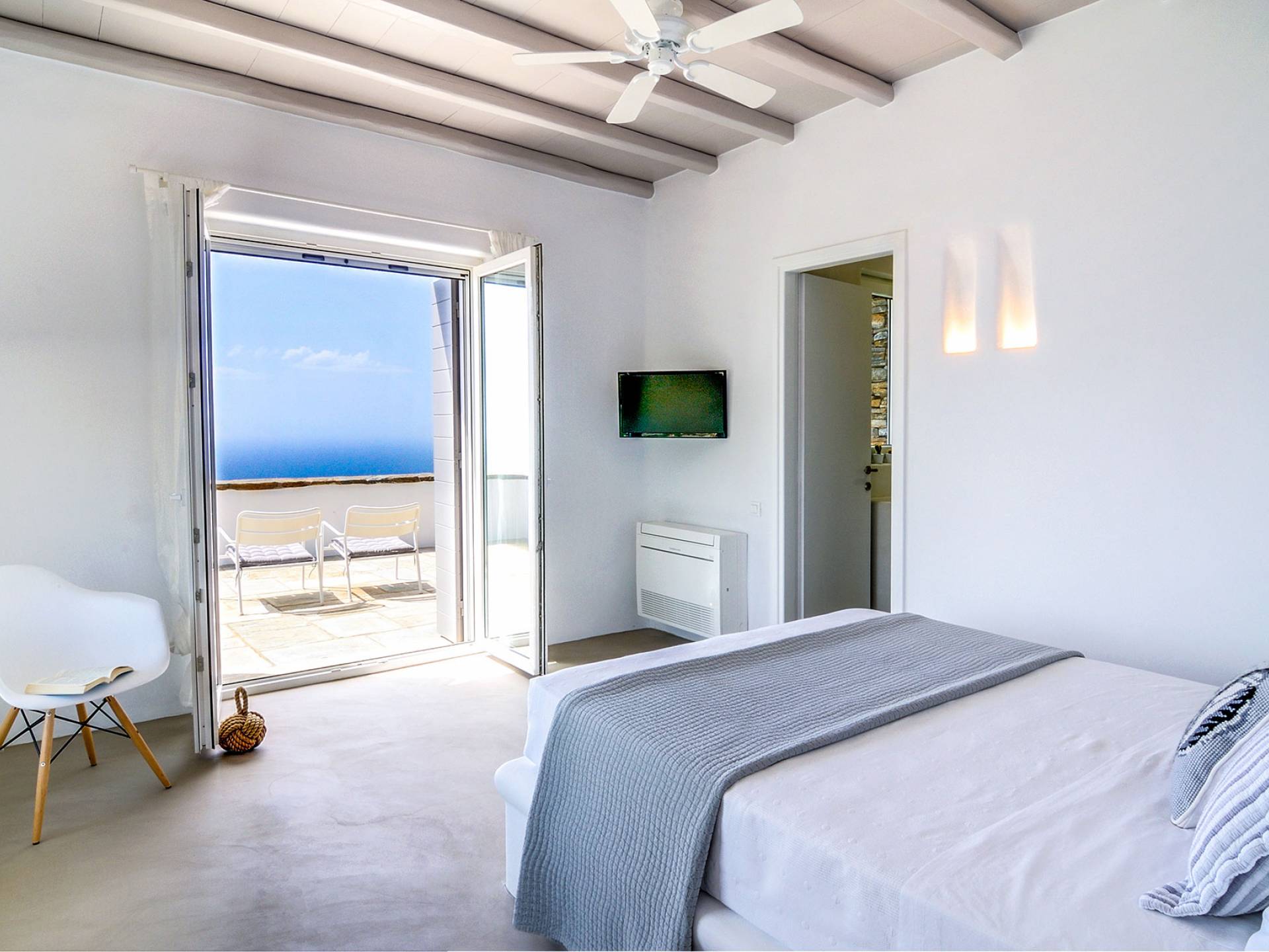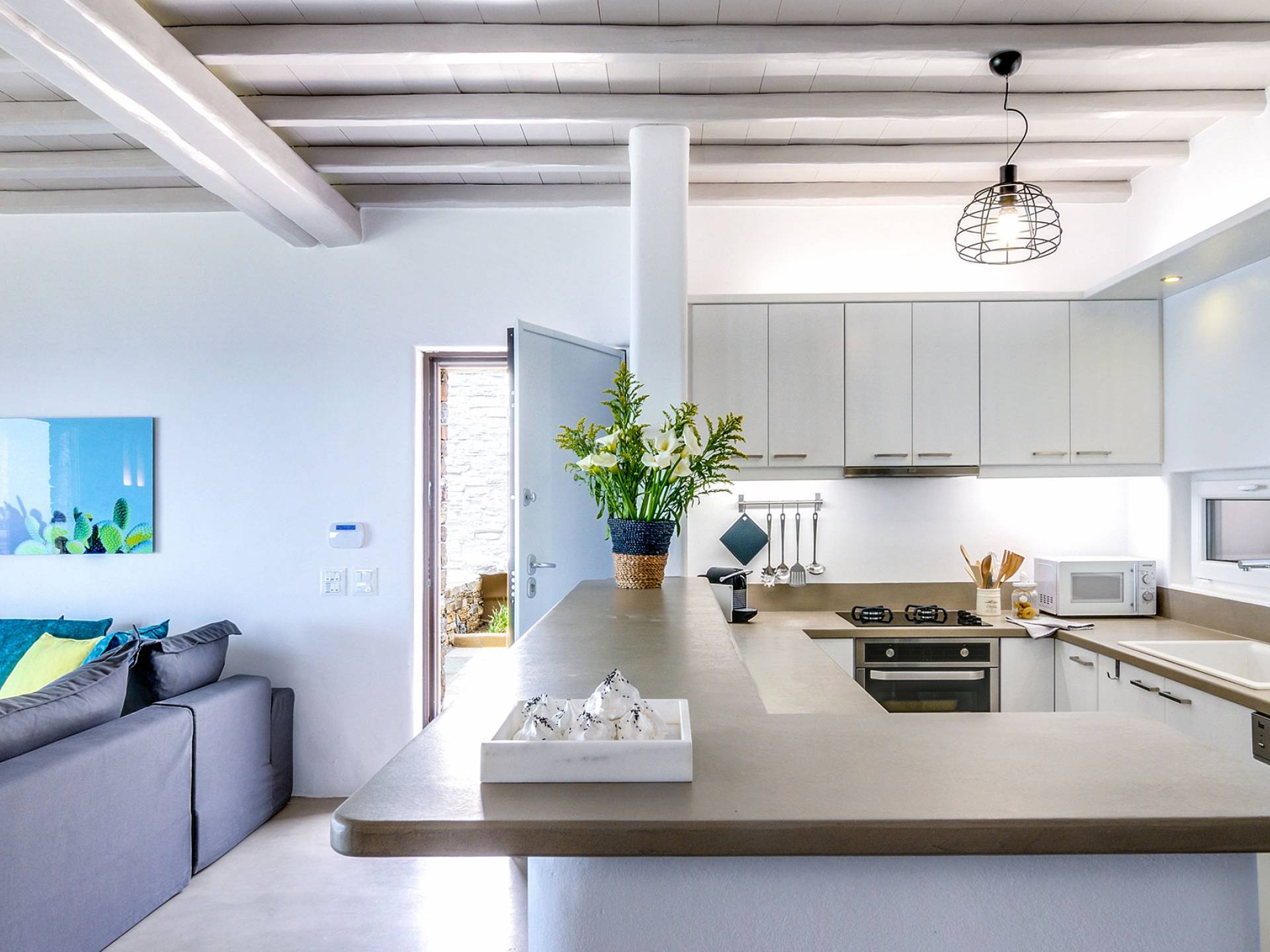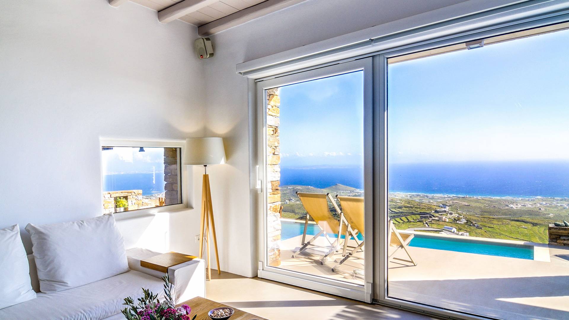 El estilo minimalista del mobiliario interior y la decoración en tonos blancos y grises rinde homenaje a la sencillez tradicional de las Cícladas con un toque contemporáneo y resalta aún más las impresionantes vistas. Las paredes son blancas con pisos de cemento pulido creando un ambiente especial. Cada villa tiene 4 dormitorios en tres niveles, mientras que hay una casa de huéspedes autónoma (en un establo tradicional llamado Keli, que significa celda) que se puede utilizar como quinto dormitorio.