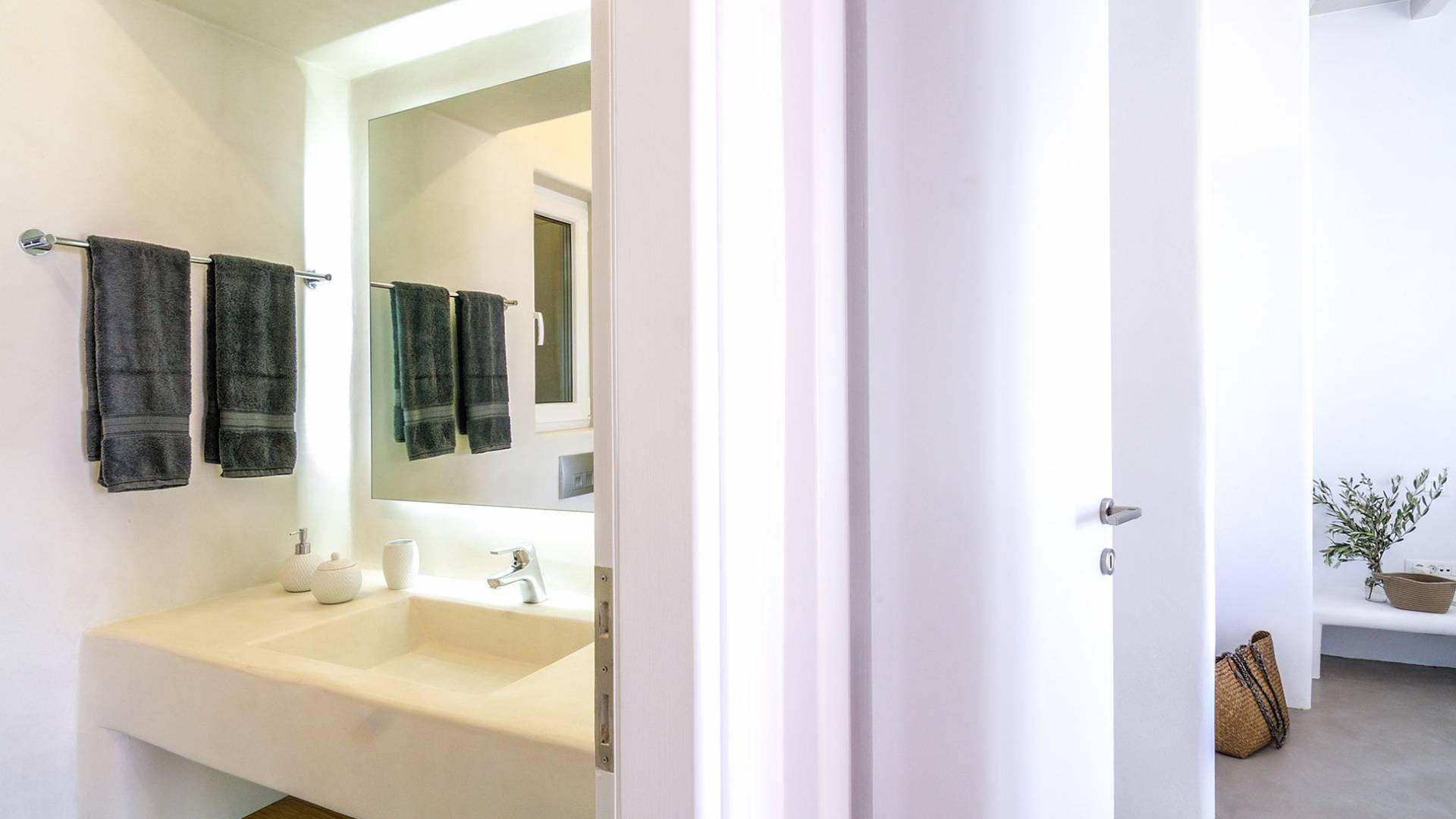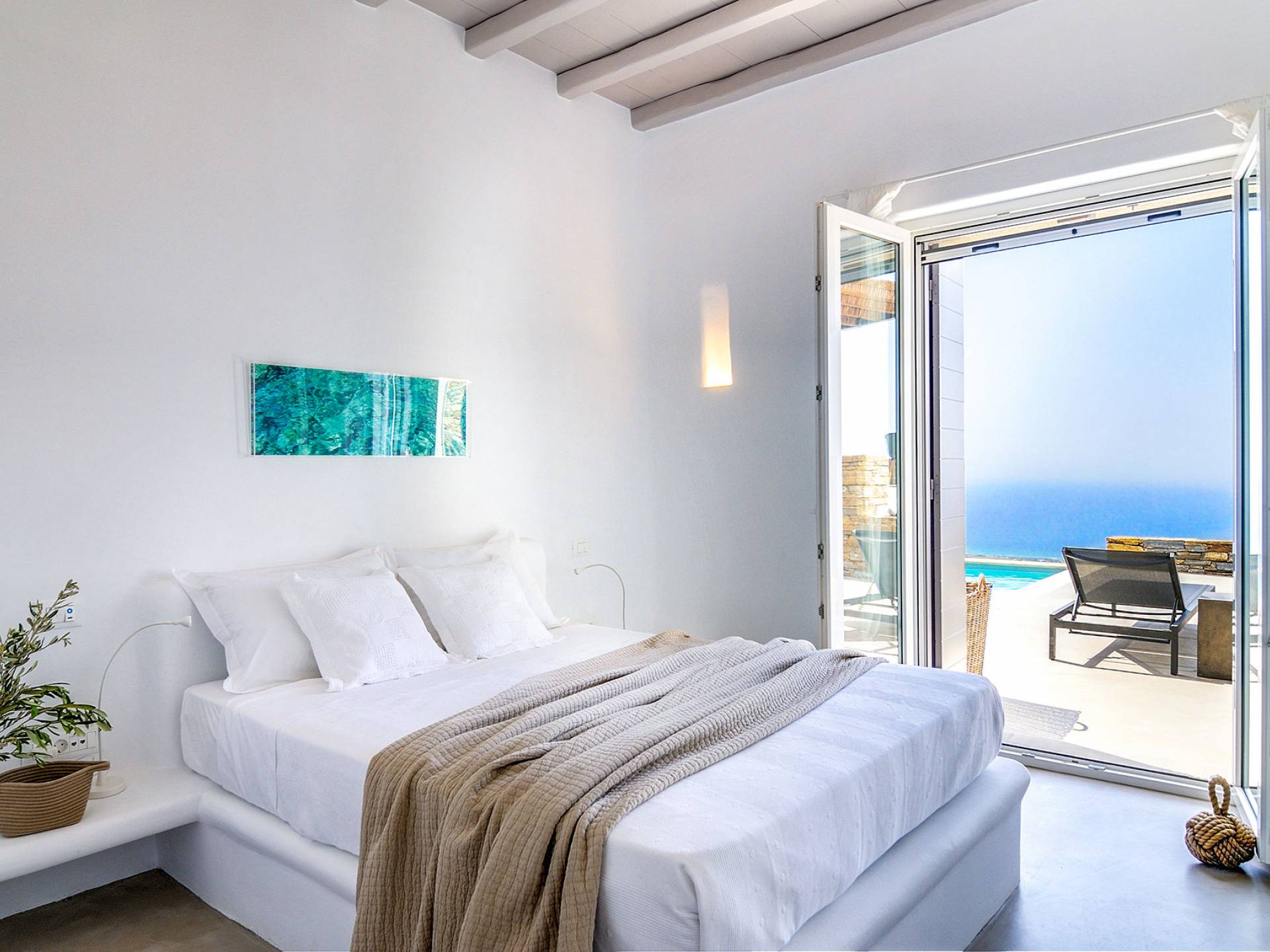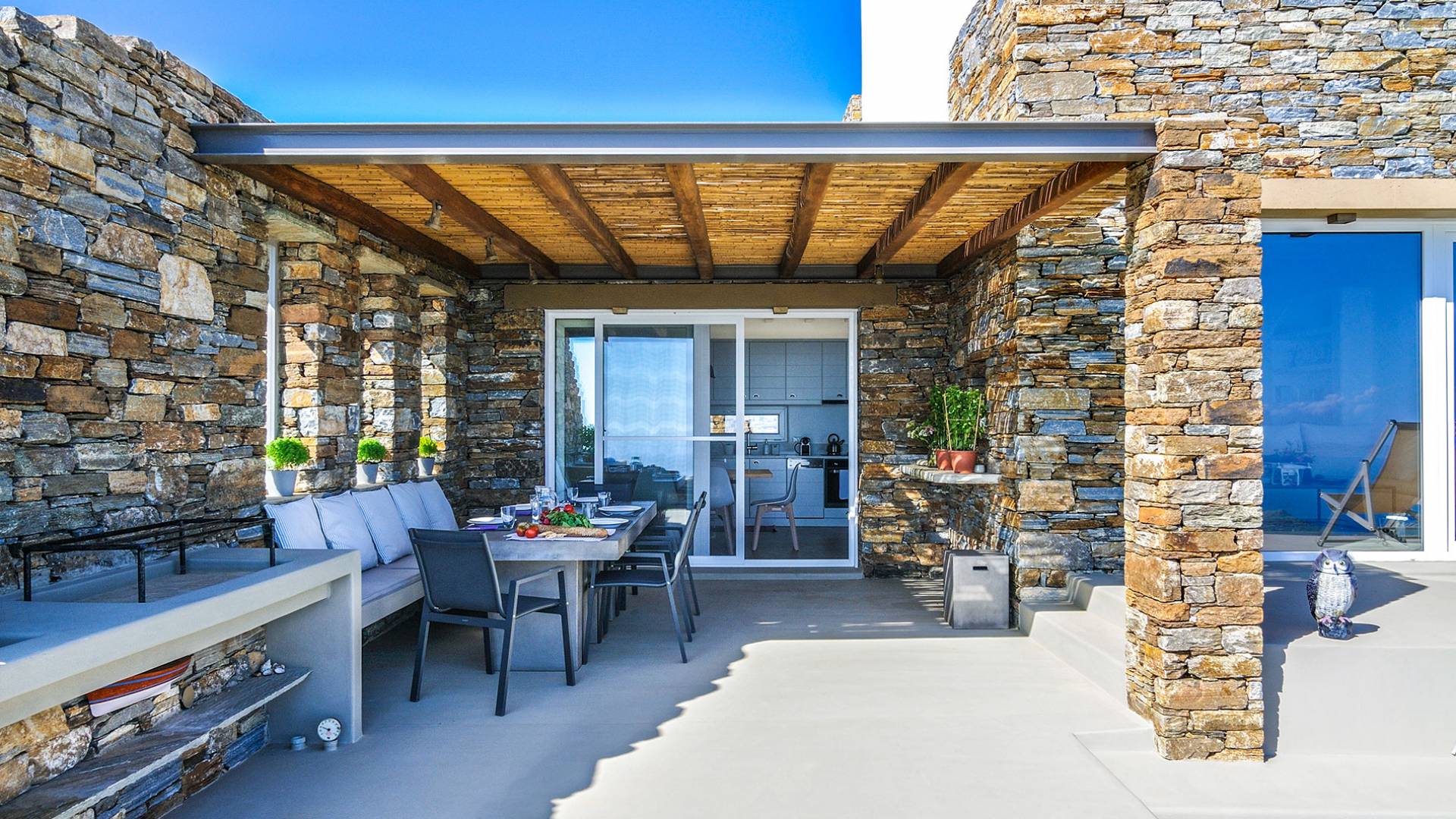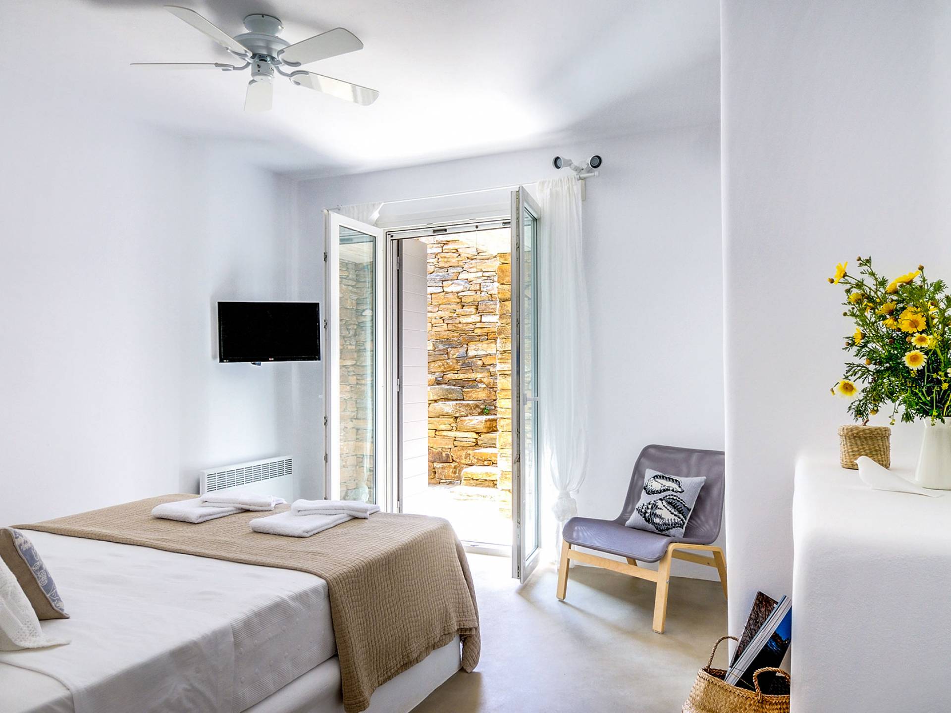 El estilo minimalista del mobiliario interior y la decoración en tonos blancos y grises rinde homenaje a la sencillez tradicional de las Cícladas con un toque contemporáneo y resalta aún más las impresionantes vistas. Las paredes son blancas con pisos de cemento pulido creando un ambiente especial. Cada villa tiene 4 dormitorios en tres niveles, mientras que hay una casa de huéspedes autónoma (en un establo tradicional llamado Keli, que significa celda) que se puede utilizar como quinto dormitorio.