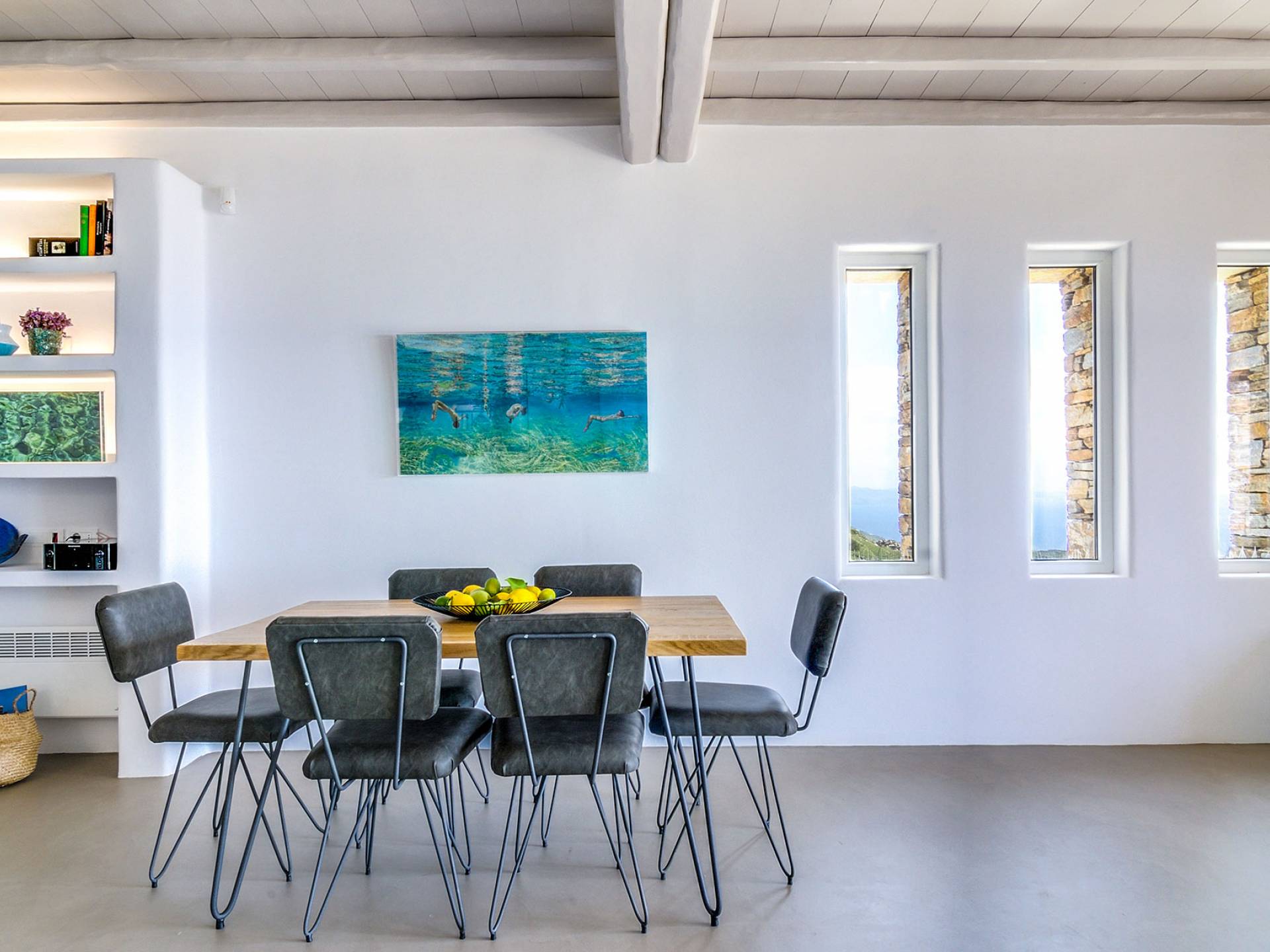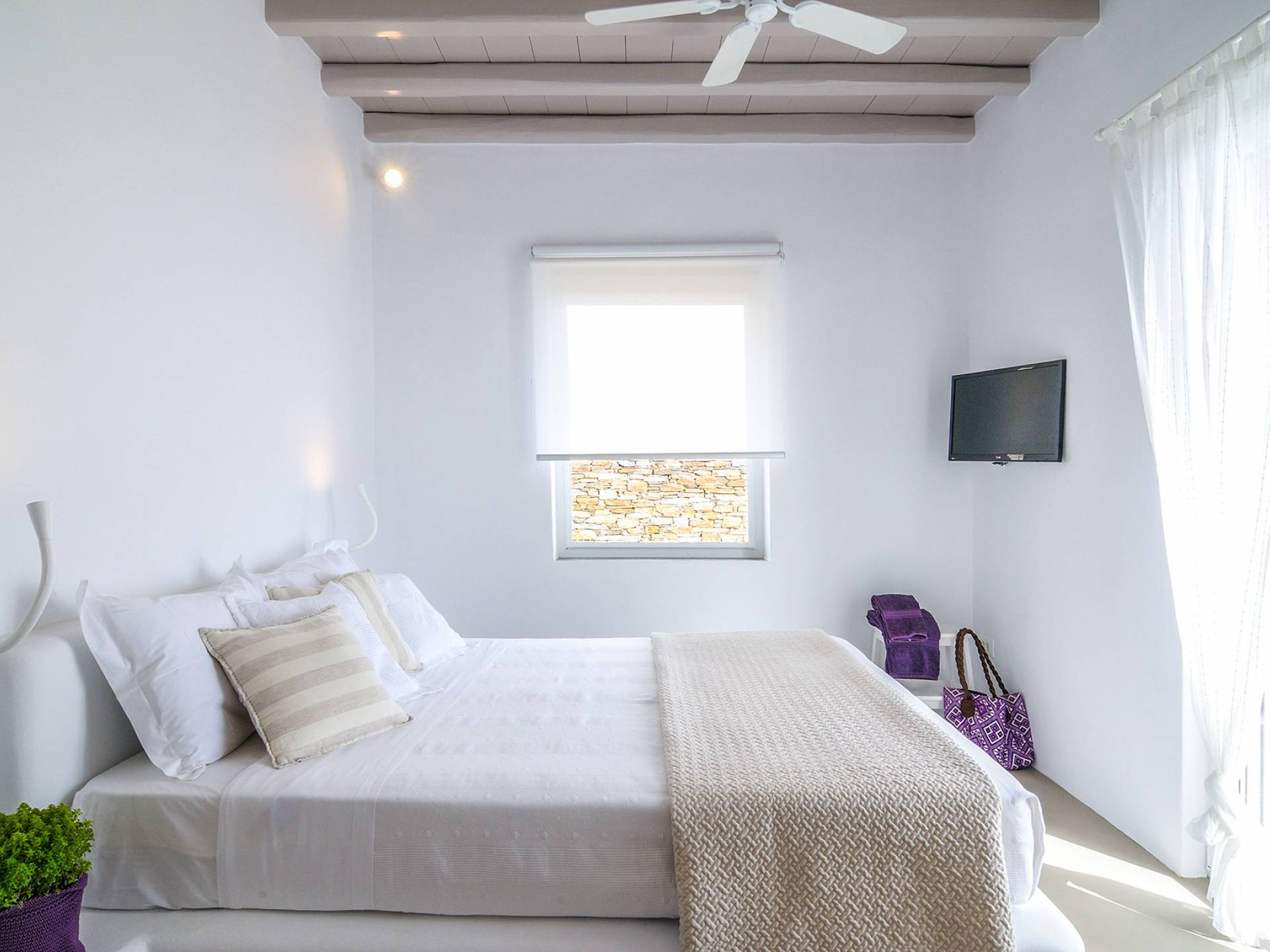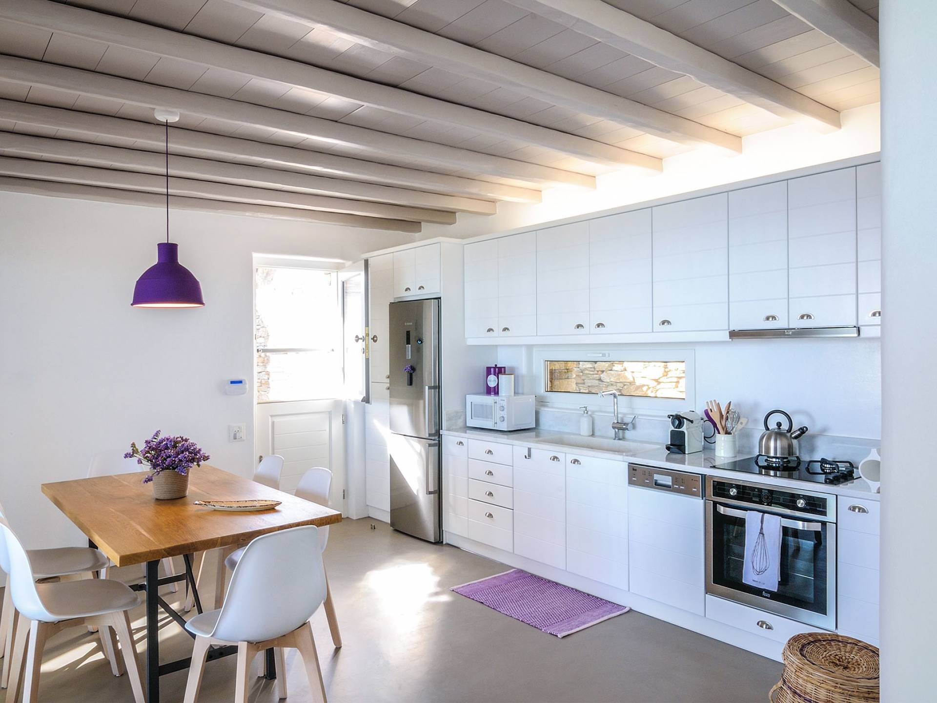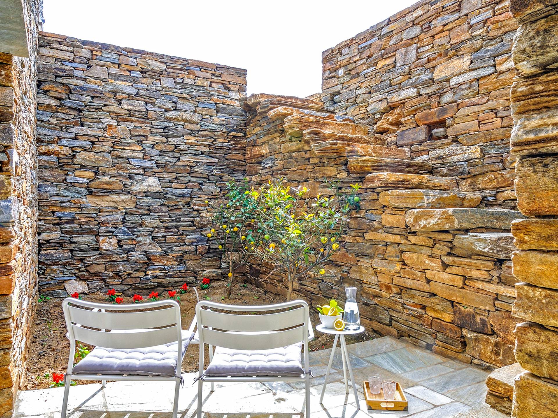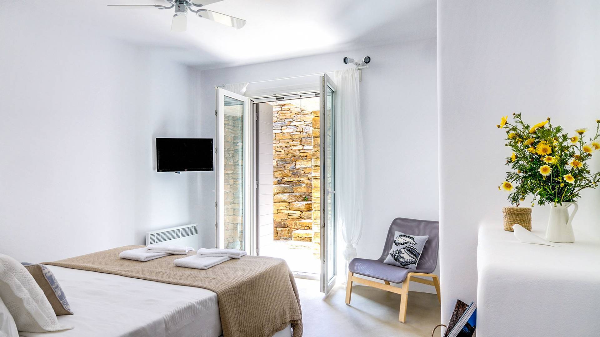 El estilo minimalista del mobiliario interior y la decoración en tonos blancos y grises rinde homenaje a la sencillez tradicional de las Cícladas con un toque contemporáneo y resalta aún más las impresionantes vistas. Las paredes son blancas con pisos de cemento pulido creando un ambiente especial. Cada villa tiene 4 dormitorios en tres niveles, mientras que hay una casa de huéspedes autónoma (en un establo tradicional llamado Keli, que significa celda) que se puede utilizar como quinto dormitorio.