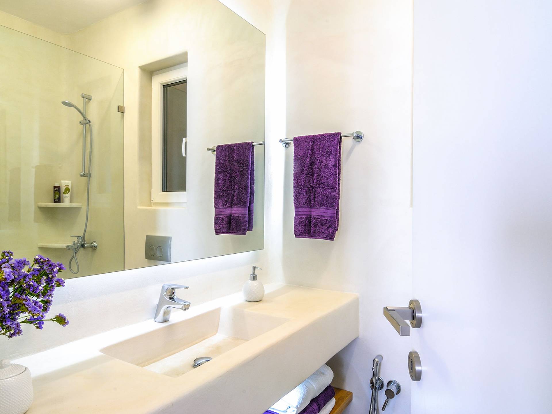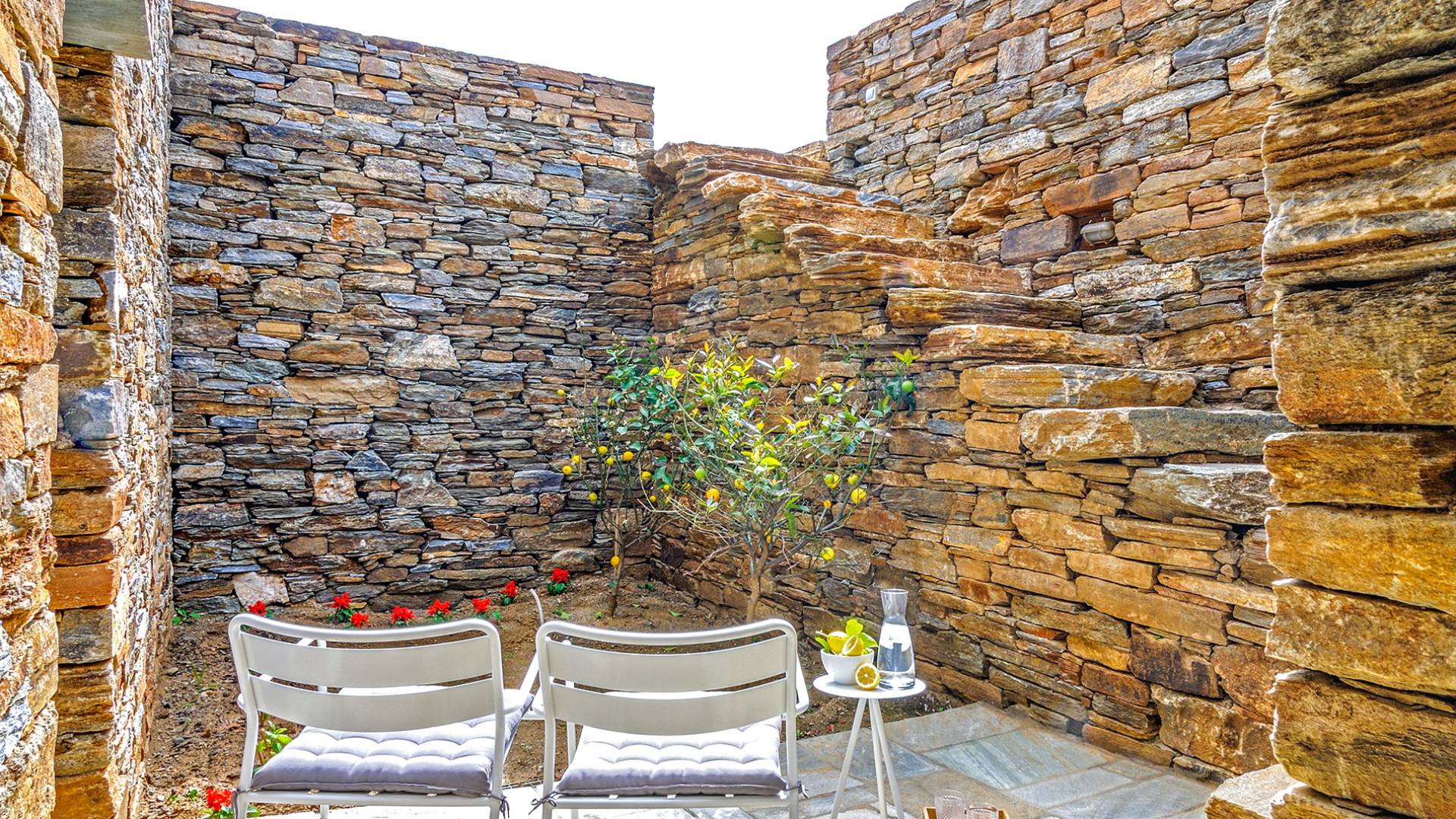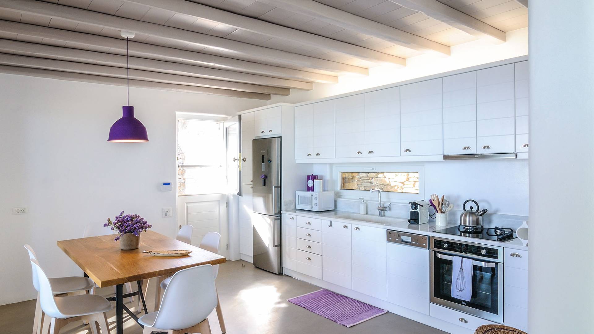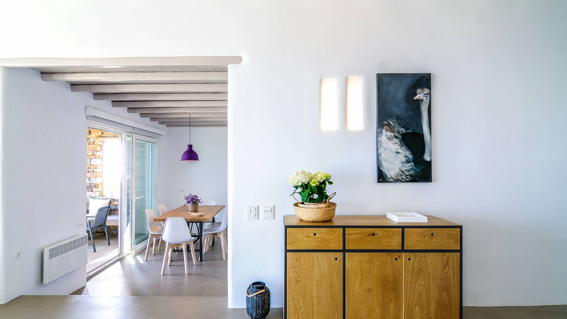 El estilo minimalista del mobiliario interior y la decoración en tonos blancos y grises rinde homenaje a la sencillez tradicional de las Cícladas con un toque contemporáneo y resalta aún más las impresionantes vistas. Las paredes son blancas con pisos de cemento pulido creando un ambiente especial. Cada villa tiene 4 dormitorios en tres niveles, mientras que hay una casa de huéspedes autónoma (en un establo tradicional llamado Keli, que significa celda) que se puede utilizar como quinto dormitorio.