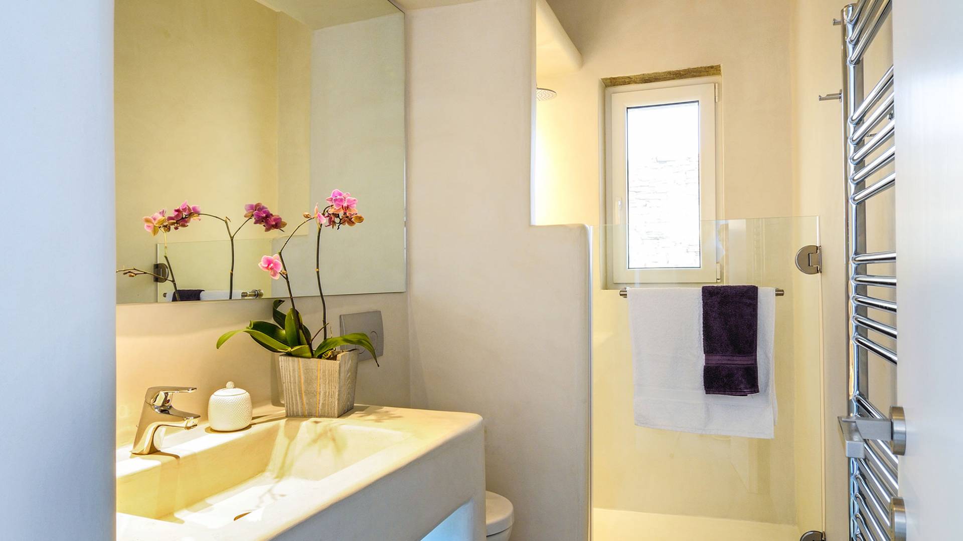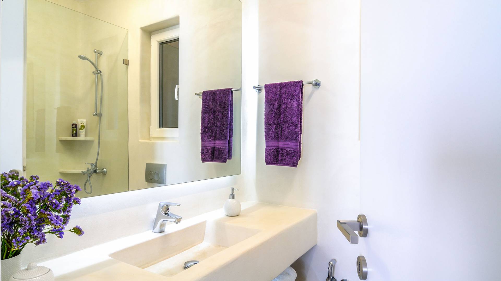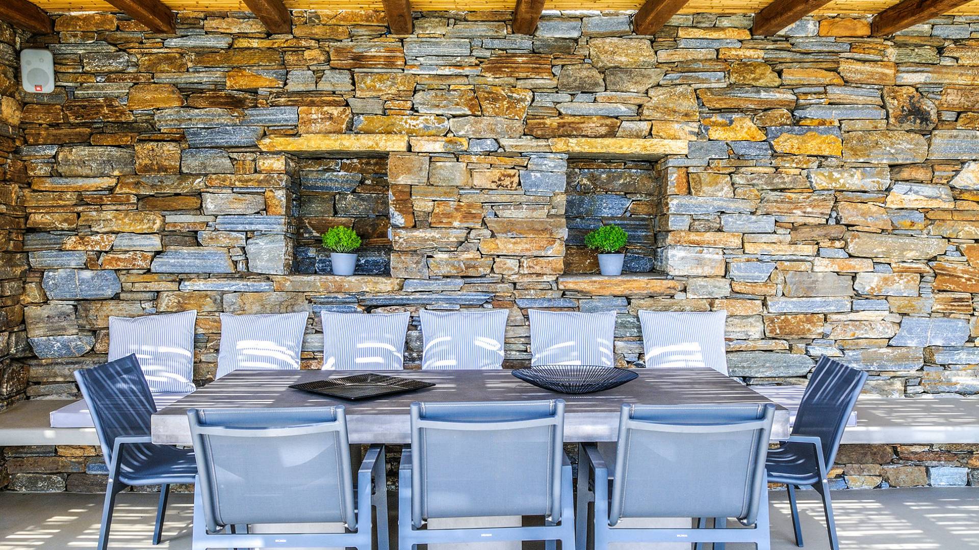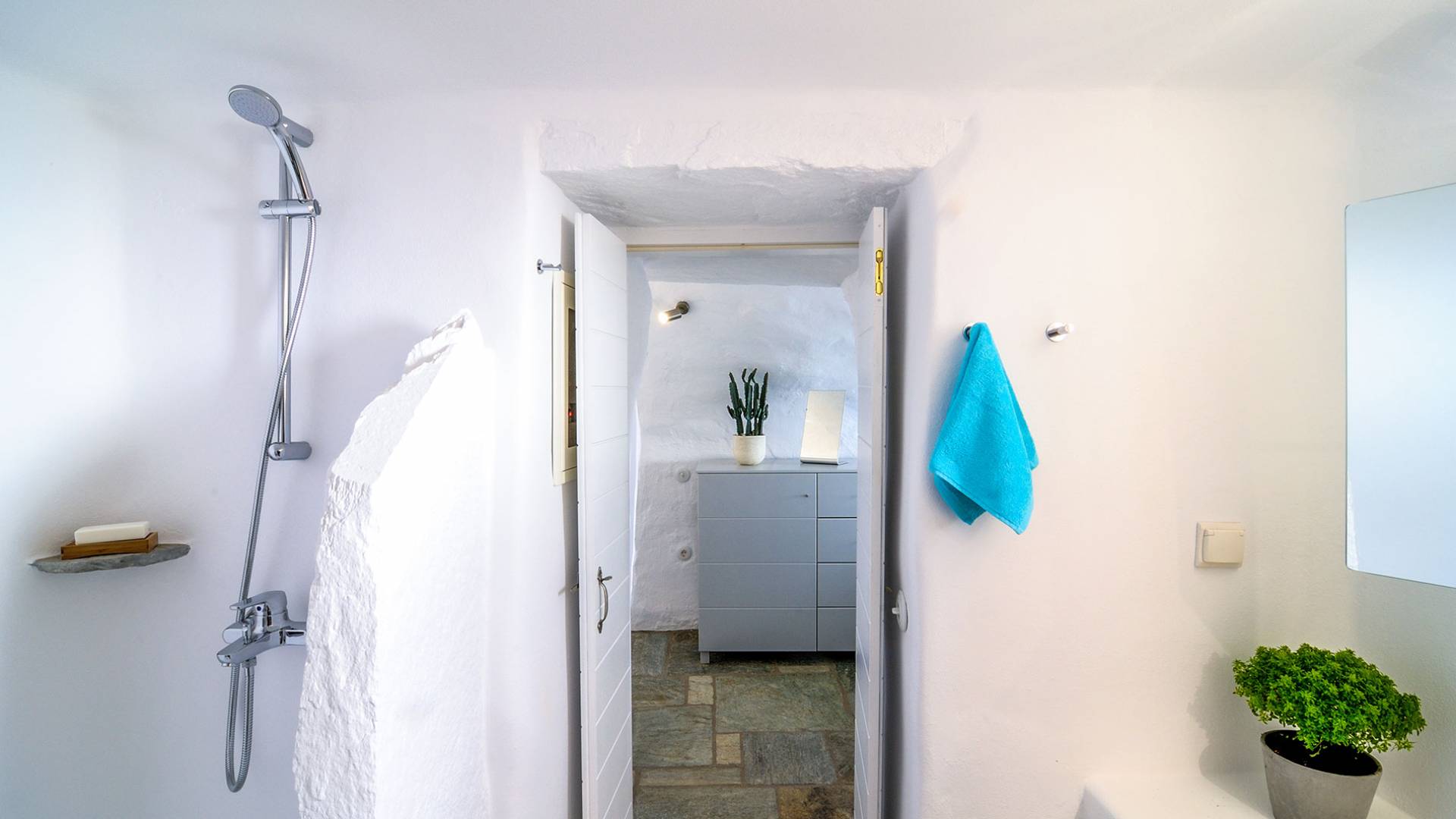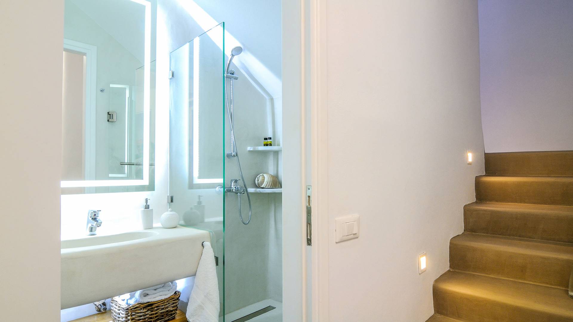 El estilo minimalista del mobiliario interior y la decoración en tonos blancos y grises rinde homenaje a la sencillez tradicional de las Cícladas con un toque contemporáneo y resalta aún más las impresionantes vistas. Las paredes son blancas con pisos de cemento pulido creando un ambiente especial. Cada villa tiene 4 dormitorios en tres niveles, mientras que hay una casa de huéspedes autónoma (en un establo tradicional llamado Keli, que significa celda) que se puede utilizar como quinto dormitorio.
