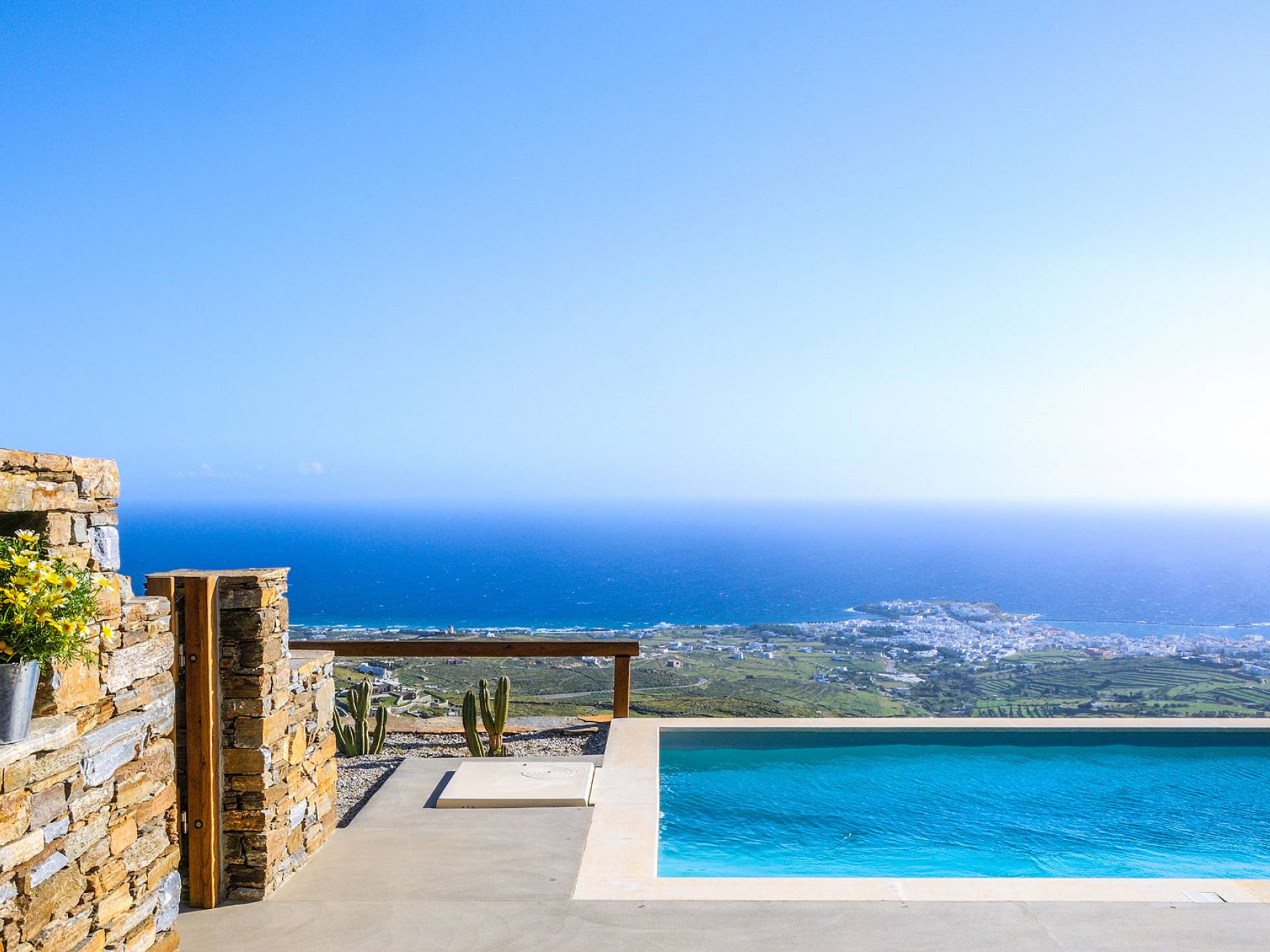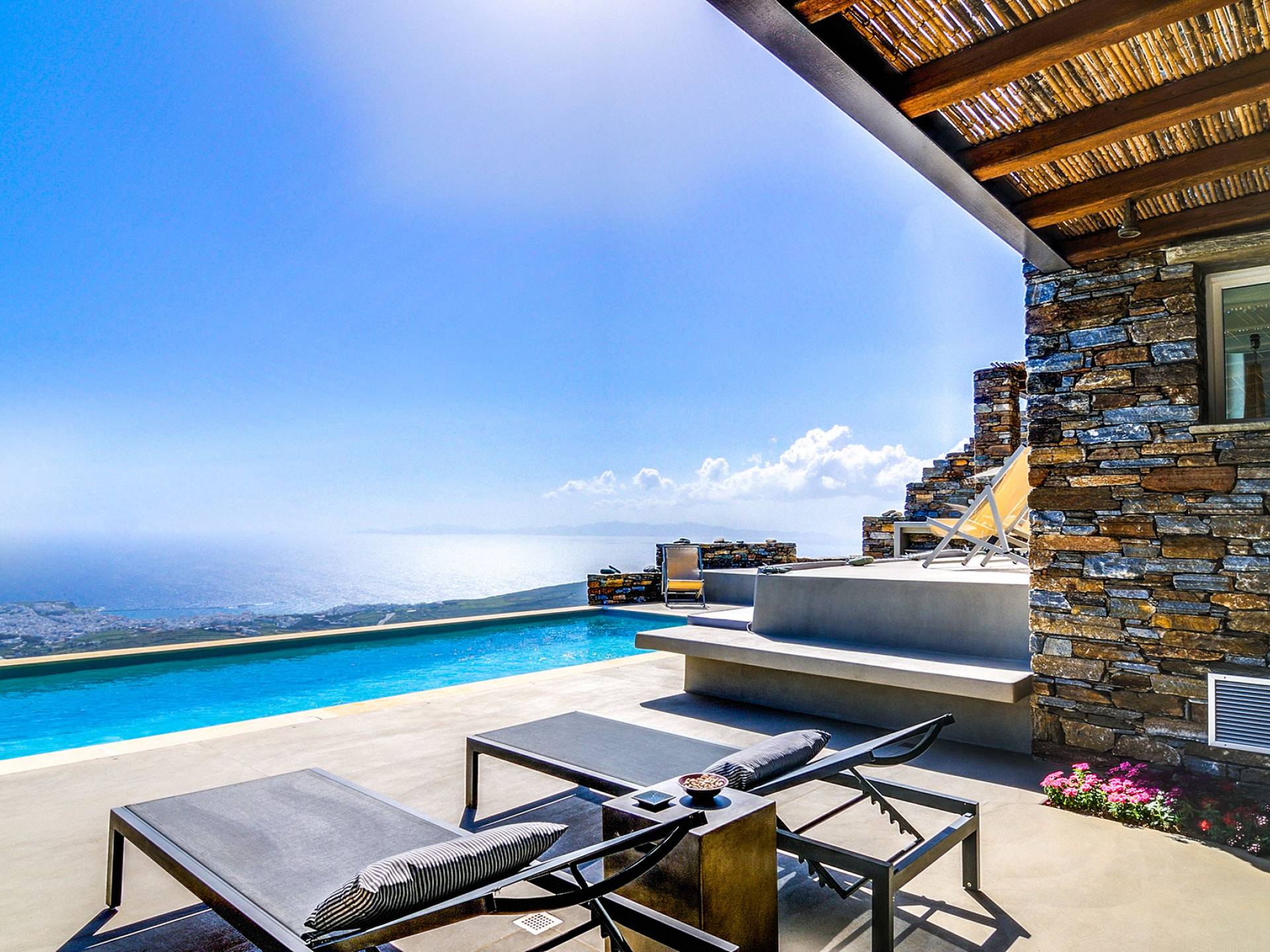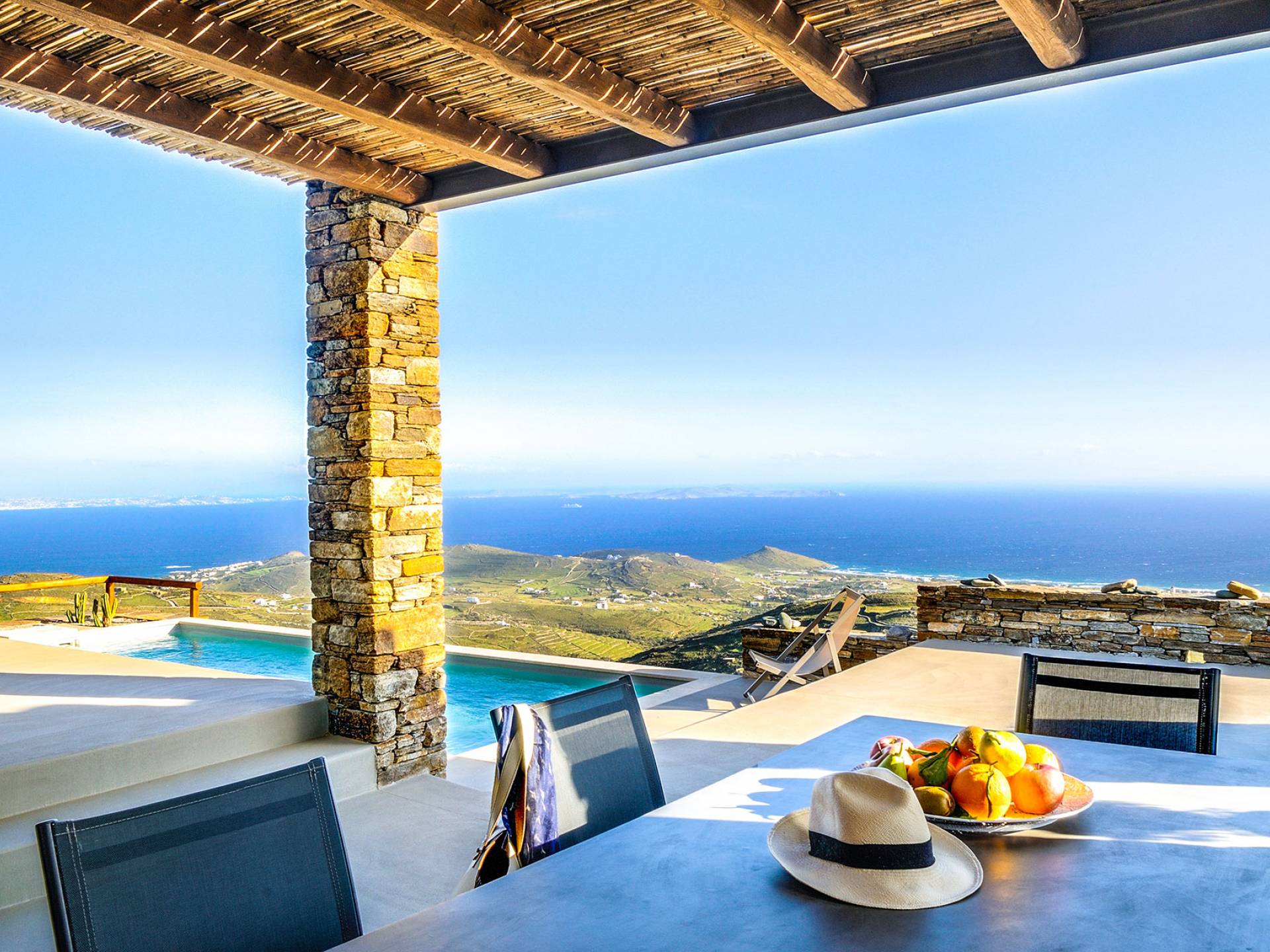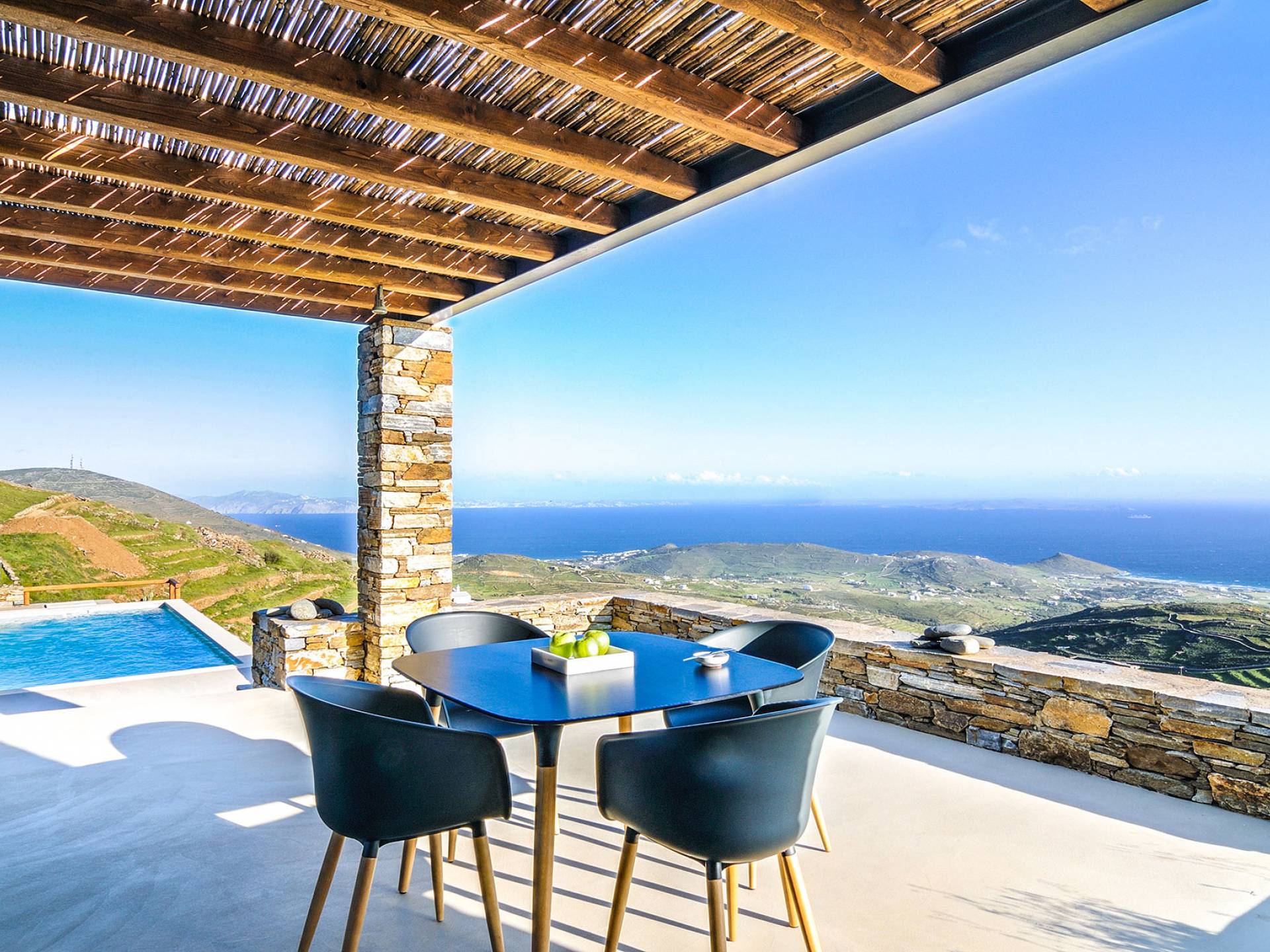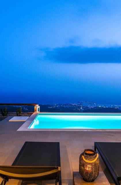 La piscina infinita es el lugar perfecto para horas de ocio contemplando este increíble panorama isleño. Bajo la pérgola bellamente diseñada, protegida por los fuertes vientos meltemi de la isla, los huéspedes pueden disfrutar de deliciosas comidas con los famosos productos locales de la isla, mientras que la parcela circundante tiene un jardín de vegetales y hierbas, de donde los huéspedes pueden usar productos frescos.