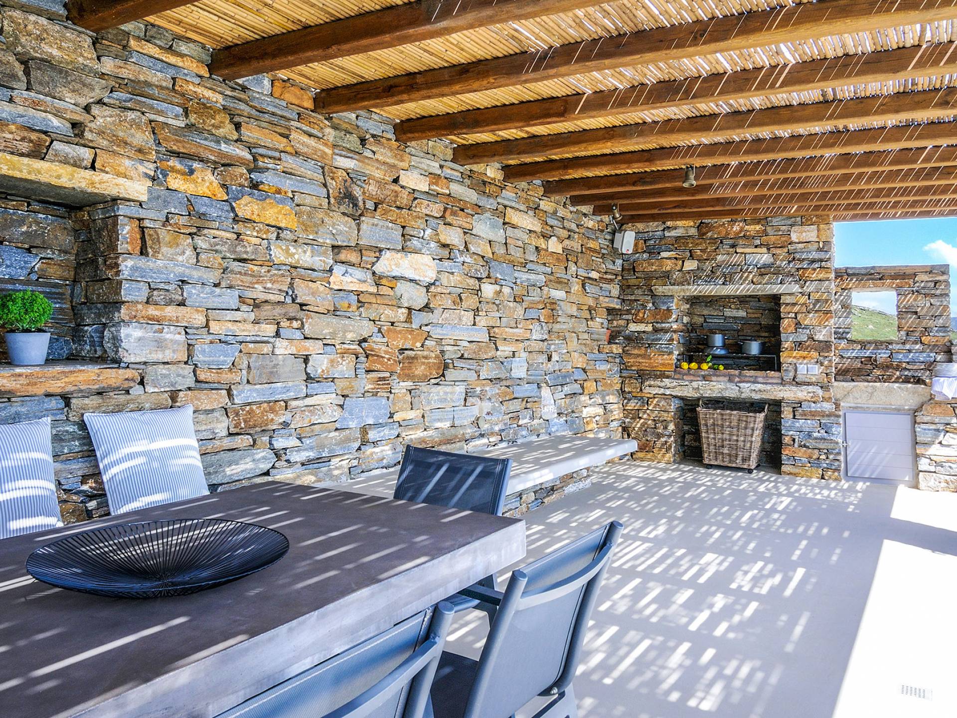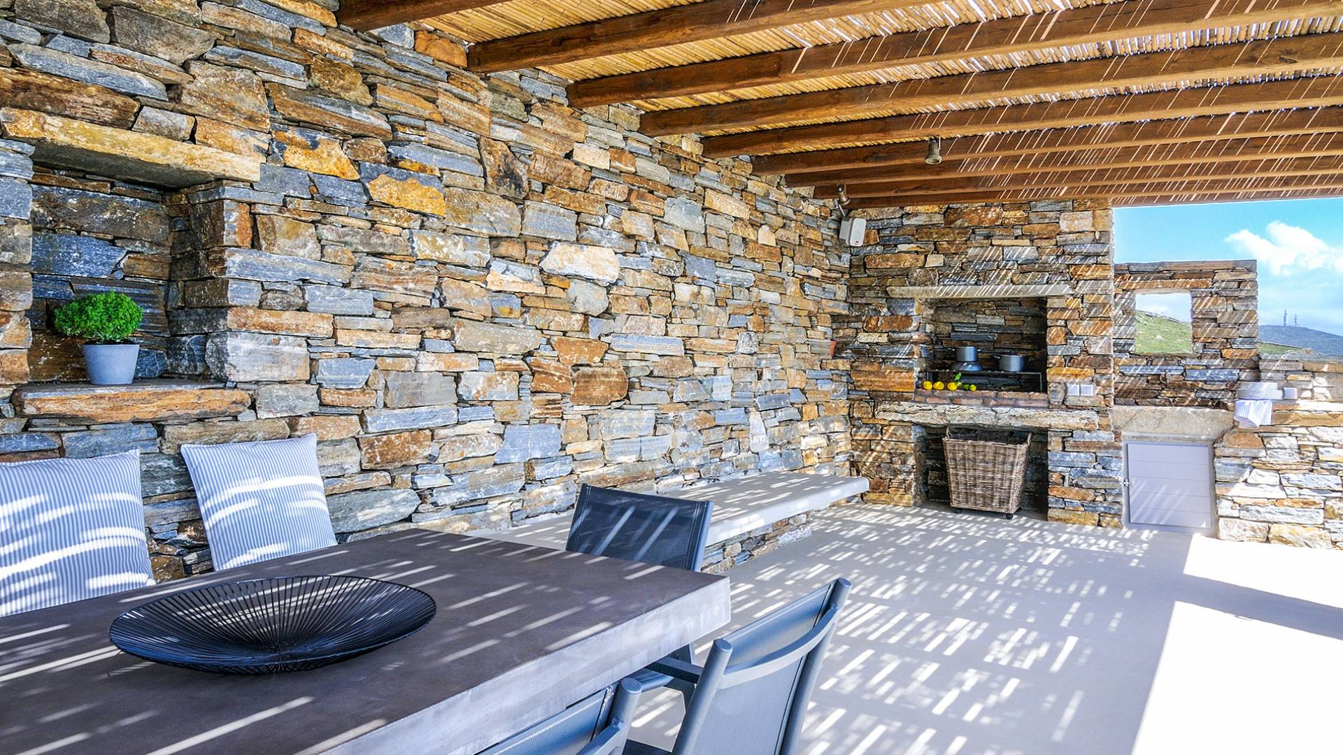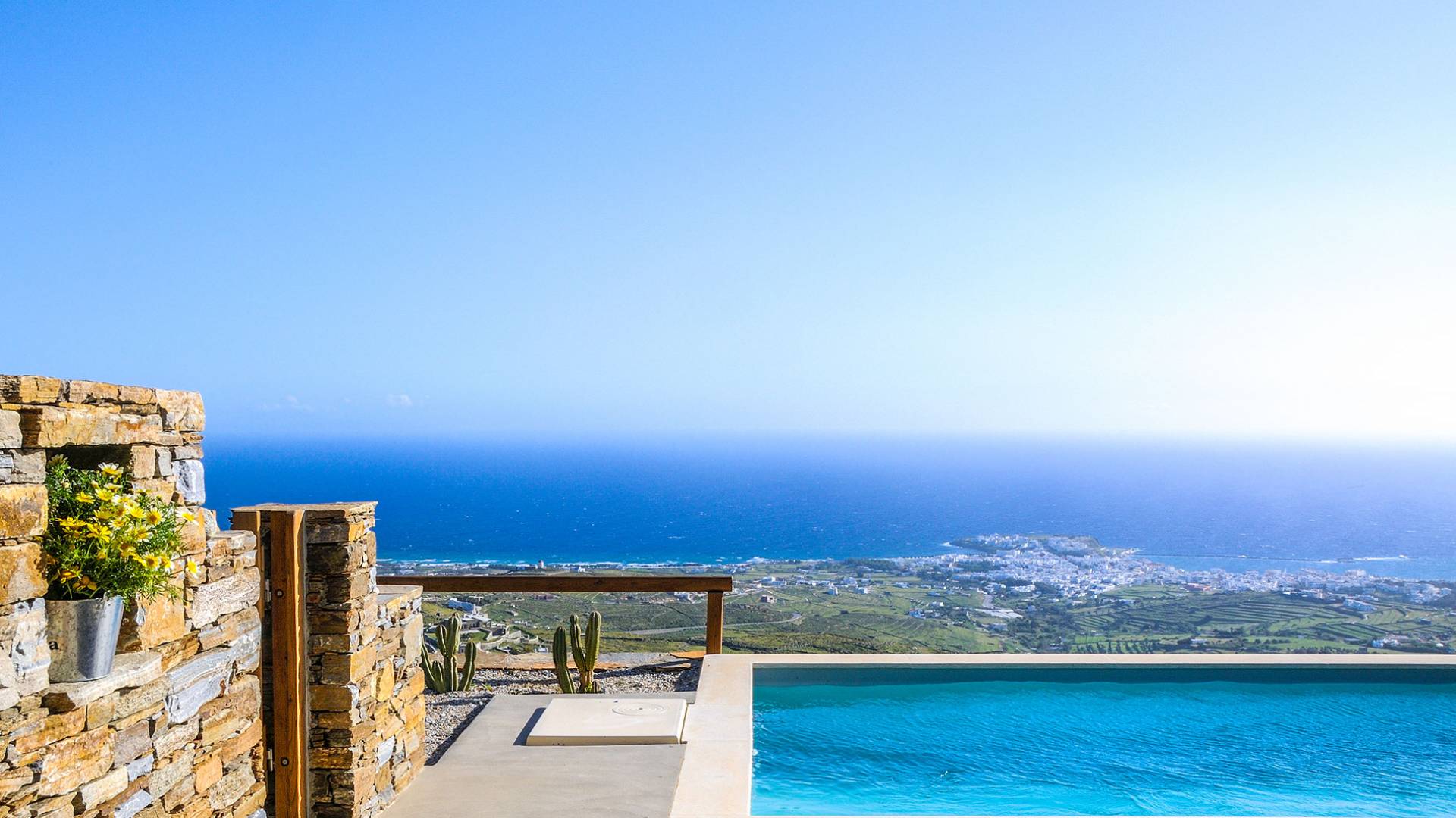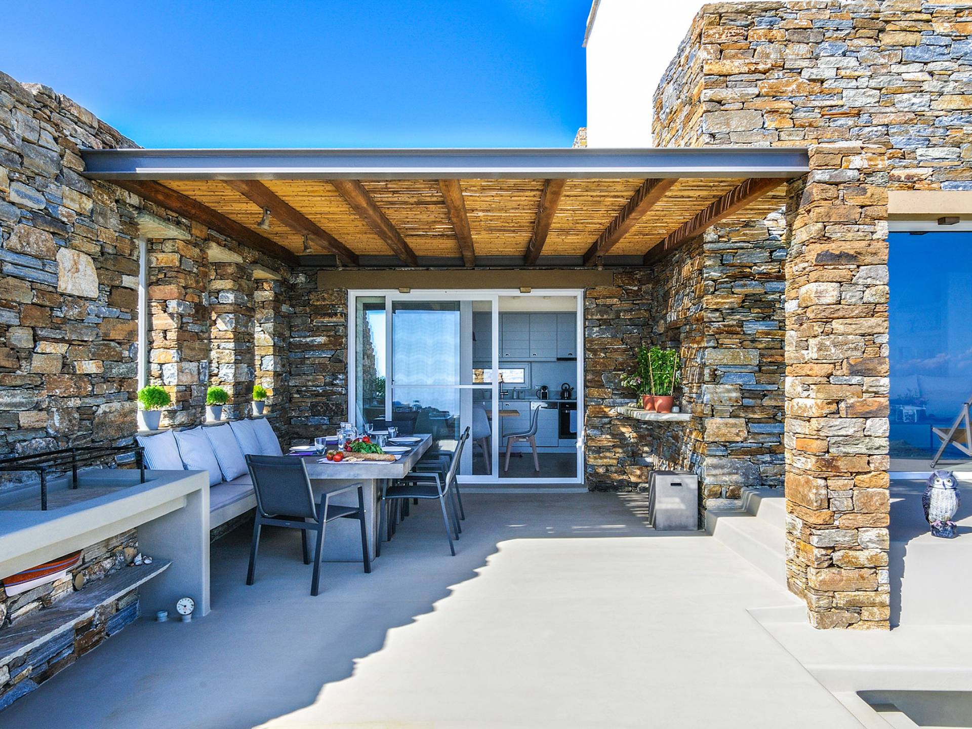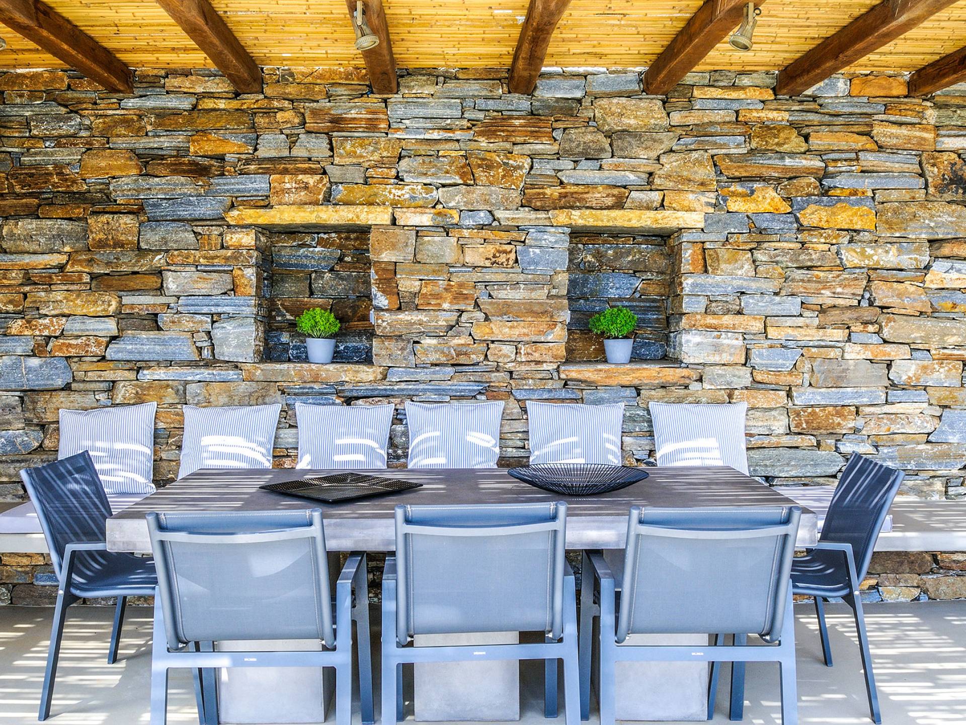 La piscina infinita es el lugar perfecto para horas de ocio contemplando este increíble panorama isleño. Bajo la pérgola bellamente diseñada, protegida por los fuertes vientos meltemi de la isla, los huéspedes pueden disfrutar de deliciosas comidas con los famosos productos locales de la isla, mientras que la parcela circundante tiene un jardín de vegetales y hierbas, de donde los huéspedes pueden usar productos frescos.