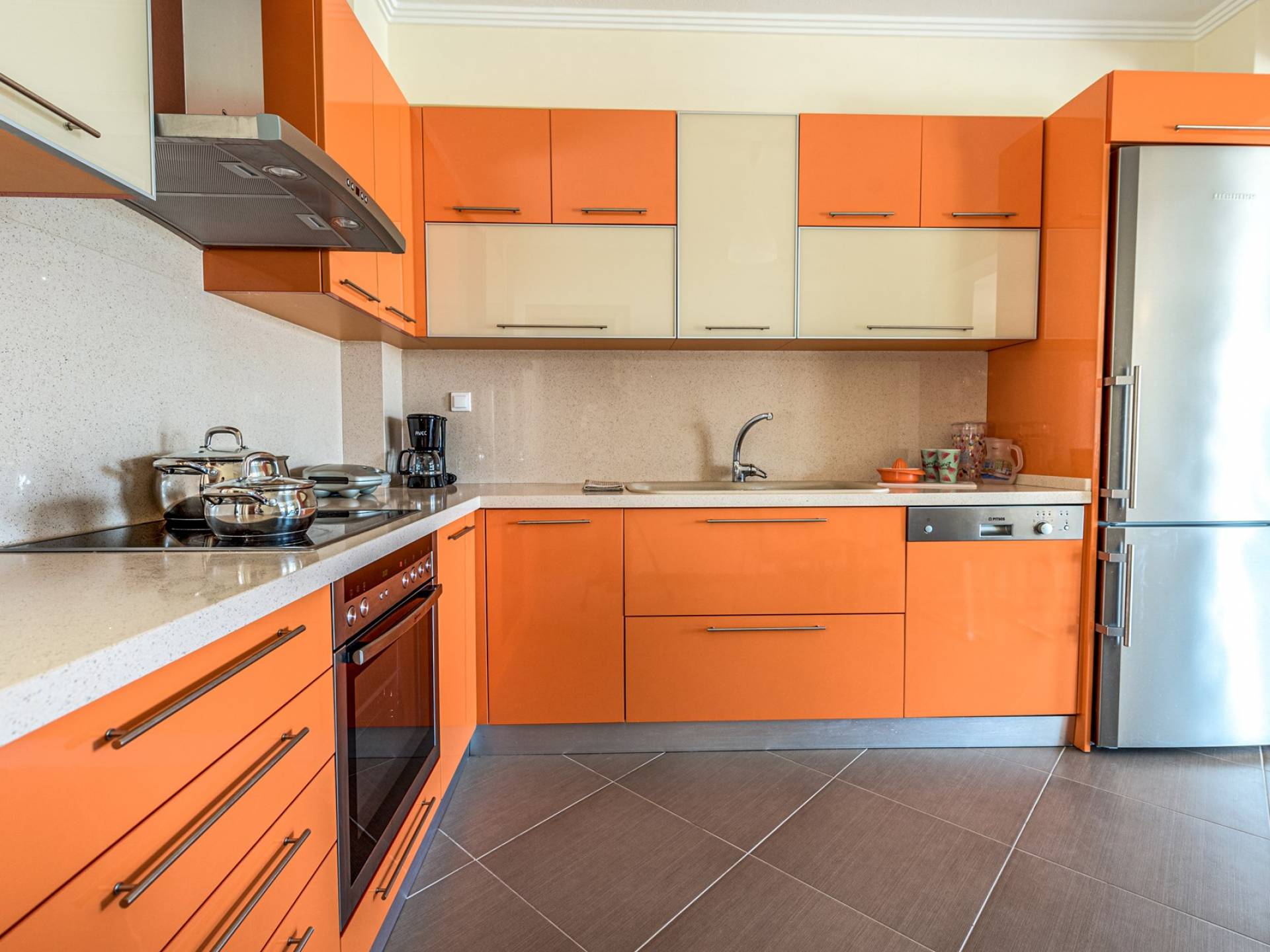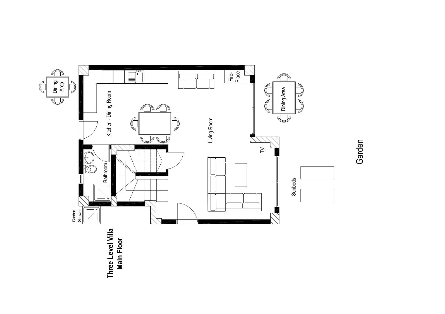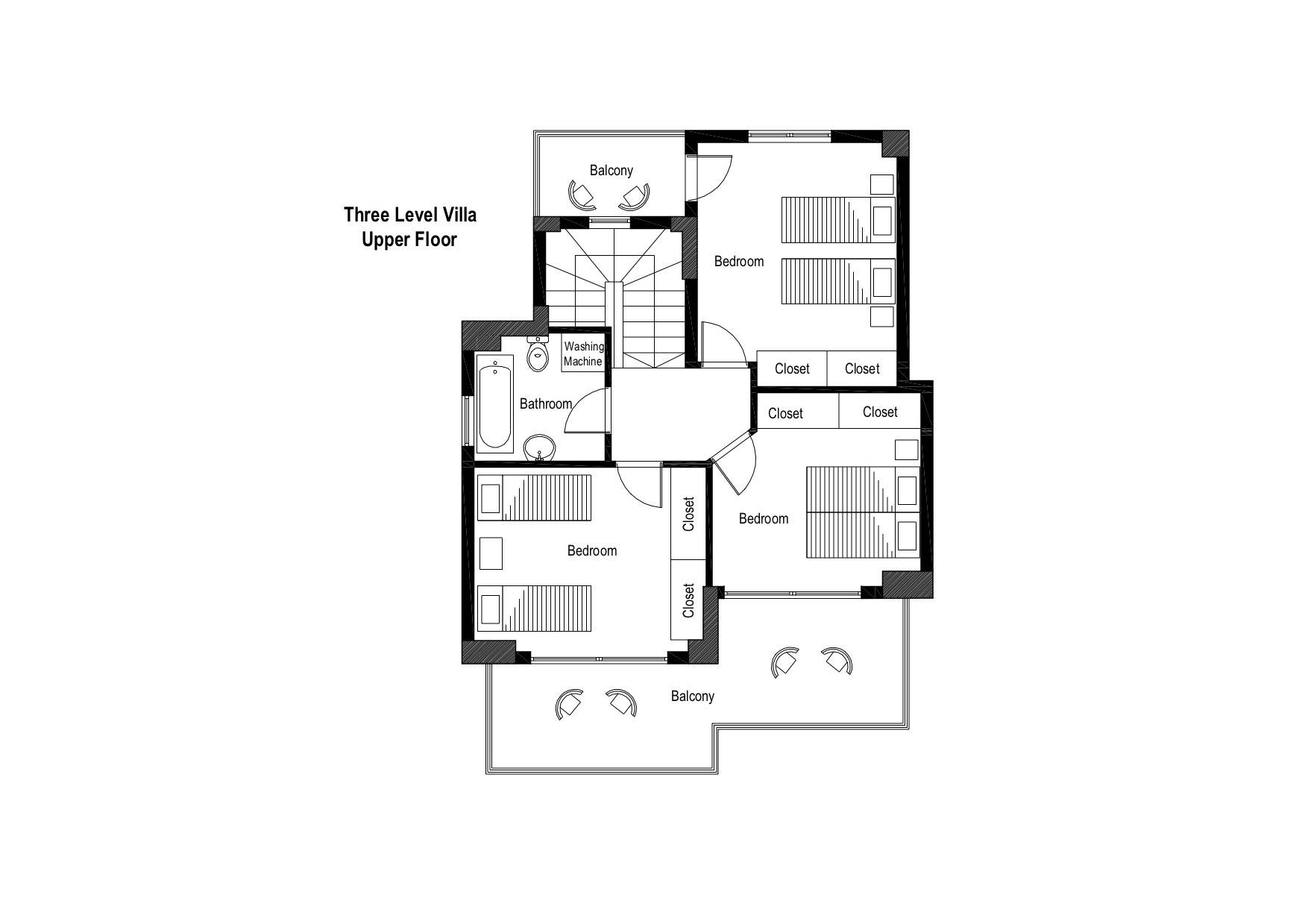 El primer edificio tiene tres niveles. En la planta baja donde se encuentra un salón con TV plana y aire acondicionado, una cocina moderna totalmente equipada con alta tecnología (horno, lavavajillas, microondas, frigorífico y congelador) y un aseo con ducha. El segundo piso tiene tres dormitorios y un baño con lavadora. Todas las recámaras cuentan con amplios closets, su propio A/C y sus propios balcones, dos de ellas miran a la playa y una al jardín trasero. En el sótano, hay una amplia sala de juegos con una cama doble y un sofá para sus instalaciones.