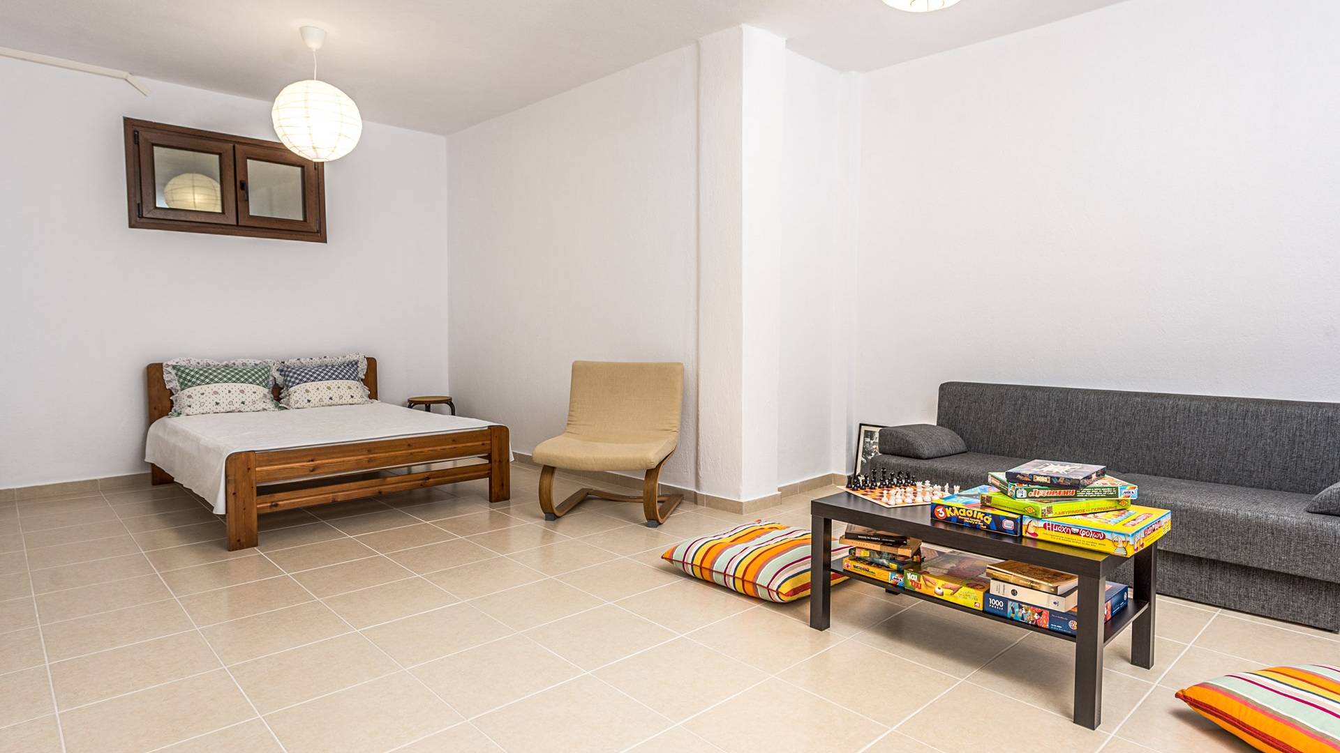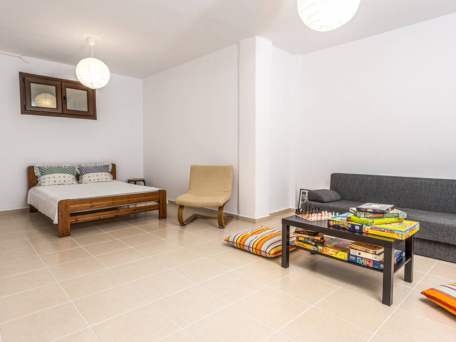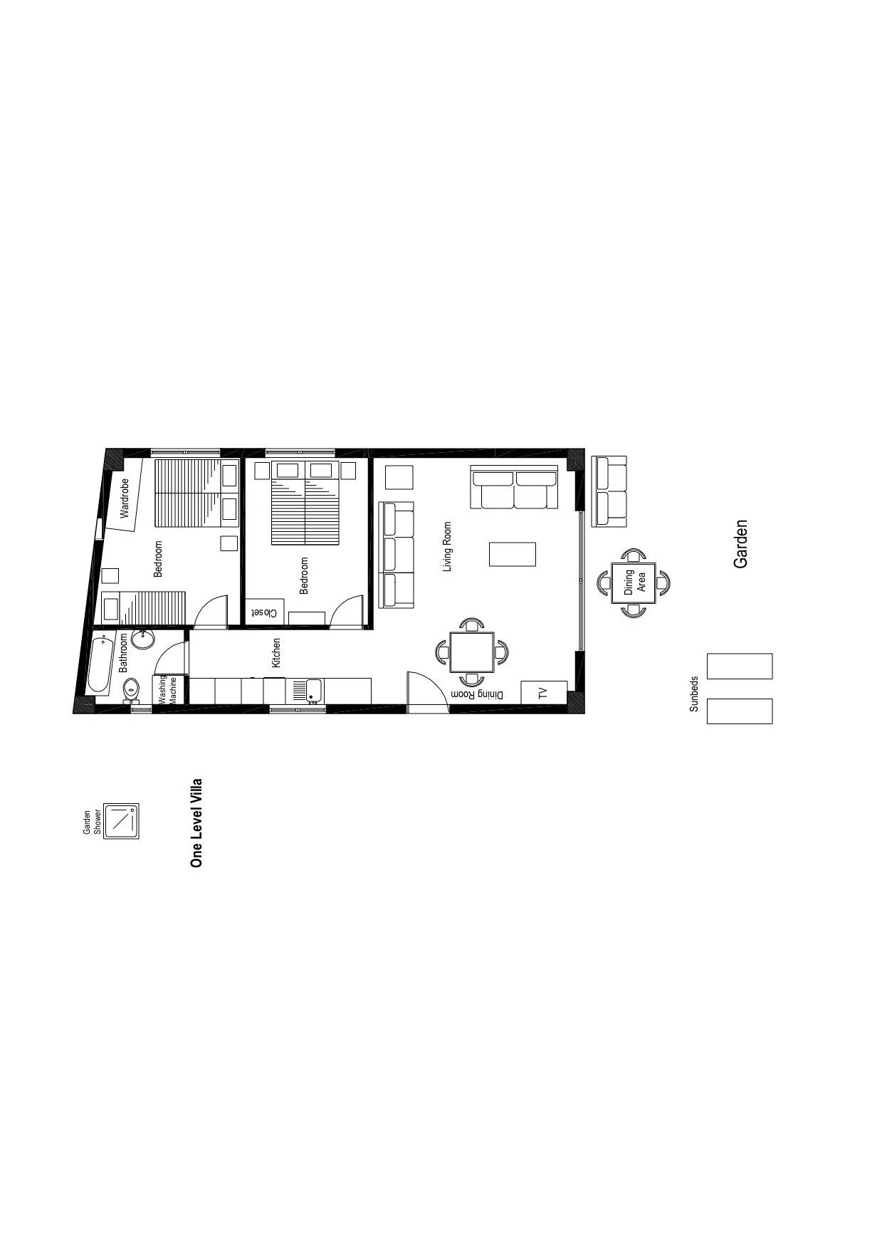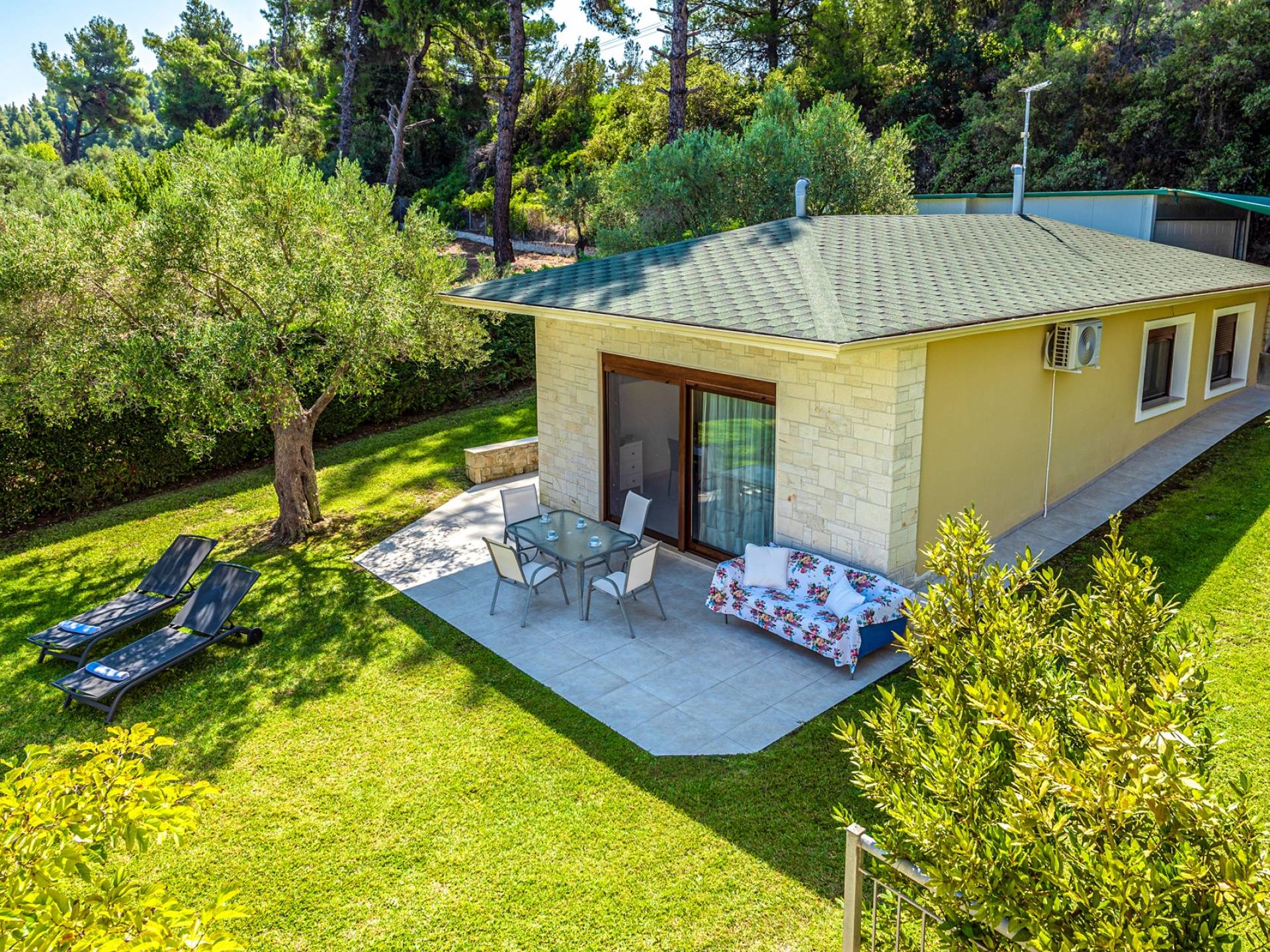 El segundo edificio está en la planta baja, de fácil acceso para las personas que quieren evitar las escaleras. Hay dos dormitorios, una sala de estar con TV plana, una cocina moderna, un baño, una lavadora y aire acondicionado. En el jardín hay mobiliario para que pueda disfrutar de sus comidas y tumbonas para tomar el sol. Ducha exterior con agua caliente, plazas de aparcamiento privado y zona de barbacoa.
