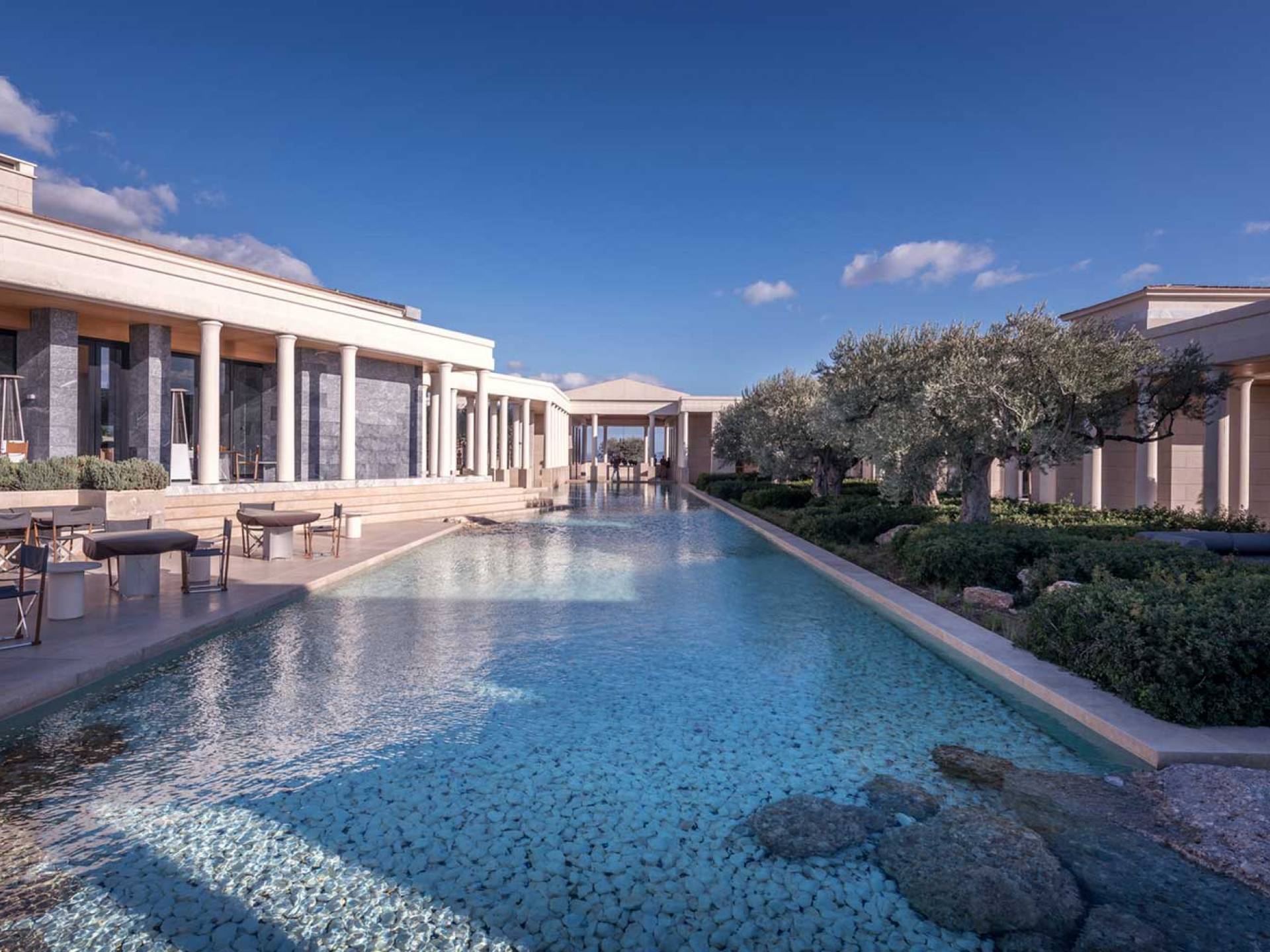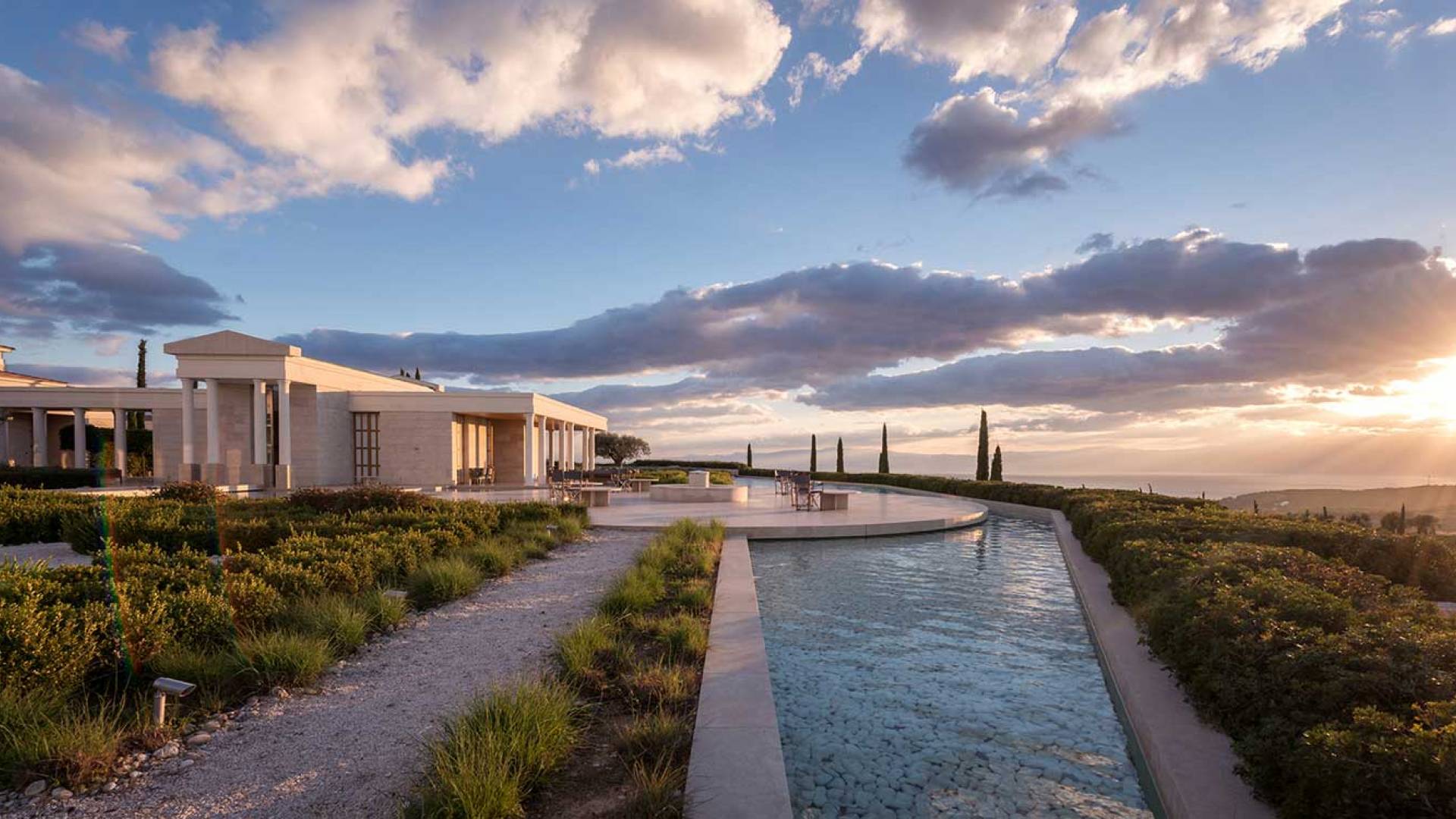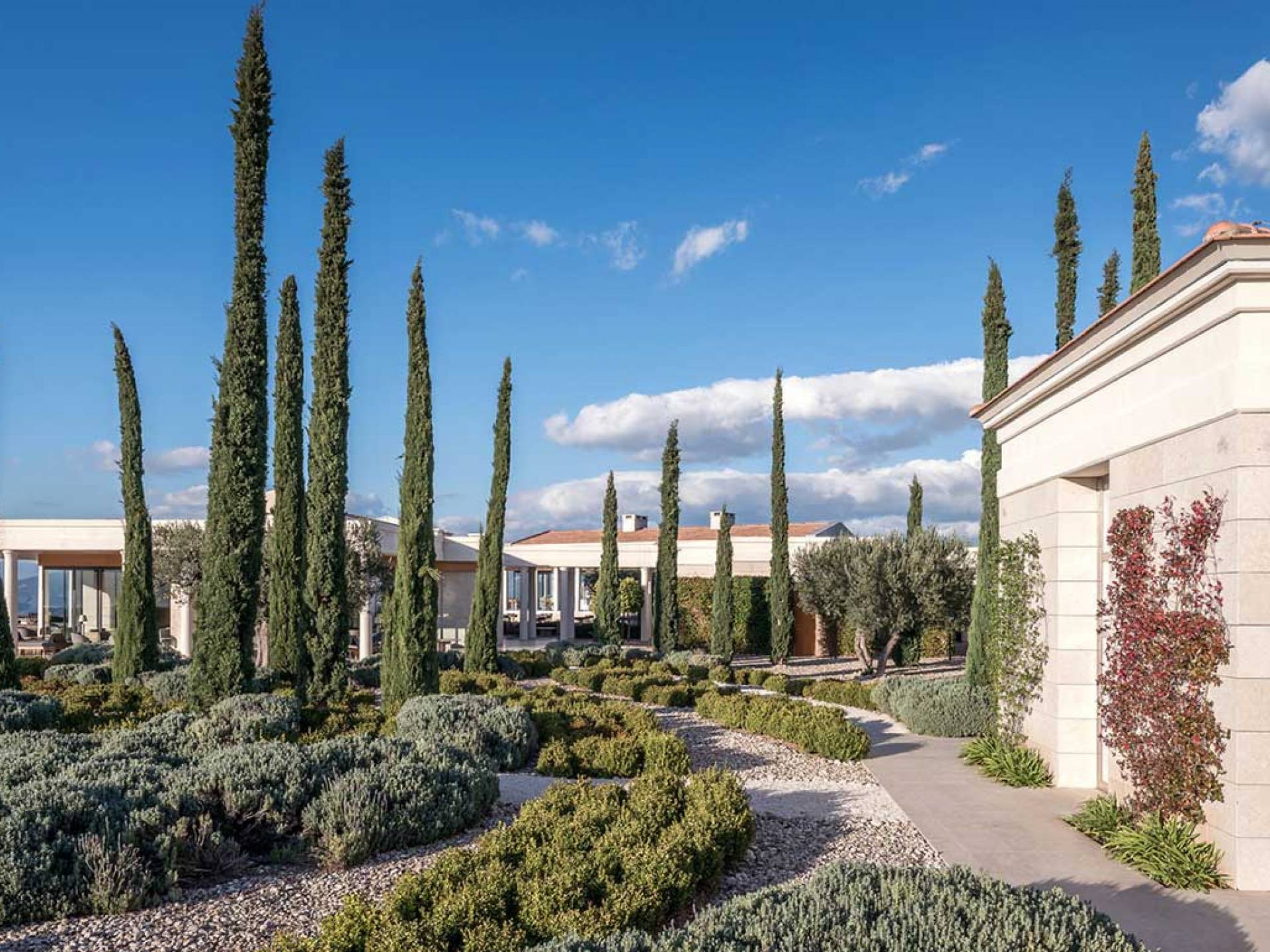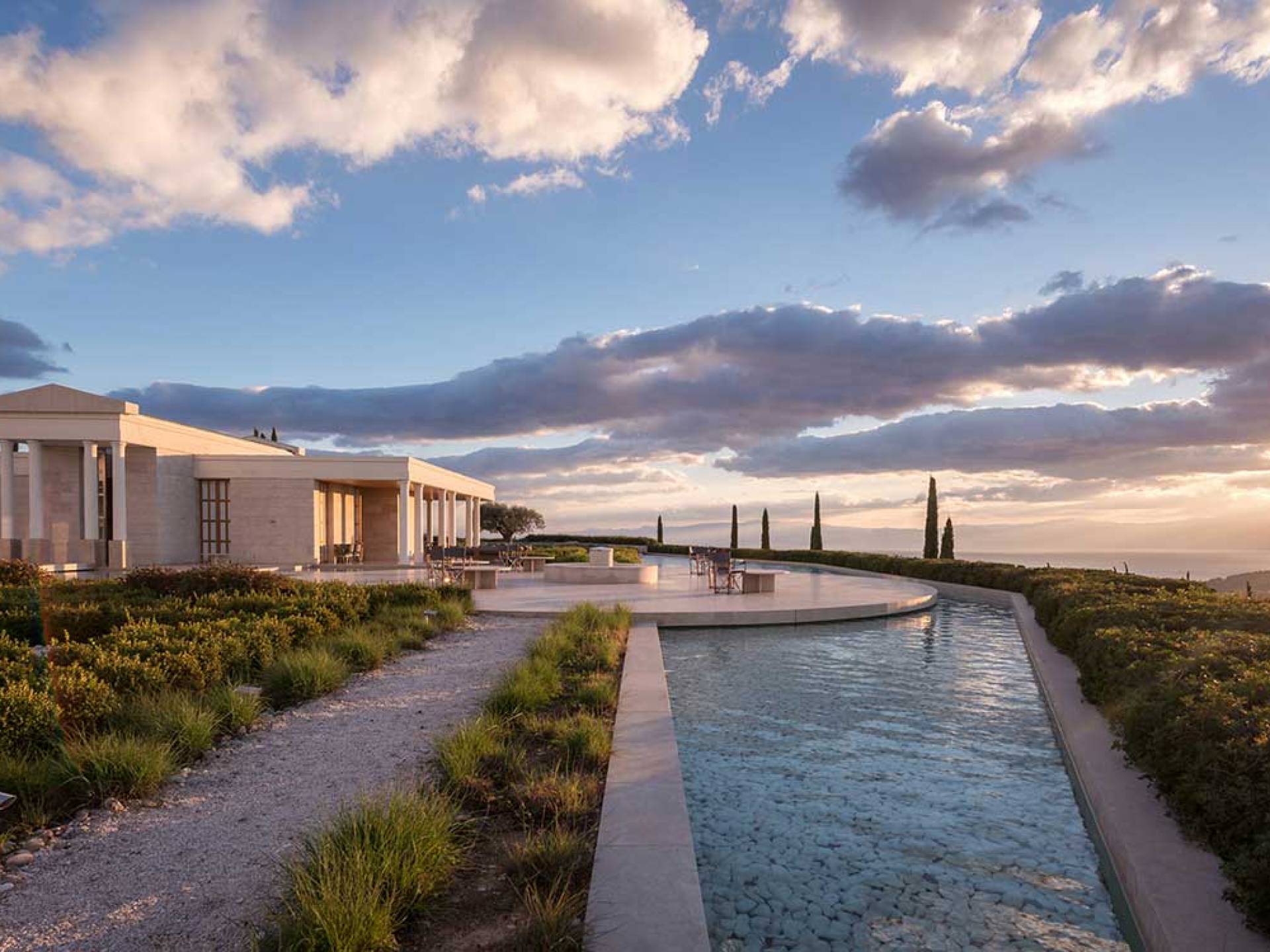 Amanzoe Resort en Porto Heli Grecia, antigua epopeya griega. El vuelo en helicóptero desde Atenas a Amanzoe crea una rápida transición hacia una Grecia completamente más salvaje, un lugar de naturaleza pura, donde el tiempo se detiene. Salpicado de ruinas de la Unesco, el Peloponeso por descubrir ha estado en el corazón de la cultura griega durante milenios, y es allí donde Amanzoe ha establecido su hogar en la cima de una colina, una Acrópolis moderna desde la cual las vistas de 360 grados abarcan olivares, azul del Egeo y poco más. Diseñadas para fusionarse con la tierra, las suites y villas con piscinas desmienten una notable sensación de espacio, abriéndose al fragante jardín o la playa, donde las lanchas rápidas esperan para deslizarse entre calas secretas y las cercanas islas de Spetses e Hydra.