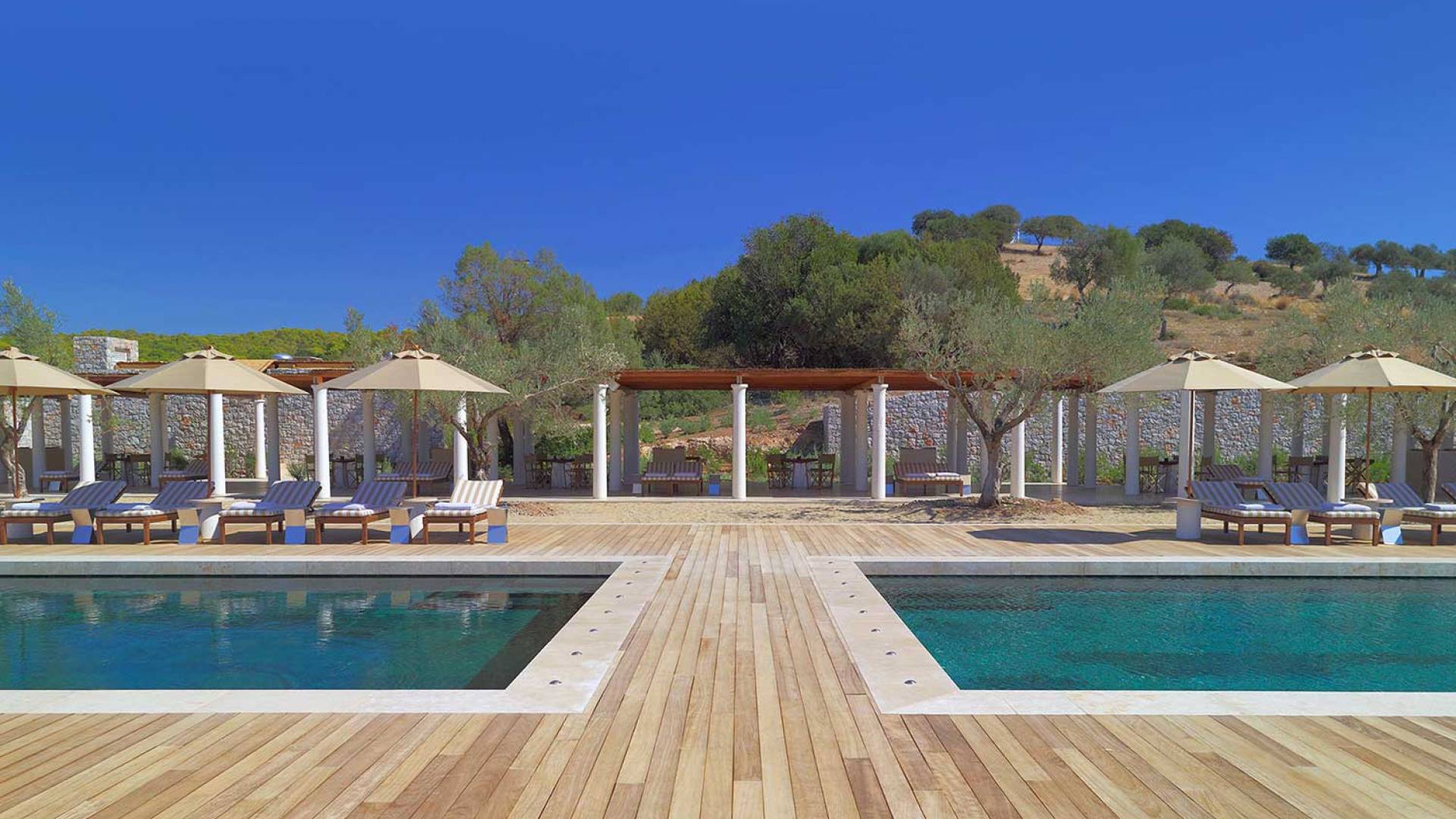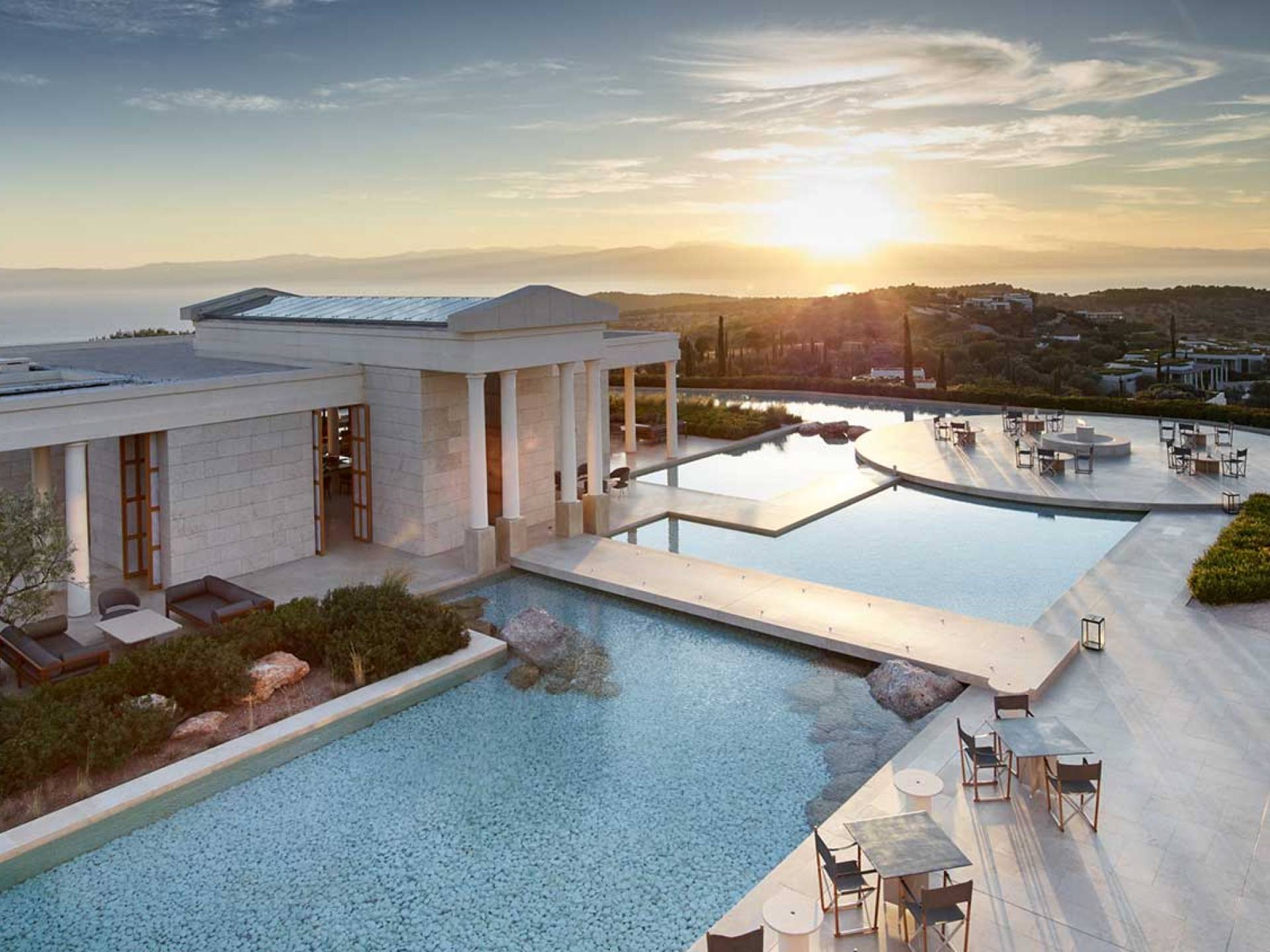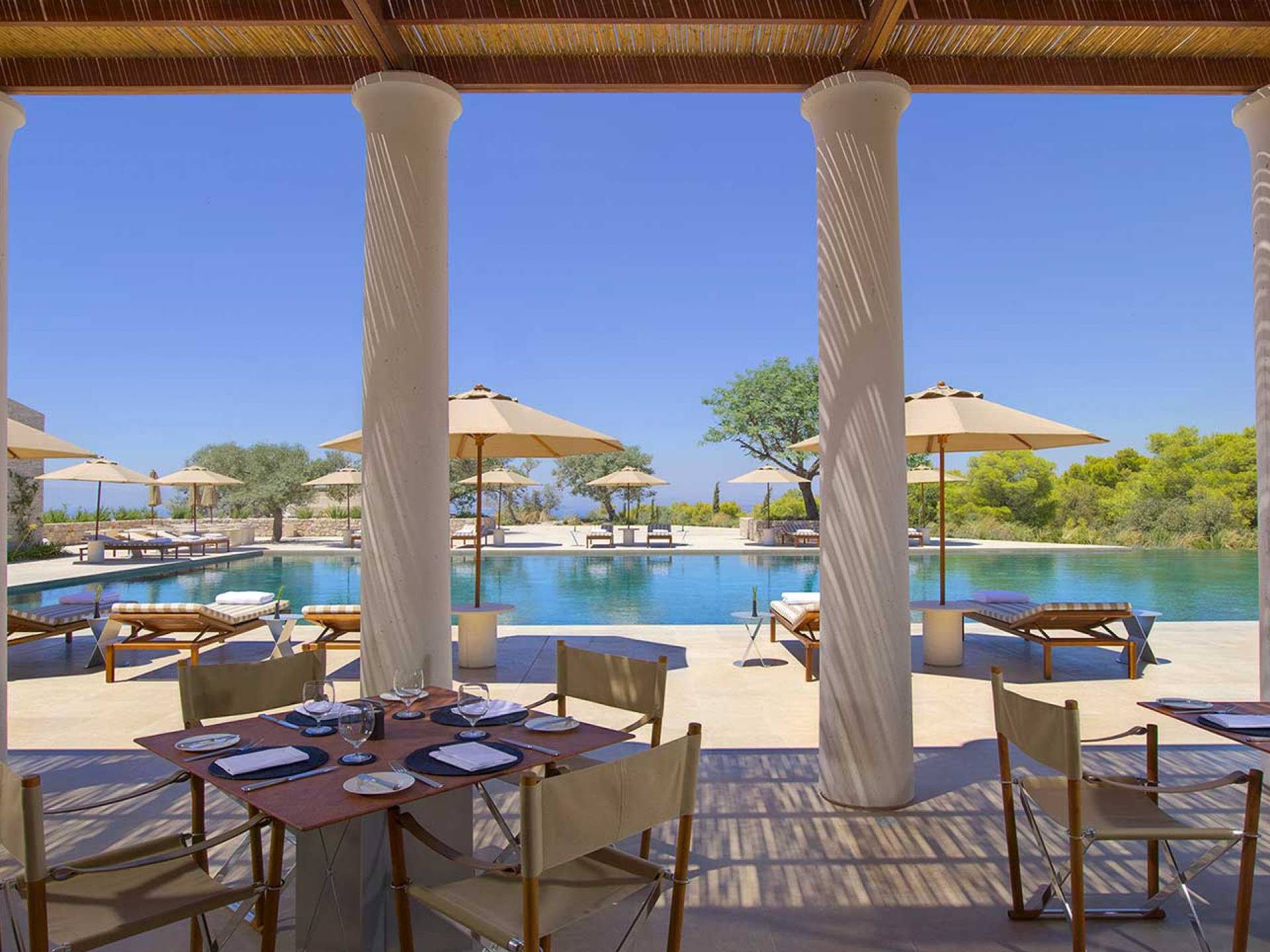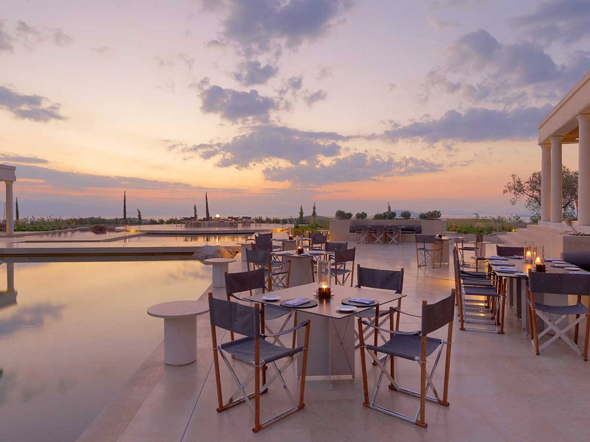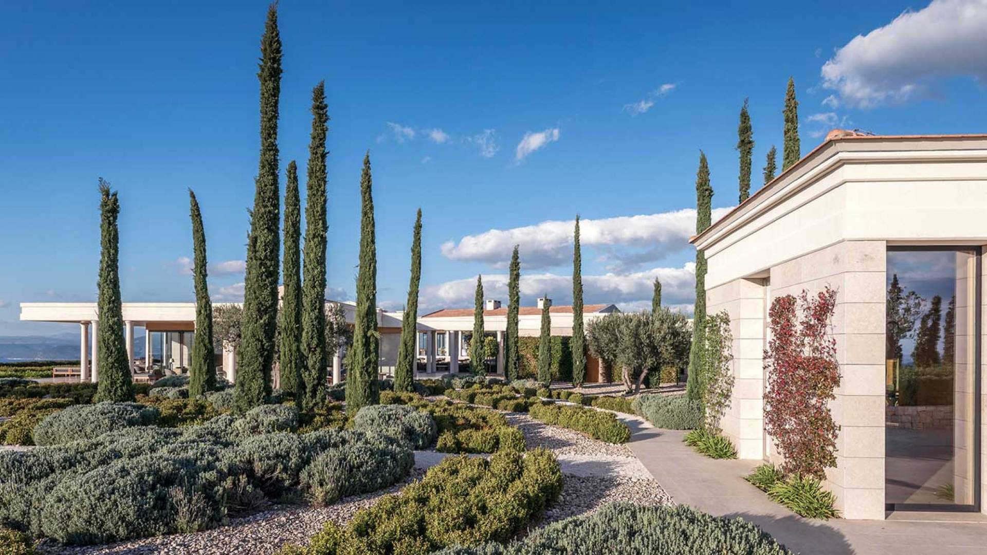 Amanzoe Resort en Porto Heli Grecia, antigua epopeya griega. El vuelo en helicóptero desde Atenas a Amanzoe crea una rápida transición hacia una Grecia completamente más salvaje, un lugar de naturaleza pura, donde el tiempo se detiene. Salpicado de ruinas de la Unesco, el Peloponeso por descubrir ha estado en el corazón de la cultura griega durante milenios, y es allí donde Amanzoe ha establecido su hogar en la cima de una colina, una Acrópolis moderna desde la cual las vistas de 360 grados abarcan olivares, azul del Egeo y poco más. Diseñadas para fusionarse con la tierra, las suites y villas con piscinas desmienten una notable sensación de espacio, abriéndose al fragante jardín o la playa, donde las lanchas rápidas esperan para deslizarse entre calas secretas y las cercanas islas de Spetses e Hydra.