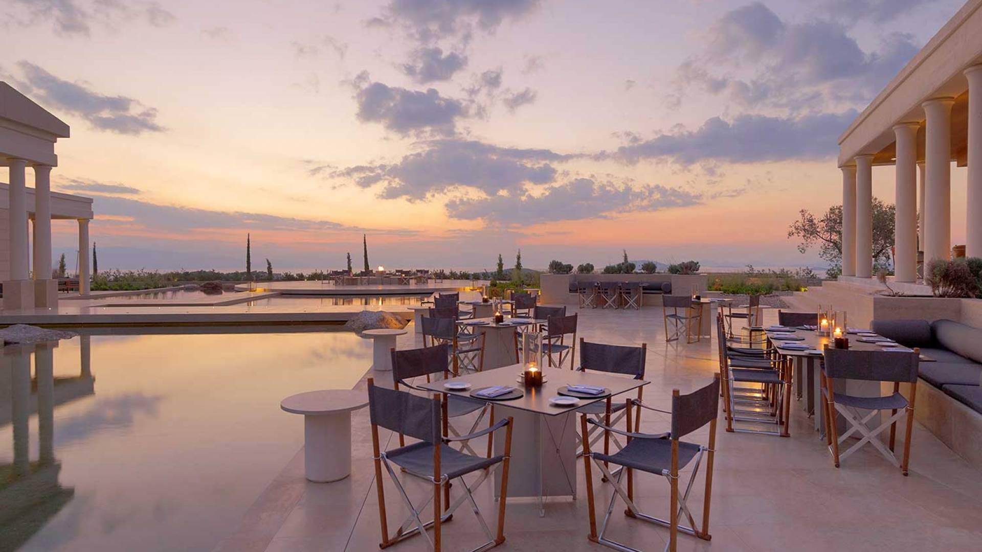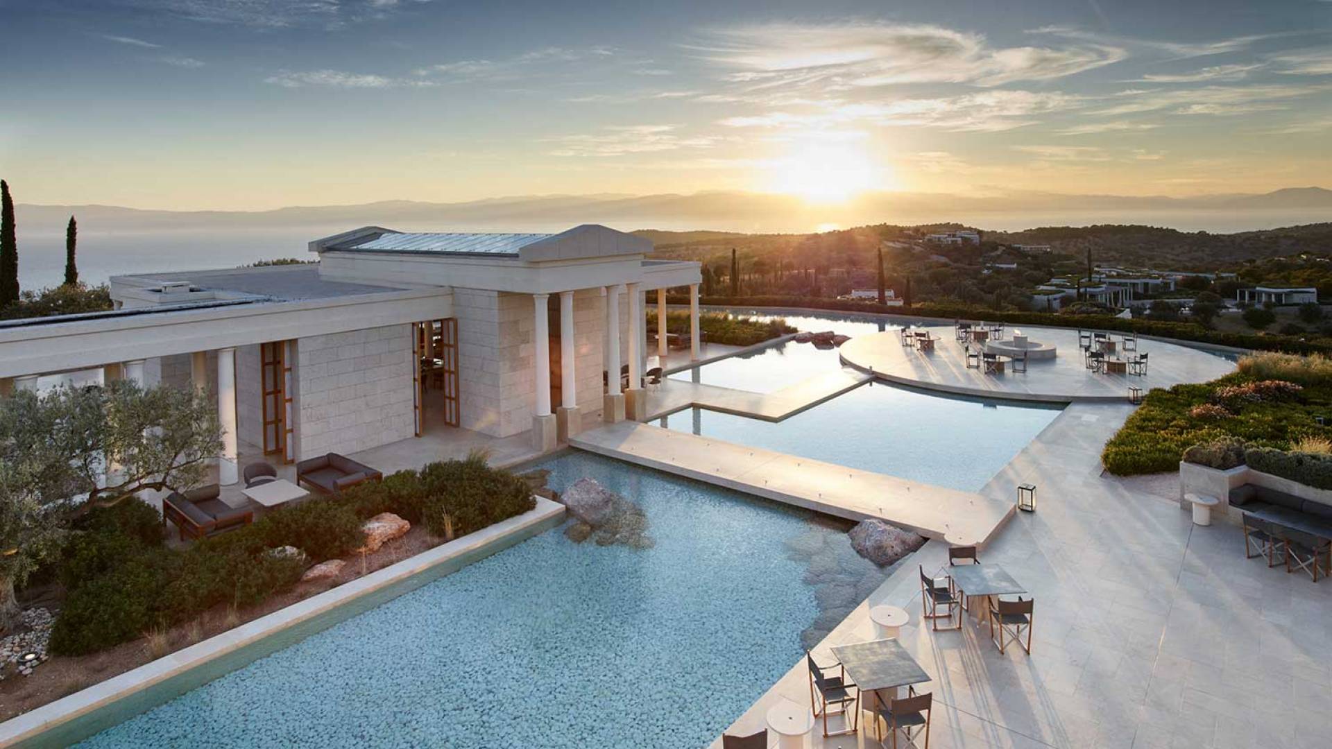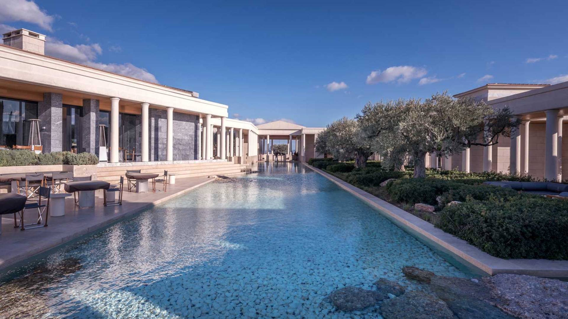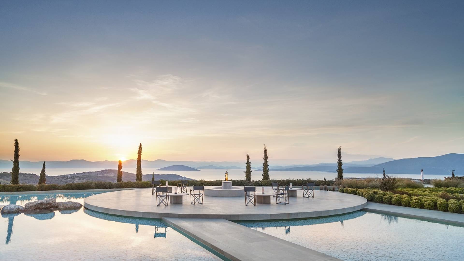 Amanzoe Resort en Porto Heli Grecia, antigua epopeya griega. El vuelo en helicóptero desde Atenas a Amanzoe crea una rápida transición hacia una Grecia completamente más salvaje, un lugar de naturaleza pura, donde el tiempo se detiene. Salpicado de ruinas de la Unesco, el Peloponeso por descubrir ha estado en el corazón de la cultura griega durante milenios, y es allí donde Amanzoe ha establecido su hogar en la cima de una colina, una Acrópolis moderna desde la cual las vistas de 360 grados abarcan olivares, azul del Egeo y poco más. Diseñadas para fusionarse con la tierra, las suites y villas con piscinas desmienten una notable sensación de espacio, abriéndose al fragante jardín o la playa, donde las lanchas rápidas esperan para deslizarse entre calas secretas y las cercanas islas de Spetses e Hydra.