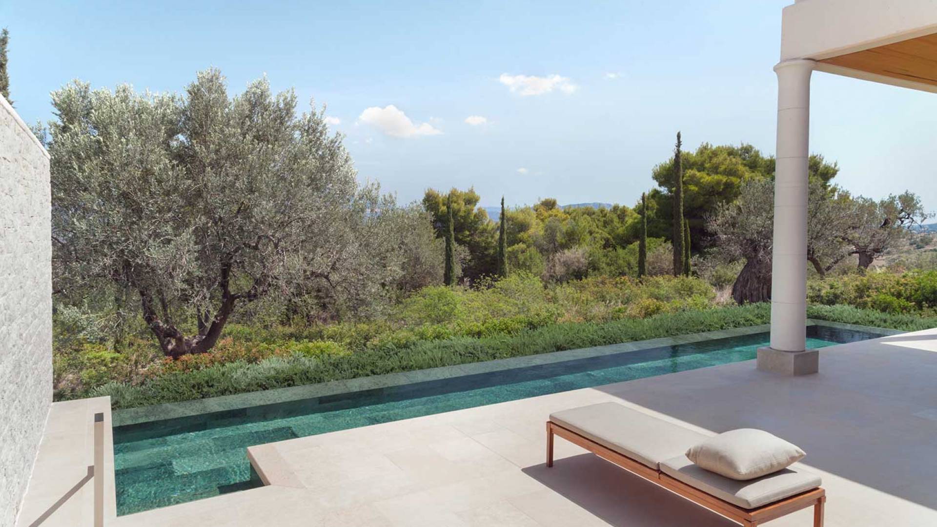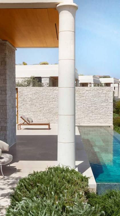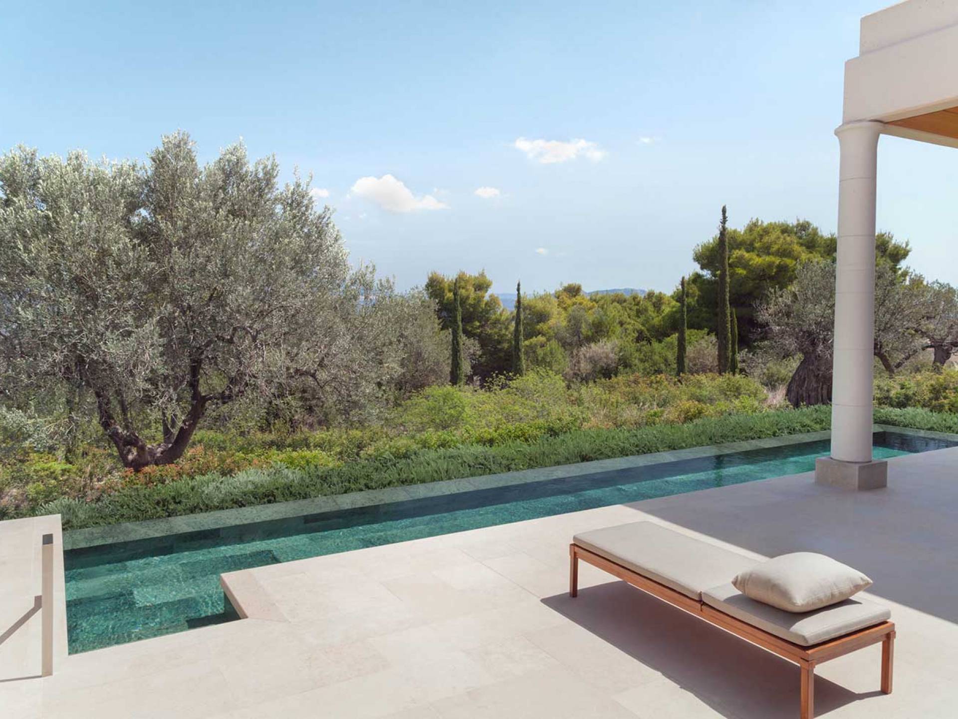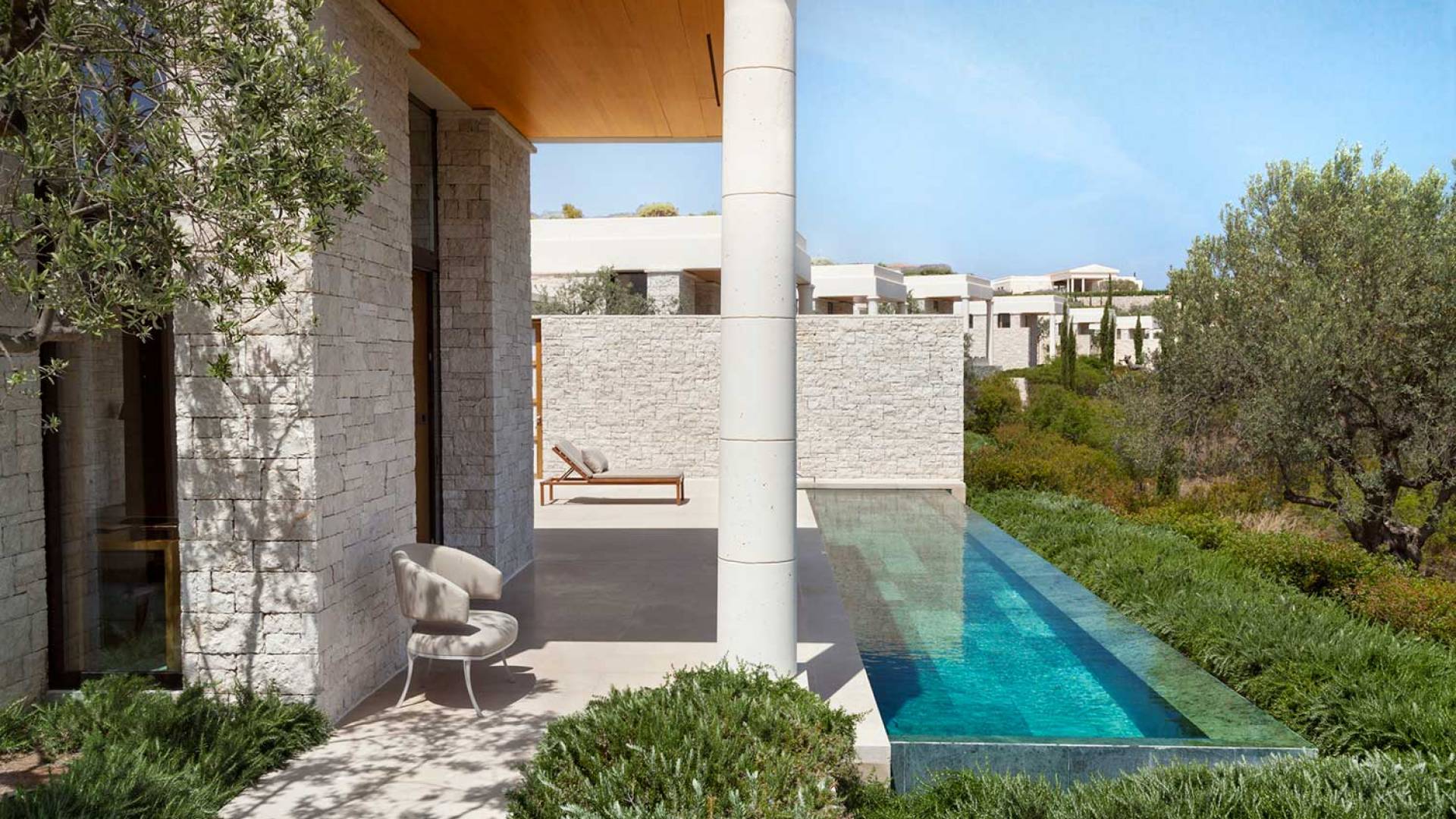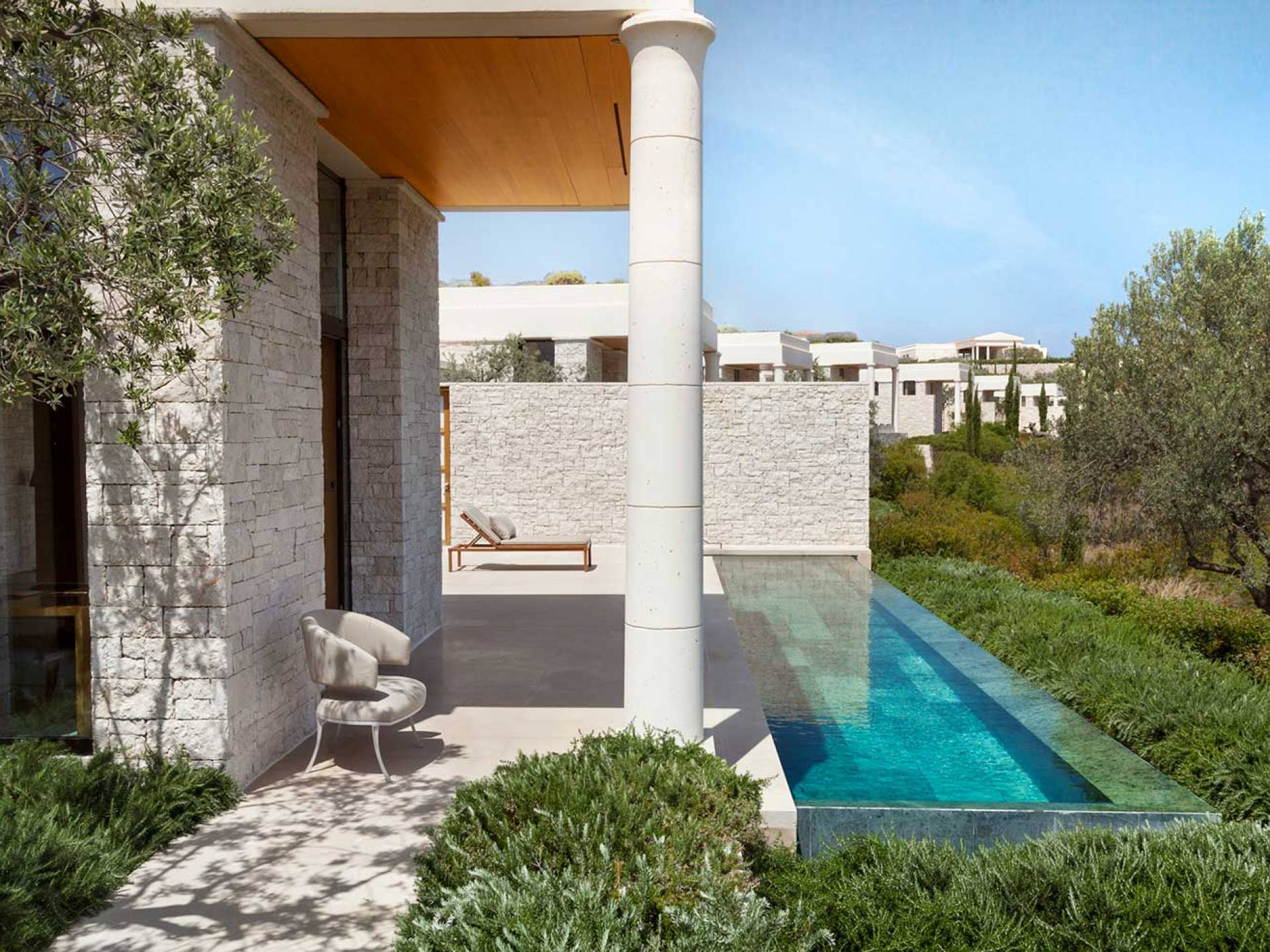 Inspirándose en la arquitectura griega clásica, con líneas fuertes y una estética minimalista, los pabellones de lujo independientes de Amanzoe se abren a terrazas con piscinas de inmersión privadas y vistas de la tierra y el mar circundantes. Se accede a cada pabellón a través de un patio con paredes de piedra, que conduce a una sala de estar de techos altos y una cama tamaño king colocada en una alcoba de mármol con vistas a la vista de Porto Heli.