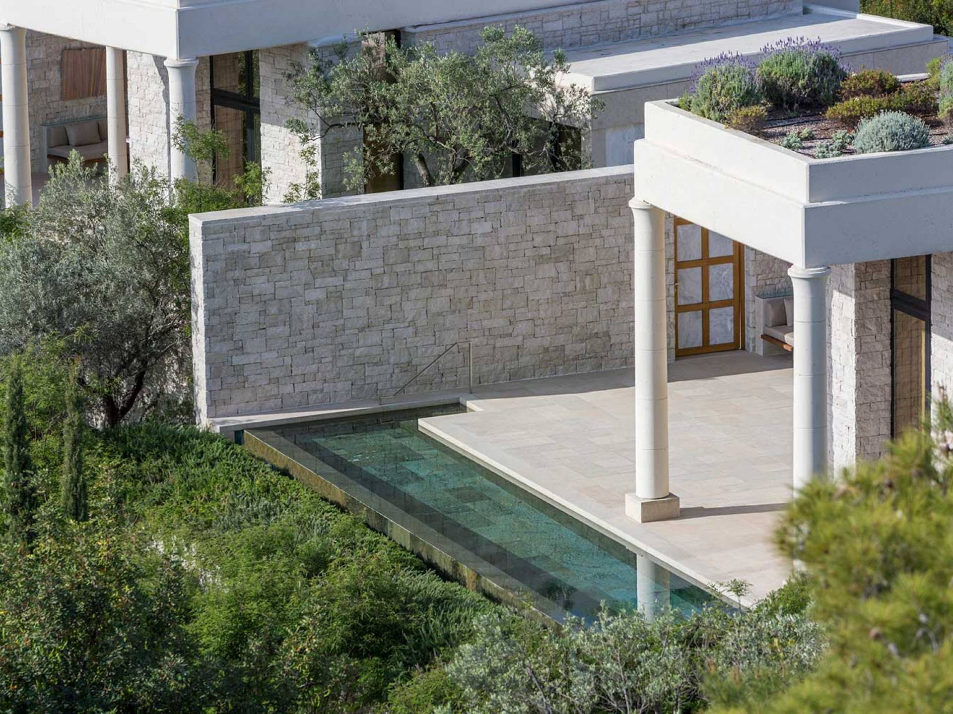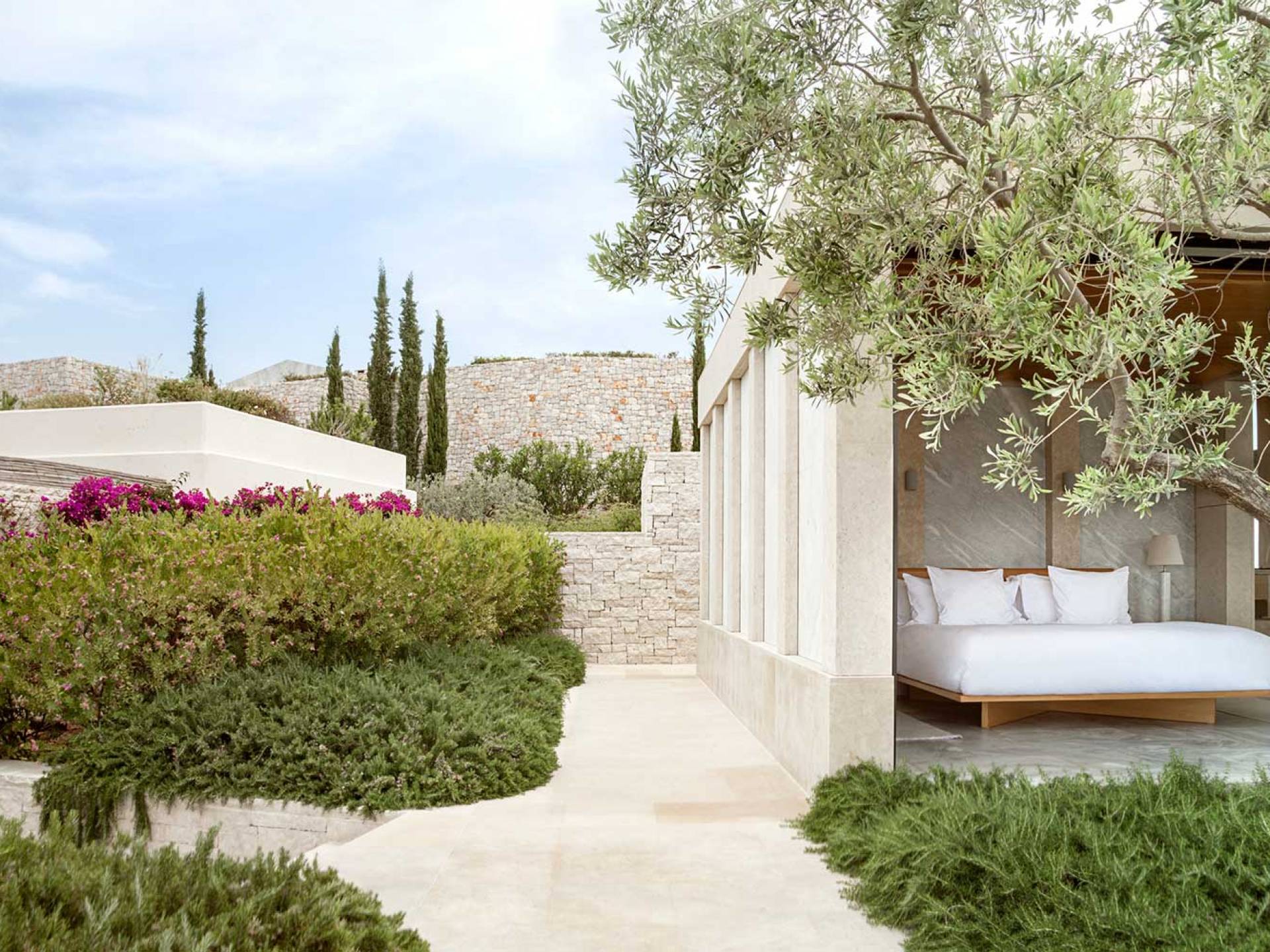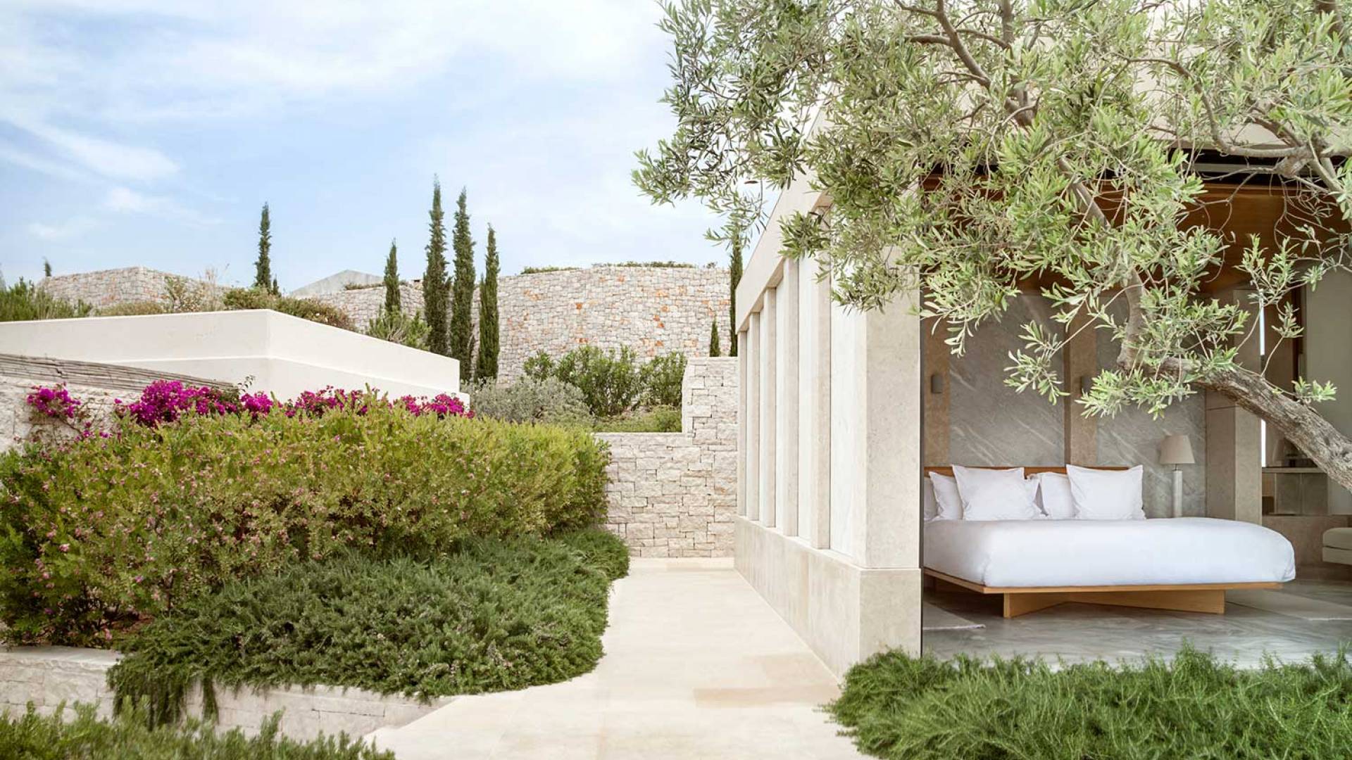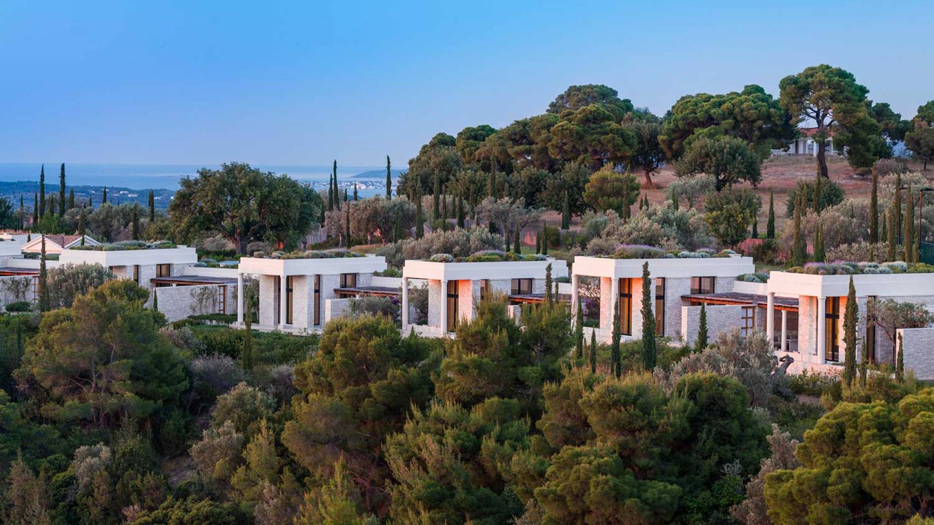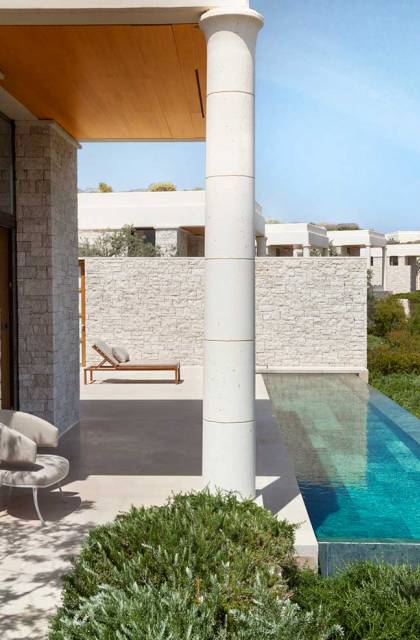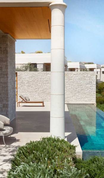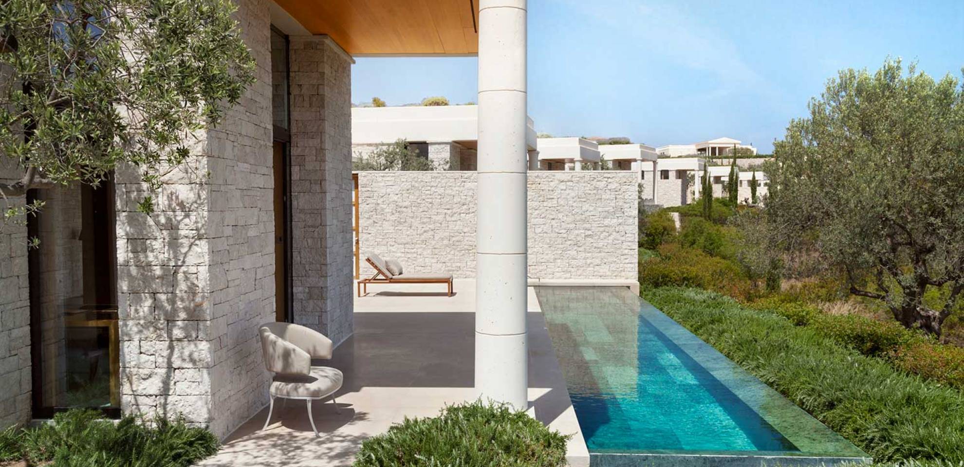 Inspirándose en la arquitectura griega clásica, con líneas fuertes y una estética minimalista, los pabellones de lujo independientes de Amanzoe se abren a terrazas con piscinas de inmersión privadas y vistas de la tierra y el mar circundantes. Se accede a cada pabellón a través de un patio con paredes de piedra, que conduce a una sala de estar de techos altos y una cama tamaño king colocada en una alcoba de mármol con vistas a la vista de Porto Heli.