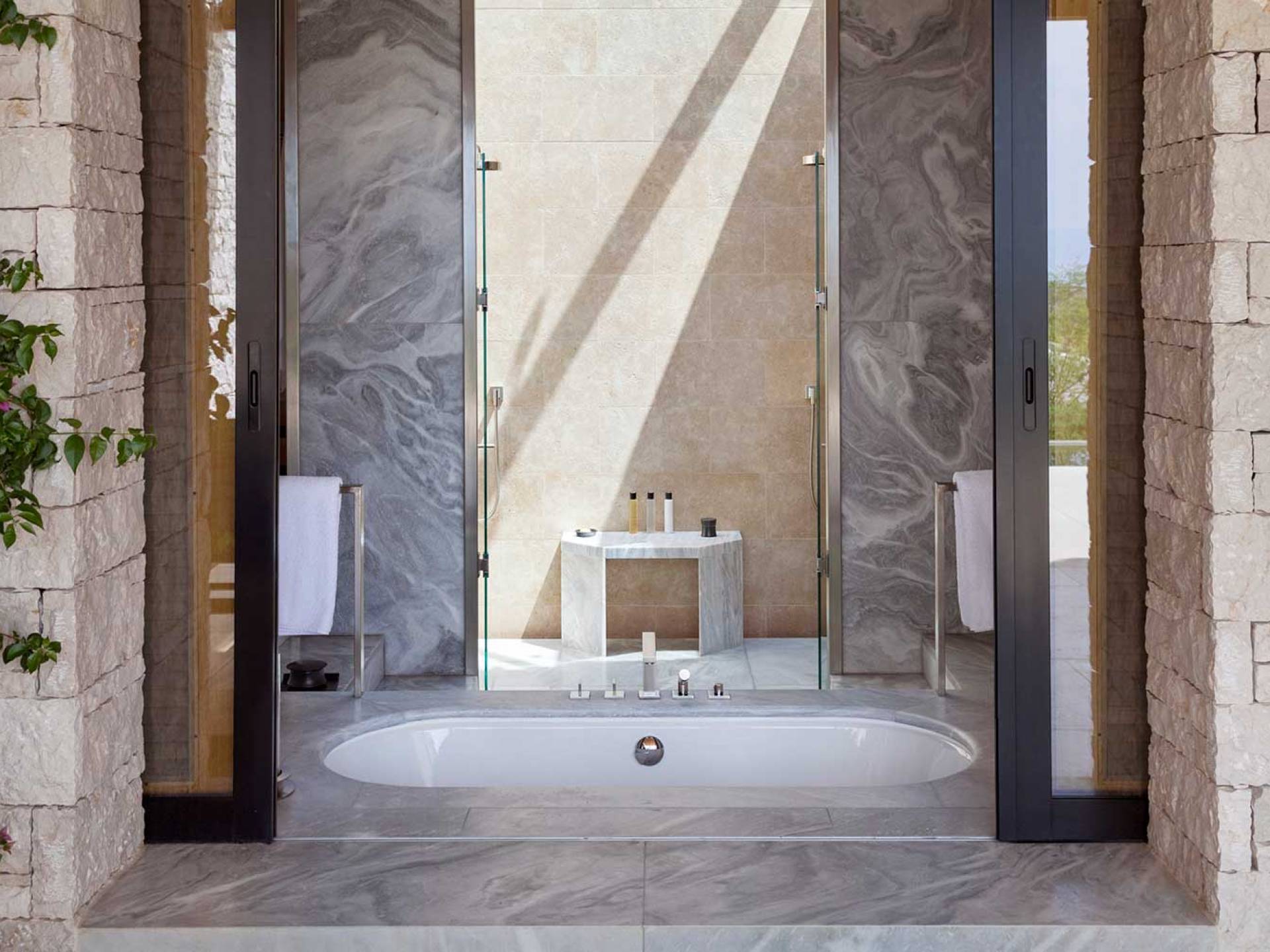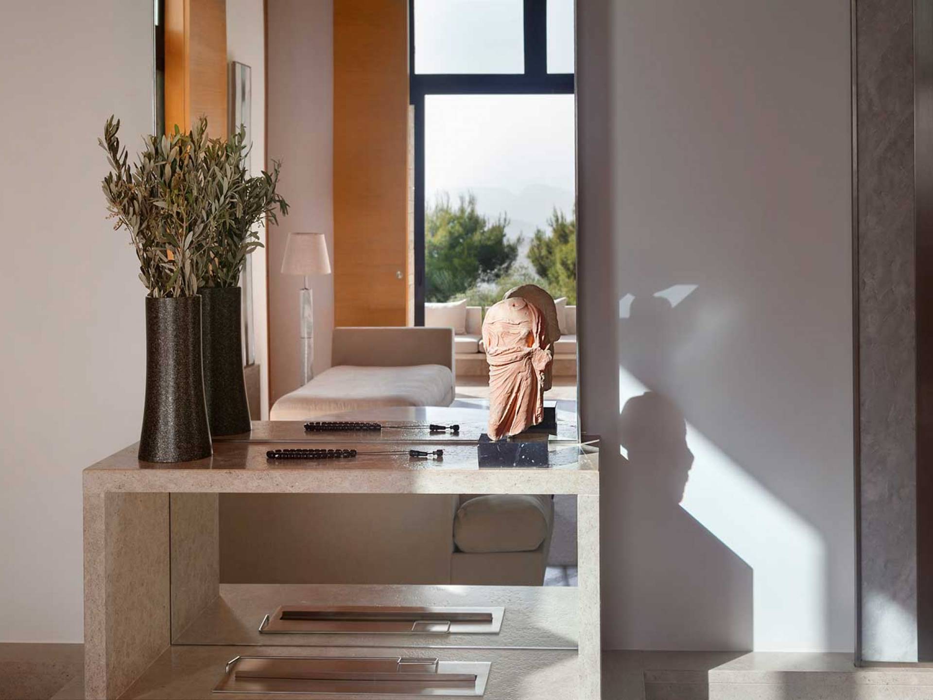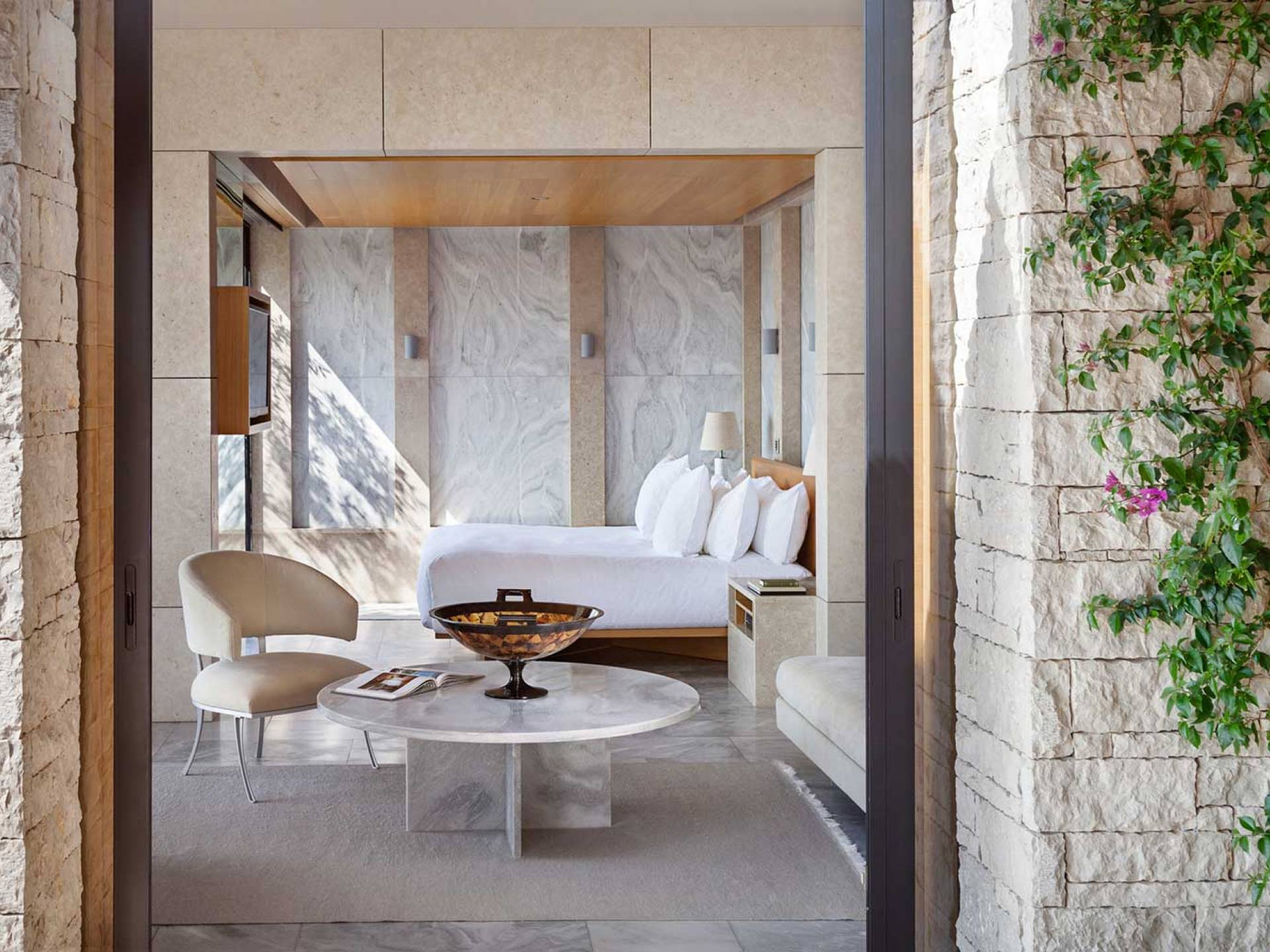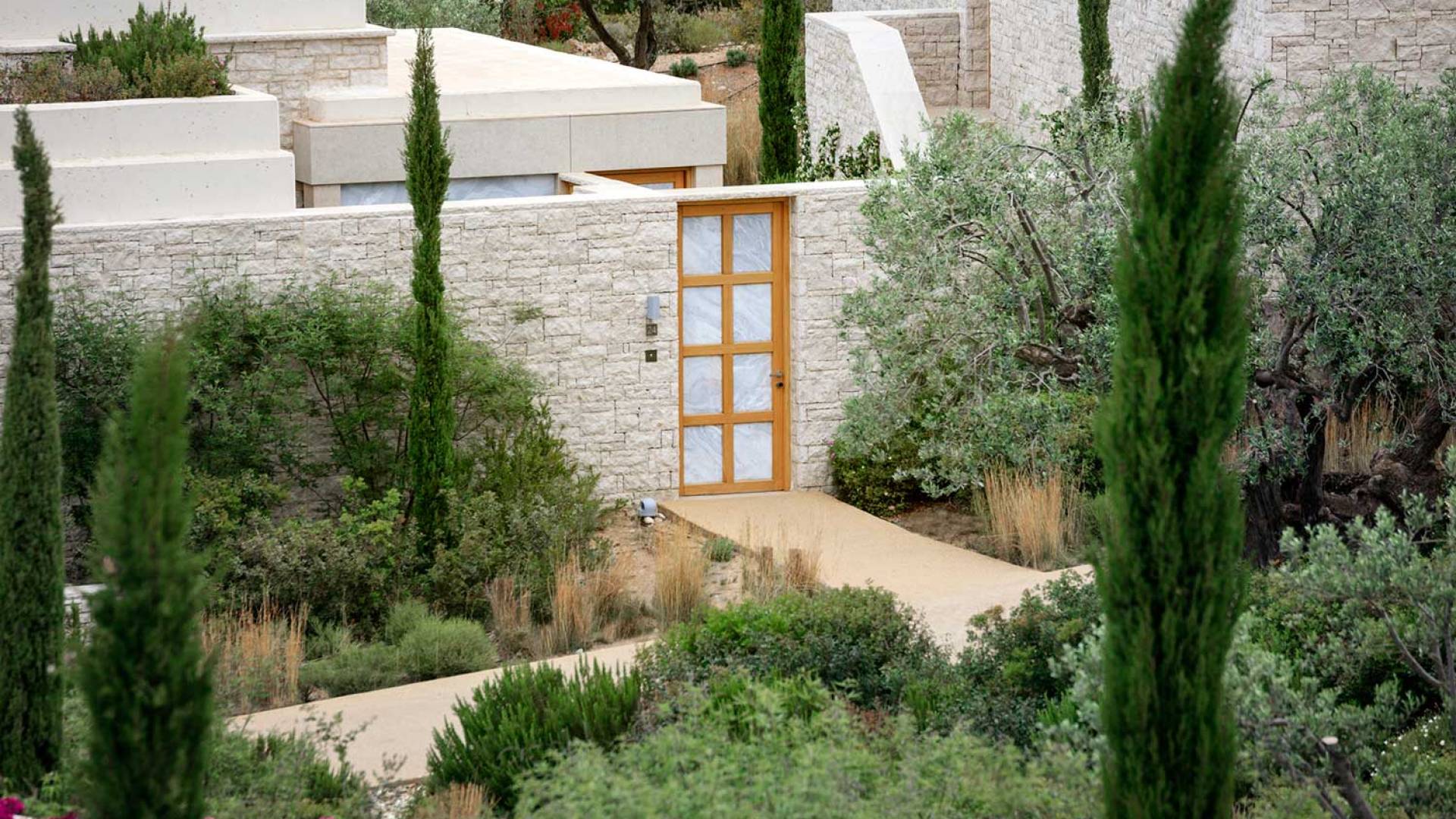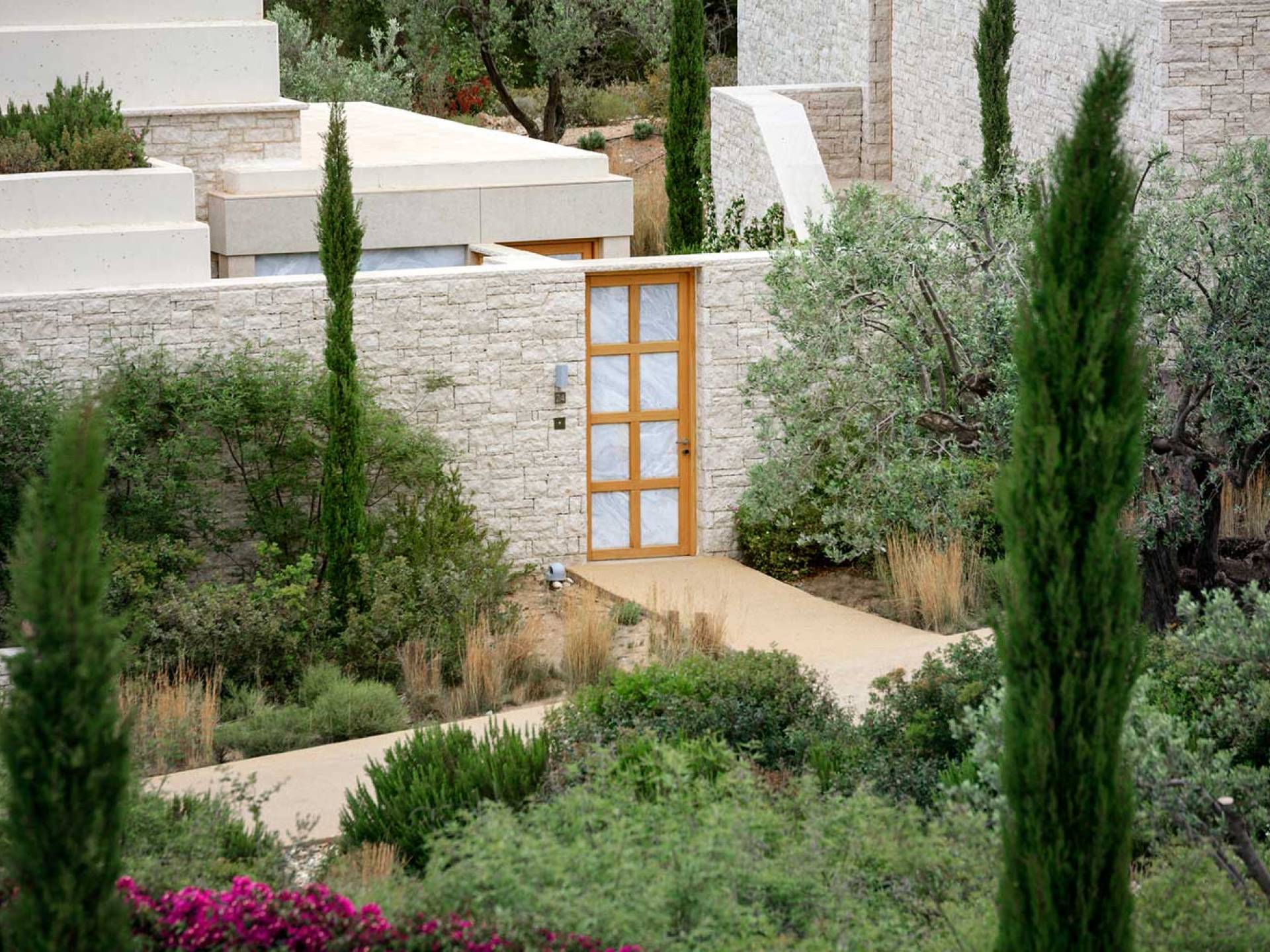 Inspirándose en la arquitectura griega clásica, con líneas fuertes y una estética minimalista, los pabellones de lujo independientes de Amanzoe se abren a terrazas con piscinas de inmersión privadas y vistas de la tierra y el mar circundantes. Se accede a cada pabellón a través de un patio con paredes de piedra, que conduce a una sala de estar de techos altos y una cama tamaño king colocada en una alcoba de mármol con vistas a la vista de Porto Heli.