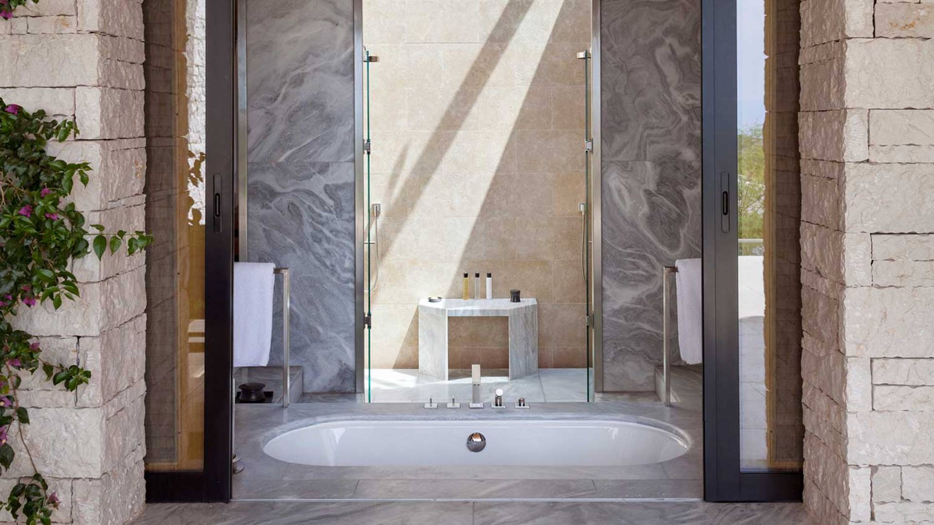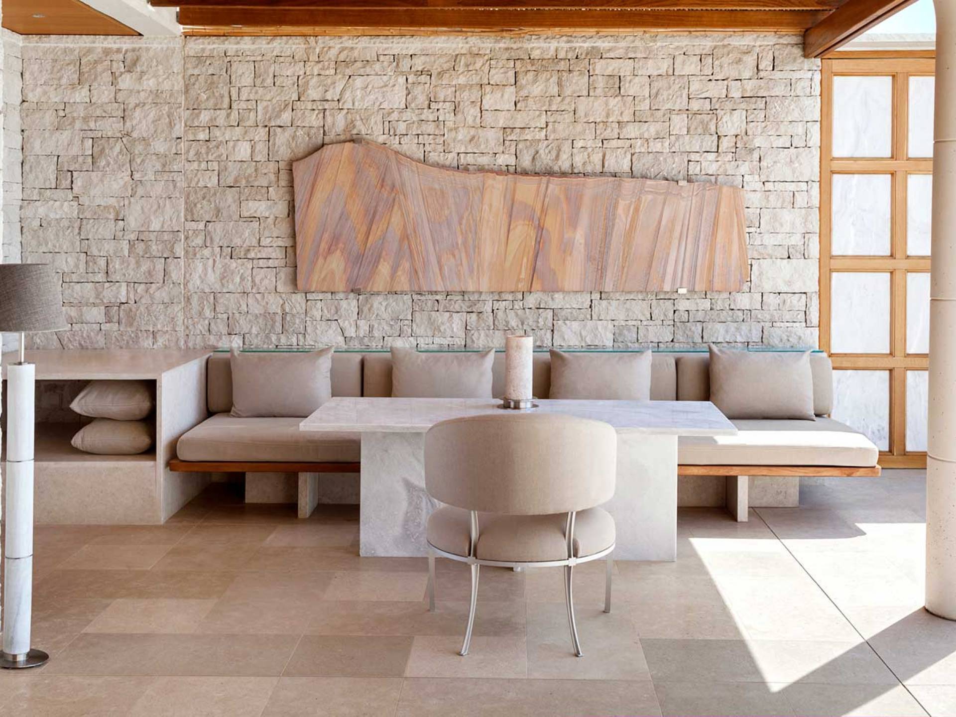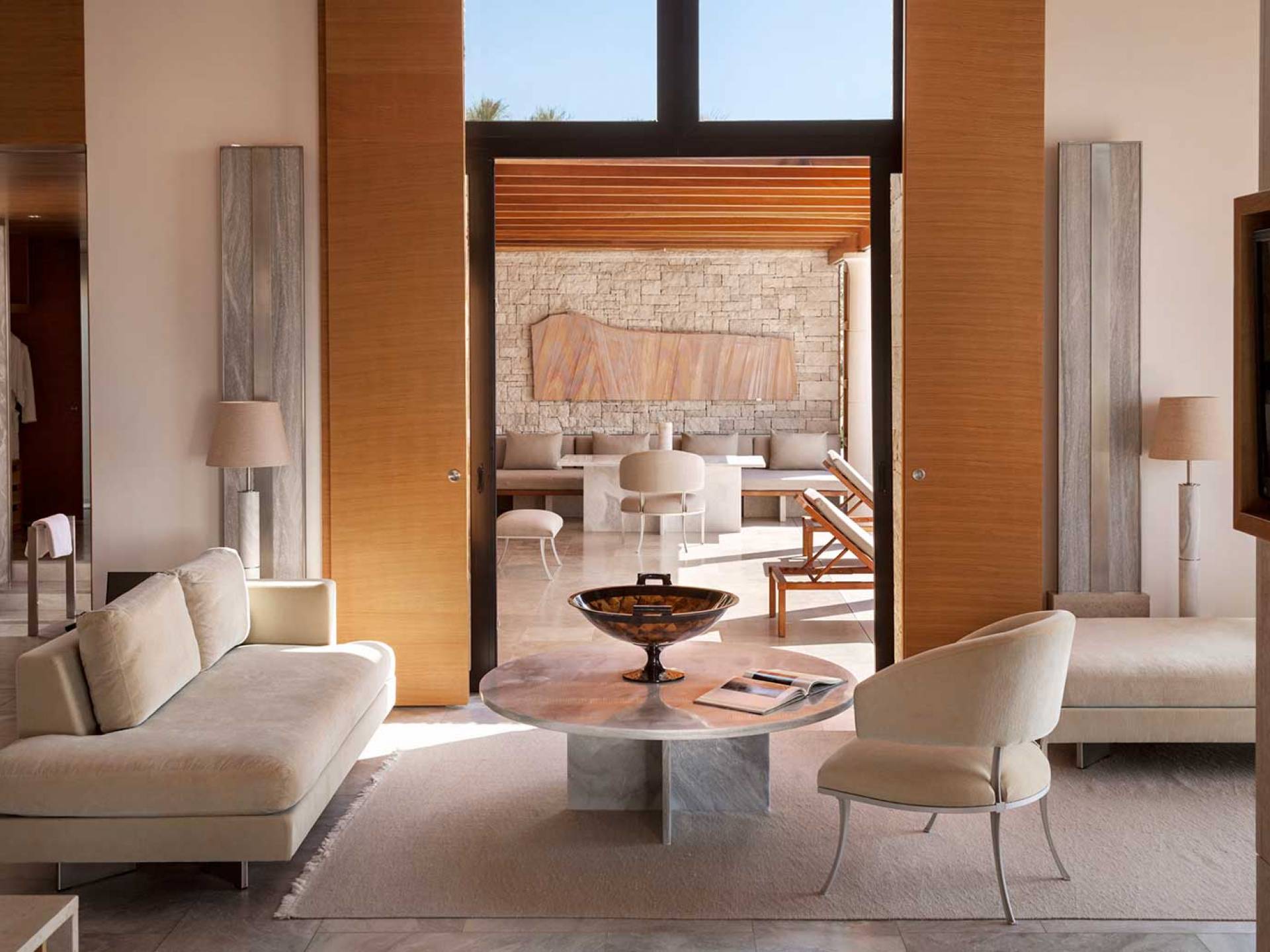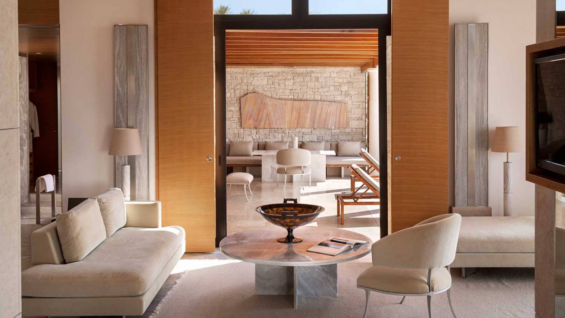 Inspirándose en la arquitectura griega clásica, con líneas fuertes y una estética minimalista, los pabellones de lujo independientes de Amanzoe se abren a terrazas con piscinas de inmersión privadas y vistas de la tierra y el mar circundantes. Se accede a cada pabellón a través de un patio con paredes de piedra, que conduce a una sala de estar de techos altos y una cama tamaño king colocada en una alcoba de mármol con vistas a la vista de Porto Heli.