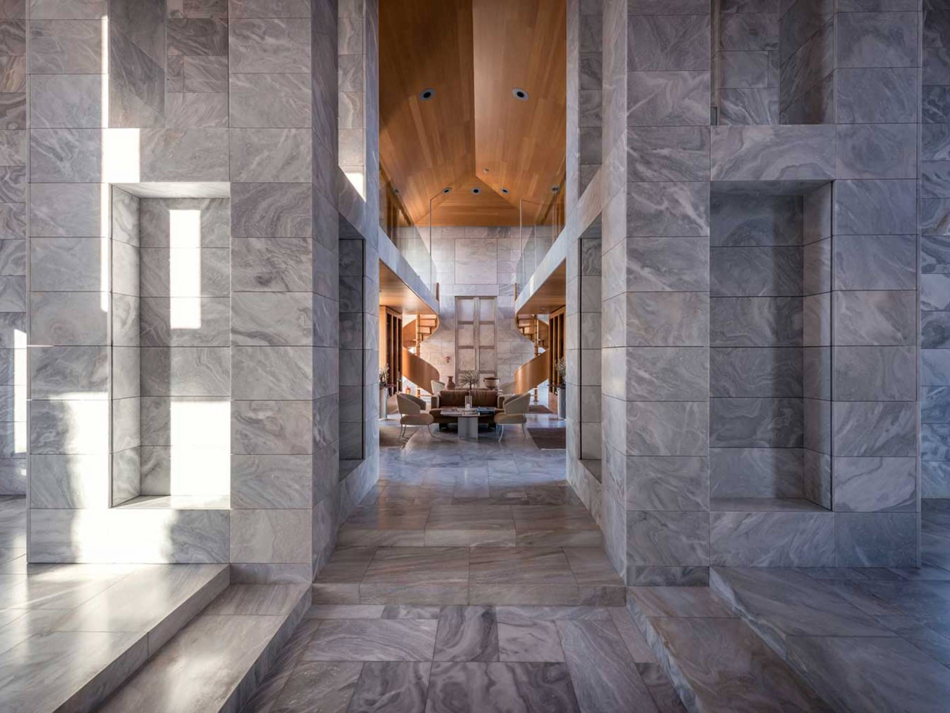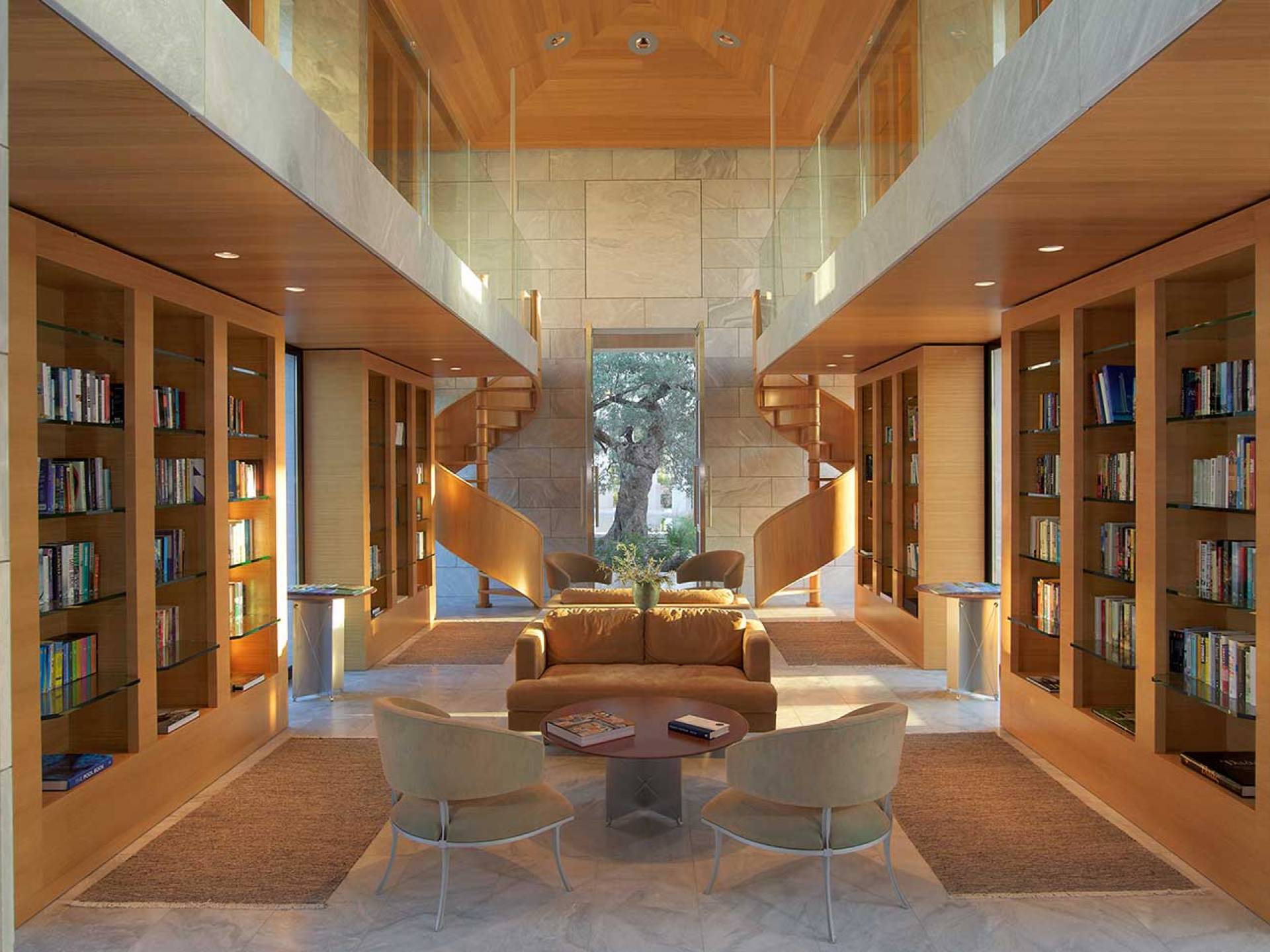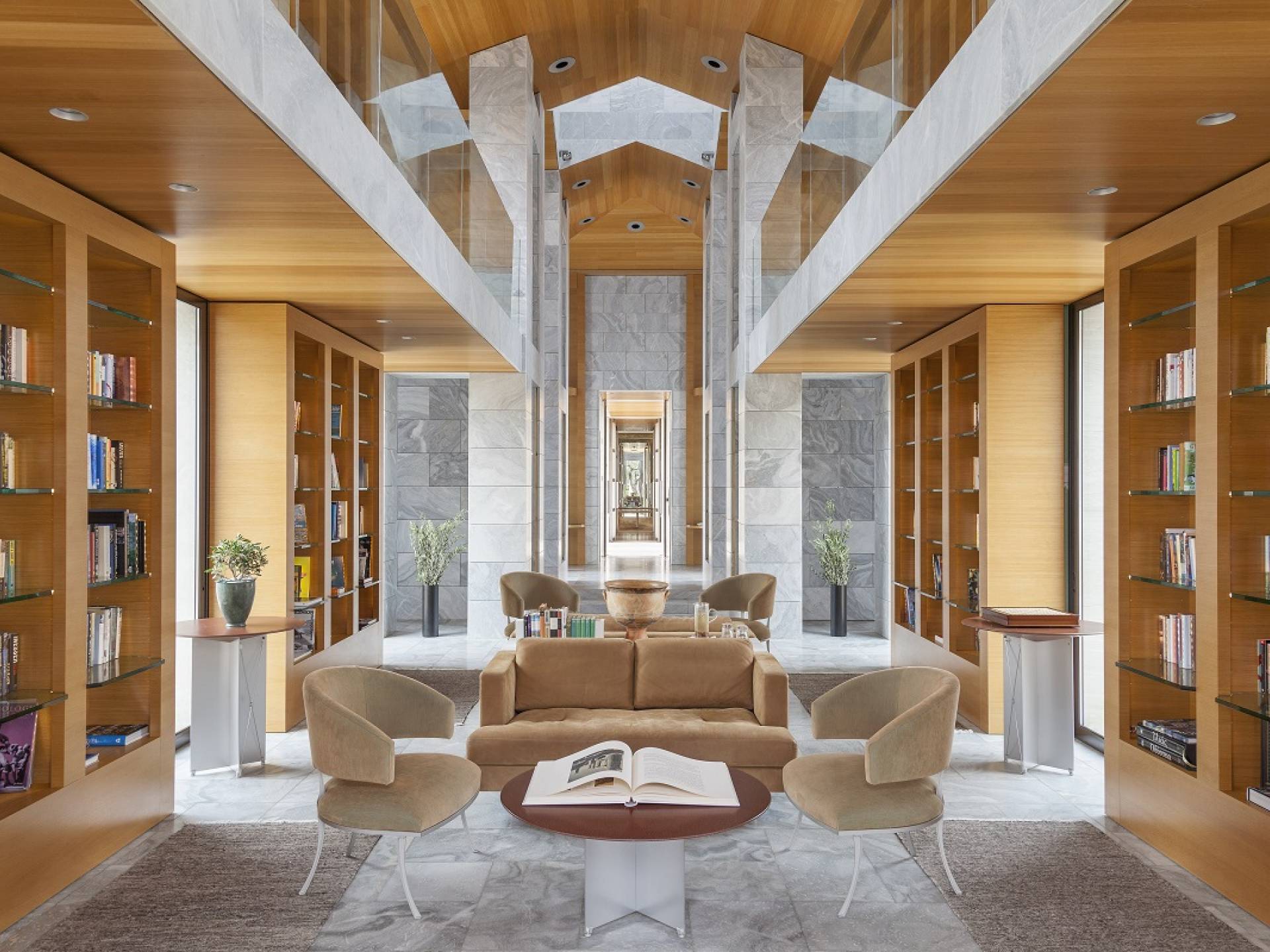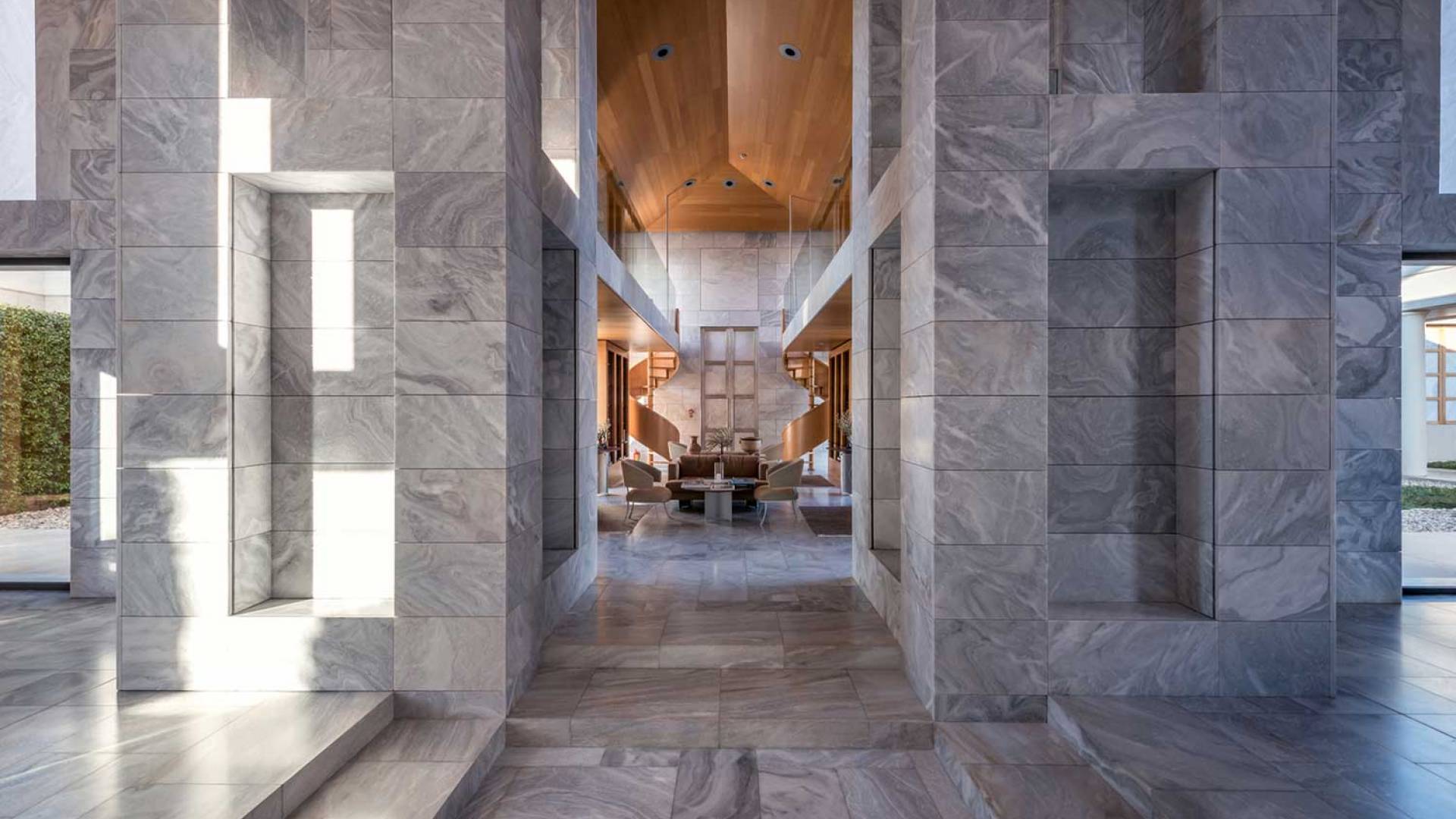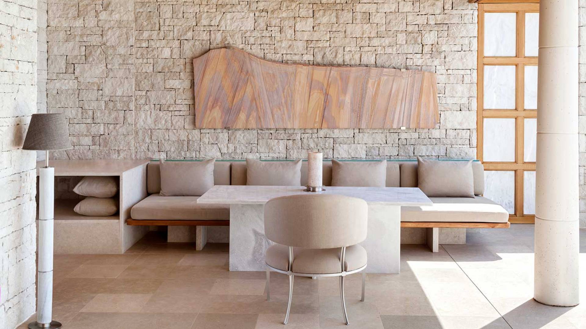 Inspirándose en la arquitectura griega clásica, con líneas fuertes y una estética minimalista, los pabellones de lujo independientes de Amanzoe se abren a terrazas con piscinas de inmersión privadas y vistas de la tierra y el mar circundantes. Se accede a cada pabellón a través de un patio con paredes de piedra, que conduce a una sala de estar de techos altos y una cama tamaño king colocada en una alcoba de mármol con vistas a la vista de Porto Heli.