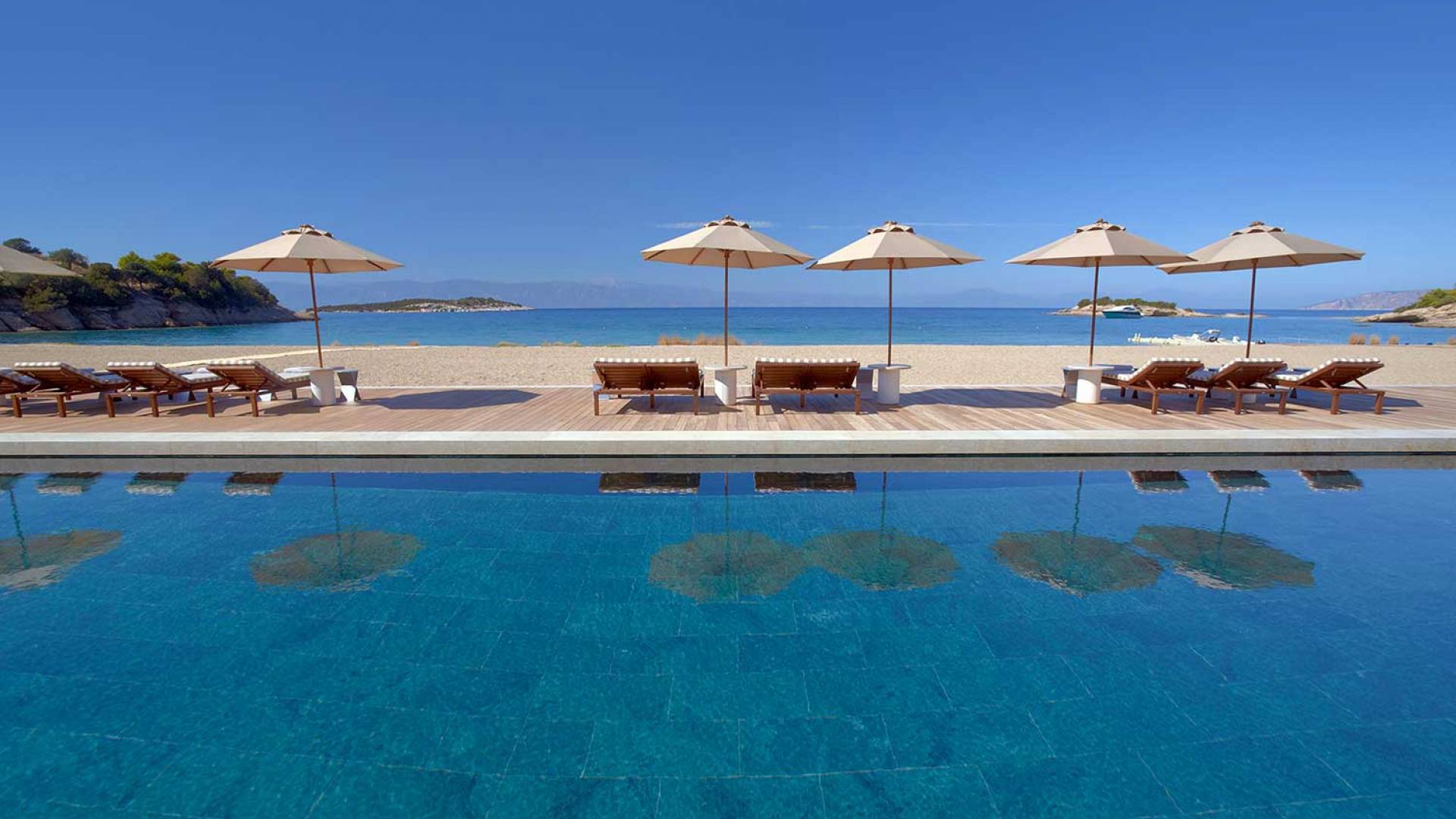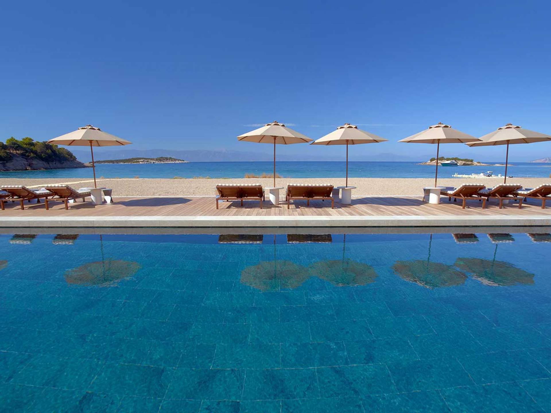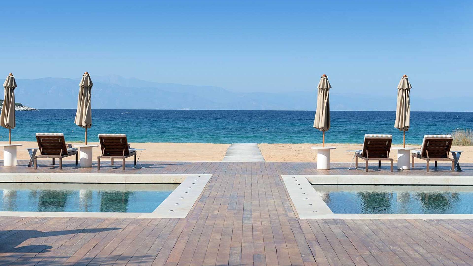 La playa privada y el club de playa se encuentran debajo de Amanzoe en una bahía protegida. Los traslados de cortesía llevan a los huéspedes al mar Egeo, donde se pueden practicar deportes acuáticos no motorizados. El sereno club de playa alberga cuatro piscinas y cabañas para pasar la noche, así como un restaurante informal y un spa de dos habitaciones.