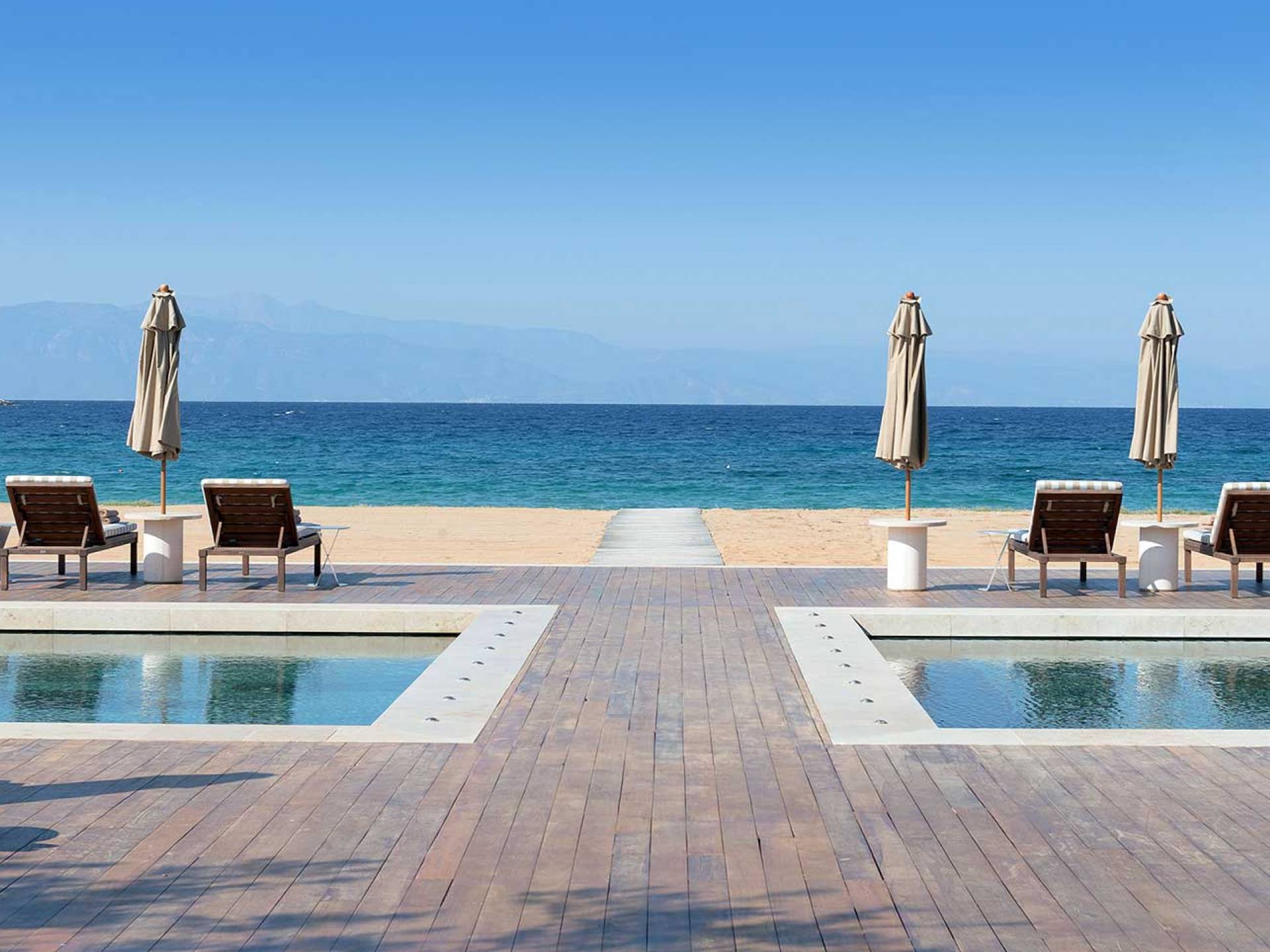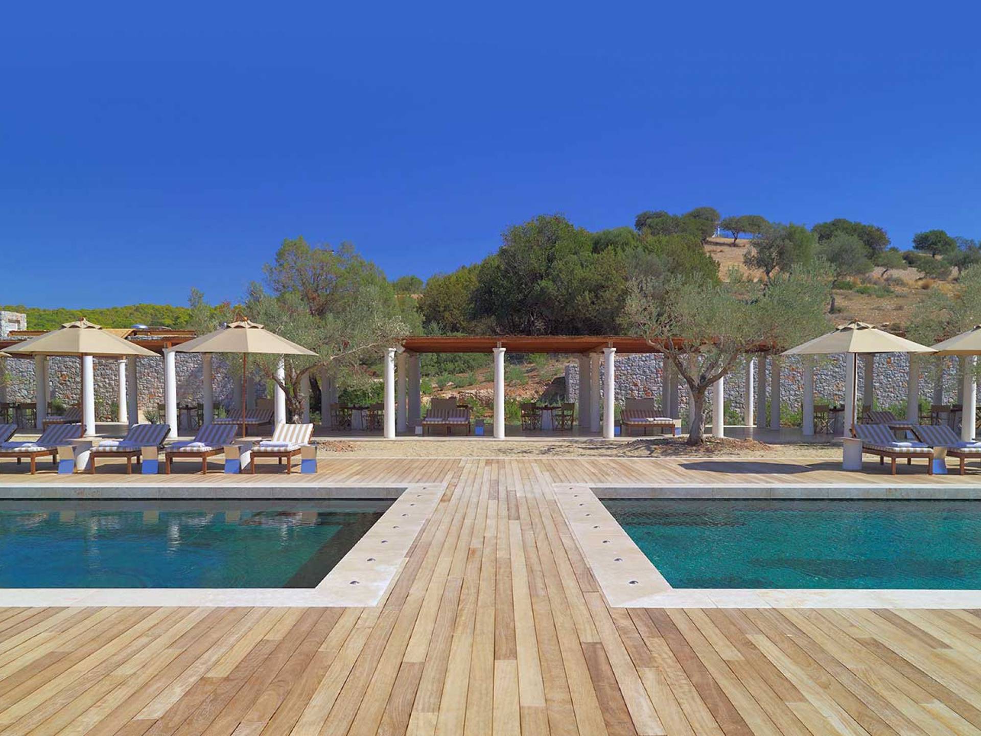 Cada pabellón de piscina Deluxe independiente de 210 m2 (2, 260 pies cuadrados) cuenta con techos altos y habitaciones espaciosas, que se abren a la terraza, una piscina de 12 metros (39 pies) y magníficas vistas del mar Egeo o campo circundante.