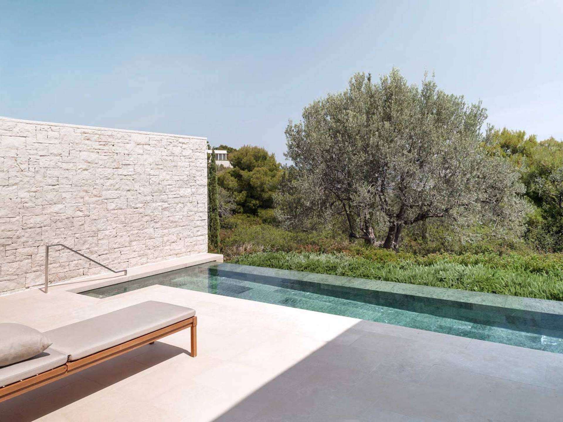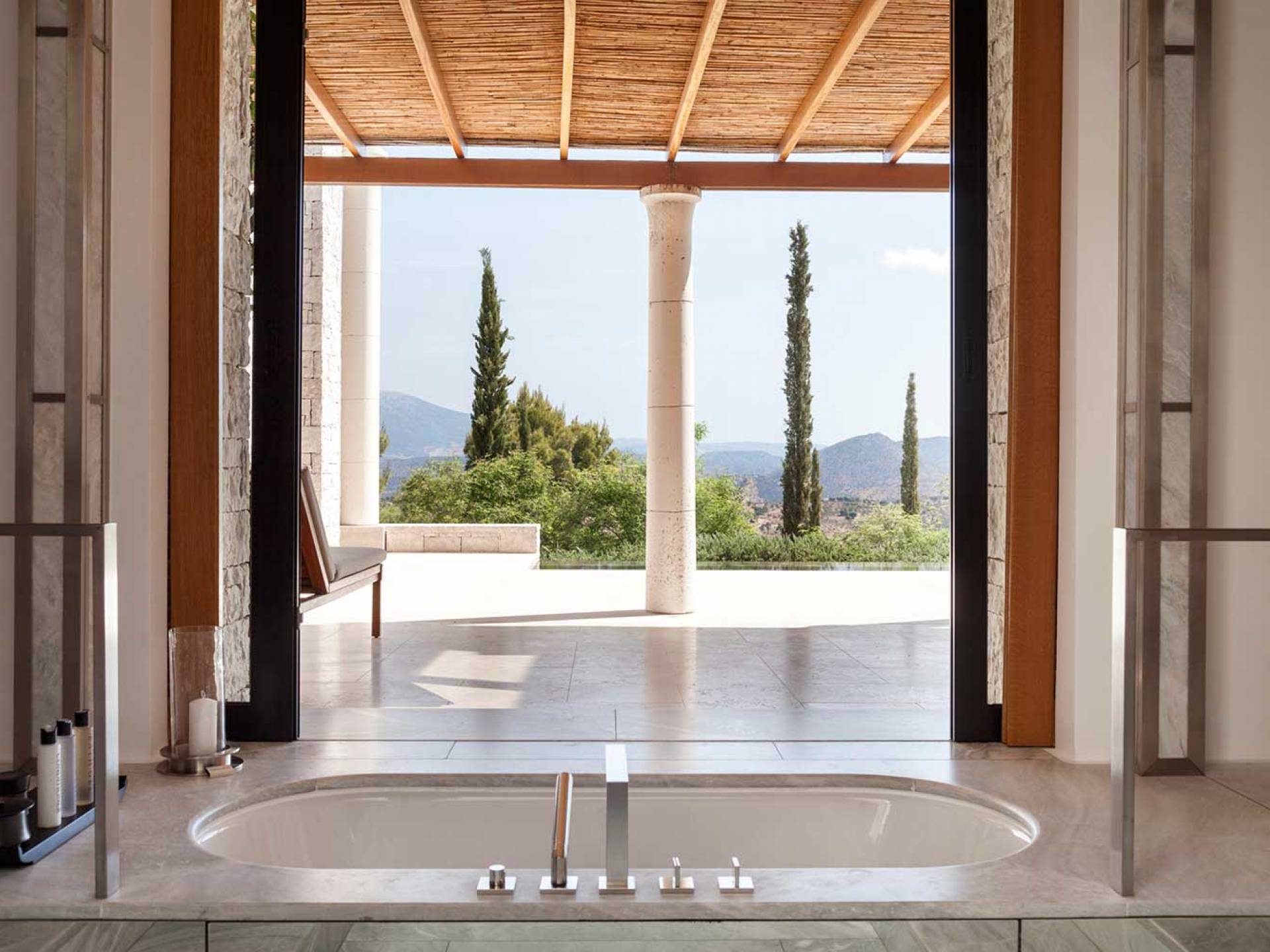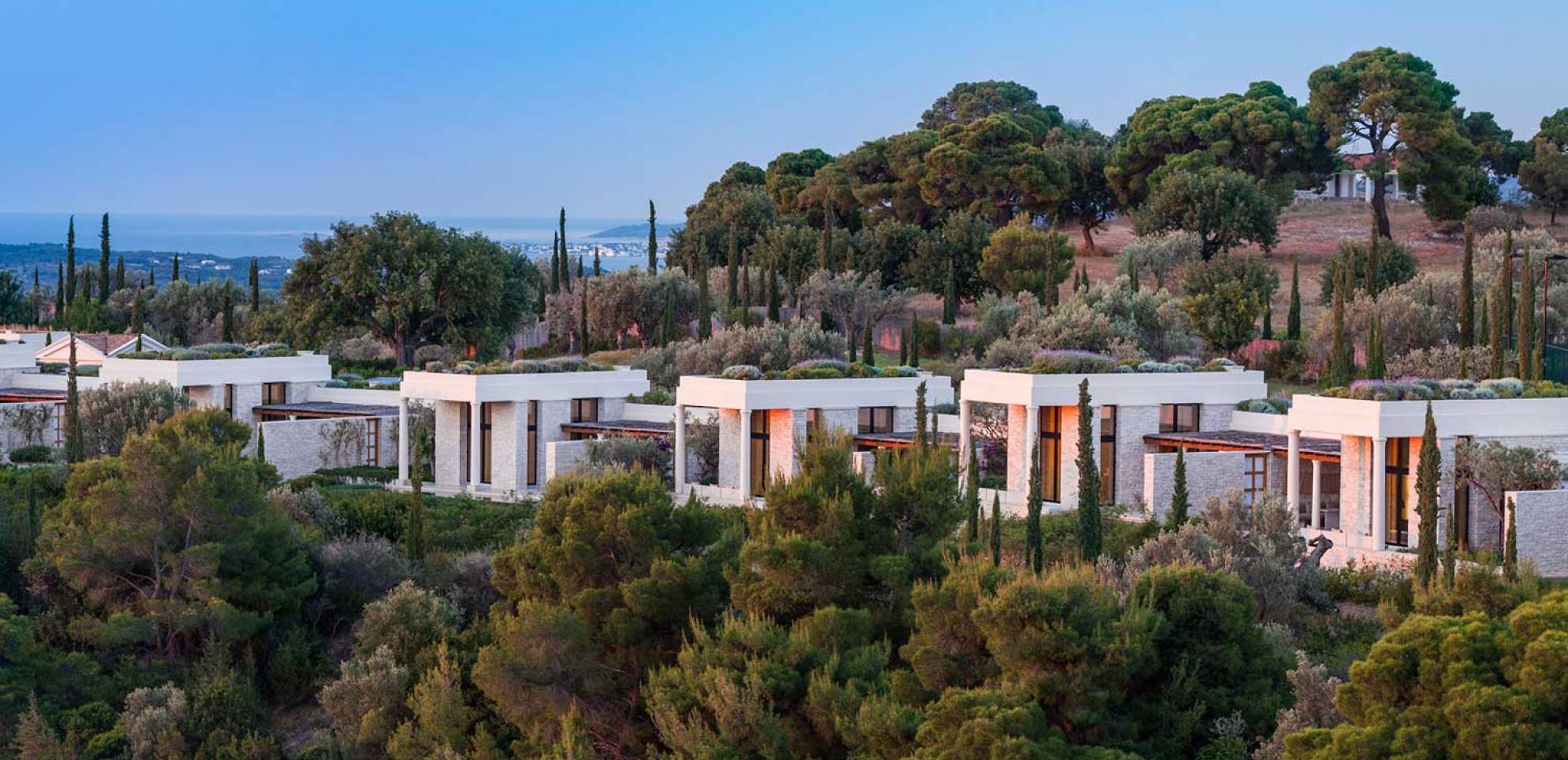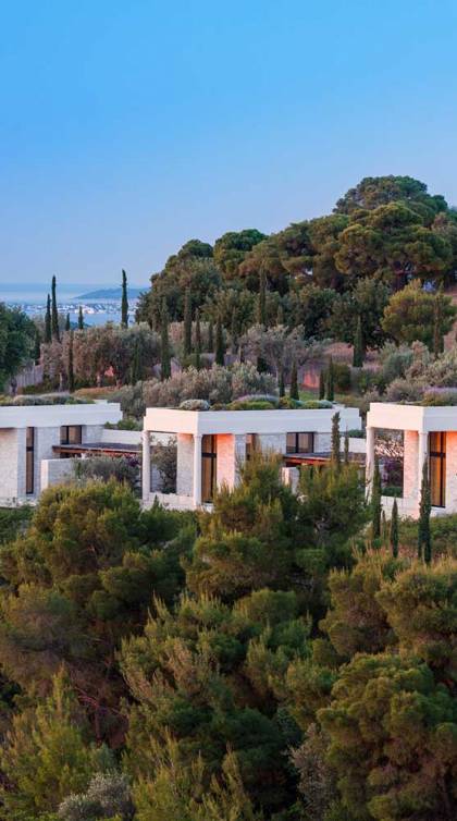 Inspirándose en la arquitectura griega clásica, con líneas fuertes y una estética minimalista, los pabellones de lujo independientes de Amanzoe se abren a terrazas con piscinas de inmersión privadas y vistas de la tierra y el mar circundantes. Se accede a cada pabellón a través de un patio con paredes de piedra, que conduce a una sala de estar de techos altos y una cama tamaño king colocada en una alcoba de mármol con vistas a la vista de Porto Heli.
