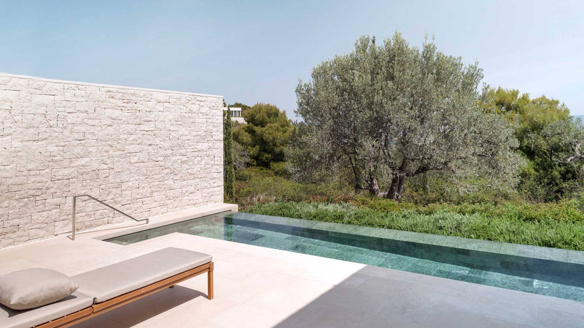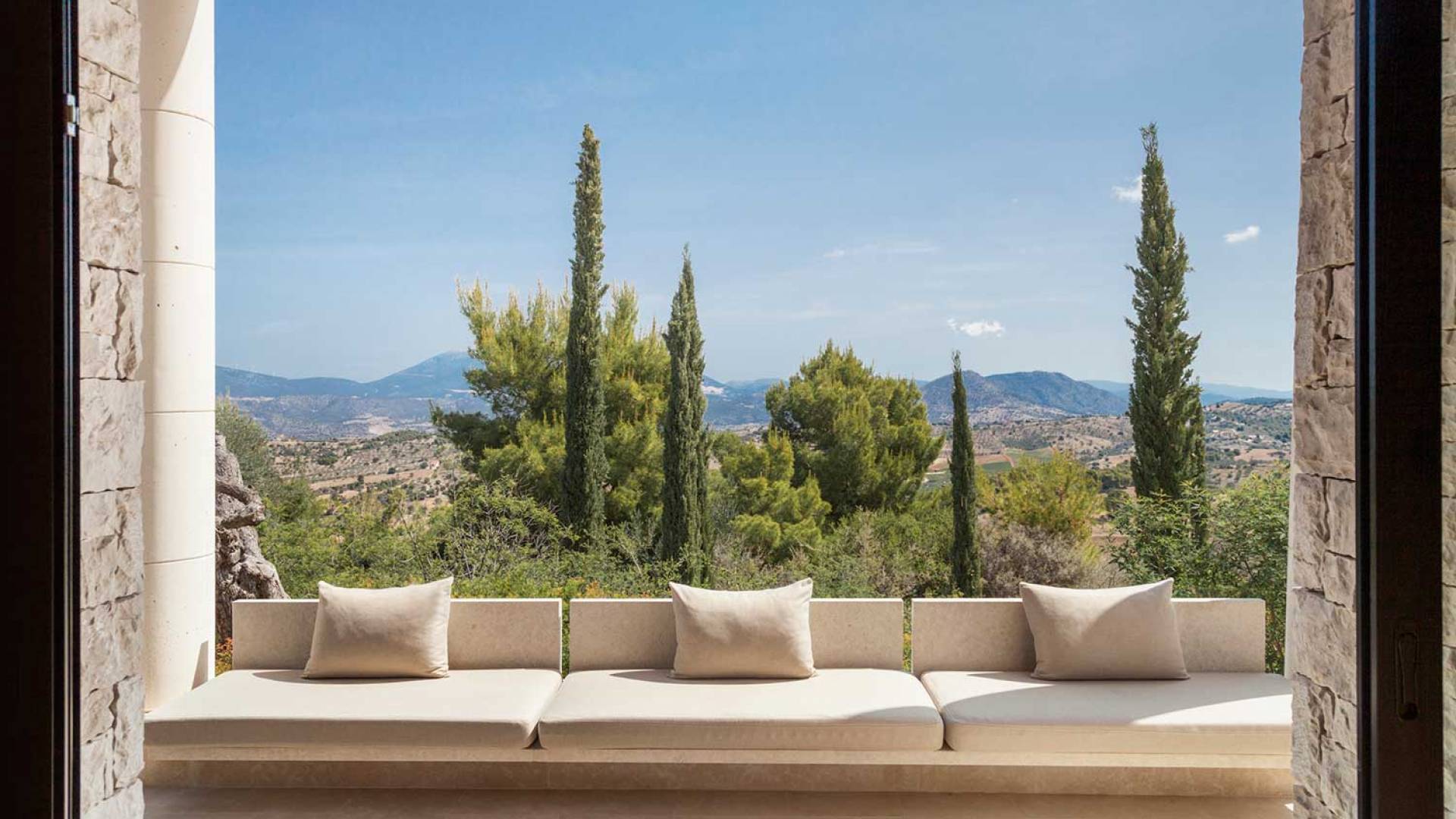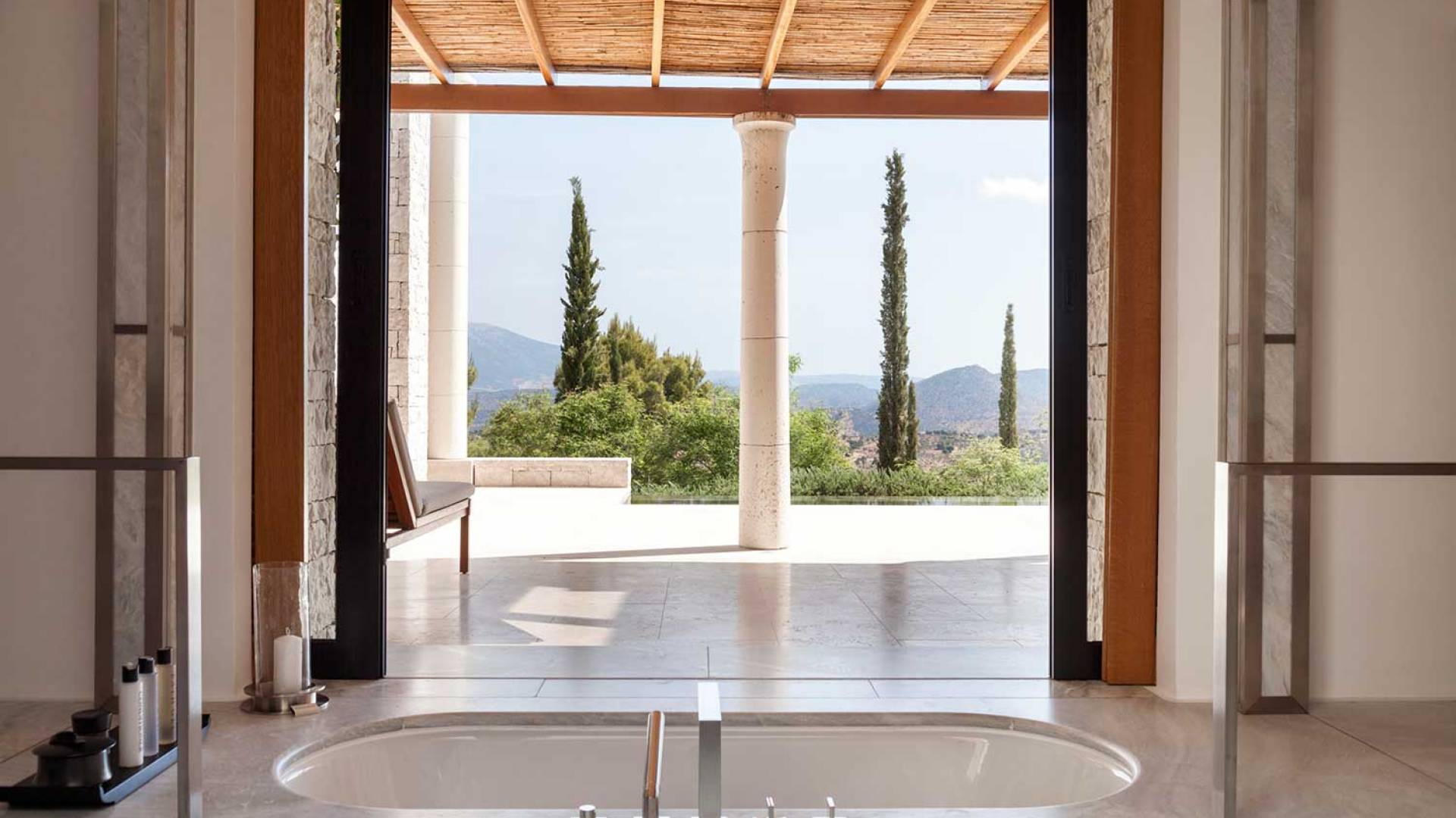 Inspirándose en la arquitectura griega clásica, con líneas fuertes y una estética minimalista, los pabellones de lujo independientes de Amanzoe se abren a terrazas con piscinas de inmersión privadas y vistas de la tierra y el mar circundantes. Se accede a cada pabellón a través de un patio con paredes de piedra, que conduce a una sala de estar de techos altos y una cama tamaño king colocada en una alcoba de mármol con vistas a la vista de Porto Heli.