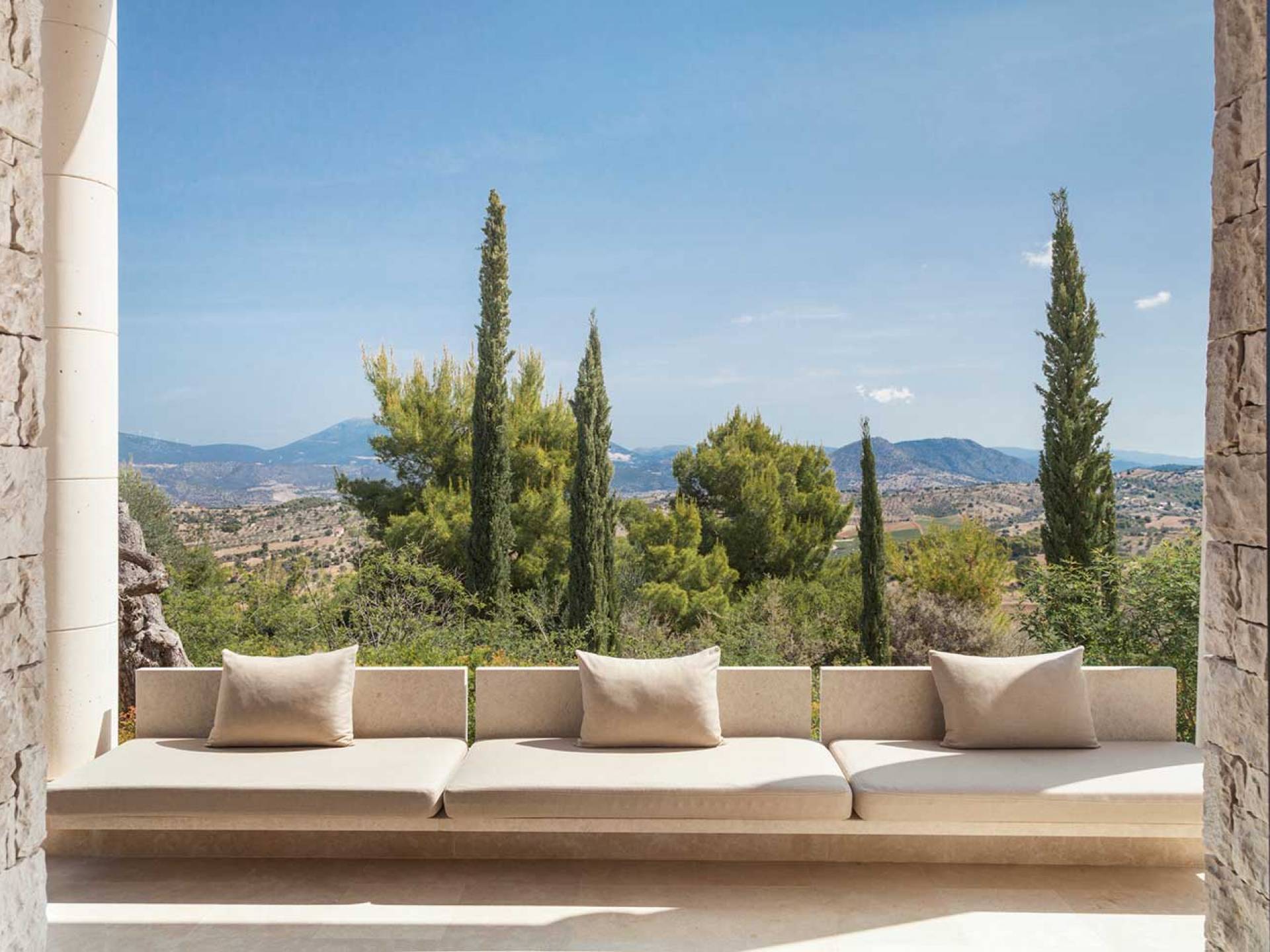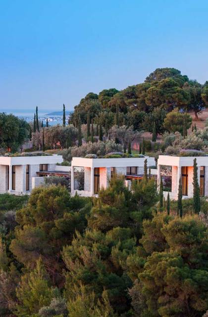 Amanzoe Resort en Porto Heli Grecia, antigua epopeya griega. El vuelo en helicóptero desde Atenas a Amanzoe crea una rápida transición hacia una Grecia completamente más salvaje, un lugar de naturaleza pura, donde el tiempo se detiene. Salpicado de ruinas de la Unesco, el Peloponeso por descubrir ha estado en el corazón de la cultura griega durante milenios, y es allí donde Amanzoe ha establecido su hogar en la cima de una colina, una Acrópolis moderna desde la cual las vistas de 360 grados abarcan olivares, azul del Egeo y poco más. Diseñadas para fusionarse con la tierra, las suites y villas con piscinas desmienten una notable sensación de espacio, abriéndose al fragante jardín o la playa, donde las lanchas rápidas esperan para deslizarse entre calas secretas y las cercanas islas de Spetses e Hydra.