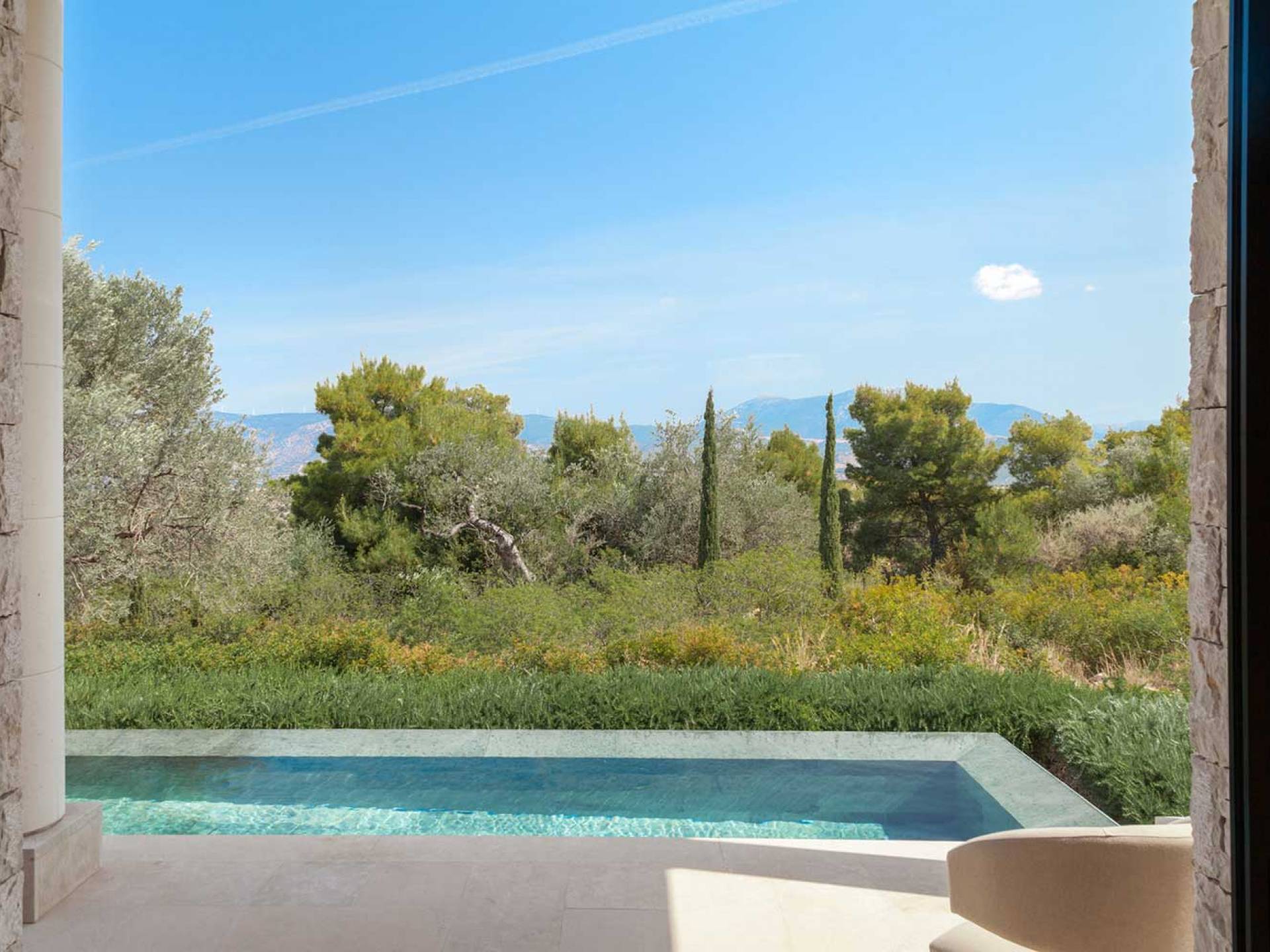 Cada pabellón de piscina de 210 metros cuadrados (2260 pies cuadrados) ofrece una piscina privada de seis metros (19,5 pies) en una amplia terraza. Las vistas son al mar circundante o al campo del Peloponeso.