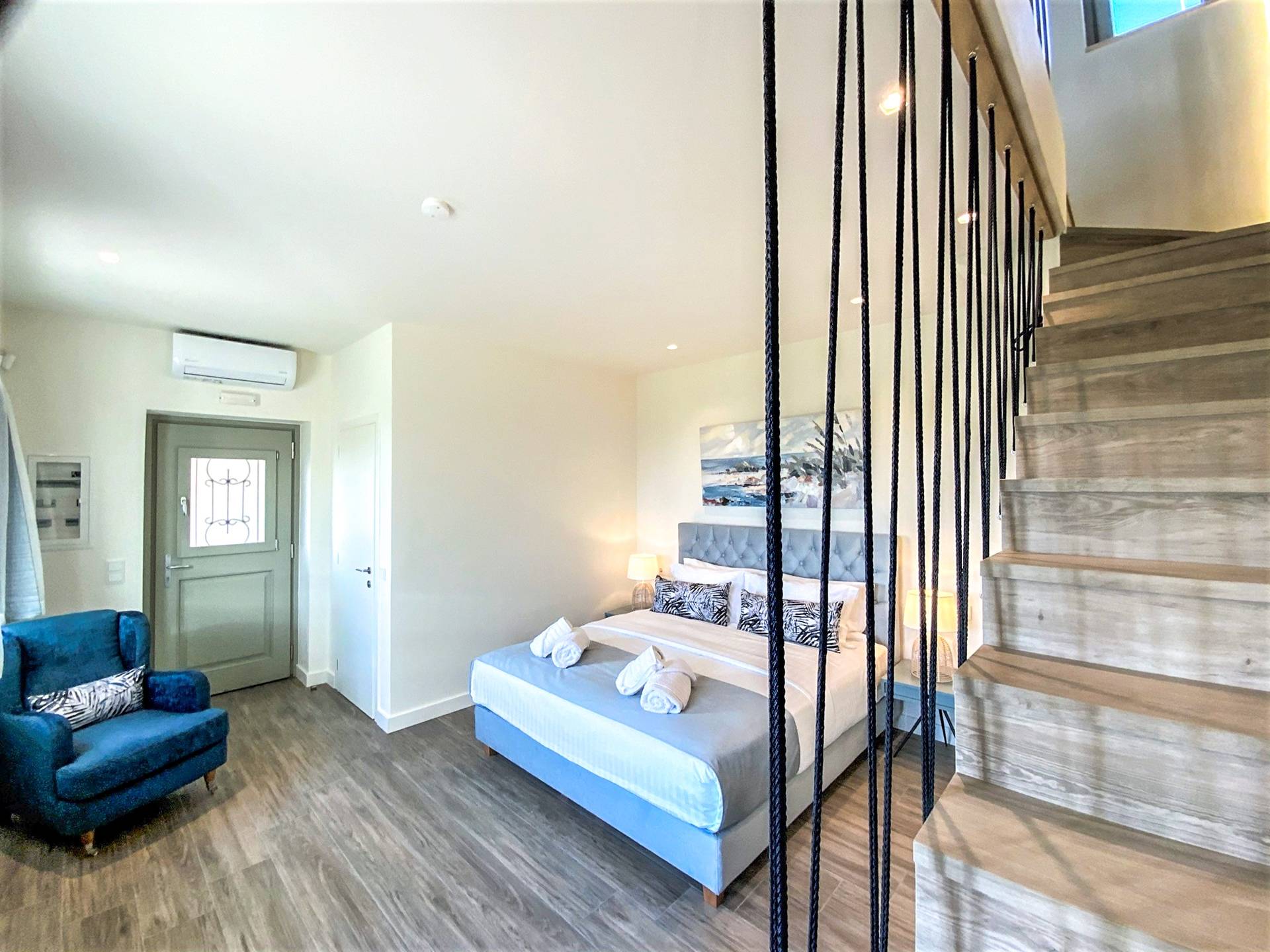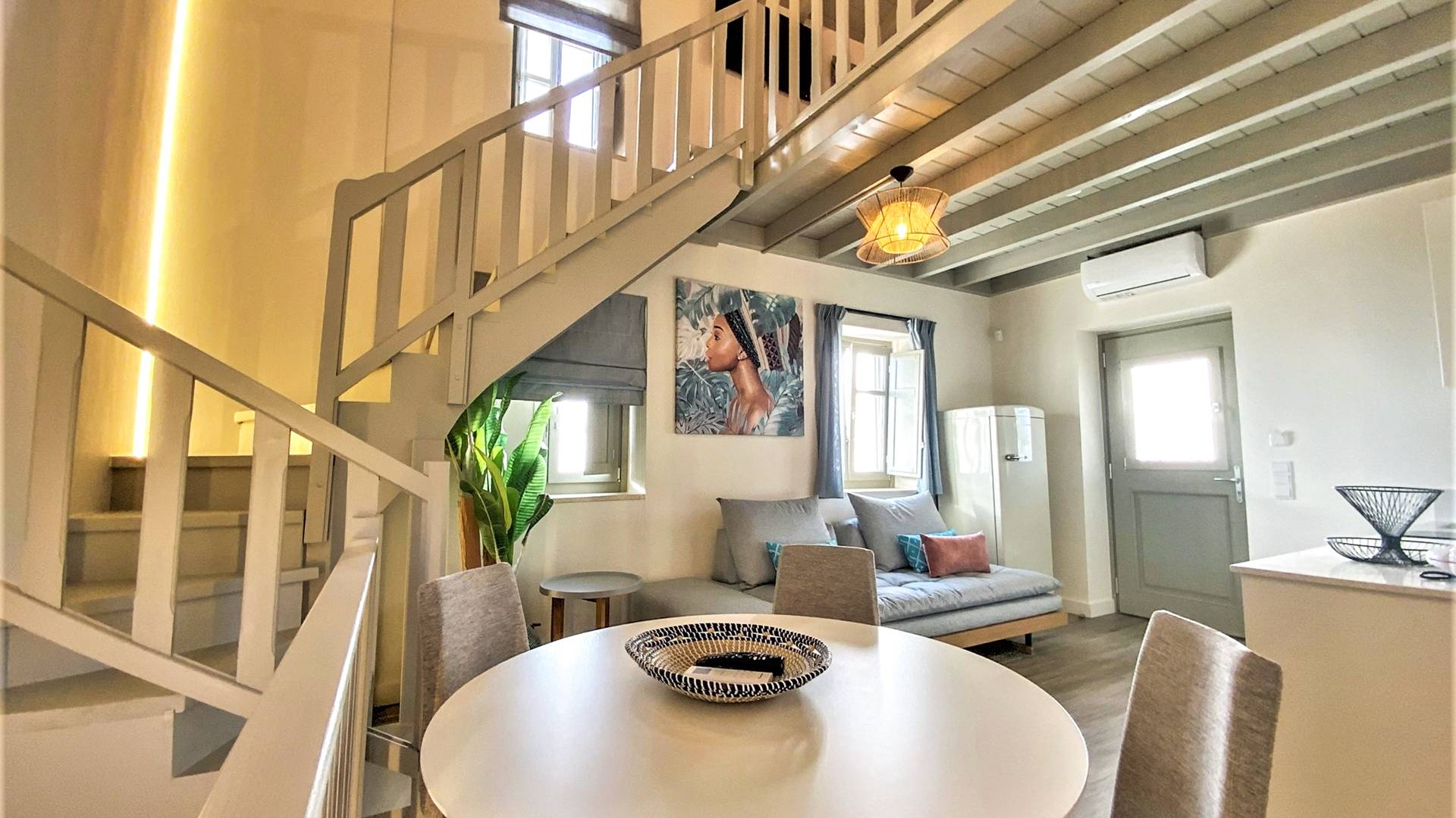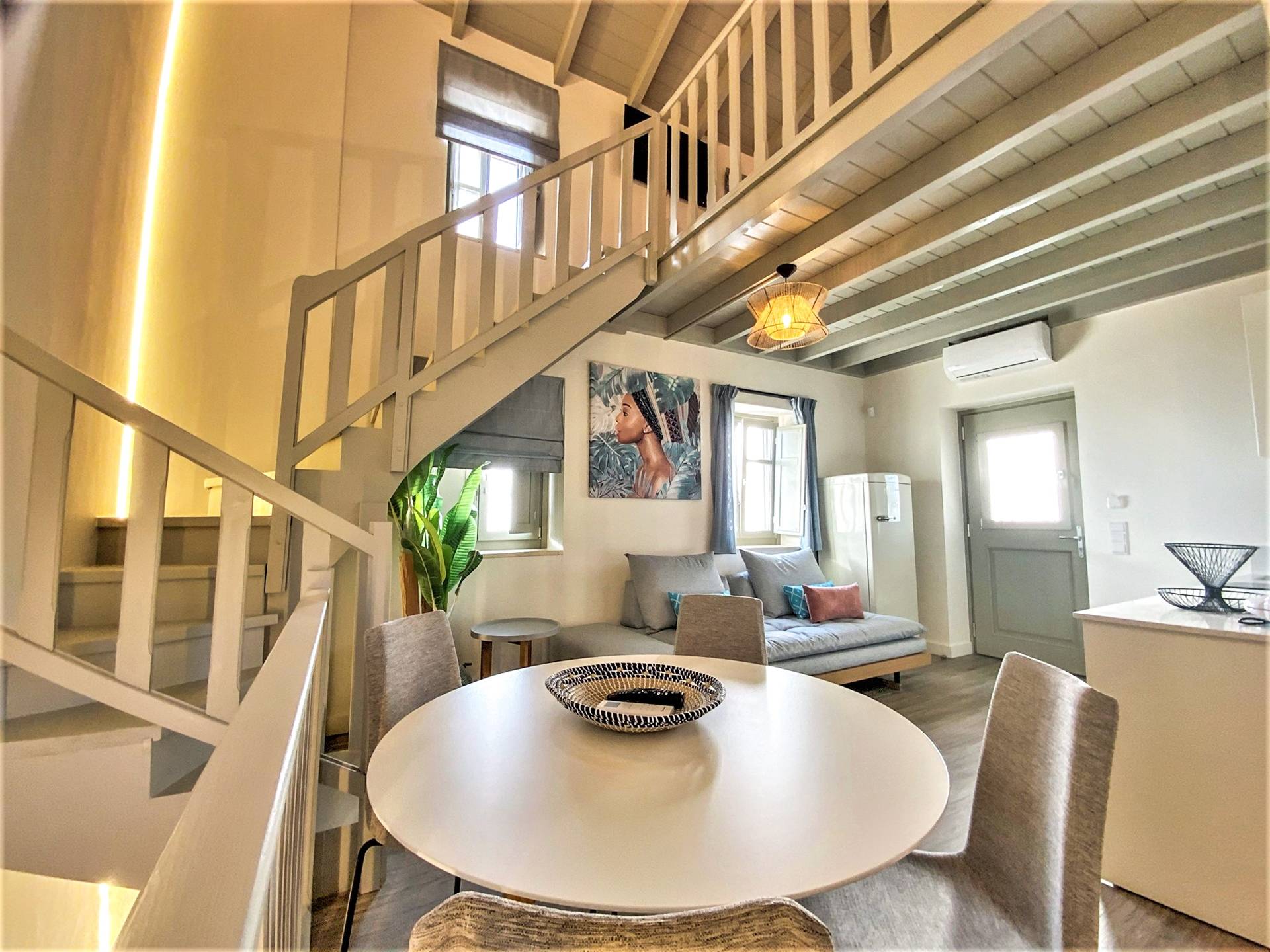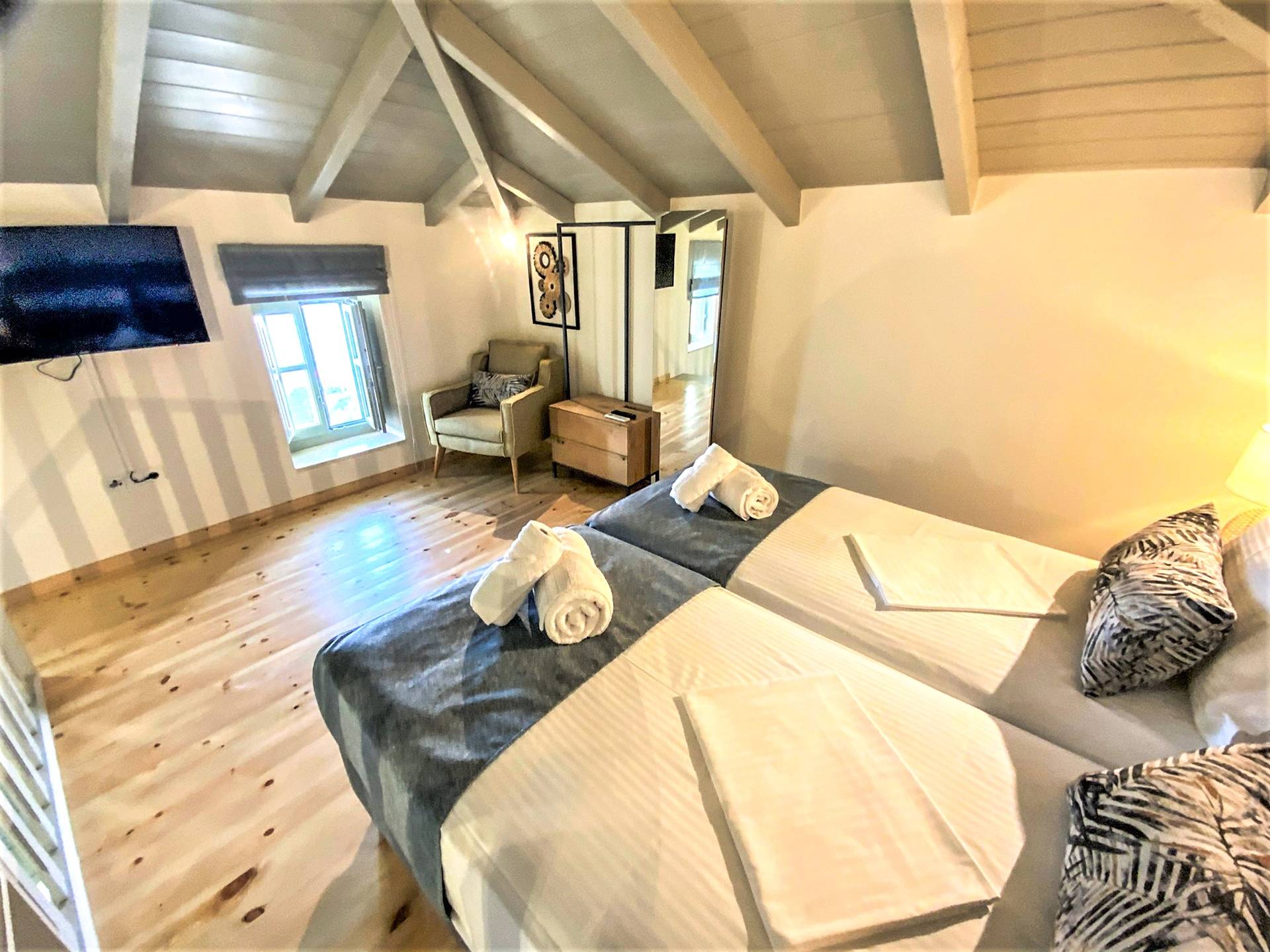 En la planta baja, hay un dormitorio con una cama doble extragrande, un baño y un televisor de 50 pulgadas. En el primer piso hay una amplia sala de estar con una cocina totalmente equipada con minibar incorporado, un segundo baño, TV de 40΄΄, y en el segundo piso (loft) hay un segundo dormitorio con dos camas individuales y una cama de 40 pulgadas. ΄΄ TV