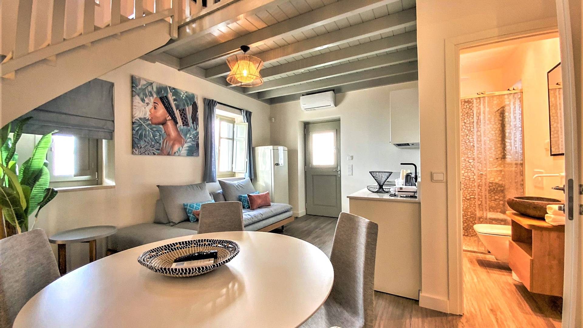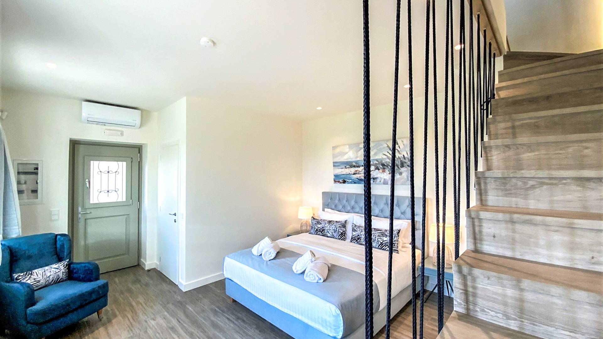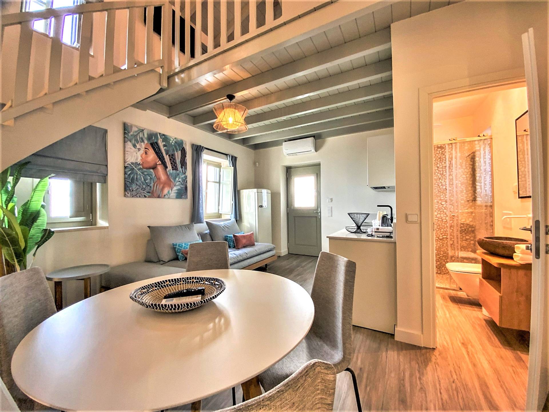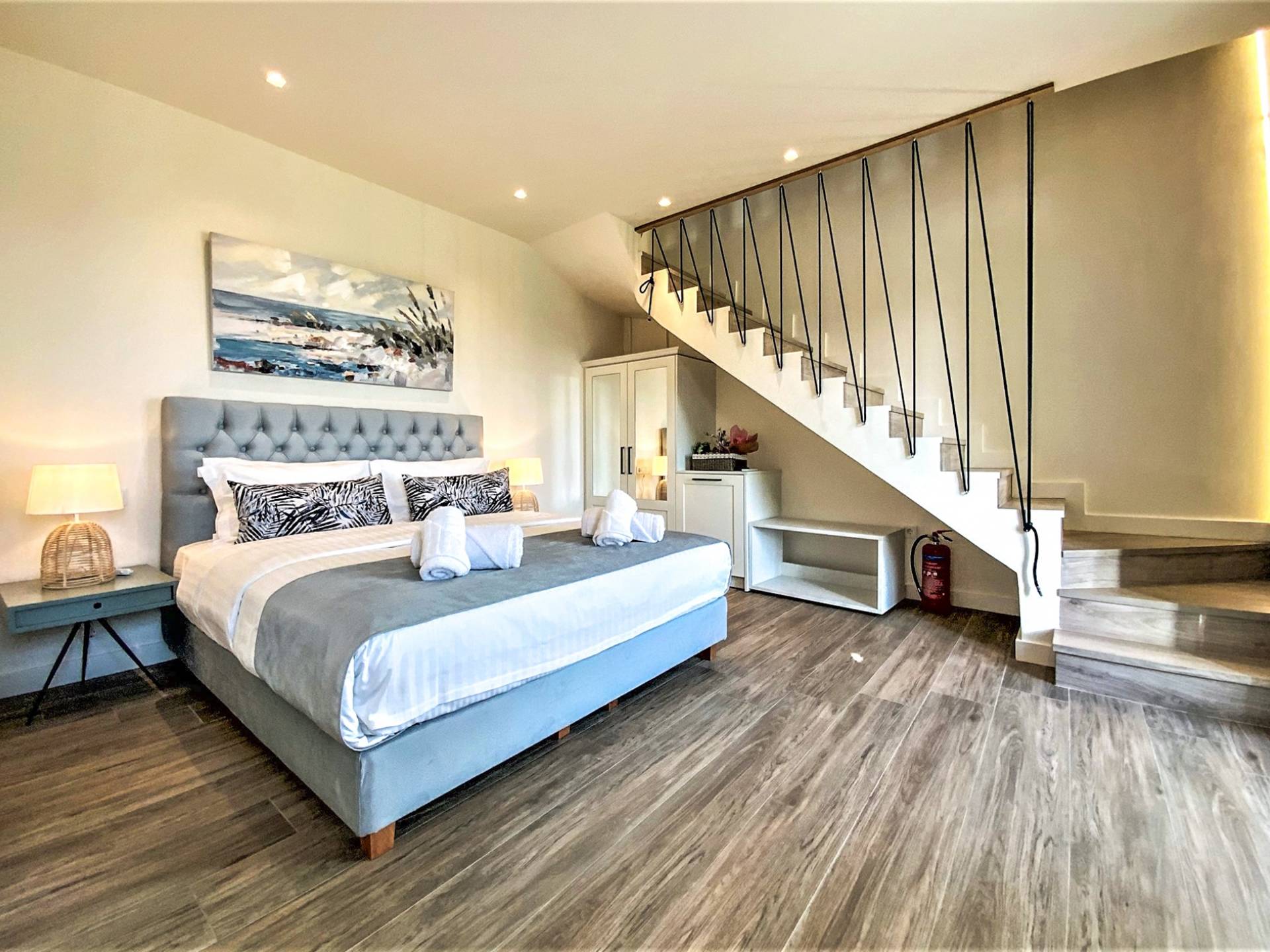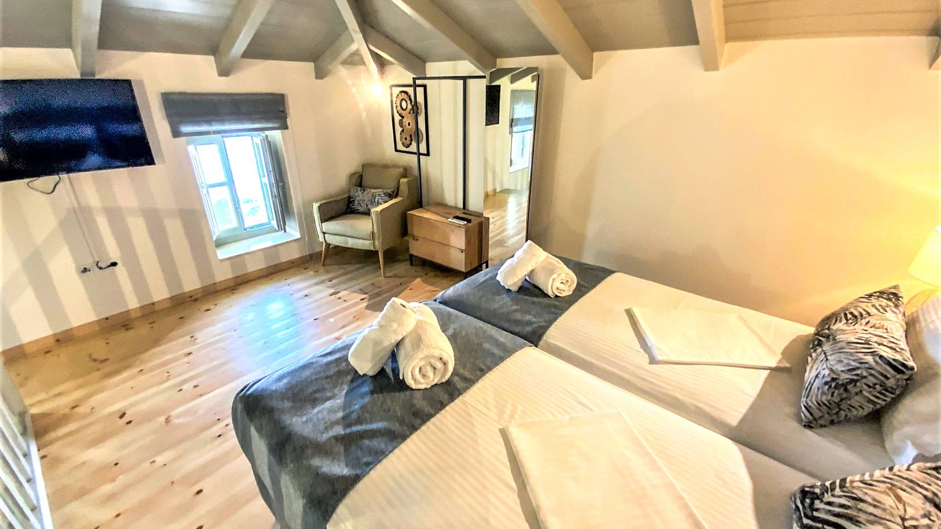 En la planta baja, hay un dormitorio con una cama doble extragrande, un baño y un televisor de 50 pulgadas. En el primer piso hay una amplia sala de estar con una cocina totalmente equipada con minibar incorporado, un segundo baño, TV de 40΄΄, y en el segundo piso (loft) hay un segundo dormitorio con dos camas individuales y una cama de 40 pulgadas. ΄΄ TV