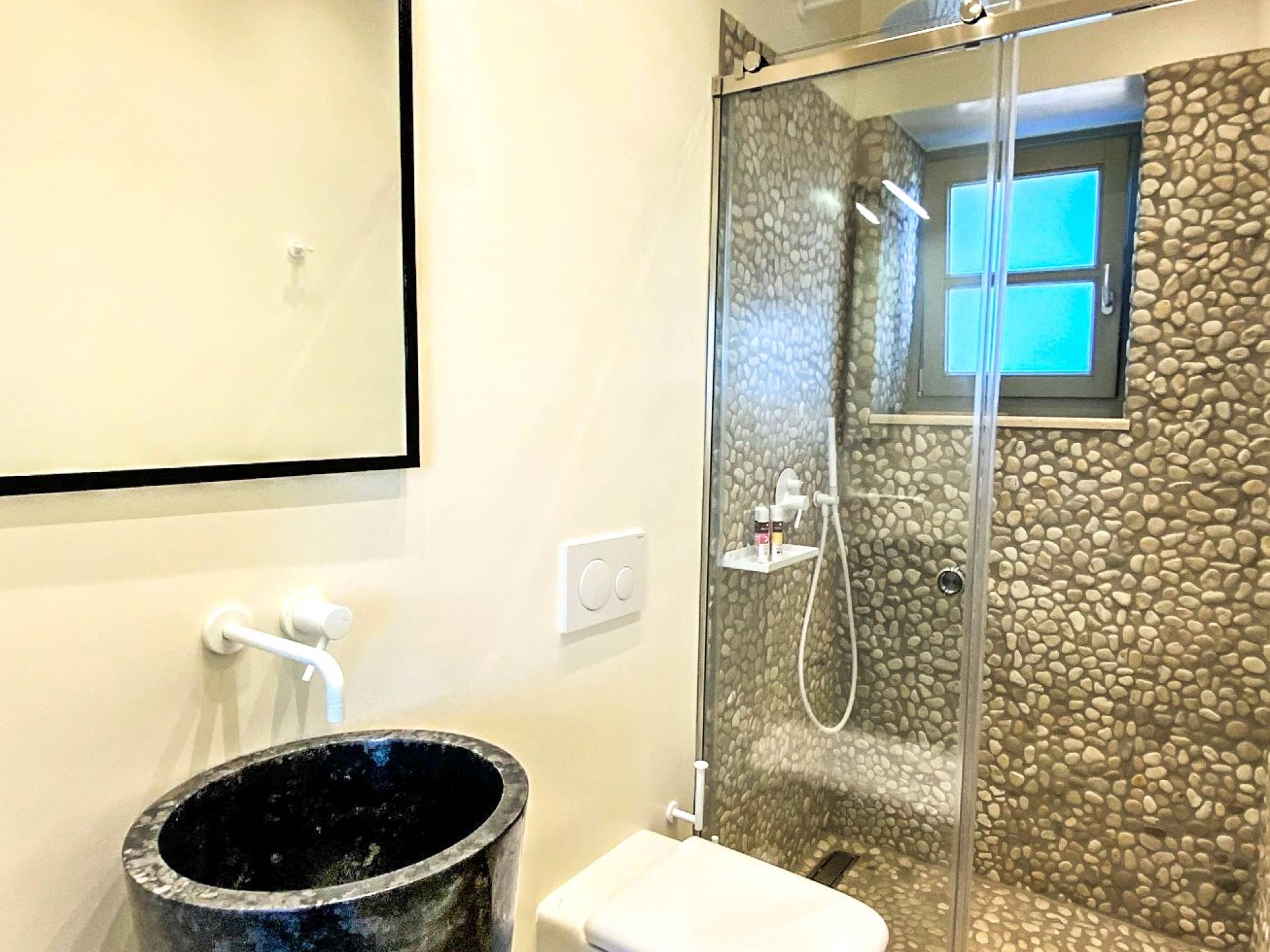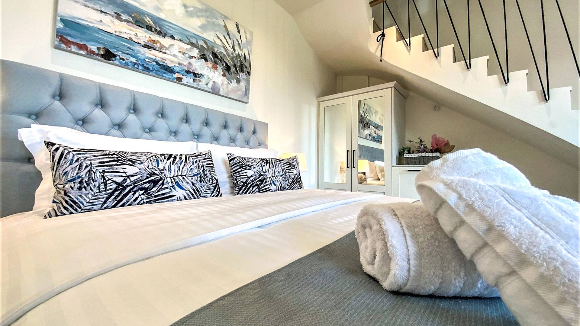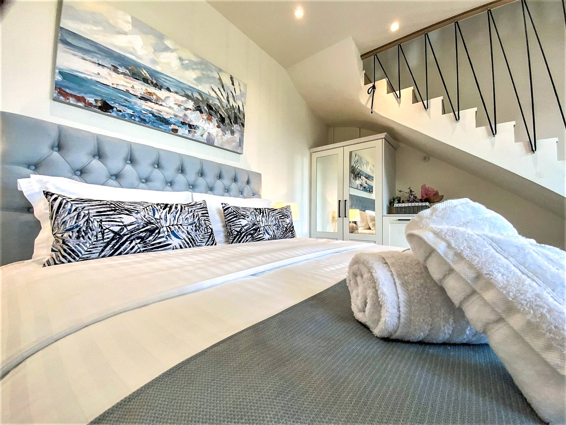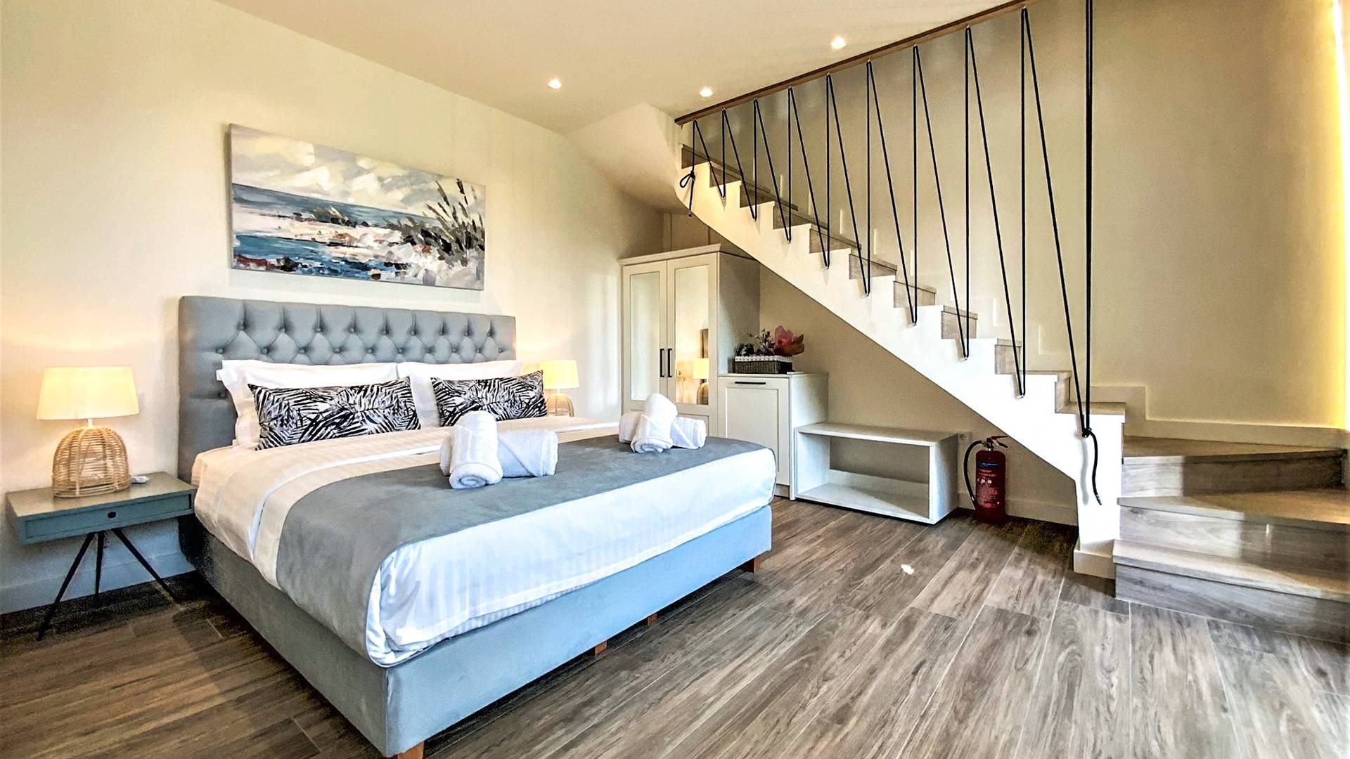 En la planta baja, hay un dormitorio con una cama doble extragrande, un baño y un televisor de 50 pulgadas. En el primer piso hay una amplia sala de estar con una cocina totalmente equipada con minibar incorporado, un segundo baño, TV de 40΄΄, y en el segundo piso (loft) hay un segundo dormitorio con dos camas individuales y una cama de 40 pulgadas. ΄΄ TV