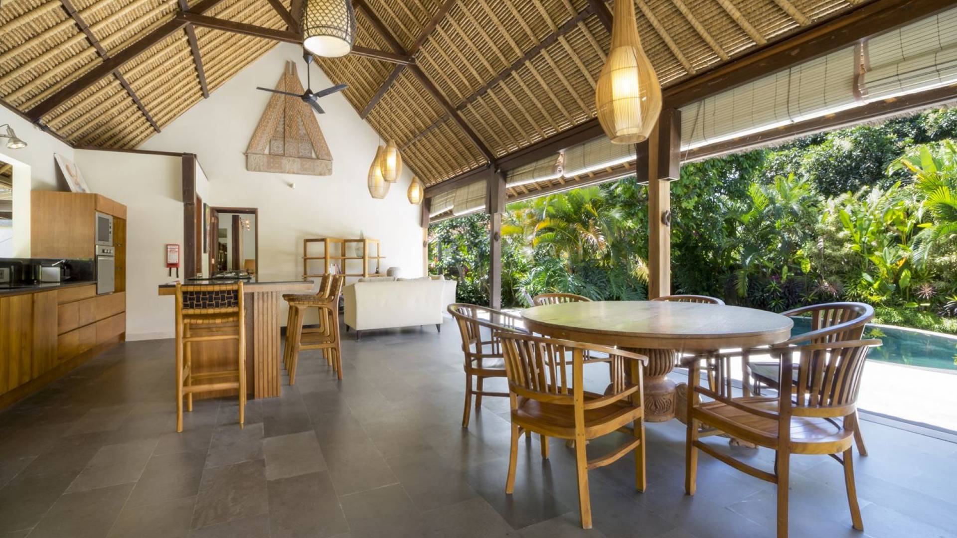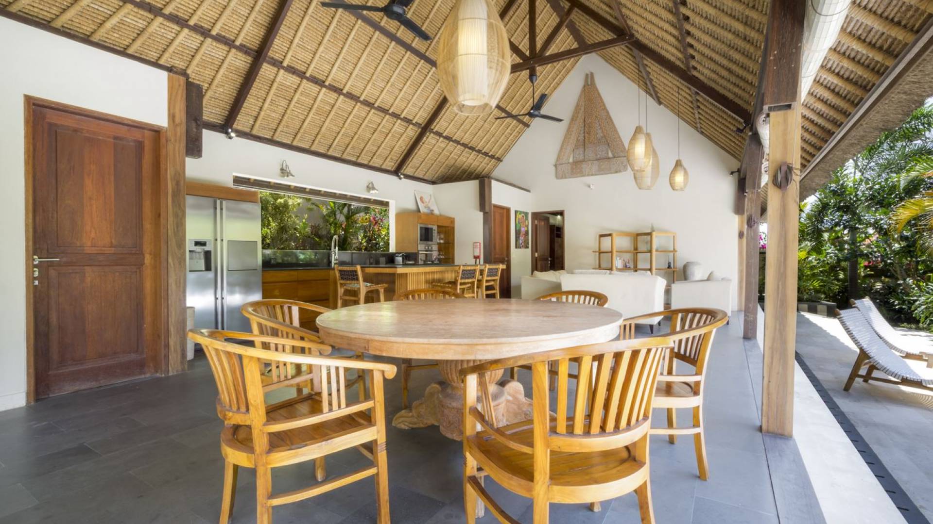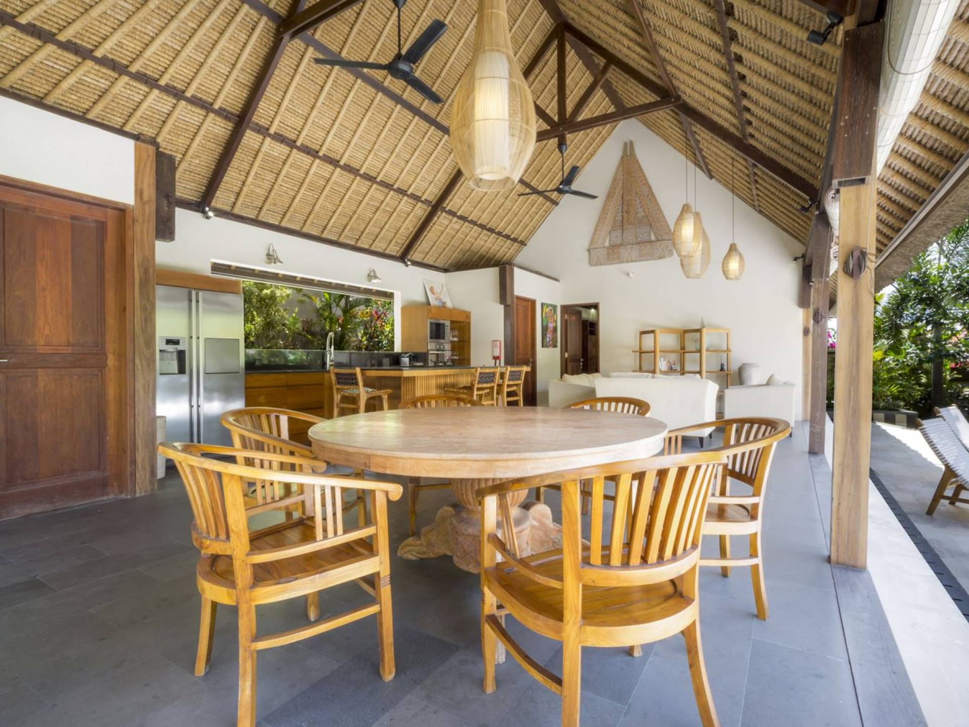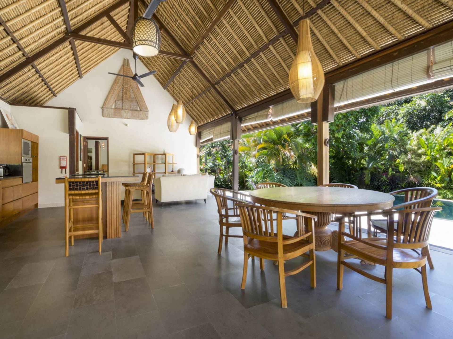 Esta hermosa villa cuenta con una sala de estar tradicional de planta abierta con un alto techo de paja "alang-alang" e interiores sofisticados y elegantes inspirados en la naturaleza. El uso de madera de teca recuperada, ratán y bambú le da a la villa una sensación cálida y auténtica. El jardín es como un verdadero oasis tropical, intacto y floreciente. Rodeada de árboles de frangipani, buganvillas, palmeras y más vegetación local brilla la piscina privada en forma de frijol. La piscina cuenta con un escalón poco profundo y se desborda por todos lados para crear una sensación de infinito, mientras que el sonido del agua ondulante solo se suma a la sensación de paraíso. El jardín cuenta con islas de césped verde bien cuidado donde los niños pueden jugar a la sombra de los árboles y la piscina está flanqueada por una terraza de piedra con sillas reclinables de lujo para tomar el sol. Villa Lalita cuenta con una mesa de comedor redonda de madera para disfrutar de desayunos y cenas en familia, una cocina moderna con barra y sillas altas para sentarse a tomar algo, escuchar música o navegar por el Wifi de cortesía en su computadora portátil y hay un sofá lounge para relajarse y disfruta de la vista al jardín y la piscina.