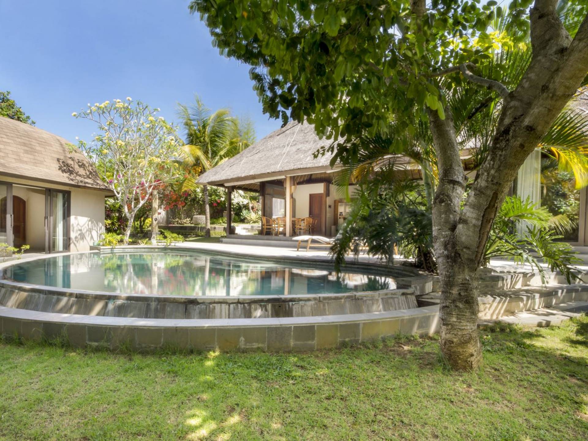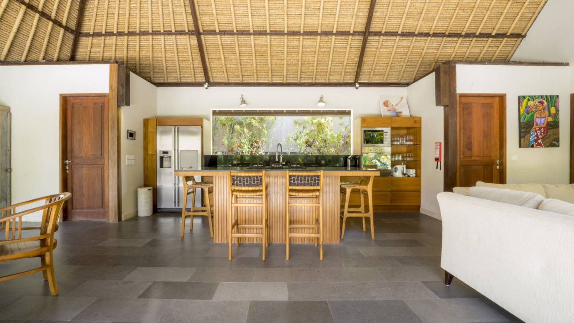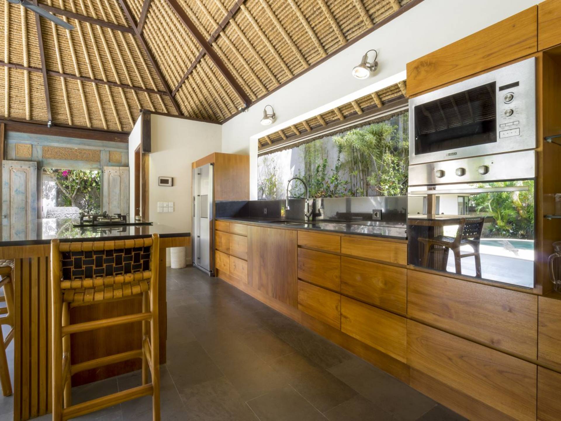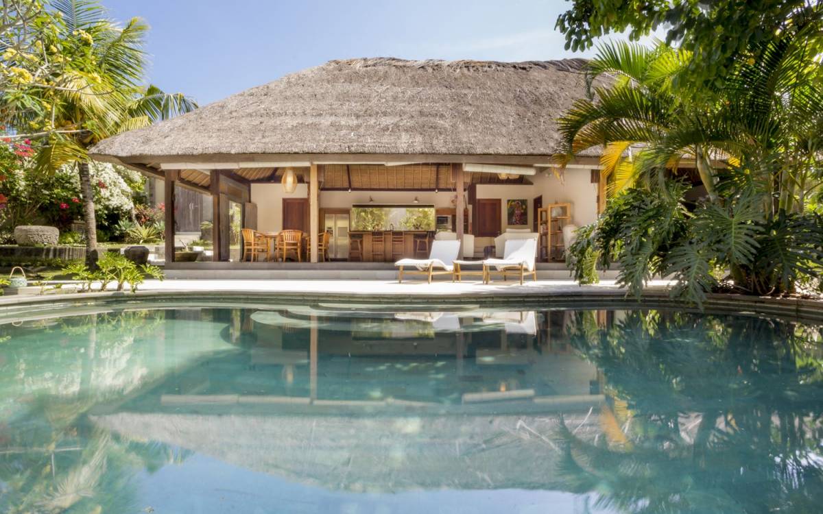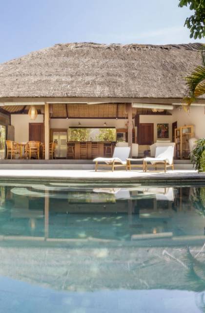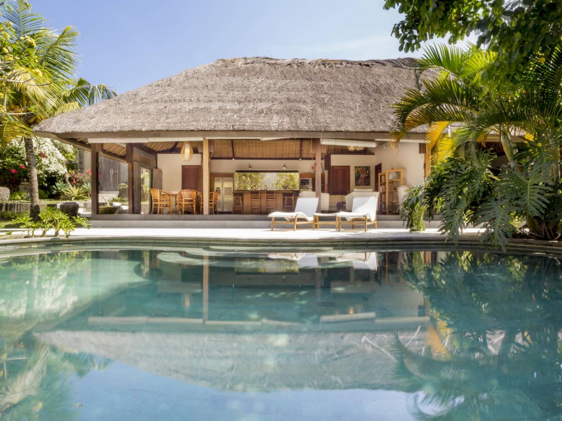 Esta hermosa villa cuenta con una sala de estar tradicional de planta abierta con un alto techo de paja "alang-alang" e interiores sofisticados y elegantes inspirados en la naturaleza. El uso de madera de teca recuperada, ratán y bambú le da a la villa una sensación cálida y auténtica. El jardín es como un verdadero oasis tropical, intacto y floreciente. Rodeada de árboles de frangipani, buganvillas, palmeras y más vegetación local brilla la piscina privada en forma de frijol. La piscina cuenta con un escalón poco profundo y se desborda por todos lados para crear una sensación de infinito, mientras que el sonido del agua ondulante solo se suma a la sensación de paraíso. El jardín cuenta con islas de césped verde bien cuidado donde los niños pueden jugar a la sombra de los árboles y la piscina está flanqueada por una terraza de piedra con sillas reclinables de lujo para tomar el sol. Villa Lalita cuenta con una mesa de comedor redonda de madera para disfrutar de desayunos y cenas en familia, una cocina moderna con barra y sillas altas para sentarse a tomar algo, escuchar música o navegar por el Wifi de cortesía en su computadora portátil y hay un sofá lounge para relajarse y disfruta de la vista al jardín y la piscina.